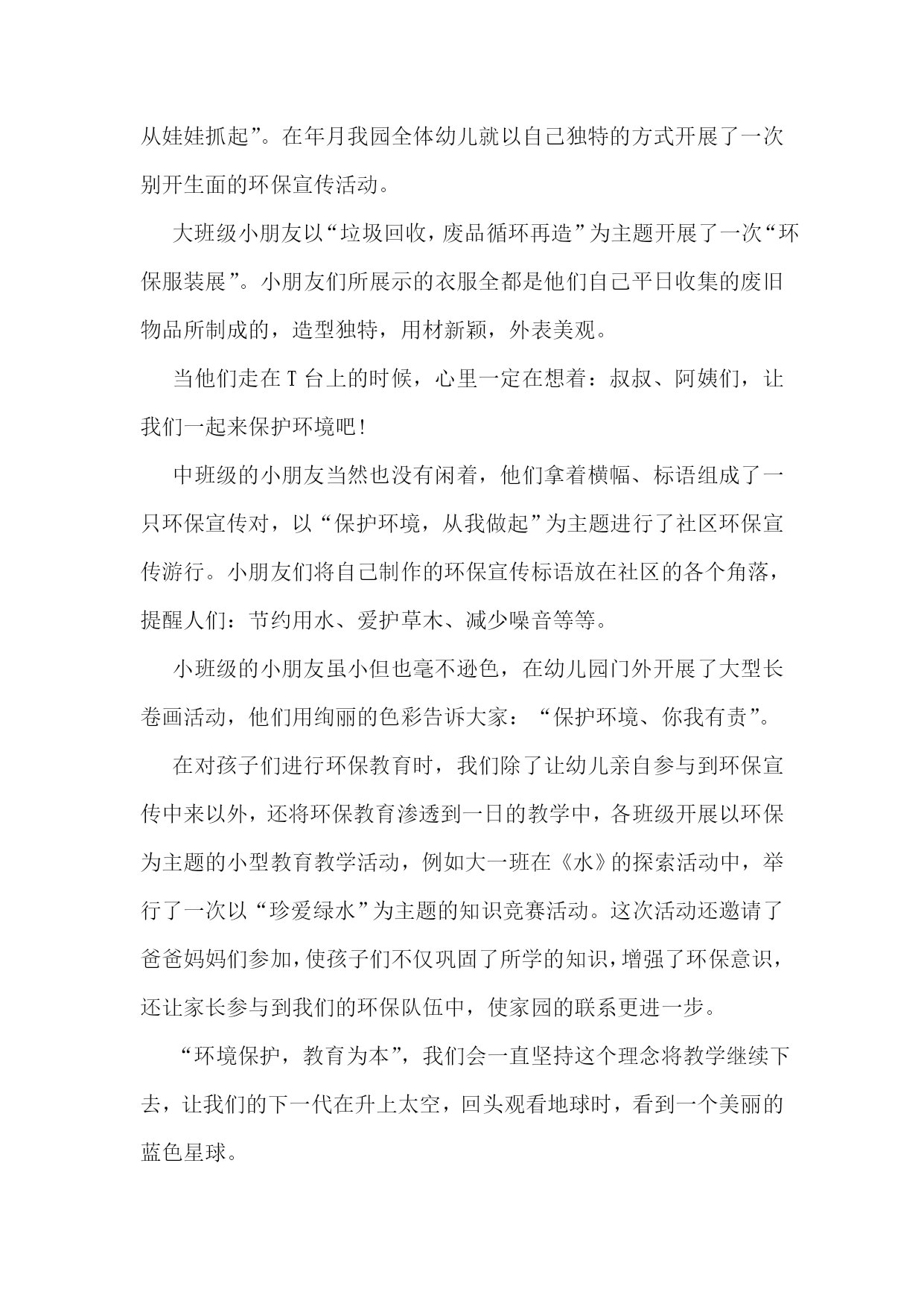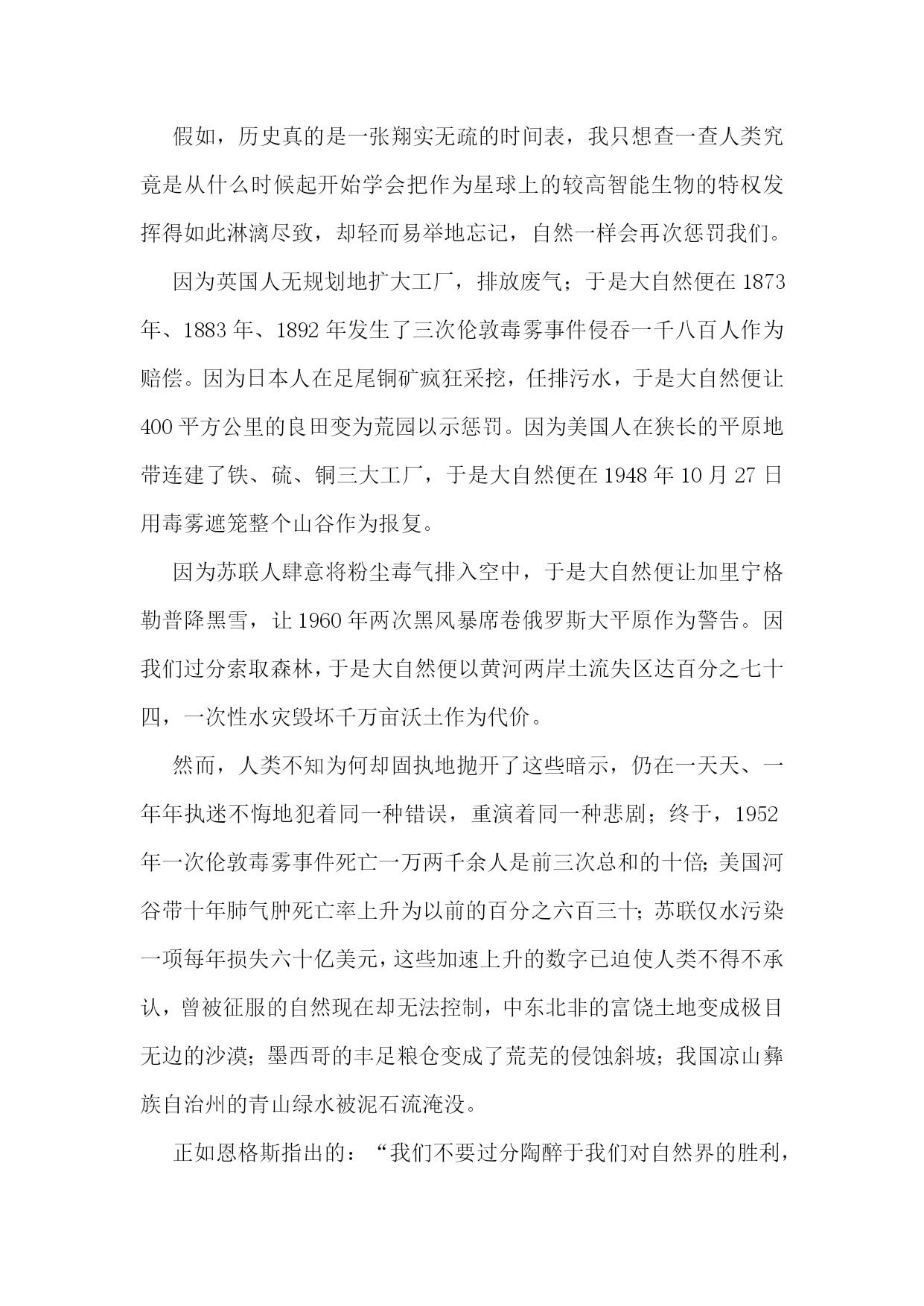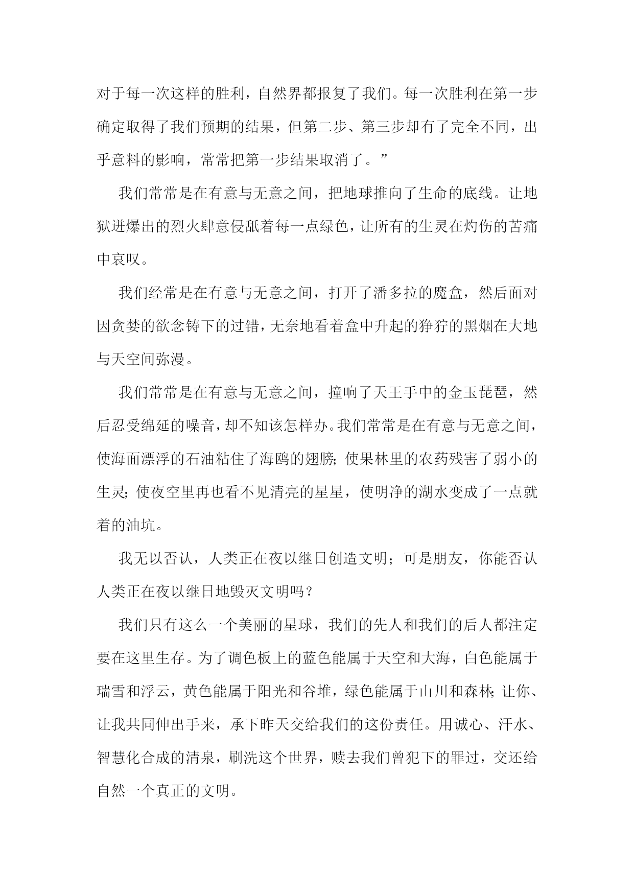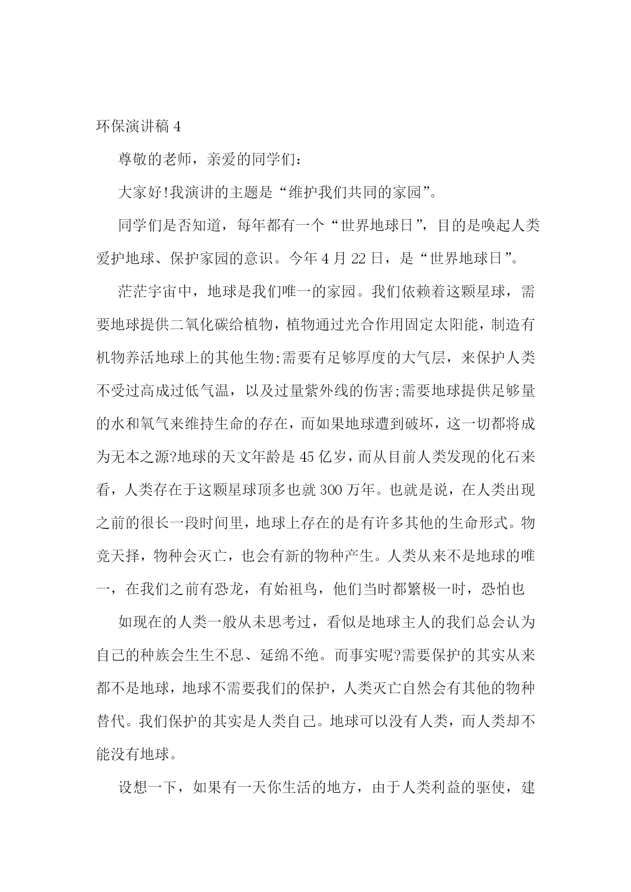 环保演讲稿15篇环保演讲稿1老师同学们:早上好!我认为美丽的生态造就未来,金鱼总要懒洋洋地洗几个小时的阳光浴。水草可受不了,一到这时就哭天喊地。而我,总把身子缩在壳里,蒙头睡大觉。骄阳似火,酷热,奇闷,简直要使我的细胞由颤抖而炸裂了。忍受,深深深呼吸。时间从20xx年的尾巴上掉到了20xx年的头上。我们这个生态瓶中没有什么大变化。太阳,去了还来;空气,陈年老酿;水,仍旧苦涩。日子像没有放盐的蛋炒饭。主人每天都用那双比我整个身体还大的牛眼盯着我们看。有时还把我们的家——这个生态瓶放在手上摇一摇,弄得瓶子里天翻地覆、不得安宁。金鱼的细胞分裂速度快得惊人,现在这里有很多小金鱼。氧气好像不多了。胸闷。忍受,深深深呼吸。水草成天被阳光晒得无精打采,金鱼则抱怨水中呛人的气味。我呢,总感到很热,好像生态瓶被无休止地加热,这估计就是什么温室效应吧。氧气不多了,呼吸急促。水草,那个辉煌一时的舞者,已经一片一片地凋零。“看来水草活不长了。”金鱼们幸灾乐祸。的确,水草的生命在今天或者明天就要停止。他是晒死的?呛死的?热死的?这无从说起。总之,生态瓶里是金鱼们的天下了。一转眼,又是几个昼夜,金鱼们也唉声叹气起来,终于一个个肚皮朝上了。而我,成天生活在恐惧之中,生怕死神的阴影哪一天也降到我头上。食物一天比一天少,我快支持不住了。我不知道邻居为什么一个个都呜呼哀哉了,但我知道他们面对死亡的情形。我也快不行了…漆黑。绝望。死的寂静。后记:这是一个发生在生态瓶中的故事。何为生态瓶?是用阳光、空气、水and简单的生物组成的一个群体。文中的群体是一群生活在一个瓶子里的生物。在这个群体中有生物链。生物链中的任何一个环节都不能出问题,失去一个,往往会失去成千上百。星夜,黑色的天幕上缀着点点繁星,大地酣然入睡。仰望浩淼苍穹,多美、多神奇啊!可是,要是人类再如此肆无忌惮,那么——毁灭,从植物到动物甚至——人!简评:作为一篇以环保为主题的习作,小作者能选取独特的角度,将人口增长过快、生态平衡失调等问题在小小的生态瓶中表现出来,确实颇具匠心。文中的每个生物都具有代表性,小中见大,让读者回味无穷。环保演讲稿2尊敬的各位领导、各位老师,亲爱的同学们:大家好!我叫xx,我是班里的文艺委员,我演讲的题目是《低碳生活,环保节能》。近几年,低碳环保这个词语越来越热门,因为低碳环保是一种生活方式。低碳生活是指生活作息中所耗用的能量,要尽量减少,从而减低碳排放量,特别是二氧化碳的。排放。每个人都知道,地球是我们赖以生存的家园,我们吸入氧气,呼出二氧化碳,我们不能不呼吸,所以,节能环保是我们早就应该做到的。有些人认为,低碳生活很艰难,其实不然,降低碳排放有很多方法,在我们日常生活中就可以做到,我们可以从衣食住行等各个方面来体现低碳环保,生活在这个世纪,低碳生活很快就会成为每个人都能做到的一种生活方式。低碳环保不只是一个口号,它还需要付出行动,让我们一起努力,将这个行动付诸于每一个人身上。我的演讲完毕,谢谢大家环保演讲稿3尊敬的各位领导、各位老师,亲爱的同学们:大家好!所有这些环境的恶化,足以引起人们对自身生存环境的重视。近年来,环境问题已超越了国界,成为世界性的热点问题之一,保护人类赖以生存的地球是世界各国人民的共同愿望。我园作为省级的绿色幼儿园更是应该走在环保队伍的最前列。我们将环保教育融入到幼儿园的学习、生活中,真正做到“环境教育,从娃娃抓起”。在年月我园全体幼儿就以自己独特的方式开展了一次别开生面的环保宣传活动。大班级小朋友以“垃圾回收,废品循环再造”为主题开展了一次“环保服装展”。小朋友们所展示的衣服全都是他们自己平日收集的废旧物品所制成的,造型独特,用材新颖,外表美观。当他们走在T台上的时候,心里一定在想着:叔叔、阿姨们,让我们一起来保护环境吧!中班级的小朋友当然也没有闲着,他们拿着横幅、标语组成了一只环保宣传对,以“保护环境,从我做起”为主题进行了社区环保宣传游行。小朋友们将自己制作的环保宣传标语放在社区的各个角落,提醒人们:节约用水、爱护草木、减少噪音等等。小班级的小朋友虽小但也毫不逊色,在幼儿园门外开展了大型长卷画活动,他们用绚丽的色彩告诉大家:“保护环境、你我有责”。在对孩子们进行环保教育时,我们除了让幼儿亲自参与到环保宣传中来以外,还将环保教育渗透到一日的教学中,各班级开展以环保为主题的小型教育教学活动,例如大一班在《水》的探索活动中,举行了一次以“珍爱绿水”为主题的知识竞赛活动。这次活动还邀请了爸爸妈妈们参加,使孩子们不仅巩固了所学的知识,增强了环保意识,还让家长参与到我们的环保队伍中,使家园的联系更进一步。“环境保护,教育为本”,我们会一直坚持这个理念将教学继续下去,让我们的下一代在升上太空,回头观