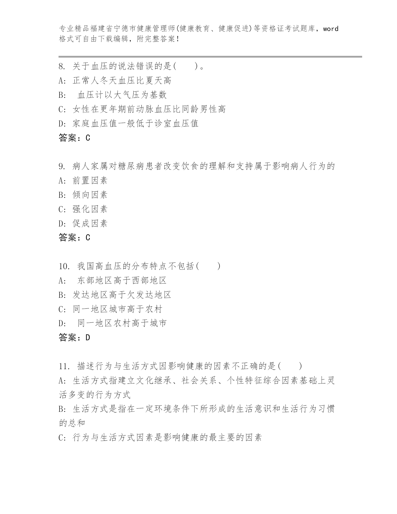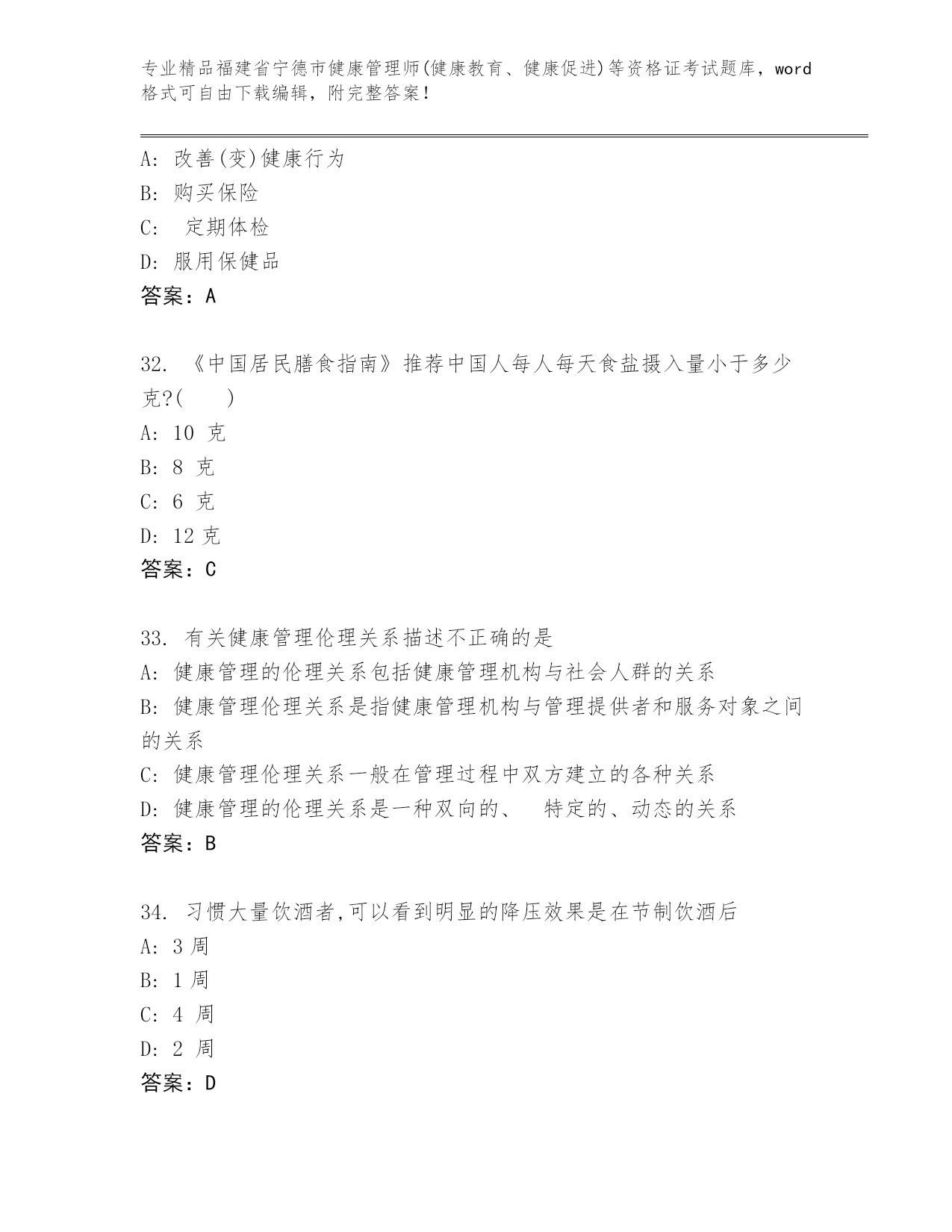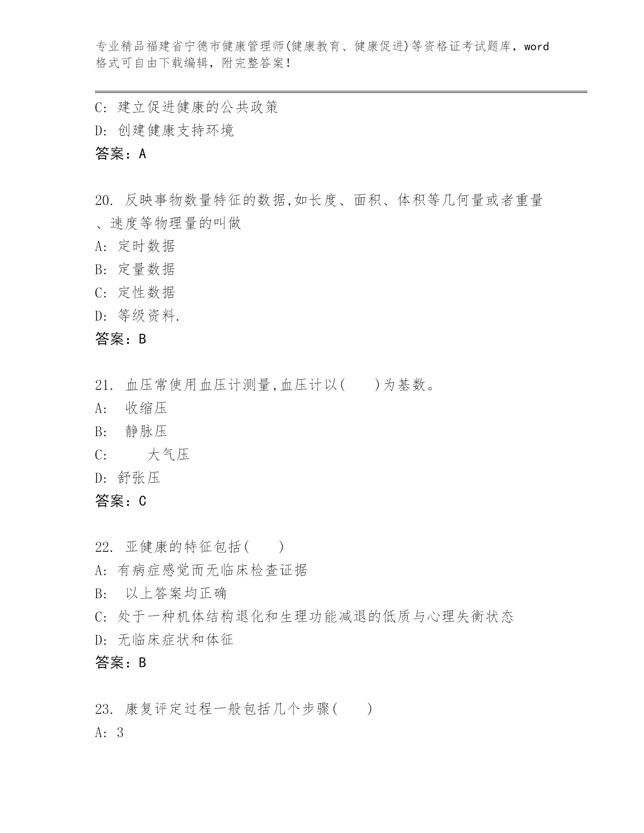 福建省宁德市健康管理师(健康教育、健康促进)等资格证考试优选题库答案下载