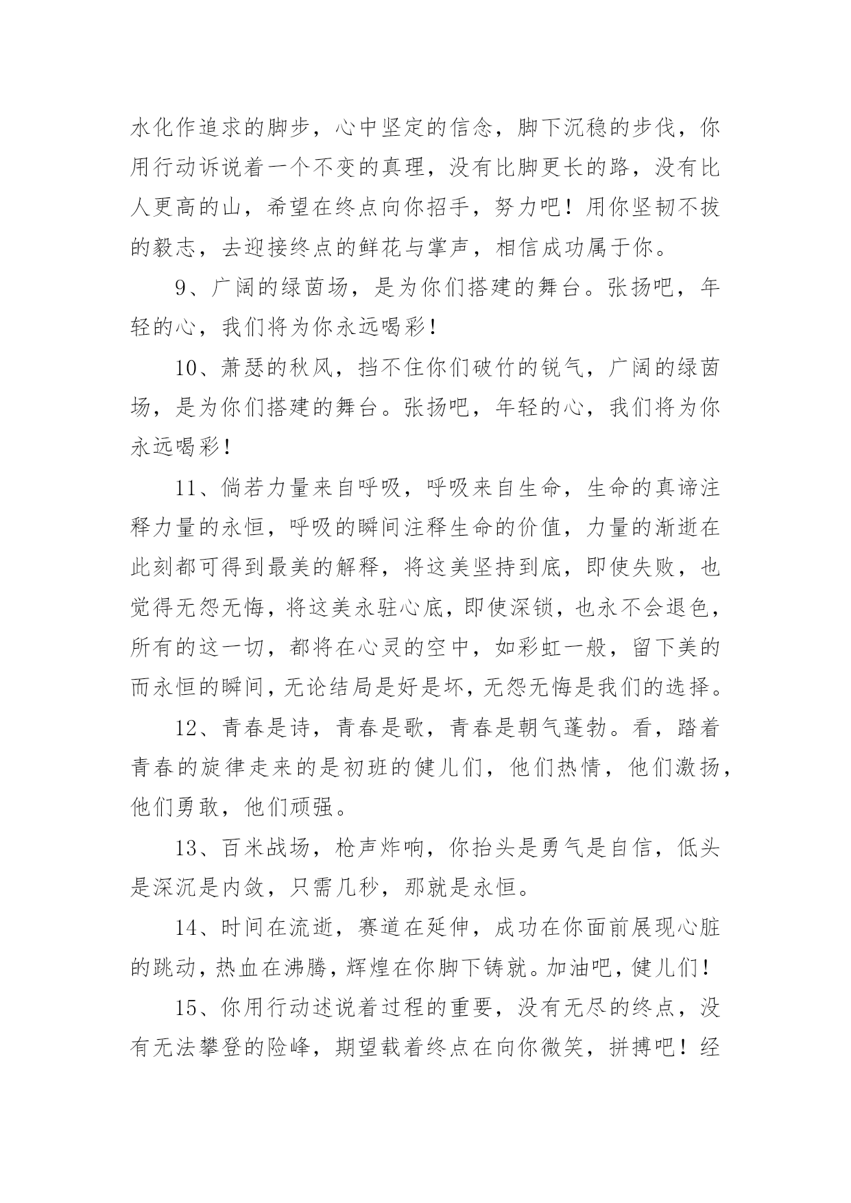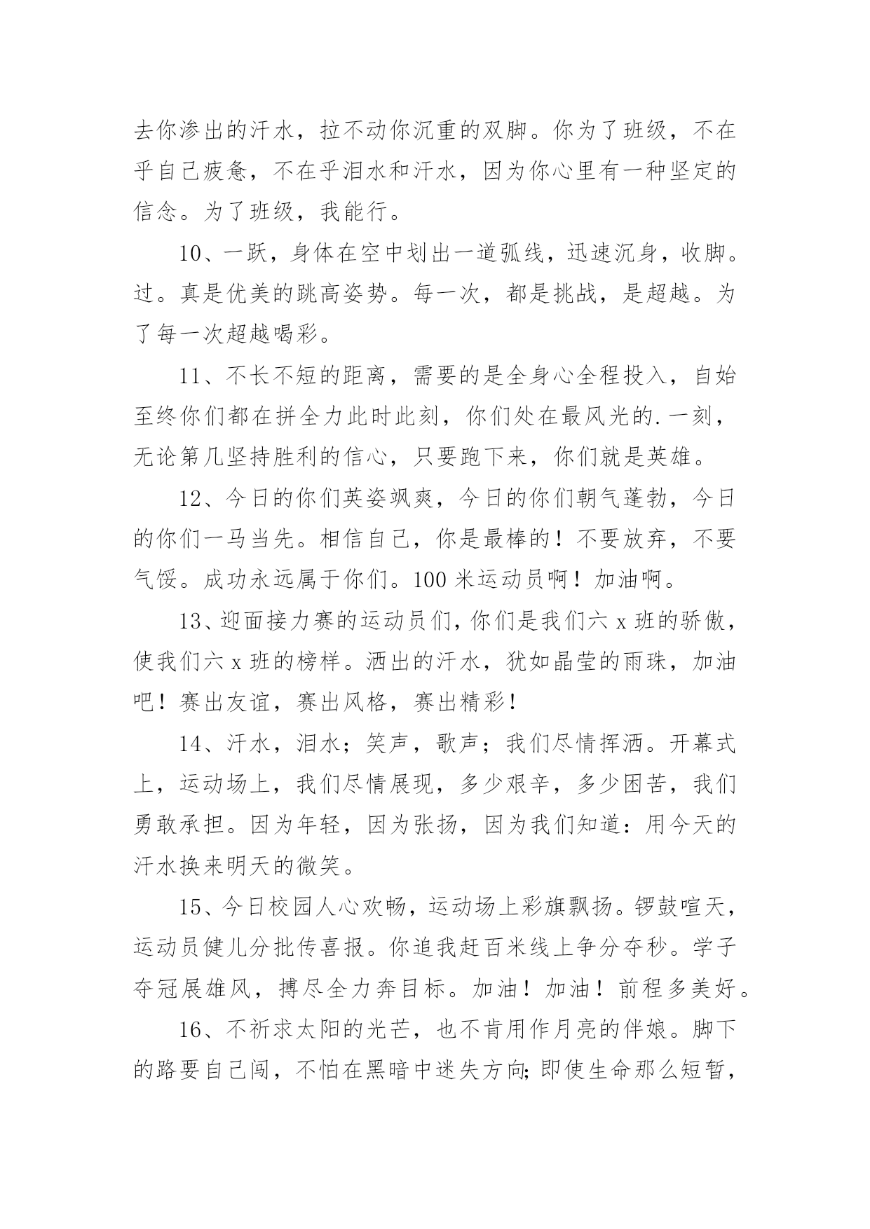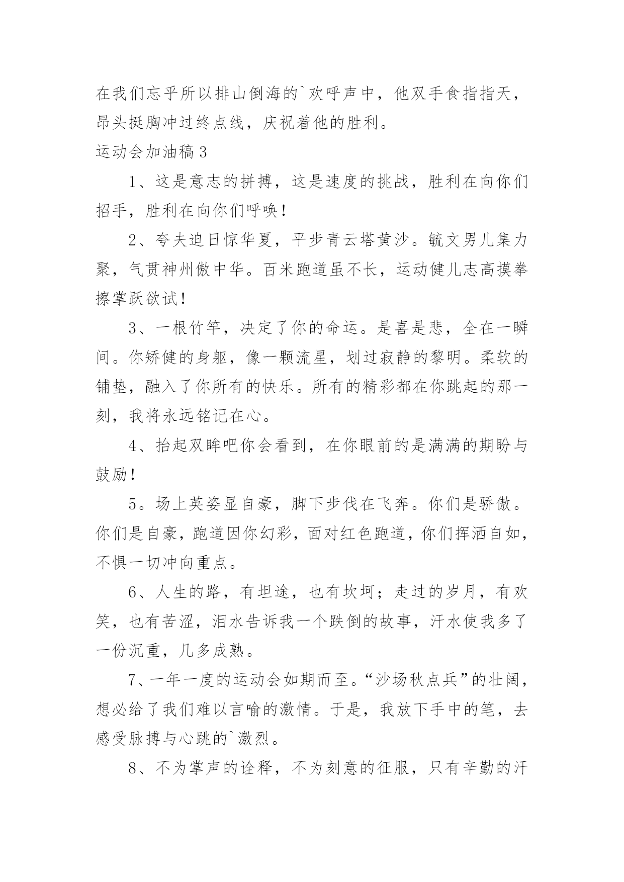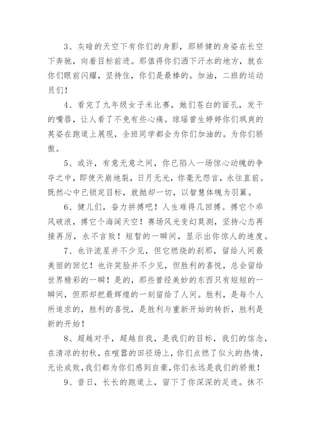 运动会加油稿运动会加油稿(优秀15篇)在社会一步步向前发展的今天,能够利用到加油稿的场合越来越多,加油稿可以起到活跃气氛的作用。写起加油稿来就毫无头绪?下面是小编精心整理的运动会加油稿,希望对大家有所帮助。运动会加油稿1不为掌声的诠释,不为刻意的征服,仅有辛勤的汗水化作追求的脚步,心中坚定的信念,脚下沉稳的'步伐,你用行动诉说着一个不变的真理,没有比脚更长的路,没有比人更高的山,期望在终点向你招手,努力吧用你坚韧不拔的毅志,去迎接终点的鲜花与掌声,相信成功属于你。运动会加油稿2曹天翔只见他两腿微微弯曲,身体前倾,双手紧握,做好起跑姿势。‘砰’的一声枪响,他冲出起跑线,双手不停在胸前挥动,双脚用力蹬地,奋力向前跑去。800米,600米,400米;第四名,第三名,第二名,他不停的超越着对手。汗水像断线的珍珠,在阳光的照耀下滑过他坚毅的脸颊,一颗颗跌落在漫长的跑道上。在最后一个弯道上,他咬紧牙关,绷紧双颊,坚持,用力,坚持,用力,奋力超越最后的对手。在我们忘乎所以排山倒海的`欢呼声中,他双手食指指天,昂头挺胸冲过终点线,庆祝着他的胜利。运动会加油稿31、这是意志的拼搏,这是速度的挑战,胜利在向你们招手,胜利在向你们呼唤!2、夸夫迫日惊华夏,平步青云塔黄沙。毓文男儿集力聚,气贯神州傲中华。百米跑道虽不长,运动健儿志高摸拳擦掌跃欲试!3、一根竹竿,决定了你的命运。是喜是悲,全在一瞬间。你矫健的身躯,像一颗流星,划过寂静的黎明。柔软的铺垫,融入了你所有的快乐。所有的精彩都在你跳起的那一刻,我将永远铭记在心。4、抬起双眸吧你会看到,在你眼前的是满满的期盼与鼓励!5。场上英姿显自豪,脚下步伐在飞奔。你们是骄傲。你们是自豪,跑道因你幻彩,面对红色跑道,你们挥洒自如,不惧一切冲向重点。6、人生的路,有坦途,也有坎坷;走过的岁月,有欢笑,也有苦涩,泪水告诉我一个跌倒的故事,汗水使我多了一份沉重,几多成熟。7、一年一度的运动会如期而至。“沙场秋点兵”的壮阔,想必给了我们难以言喻的激情。于是,我放下手中的笔,去感受脉搏与心跳的`激烈。8、不为掌声的诠释,不为刻意的征服,只有辛勤的汗水化作追求的脚步,心中坚定的信念,脚下沉稳的步伐,你用行动诉说着一个不变的真理,没有比脚更长的路,没有比人更高的山,希望在终点向你招手,努力吧!用你坚韧不拔的毅志,去迎接终点的鲜花与掌声,相信成功属于你。9、广阔的绿茵场,是为你们搭建的舞台。张扬吧,年轻的心,我们将为你永远喝彩!10、萧瑟的秋风,挡不住你们破竹的锐气,广阔的绿茵场,是为你们搭建的舞台。张扬吧,年轻的心,我们将为你永远喝彩!11、倘若力量来自呼吸,呼吸来自生命,生命的真谛注释力量的永恒,呼吸的瞬间注释生命的价值,力量的渐逝在此刻都可得到最美的解释,将这美坚持到底,即使失败,也觉得无怨无悔,将这美永驻心底,即使深锁,也永不会退色,所有的这一切,都将在心灵的空中,如彩虹一般,留下美的而永恒的瞬间,无论结局是好是坏,无怨无悔是我们的选择。12、青春是诗,青春是歌,青春是朝气蓬勃。看,踏着青春的旋律走来的是初班的健儿们,他们热情,他们激扬,他们勇敢,他们顽强。13、百米战场,枪声炸响,你抬头是勇气是自信,低头是深沉是内敛,只需几秒,那就是永恒。14、时间在流逝,赛道在延伸,成功在你面前展现心脏的跳动,热血在沸腾,辉煌在你脚下铸就。加油吧,健儿们!15、你用行动述说着过程的重要,没有无尽的终点,没有无法攀登的险峰,期望载着终点在向你微笑,拼搏吧!经历是一种精彩,迸发你全部的能量,成功是你汗水的写照。16、人生的路,有坦途,也有坎坷;做过的岁月,有欢笑,也有苦涩,泪水告诉我一个跌倒的故事,汗水使我多了一份沉重,几多成熟。运动会加油稿41、你的毅力令我们全班折服,你的努力,令我们全班佩服,你是我们班的焦点,你是全班的中心,不屈不挠,坚持不懈,你让我们真正体会到奥运精神。2、或许,有意无意之间,你已陷入一场惊心动魄的争夺之中,即使天崩地裂,日月无光,你毫无怨言,永往直前。既然心中已锁定目标,就抛却一切。3、漫漫长路,你愿一人独撑,忍受着孤独与寂寞,承受着体力与精神的压迫,只任汗水溶于泪水,可脚步却从不停歇。4、生活中,我们每一天都在尝试;我们走向成功,品味失败,走过心灵的阴雨晴空。运动员们,不要放下尝试,无论失败与否,重要的是你勇于参与的精神。5、运动场上彩旗飘,运动健儿显英豪,跳跃身姿轻如燕,铅球飞落地动摇,百米冲刺如猛虎。6、梦想毕竟不一样于现实,失败是生活的一部分,谁也无法选择,无法拒绝。7、坚定,执着,耐力与希望,在延伸的白色跑道中点点凝聚!力量,信念,拼搏与奋斗,在遥远的终点线上渐渐明亮!时代的强音正在你的脚下踏响。8、温暖的阳光洒在赛场上,男子乙组标枪的'比赛即将开始。赛场上,一道道优美的弧线将轻盈地划过天空。