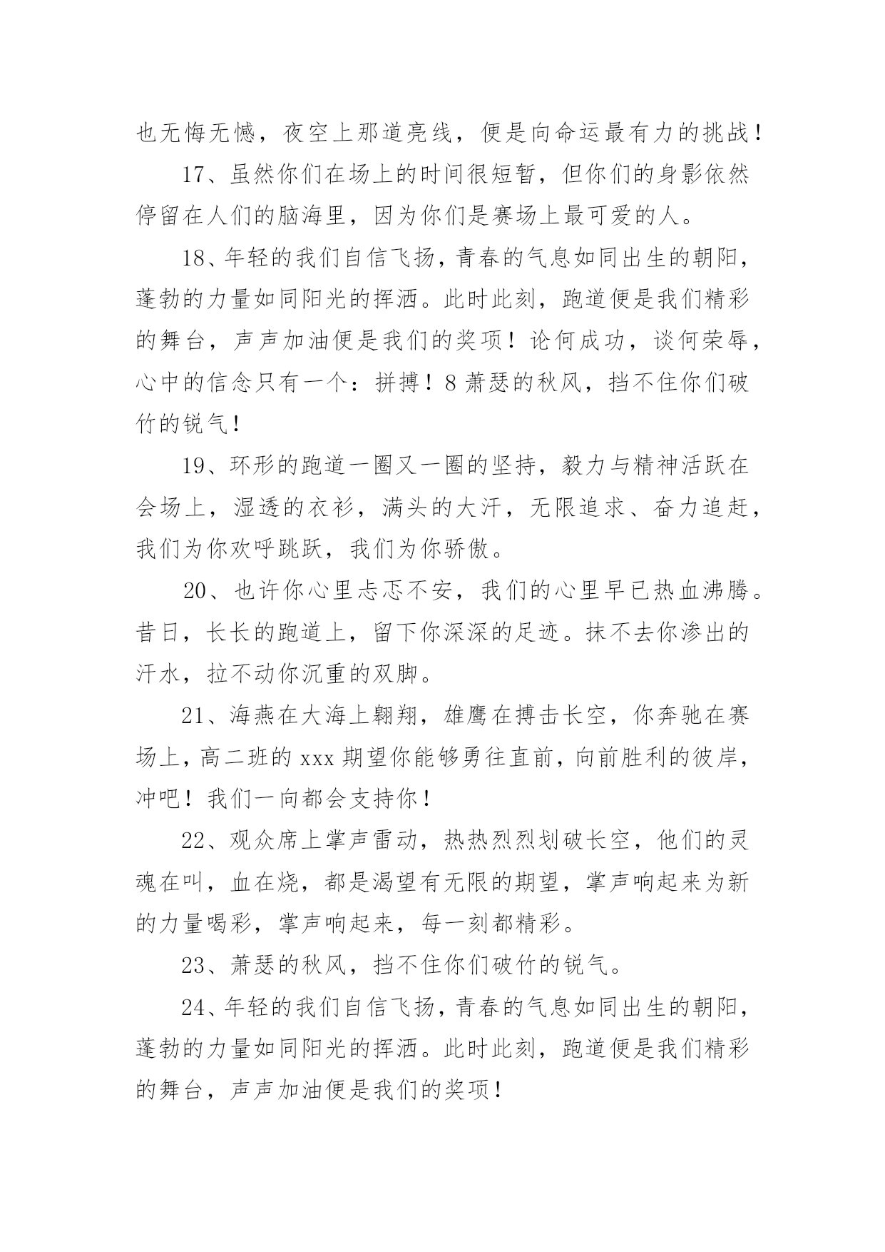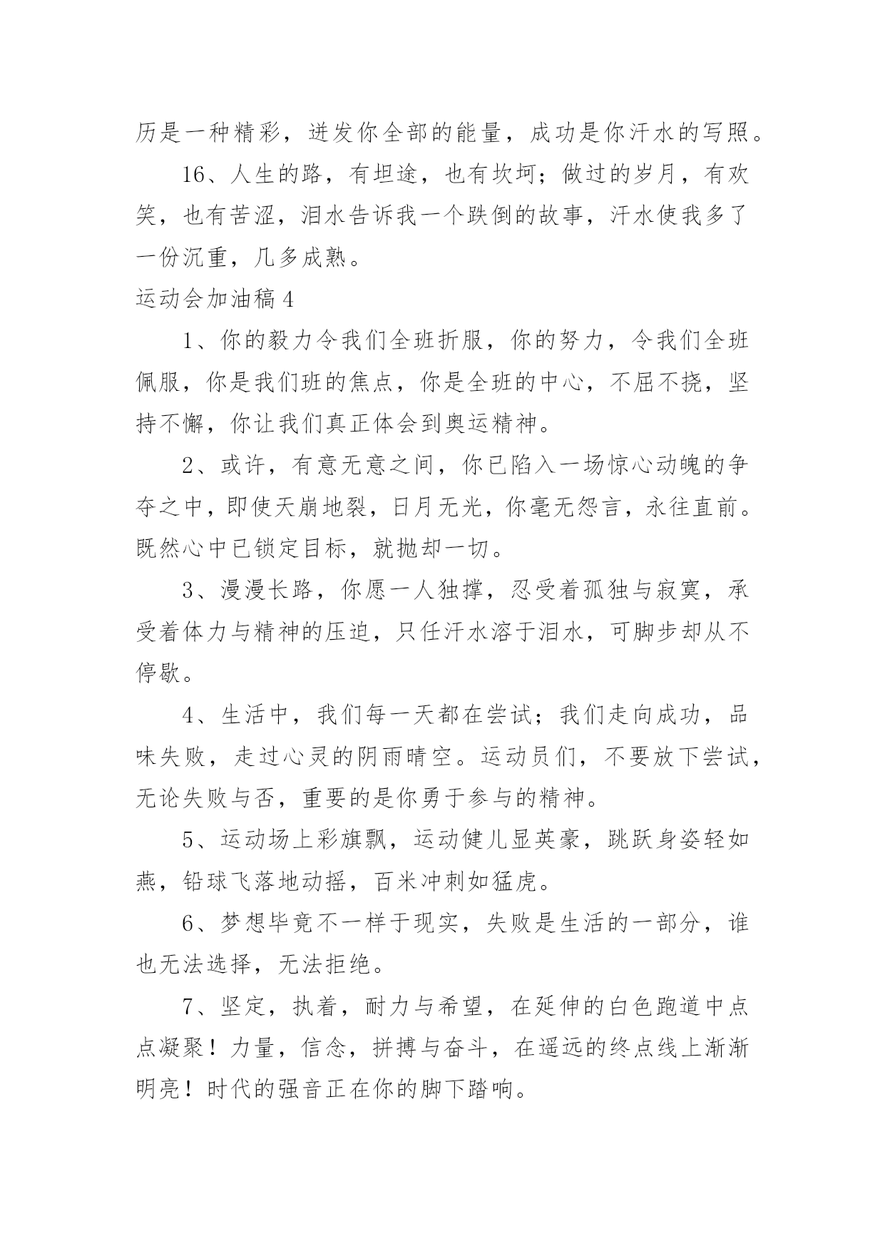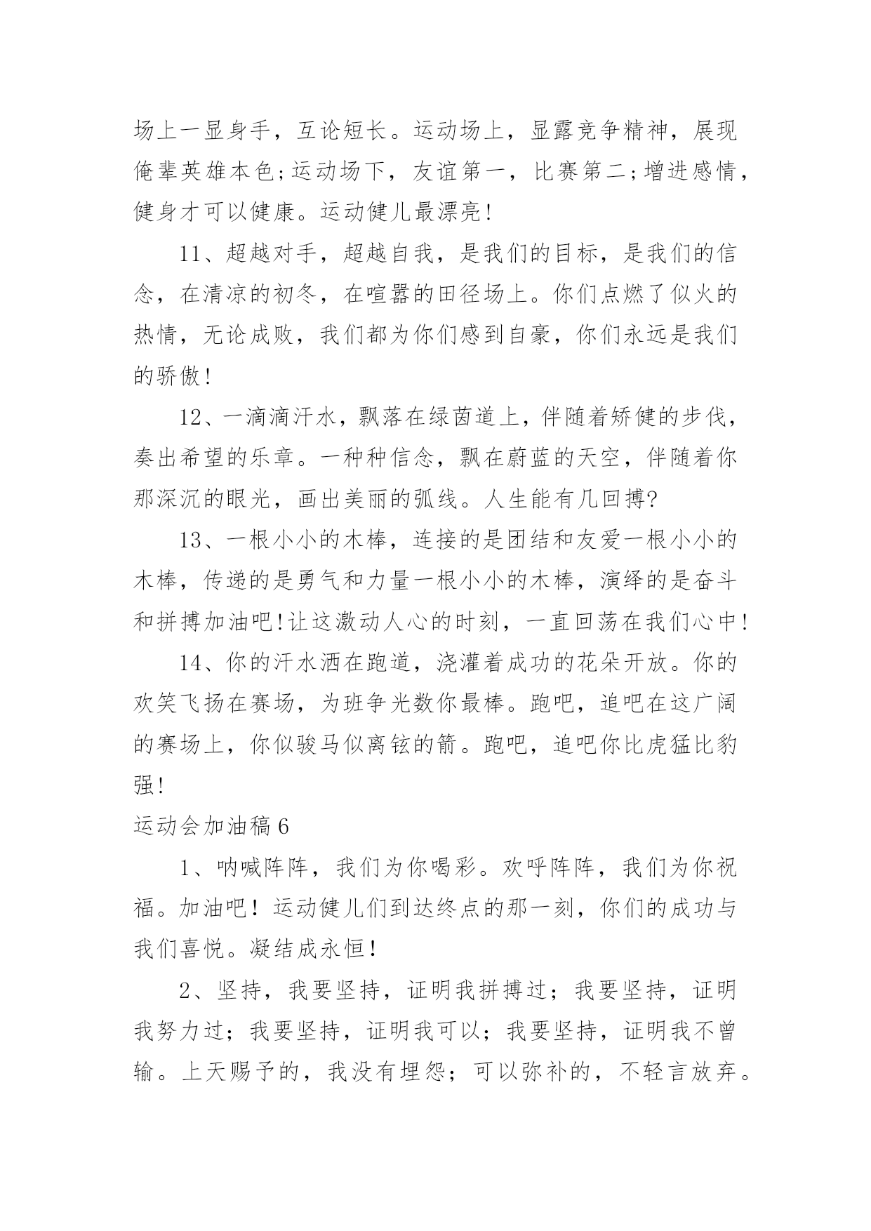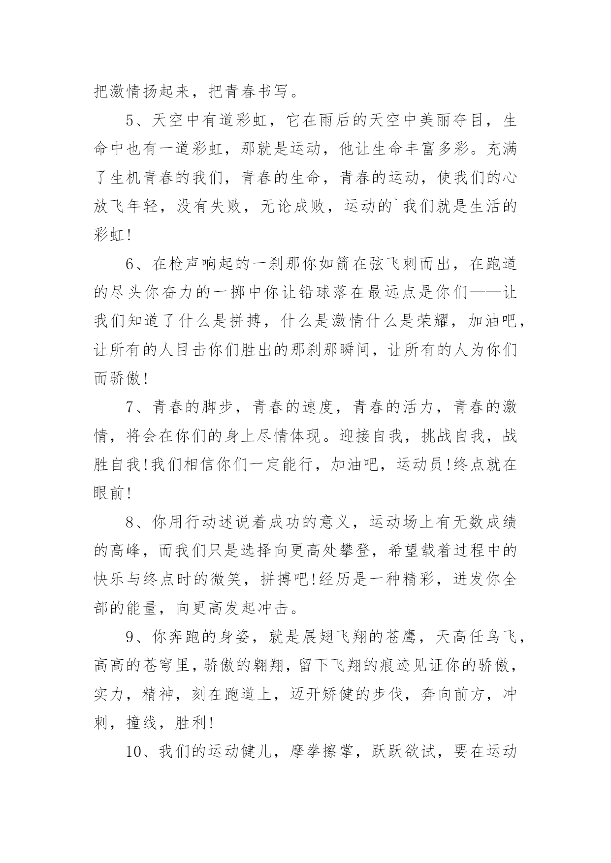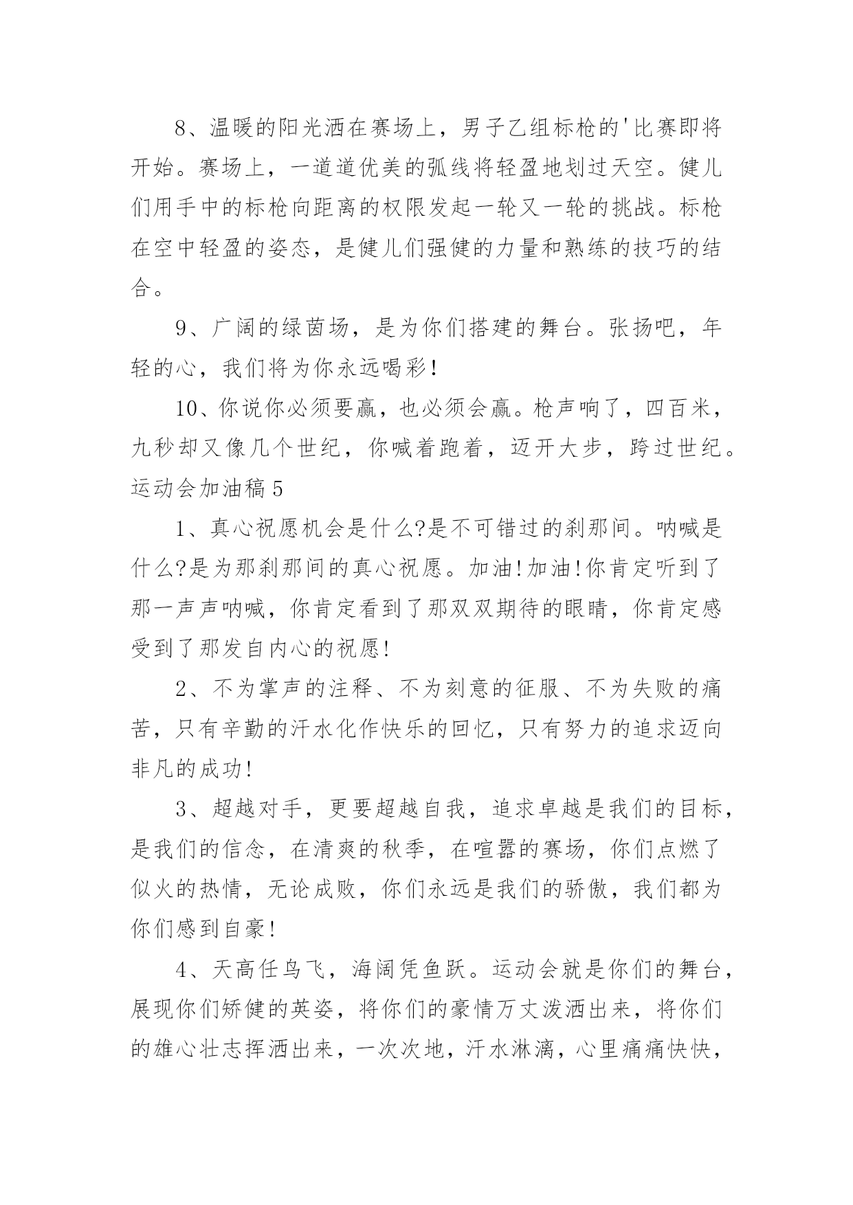 运动会加油稿运动会加油稿(优秀15篇)在社会一步步向前发展的今天,能够利用到加油稿的场合越来越多,加油稿可以起到活跃气氛的作用。写起加油稿来就毫无头绪?下面是小编精心整理的运动会加油稿,希望对大家有所帮助。运动会加油稿1不为掌声的诠释,不为刻意的征服,仅有辛勤的汗水化作追求的脚步,心中坚定的信念,脚下沉稳的'步伐,你用行动诉说着一个不变的真理,没有比脚更长的路,没有比人更高的山,期望在终点向你招手,努力吧用你坚韧不拔的毅志,去迎接终点的鲜花与掌声,相信成功属于你。运动会加油稿2曹天翔只见他两腿微微弯曲,身体前倾,双手紧握,做好起跑姿势。‘砰’的一声枪响,他冲出起跑线,双手不停在胸前挥动,双脚用力蹬地,奋力向前跑去。800米,600米,400米;第四名,第三名,第二名,他不停的超越着对手。汗水像断线的珍珠,在阳光的照耀下滑过他坚毅的脸颊,一颗颗跌落在漫长的跑道上。在最后一个弯道上,他咬紧牙关,绷紧双颊,坚持,用力,坚持,用力,奋力超越最后的对手。在我们忘乎所以排山倒海的`欢呼声中,他双手食指指天,昂头挺胸冲过终点线,庆祝着他的胜利。运动会加油稿31、这是意志的拼搏,这是速度的挑战,胜利在向你们招手,胜利在向你们呼唤!2、夸夫迫日惊华夏,平步青云塔黄沙。毓文男儿集力聚,气贯神州傲中华。百米跑道虽不长,运动健儿志高摸拳擦掌跃欲试!3、一根竹竿,决定了你的命运。是喜是悲,全在一瞬间。你矫健的身躯,像一颗流星,划过寂静的黎明。柔软的铺垫,融入了你所有的快乐。所有的精彩都在你跳起的那一刻,我将永远铭记在心。4、抬起双眸吧你会看到,在你眼前的是满满的期盼与鼓励!5。场上英姿显自豪,脚下步伐在飞奔。你们是骄傲。你们是自豪,跑道因你幻彩,面对红色跑道,你们挥洒自如,不惧一切冲向重点。6、人生的路,有坦途,也有坎坷;走过的岁月,有欢笑,也有苦涩,泪水告诉我一个跌倒的故事,汗水使我多了一份沉重,几多成熟。7、一年一度的运动会如期而至。“沙场秋点兵”的壮阔,想必给了我们难以言喻的激情。于是,我放下手中的笔,去感受脉搏与心跳的`激烈。8、不为掌声的诠释,不为刻意的征服,只有辛勤的汗水化作追求的脚步,心中坚定的信念,脚下沉稳的步伐,你用行动诉说着一个不变的真理,没有比脚更长的路,没有比人更高的山,希望在终点向你招手,努力吧!用你坚韧不拔的毅志,去迎接终点的鲜花与掌声,相信成功属于你。9、广阔的绿茵场,是为你们搭建的舞台。张扬吧,年轻的心,我们将为你永远喝彩!10、萧瑟的秋风,挡不住你们破竹的锐气,广阔的绿茵场,是为你们搭建的舞台。张扬吧,年轻的心,我们将为你永远喝彩!11、倘若力量来自呼吸,呼吸来自生命,生命的真谛注释力量的永恒,呼吸的瞬间注释生命的价值,力量的渐逝在此刻都可得到最美的解释,将这美坚持到底,即使失败,也觉得无怨无悔,将这美永驻心底,即使深锁,也永不会退色,所有的这一切,都将在心灵的空中,如彩虹一般,留下美的而永恒的瞬间,无论结局是好是坏,无怨无悔是我们的选择。12、青春是诗,青春是歌,青春是朝气蓬勃。看,踏着青春的旋律走来的是初班的健儿们,他们热情,他们激扬,他们勇敢,他们顽强。13、百米战场,枪声炸响,你抬头是勇气是自信,低头是深沉是内敛,只需几秒,那就是永恒。14、时间在流逝,赛道在延伸,成功在你面前展现心脏的跳动,热血在沸腾,辉煌在你脚下铸就。加油吧,健儿们!15、你用行动述说着过程的重要,没有无尽的终点,没有无法攀登的险峰,期望载着终点在向你微笑,拼搏吧!经历是一种精彩,迸发你全部的能量,成功是你汗水的写照。16、人生的路,有坦途,也有坎坷;做过的岁月,有欢笑,也有苦涩,泪水告诉我一个跌倒的故事,汗水使我多了一份沉重,几多成熟。运动会加油稿41、你的毅力令我们全班折服,你的努力,令我们全班佩服,你是我们班的焦点,你是全班的中心,不屈不挠,坚持不懈,你让我们真正体会到奥运精神。2、或许,有意无意之间,你已陷入一场惊心动魄的争夺之中,即使天崩地裂,日月无光,你毫无怨言,永往直前。既然心中已锁定目标,就抛却一切。3、漫漫长路,你愿一人独撑,忍受着孤独与寂寞,承受着体力与精神的压迫,只任汗水溶于泪水,可脚步却从不停歇。4、生活中,我们每一天都在尝试;我们走向成功,品味失败,走过心灵的阴雨晴空。运动员们,不要放下尝试,无论失败与否,重要的是你勇于参与的精神。5、运动场上彩旗飘,运动健儿显英豪,跳跃身姿轻如燕,铅球飞落地动摇,百米冲刺如猛虎。6、梦想毕竟不一样于现实,失败是生活的一部分,谁也无法选择,无法拒绝。7、坚定,执着,耐力与希望,在延伸的白色跑道中点点凝聚!力量,信念,拼搏与奋斗,在遥远的终点线上渐渐明亮!时代的强音正在你的脚下踏响。8、温暖的阳光洒在赛场上,男子乙组标枪的'比赛即将开始。赛场上,一道道优美的弧线将轻盈地划过天空。