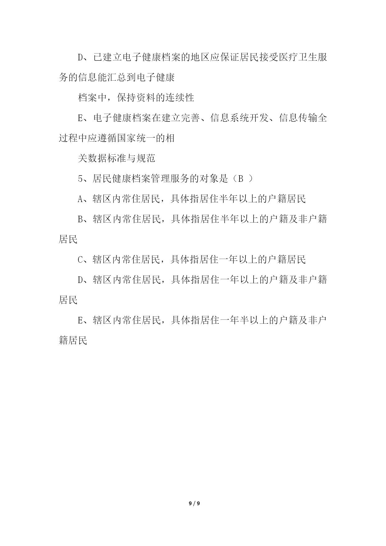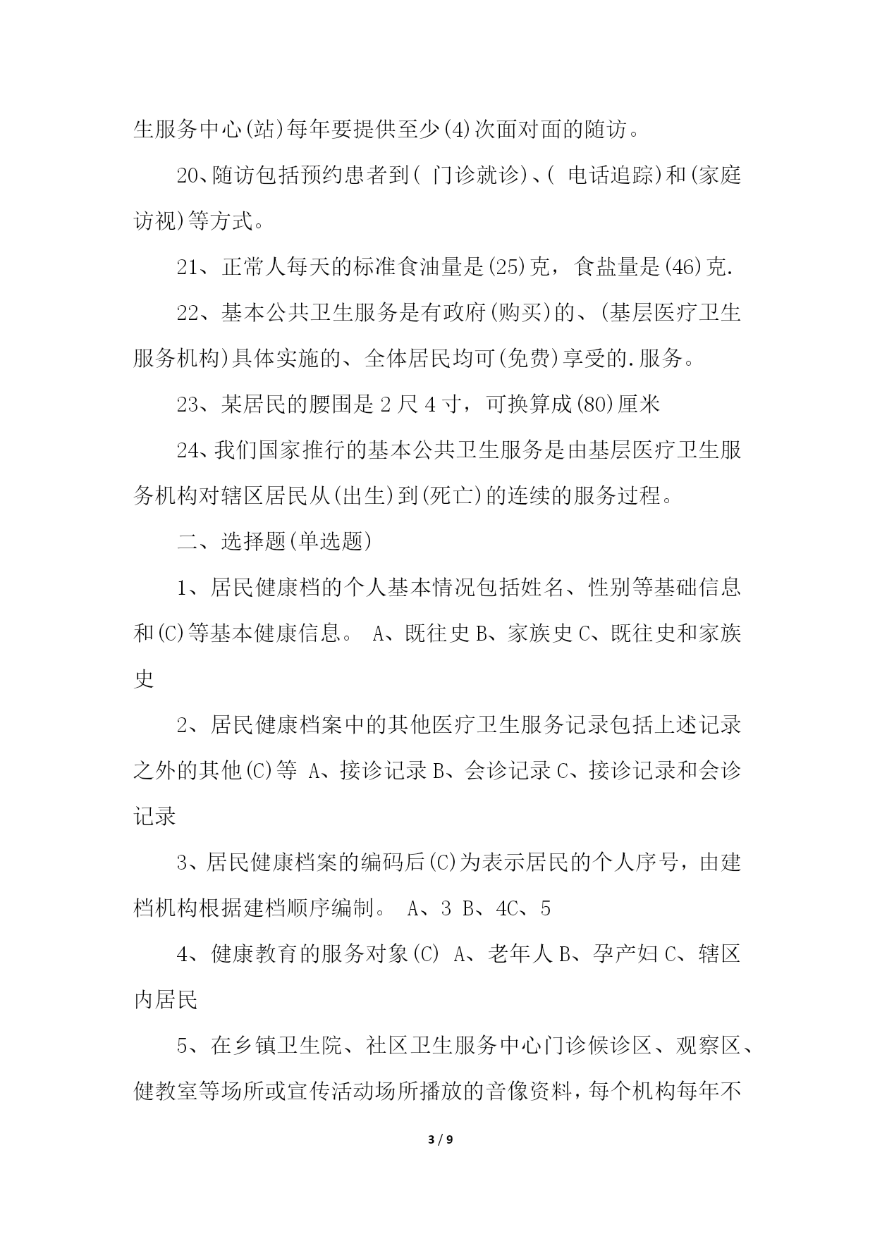 PAGE9/NUMPAGES9国家基本公共卫生服务考试试题及答案国家基本公共卫生服务考试试题及答案篇1一、填空题:1、居民健康档案内容包括(个人基本信息)、(健康体检)、(重点人群健康管理记录)和其他医疗卫生服务记录。2、城乡居民健康档案的建档对象是(辖区内常住居民),包括居住(半年)以上的户籍及非户籍居民。3、农村地区建立居民健康档案可与(新型农村合作医疗工作)相结合。4、已建档居民到乡镇卫生院、村卫生室、社区卫生服务中心(站)复诊时,应持(居民健康档案信息卡),在调取其健康档案后,由接诊医生根据复诊情况,及时(更新)、(补充)相应记录内容。5、健康档案的建立要遵循(自愿)与(引导)相结合的原则,在使用过程中要注意保护服务对象的(个人隐私)6、体重指数=(体重kg)/(身高)的平方(m2)7、健康教育中发放的印刷资料包括(健康教育折页)、(健康教育处方)和(健康手册)等。8、基本公共卫生服务机构制定健康教育年度工作计划,保证其(可操作性)和(可实施性)9、完整的健康教育活动记录和资料,包括(文字)、(图片)、(影音文件)等,并存档保存,每年做好年度健康教育工作的(总结)(评价)。10、健康教育要通俗易懂,并确保其(科学性)(时效性)。11、新生儿出院(一周)后,医务人员到新生儿家中进行,同时进行(产后访视)。12、新生儿满28天后,结合接种乙肝疫苗(第二针),在(乡镇卫生院)、(社区卫生服务中心)进行随访。13、乡镇卫生院(村卫生室),社区卫生服务中心在得到分娩医院转来产妇分娩信息后,应于(3―7)天内到产妇家中进行访视,进行产褥期健康管理,加强母乳喂养和新生儿护理指导,同时进行(新生儿访视)14、基本公共卫生服务机构要加强与村(居)委会、(妇联)(计生)等相关部门的联系,掌握辖区内孕产妇人口信息。15、每年进行(1)次老年人健康管理,包括健康体检、健康咨询指导和干预等。16、预防接种服务对象是辖区内(0―6)岁儿童和(其他重点人群)。17、工作人员应告知儿童监护人,受种者在接种后应留在留观室观察(30)分钟。18、依照法律、法规的规定,对本单位内被传染病病原体污染的场所、物品以及医疗废物,实施(消毒)和(无害化处理)。19、对原发性高血压患者,乡镇卫生院、村卫生室、社区卫生服务中心(站)每年要提供至少(4)次面对面的随访。20、随访包括预约患者到(门诊就诊)、(电话追踪)和(家庭访视)等方式。21、正常人每天的标准食油量是(25)克,食盐量是(46)克.22、基本公共卫生服务是有政府(购买)的、(基层医疗卫生服务机构)具体实施的、全体居民均可(免费)享受的.服务。23、某居民的腰围是2尺4寸,可换算成(80)厘米24、我们国家推行的基本公共卫生服务是由基层医疗卫生服务机构对辖区居民从(出生)到(死亡)的连续的服务过程。二、选择题(单选题)1、居民健康档的个人基本情况包括姓名、性别等基础信息和(C)等基本健康信息。A、既往史B、家族史C、既往史和家族史2、居民健康档案中的其他医疗卫生服务记录包括上述记录之外的其他(C)等A、接诊记录B、会诊记录C、接诊记录和会诊记录3、居民健康档案的编码后(C)为表示居民的个人序号,由建档机构根据建档顺序编制。A、3B、4C、54、健康教育的服务对象(C)A、老年人B、孕产妇C、辖区内居民5、在乡镇卫生院、社区卫生服务中心门诊候诊区、观察区、健教室等场所或宣传活动场所播放的音像资料,每个机构每年不少于(C)种。A、12B、5C、96、每个机构每年最少更换(C)次健康宣传栏的内容。A、8B、4C、67、乡镇卫生院和社区卫生服务中心应配备专(兼)职人员开展健康教育工作,每年接受健康教育专业知识和技能培训不少于(C)学时。A、10B、5C、88、儿童健康管理服务在时间上应于(C)相结合。A、随访B、就诊C、预防接种程序时间9、孕产妇在孕(C)周前由孕妇居住地方镇卫生镇卫生院、社区卫生服务中心为其建立《孕产妇保健手册》,进行1次孕早期随访。A、10B、6C、1210、老年人健康管理服务对象是辖区内(C)岁以上常住居民A、65B、50C、6011、预约60岁以上居民到乡镇卫生院、村卫生室、社区卫生服务中心(站)接受健康管理。对行动不便、卧床居民可提供(C)。A、家庭病床B、住院治疗C、预约上门健康检查12、乡镇卫生院、服务中心要及时为辖区内所有居住满(C)的0~6岁儿童建立预防接种证和预防接种卡等儿童预防接种档案。A、1个月B、2个月C、3个月13、接种机构至少(C)对责任区内儿童的预防接种卡进行1次检查和整理。A、1年B、3个月C、半年14、《传染病报告卡》应至少保留(C)A、1年B、2年C、3年15、非甲类管理的乙、丙类传染病人,疑似病人和规定报告的传染病病原携带者,在未实行网