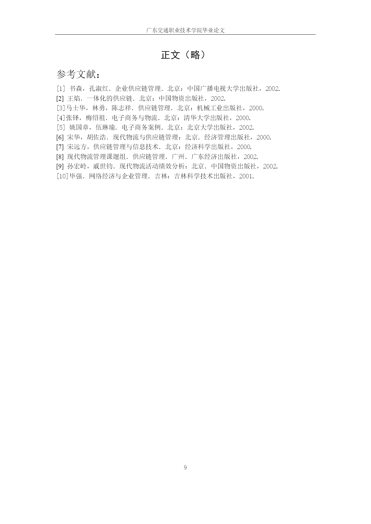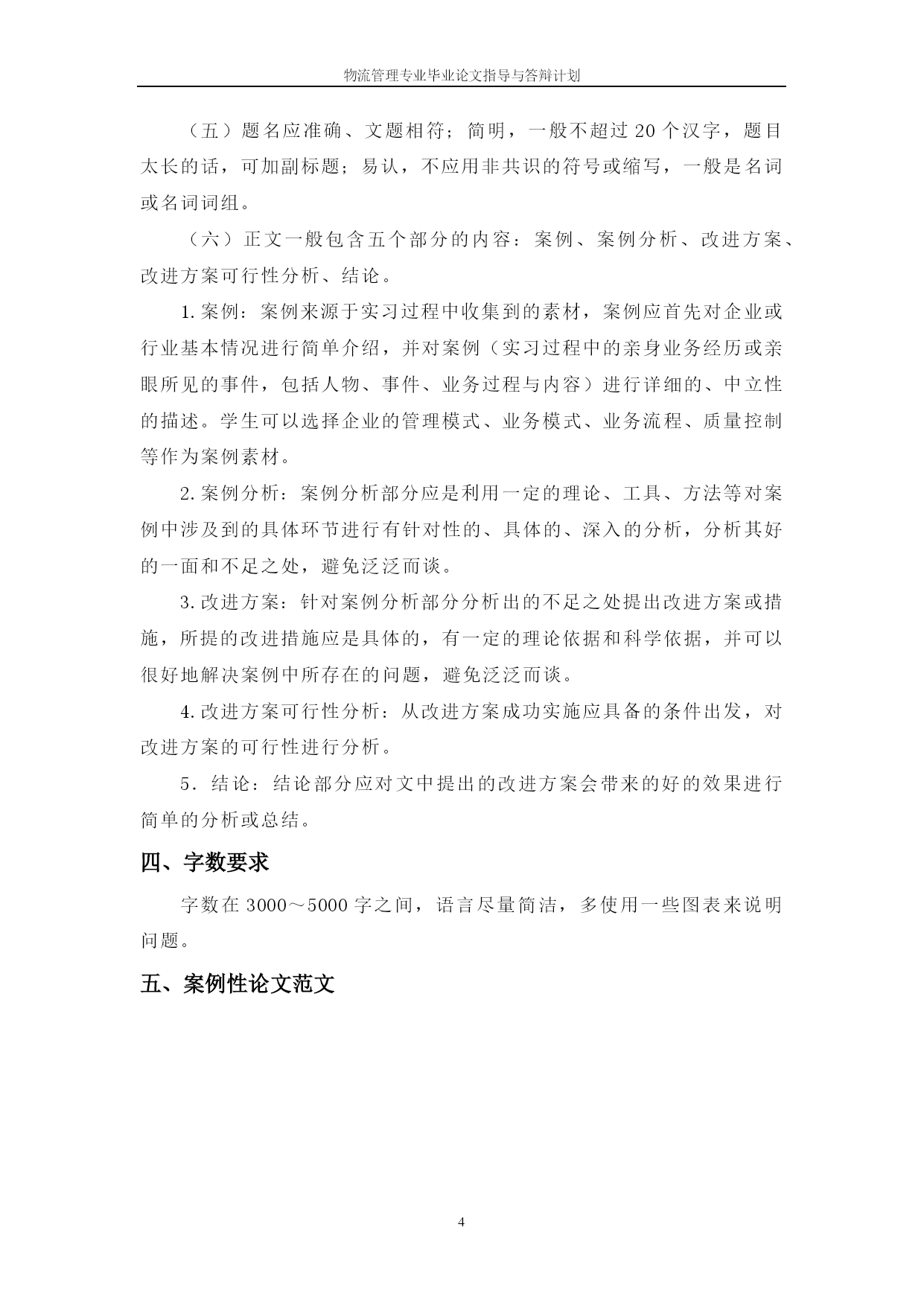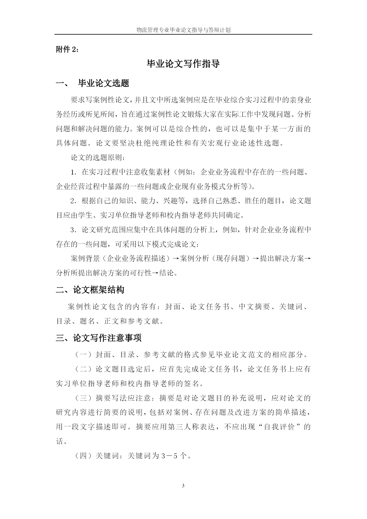 广东交通职业技术学院物流管理专业毕业论文指导与答辩计划物流与运输管理学院物流管理系2007年12月物流管理专业毕业论文指导与答辩计划PAGE4组织领导08届物流管理专业毕业论文指导与答辩小组组长:阎子刚组员:屈颖、宋雷、刘如意、蔡远璐、王敏毕业论文时间进度安排1.毕业论文撰写时间:2008年4月1日至4月28日,共四周时间。2.学生必须在2008年4月20日之前完成毕业论文初稿的撰写工作,交给毕业论文指导老师审阅。在收到指导老师的审阅意见后,应尽快按照指导老师所提修改意见对论文进行修改完善,修改后的论文需再次交指导老师审阅,指导老师同意定稿后方可定稿,定稿应在4月27日前完成。3.毕业论文答辩时间:2008年4月29日~4月30日。毕业论文答辩安排1、毕业论文答辩分组进行,每组按学生学号顺序进行答辩。2、学生答辩前应该准备的材料:毕业论文3份(分发给答辩小组老师),答辩陈述幻灯片或者PowerPoint文档。3、答辩时间:每个学生的答辩时间为10分钟,陈述论文主要内容时间为5分钟,回答答辩小组老师提问时间为5分钟。毕业论文成绩的评定毕业论文成绩根据论文完成情况和答辩情况综合评定,采用百分制形式。毕业论文完成后,由指导老师填写评语并评定论文成绩。毕业论文答辩结束后,由答辩小组成员填写“毕业论文答辩评语”并评定毕业论文答辩成绩。不参加毕业论文答辩的学生,成绩评定为不及格。附件附件1:08届物流管理专业毕业论文指导老师安排附件2:毕业论文写作指导附件3:毕业论文答辩指导附件1:08届物流管理专业毕业论文指导老师安排在毕业论文写作过程中,学生应该和指导老师进行充分的沟通,指导老师联系方式见下表。08届物流管理专业毕业论文指导老师安排序号指导老师学生名单1屈颖,13570523255qy@gdcp.cn05物流(1)班1~20号2蔡远璐,35849737;13826179567HYPERLINK"mailto:cyl@gdcp.cn"cyl@gdcp.cn05物流(1)班21~40号3王敏,13929555321HYPERLINK"mailto:wm@gdcp.cn"wm@gdcp.cn05物流(1)班41~59号4刘如意,13682287714HYPERLINK"mailto:liu-ruyi@sohu.com"liu-ruyi@sohu.com;lry@gdcp.cn05物流(2)班1~20号5宋雷,85980288;13926005303HYPERLINK"mailto:eb_sun@163.com"eb_sun@163.com;sl@gdcp.cn05物流(2)班21~40号6阎子刚,13501508242,87025889HYPERLINK"mailto:yanzg@gdcp.cn"yanzg@gdcp.cn05物流(2)班41~55号附件2:毕业论文写作指导毕业论文选题要求写案例性论文,并且文中所选案例应是在毕业综合实习过程中的亲身业务经历或所见所闻,旨在通过案例性论文锻炼大家在实际工作中发现问题、分析问题和解决问题的能力。案例可以是综合性的,也可以是集中于某一方面的具体问题。论文要坚决杜绝纯理论性和有关宏观行业论述性选题。论文的选题原则:1.在实习过程中注意收集素材(例如:企业业务流程中存在的一些问题、企业经营过程中暴露的一些问题或企业现有业务模式分析等)。2.根据自己的知识、能力、兴趣等,选择自己熟悉、胜任的题目,论文题目应由学生、实习单位指导老师和校内指导老师共同确定。3.论文研究范围应集中在具体问题的分析上,例如,针对企业业务流程中存在的一些问题,可采用以下模式完成论文:案例背景(企业业务流程描述)→案例分析(现存问题)→提出解决方案→分析所提出解决方案的可行性→结论。二、论文框架结构案例性论文包含的内容有:封面、论文任务书、中文摘要、关键词、目录、题名、正文和参考文献。三、论文写作注意事项(一)封面、目录、参考文献的格式参见毕业论文范文的相应部分。(二)论文题目选定后,应首先完成论文任务书,论文任务书上应有实习单位指导老师和校内指导老师的签名。(三)摘要写法应注意:摘要是对论文题目的补充说明,应对论文的研究内容进行简要的说明,包括对案例、存在问题及改进方案的简单描述,用一段文字描述即可。摘要应用第三人称表达,不应出现“自我评价”的话。(四)关键词:关键词为3-5个。(五)题名应准确、文题相符;简明,一般不超过20个汉字,题目太长的话,可加副标题;易认,不应用非共识的符号或缩写,一般是名词或名词词组。(六)正