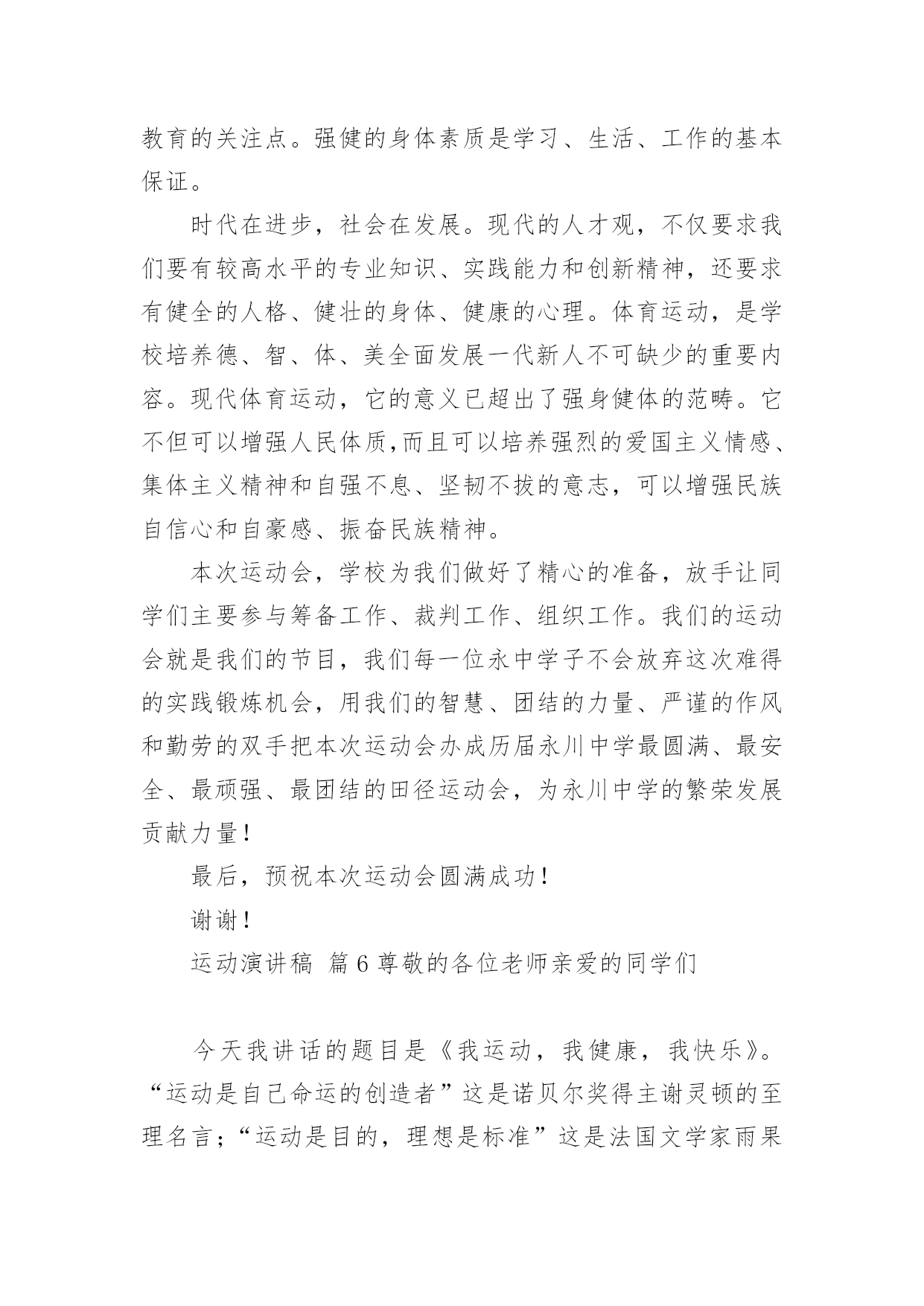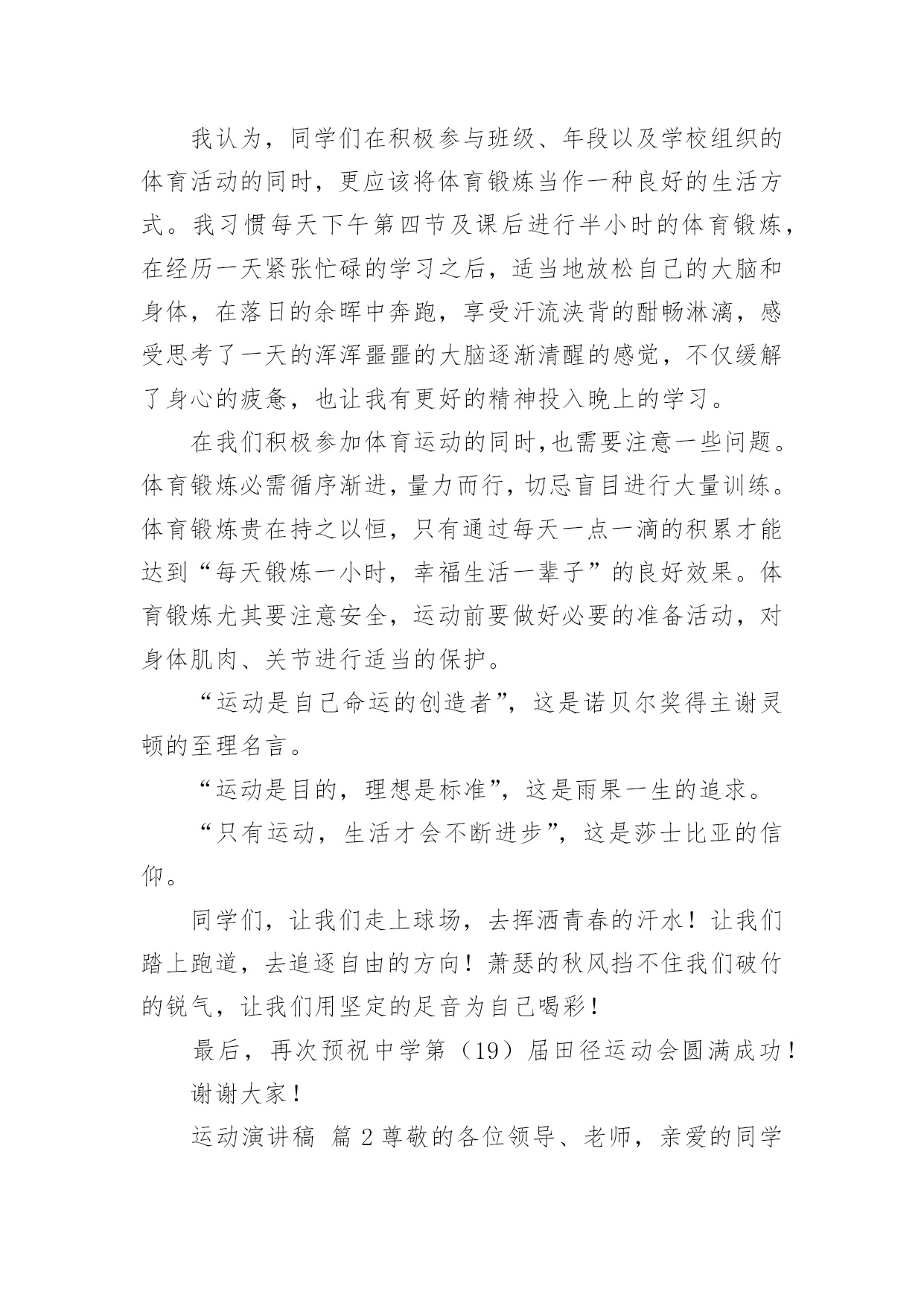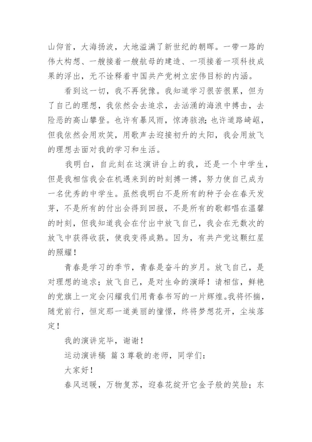 运动演讲稿关于运动演讲稿(精选20篇)演讲稿的写法比较灵活,可以根据会议的内容、一件事事后的感想、需要等情况而有所区别。在现实社会中,在很多情况下我们需要用到演讲稿,那么你有了解过演讲稿吗?以下是小编为大家整理的关于运动演讲稿,欢迎大家借鉴与参考,希望对大家有所帮助。运动演讲稿篇1尊敬的老师,亲爱的同学们:大家早上好!今天我讲话的主题是让运动成为自己的生活方式。居里夫人曾说:“科学的基础是健康的身体”。拥有一个健康而强健的身体,才有追逐梦想与希望的本钱。作为高中学生,我们更加需要强健的体魄和充足的精力来应对紧张繁重的学习生活。而健康的身体正是来源于长期的体育锻炼。同时,作为一种健康的生活情趣,体育运动对于心理素质的提高也极为有益。我曾经参加校运会的长跑比赛,在长跑过程中常常要忍受体能极限的考验,每一次想要停下来时,我都会告诉自己一定要坚持,坚持下去就会有成功的希望!是长跑教我学会了隐忍与坚持,教会了我勇敢面对一切困难与挑战,绝不轻言放弃。在现今倡导可持续发展的社会,坚持体育锻炼对于个人的未来发展、全面发展都更加有时代意义。那么,我们应该如何参加体育运动呢?我认为,同学们在积极参与班级、年段以及学校组织的体育活动的同时,更应该将体育锻炼当作一种良好的生活方式。我习惯每天下午第四节及课后进行半小时的体育锻炼,在经历一天紧张忙碌的学习之后,适当地放松自己的大脑和身体,在落日的余晖中奔跑,享受汗流浃背的酣畅淋漓,感受思考了一天的浑浑噩噩的大脑逐渐清醒的感觉,不仅缓解了身心的疲惫,也让我有更好的精神投入晚上的学习。在我们积极参加体育运动的同时,也需要注意一些问题。体育锻炼必需循序渐进,量力而行,切忌盲目进行大量训练。体育锻炼贵在持之以恒,只有通过每天一点一滴的积累才能达到“每天锻炼一小时,幸福生活一辈子”的良好效果。体育锻炼尤其要注意安全,运动前要做好必要的准备活动,对身体肌肉、关节进行适当的保护。“运动是自己命运的创造者”,这是诺贝尔奖得主谢灵顿的至理名言。“运动是目的,理想是标准”,这是雨果一生的追求。“只有运动,生活才会不断进步”,这是莎士比亚的信仰。同学们,让我们走上球场,去挥洒青春的汗水!让我们踏上跑道,去追逐自由的方向!萧瑟的秋风挡不住我们破竹的锐气,让我们用坚定的足音为自己喝彩!最后,再次预祝中学第(19)届田径运动会圆满成功!谢谢大家!运动演讲稿篇2尊敬的各位领导、老师,亲爱的同学们:大家好!非常高兴和大家一起来感受我们青少年的豪迈情怀。我叫杨天宇,我演讲的题目是“青春向党,放飞梦想”。我是一名中学生,从小就在心里种下了理想的种子。为着这个理想,我刻苦学习,默默奋斗,获得了一个又一个的第一。但我也因此失去了许多快乐的休闲时光。曾经,我羡慕别人聊着QQ,刷着微博,逛着淘宝,玩着游戏,这些远比学习有趣多了!我开始动摇,想到放弃。可就在无数次的彷徨中,一个个鲜活的形象,一段段感人的历史又为我注入了奋发的动力。我看到了每天用真诚的言行、用生命的痕迹来教诲我们的老师,他们一生都在无怨无悔的用自己的青春和生命捍卫着教师职业的圣洁,不图回报,只愿桃李满天;我看到了在四川凉山森林火灾中奋战在火海,保护国家和人民财产安全的消防战士,他们在布满烟火的战场里悄无声息地拼命,只为保一方平安;我看到了那些用自己的实际行动诠释着共产党员内涵的感动中国人物,他们为党和人民奉献自己的一生,尽职尽责,鞠躬尽瘁,无怨无悔,只愿用短暂而又辉煌的一生塑造出中国共产党员光辉灿烂的形象。拉开历史的画卷,在祖国风雨如磐、长夜难明的黑暗年代,在列强侵略、军阀混战、政治腐败、民不聊生、国家命运岌岌可危的危急时刻,我看到了开创中国历史新时代的伟大政党。它一路风雨,一路坎坷,一路战绩,一路辉煌!高山仰首,大海扬波,大地溢满了新世纪的朝晖。一带一路的伟大构想、一艘接着一艘航母的建造、一项接着一项科技成果的浮出,无不诠释着中国共产党树立宏伟目标的内涵。看到这一切,我不再犹豫。我知道学习很苦很累,但为了自己的理想,我依然会去追求,去汹涌的海浪中搏击,去险恶的高山攀登。也许有暴风雨,惊涛骇浪;也许道路崎岖,但我依然会用欢笑,用歌声去迎接初升的太阳,我会用放飞的理想去面对我的学习和生活。我明白,自此刻在这演讲台上的我,还是一个中学生,但是我相信我会在机遇来到的时刻搏一搏,努力使自己成为一名优秀的中学生。虽然我明白不是所有的种子会在春天发芽,不是所有的付出会得到回报,不是所有的歌都唱在温馨的时刻,但我知道我会在付出中放飞自己,我会在无数次的放飞中获得收获,使我变得成熟。因为,有共产党这颗红星的照耀!青春是学习的季节,青春是奋斗的岁月。放飞自己,是对理想的追求;放飞自己,是对生命的演绎!请相信,鲜艳的党旗上一定会闪耀我们用青春书写的一片辉煌。我将怀揣,随党前行,恒定那一道美丽的憧憬,