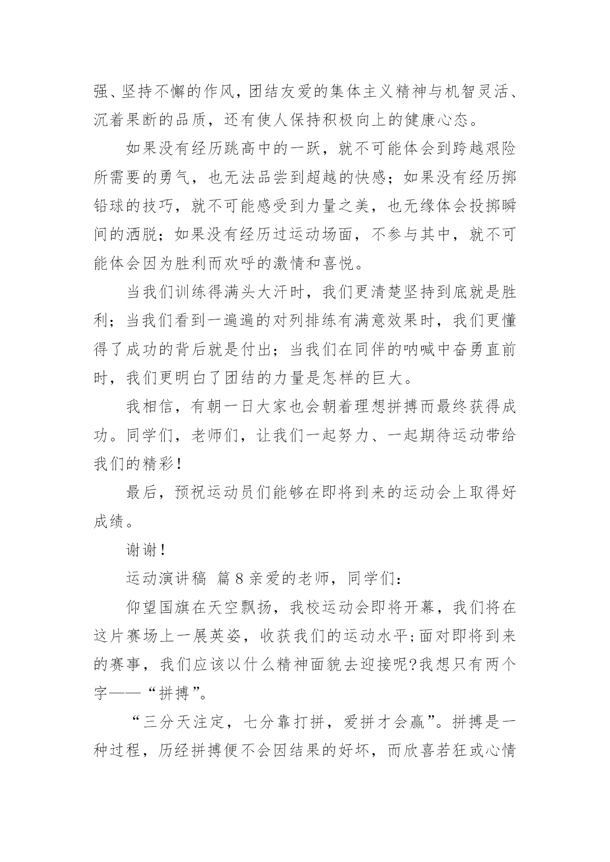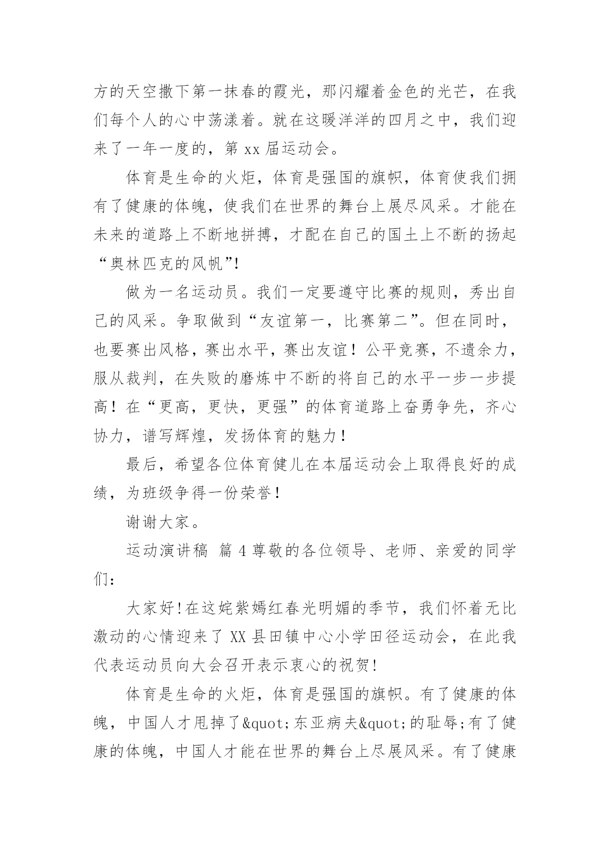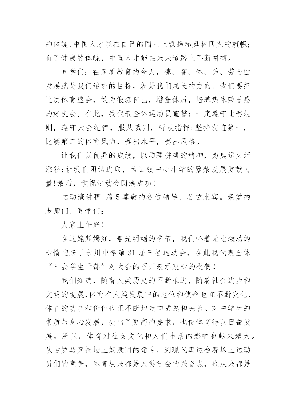 运动演讲稿关于运动演讲稿(精选20篇)演讲稿的写法比较灵活,可以根据会议的内容、一件事事后的感想、需要等情况而有所区别。在现实社会中,在很多情况下我们需要用到演讲稿,那么你有了解过演讲稿吗?以下是小编为大家整理的关于运动演讲稿,欢迎大家借鉴与参考,希望对大家有所帮助。运动演讲稿篇1尊敬的老师,亲爱的同学们:大家早上好!今天我讲话的主题是让运动成为自己的生活方式。居里夫人曾说:“科学的基础是健康的身体”。拥有一个健康而强健的身体,才有追逐梦想与希望的本钱。作为高中学生,我们更加需要强健的体魄和充足的精力来应对紧张繁重的学习生活。而健康的身体正是来源于长期的体育锻炼。同时,作为一种健康的生活情趣,体育运动对于心理素质的提高也极为有益。我曾经参加校运会的长跑比赛,在长跑过程中常常要忍受体能极限的考验,每一次想要停下来时,我都会告诉自己一定要坚持,坚持下去就会有成功的希望!是长跑教我学会了隐忍与坚持,教会了我勇敢面对一切困难与挑战,绝不轻言放弃。在现今倡导可持续发展的社会,坚持体育锻炼对于个人的未来发展、全面发展都更加有时代意义。那么,我们应该如何参加体育运动呢?我认为,同学们在积极参与班级、年段以及学校组织的体育活动的同时,更应该将体育锻炼当作一种良好的生活方式。我习惯每天下午第四节及课后进行半小时的体育锻炼,在经历一天紧张忙碌的学习之后,适当地放松自己的大脑和身体,在落日的余晖中奔跑,享受汗流浃背的酣畅淋漓,感受思考了一天的浑浑噩噩的大脑逐渐清醒的感觉,不仅缓解了身心的疲惫,也让我有更好的精神投入晚上的学习。在我们积极参加体育运动的同时,也需要注意一些问题。体育锻炼必需循序渐进,量力而行,切忌盲目进行大量训练。体育锻炼贵在持之以恒,只有通过每天一点一滴的积累才能达到“每天锻炼一小时,幸福生活一辈子”的良好效果。体育锻炼尤其要注意安全,运动前要做好必要的准备活动,对身体肌肉、关节进行适当的保护。“运动是自己命运的创造者”,这是诺贝尔奖得主谢灵顿的至理名言。“运动是目的,理想是标准”,这是雨果一生的追求。“只有运动,生活才会不断进步”,这是莎士比亚的信仰。同学们,让我们走上球场,去挥洒青春的汗水!让我们踏上跑道,去追逐自由的方向!萧瑟的秋风挡不住我们破竹的锐气,让我们用坚定的足音为自己喝彩!最后,再次预祝中学第(19)届田径运动会圆满成功!谢谢大家!运动演讲稿篇2尊敬的各位领导、老师,亲爱的同学们:大家好!非常高兴和大家一起来感受我们青少年的豪迈情怀。我叫杨天宇,我演讲的题目是“青春向党,放飞梦想”。我是一名中学生,从小就在心里种下了理想的种子。为着这个理想,我刻苦学习,默默奋斗,获得了一个又一个的第一。但我也因此失去了许多快乐的休闲时光。曾经,我羡慕别人聊着QQ,刷着微博,逛着淘宝,玩着游戏,这些远比学习有趣多了!我开始动摇,想到放弃。可就在无数次的彷徨中,一个个鲜活的形象,一段段感人的历史又为我注入了奋发的动力。我看到了每天用真诚的言行、用生命的痕迹来教诲我们的老师,他们一生都在无怨无悔的用自己的青春和生命捍卫着教师职业的圣洁,不图回报,只愿桃李满天;我看到了在四川凉山森林火灾中奋战在火海,保护国家和人民财产安全的消防战士,他们在布满烟火的战场里悄无声息地拼命,只为保一方平安;我看到了那些用自己的实际行动诠释着共产党员内涵的感动中国人物,他们为党和人民奉献自己的一生,尽职尽责,鞠躬尽瘁,无怨无悔,只愿用短暂而又辉煌的一生塑造出中国共产党员光辉灿烂的形象。拉开历史的画卷,在祖国风雨如磐、长夜难明的黑暗年代,在列强侵略、军阀混战、政治腐败、民不聊生、国家命运岌岌可危的危急时刻,我看到了开创中国历史新时代的伟大政党。它一路风雨,一路坎坷,一路战绩,一路辉煌!高山仰首,大海扬波,大地溢满了新世纪的朝晖。一带一路的伟大构想、一艘接着一艘航母的建造、一项接着一项科技成果的浮出,无不诠释着中国共产党树立宏伟目标的内涵。看到这一切,我不再犹豫。我知道学习很苦很累,但为了自己的理想,我依然会去追求,去汹涌的海浪中搏击,去险恶的高山攀登。也许有暴风雨,惊涛骇浪;也许道路崎岖,但我依然会用欢笑,用歌声去迎接初升的太阳,我会用放飞的理想去面对我的学习和生活。我明白,自此刻在这演讲台上的我,还是一个中学生,但是我相信我会在机遇来到的时刻搏一搏,努力使自己成为一名优秀的中学生。虽然我明白不是所有的种子会在春天发芽,不是所有的付出会得到回报,不是所有的歌都唱在温馨的时刻,但我知道我会在付出中放飞自己,我会在无数次的放飞中获得收获,使我变得成熟。因为,有共产党这颗红星的照耀!青春是学习的季节,青春是奋斗的岁月。放飞自己,是对理想的追求;放飞自己,是对生命的演绎!请相信,鲜艳的党旗上一定会闪耀我们用青春书写的一片辉煌。我将怀揣,随党前行,恒定那一道美丽的憧憬,