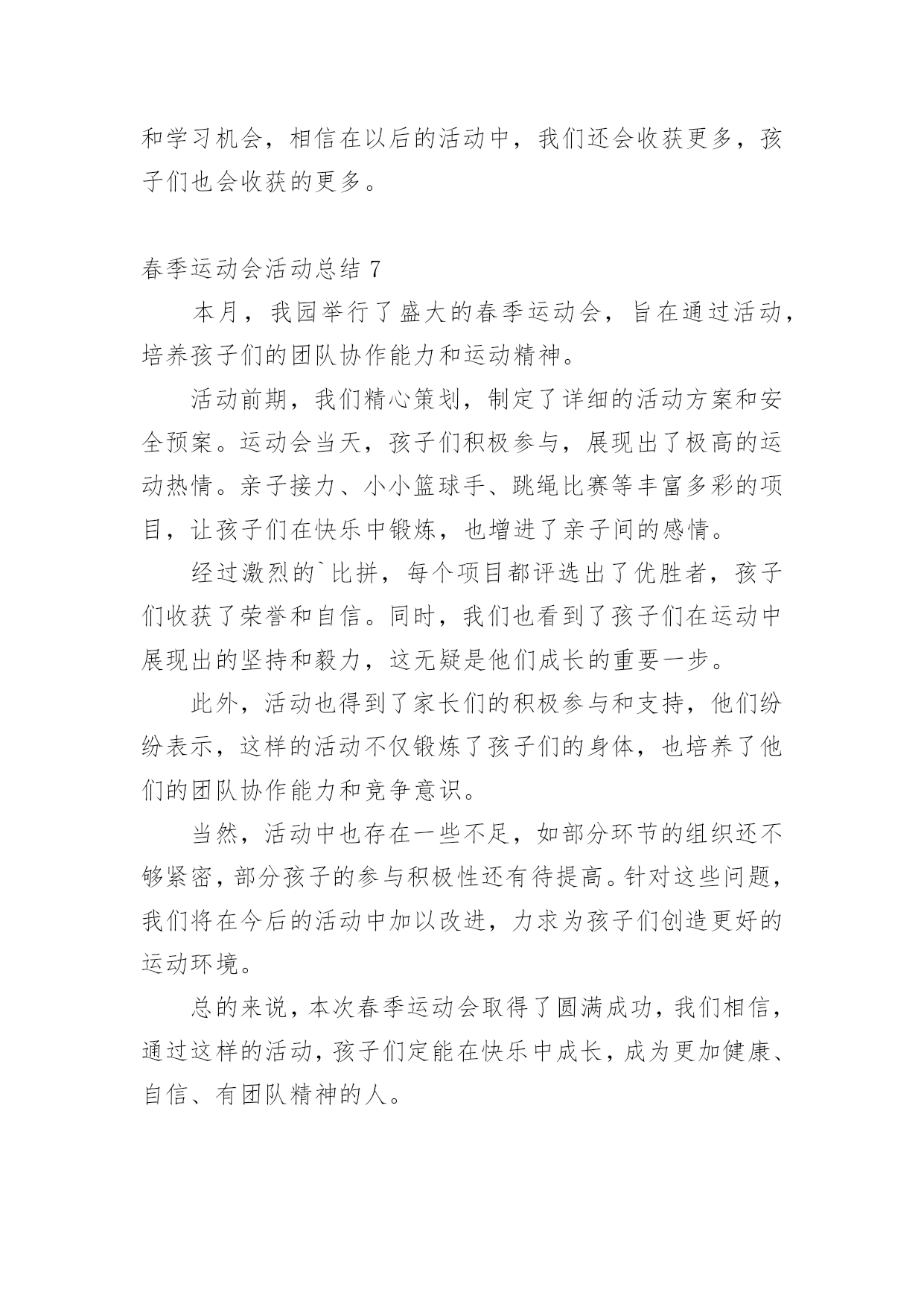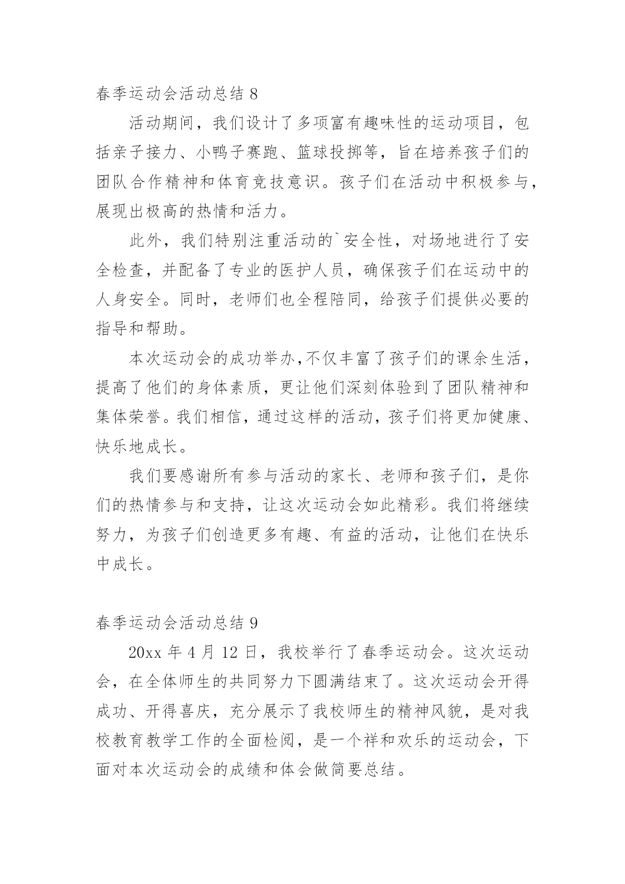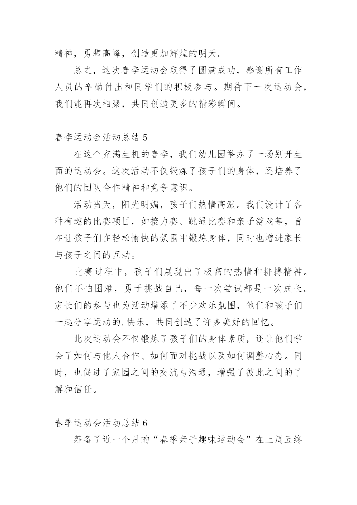 春季运动会活动总结总结是指社会团体、企业单位和个人对某一阶段的学习、工作或其完成情况加以回顾和分析,得出教训和一些规律性认识的一种书面材料,它可以提升我们发现问题的能力,让我们来为自己写一份总结吧。那么你真的懂得怎么写总结吗?以下是小编整理的春季运动会活动总结,希望能够帮助到大家。春季运动会活动总结1为了丰富初中学生课余生活,促进同学间的团结协作能力,培养集体精神,学校在体操馆成功举办了以“携手趣味运动,共奏青春乐章”为主题的春季趣味运动会。活动一共分为8个游戏项目,游戏开始前设有开场杯子舞表演,游戏中场设有衣原体走秀表演。一、活动优点1、活动场地为室内,提高了学生们的积极性,减小了游戏阻力,提高了游戏的安全性。2、开场的杯子舞表演,让更多同学参与到了本次活动中,提高了活动的参与度的同时,培养了大家的协作精神。3、游戏内容新颖,其中融入智慧与团结等要素,充分提高游戏的吸引力。例如“众人皆醉我独醒”、“百变星君”等游戏项目充分考验了团体协作能力,赢得了了大家的笑声与掌声。4、对参赛人员进行游戏内容的`提前讲解,保证每个人对游戏规则充分了解,对活动当天游戏的顺利进行起到了很大的辅助作用。5、为每个班安排一名负责人,带比赛人员入场,保证了活动场地的有序性。6、将每项工作细化到个人,并且有负责人负责,保证每项工作顺利进行。二、活动意义此次春季趣味运动会大家热情高涨,在趣味欢笑中各班同学团结进取,奋勇争先,不仅丰富了我院同学的课余文化生活,更增强了班级凝聚力。展现了我院同学良好的精神面貌。我们权益部也会在以后的活动中不断改善和完善细节,精益求精,办出更好的活动。春季运动会活动总结2x月x日上午x时,xx镇xx小学全体师生,在庄严的国旗下,伴着高亢激昂的《运动员进行曲》旋律,迈着矫健的步伐,意气风发,斗志昂扬,通过主席台,开幕式由副校长xxx主持,校长xxx致开幕词,队员代表xxx、裁判员代表xxx分别宣誓,随后拉开了阳光体育运动比赛序幕。此运动会,共设田赛、径赛、球赛三大类,xx个小项目,x个年级代表队,xx名学生参赛。比赛中,队员们发扬“团结、友谊、紧张、拼搏、奋进”的精神和毅力,弘扬“更高、更快、更强”的.体育章程,尊重裁判,顽强拼搏,奋勇争先。观众们的呐喊声、欢呼声、加油声此起彼伏。经过一天的角逐,xx人次打破本校体育x项纪录,一批身心素质优良、竞技水平高的少儿脱颖而出。下午x时的颁奖仪式上,组委会为获得一、二、三等奖的x个班集体和xx名队员颁发了奖状。整个运动会“团结、和谐、紧张、严肃、愉悦”,充满阳光,充满温馨,充满幸福,既展现了学生的身心素质,又展现了师生只争朝夕、勇往直前的勃勃生机,进而有力推进“阳光体育”运动的开展。春季运动会活动总结3面对温暖的冬日阳光,伴随着欢快的音乐,第一次校运会在xx全体师生的笑声中落幕。本周一周二,我们小学激烈竞争了一天半。在比赛过程中,运动员表现出顽强的斗志。他们摩拳擦掌,毫不示弱。为了取得更好的成绩,年轻的跳高运动员尽了最大努力。xx获男子立定跳远第六名,xx获女子立定跳远第五名。有些学生即使失败也不放弃。这种不断超越自己的精神是他们在这场比赛中获得的巨大财富,也是他们未来走得更高更远的坚实基础。垒球比赛的选手相互竞争,成绩越来越远。最终,xx获得年级女子第三名;她手中的垒球仿佛变成了一个充满期待的`许愿球,不断追逐着她的梦想。各种比赛,整个球场沸腾,欢呼声此起彼伏。我们年轻的运动员像兔子一样从起点飞走,像利箭一样冲向终点。最终,我们的同学xx获得了年级男子200米第五名;xx在年级女子200米比赛中获得第七名。xx获女子800米第五名;无论选手是否排名,在我们观众的心中,这些年轻的运动员都打出了不屈不挠、顽强拼搏的体育精神,他们都是运动场上的“英雄”。总之,这次校运会圆满成功,赛场上挥汗如雨,主席台上笑容满面。这次运动会的同学们表现出了轰轰烈烈的作风和顽强的作风,这次精彩的运动会将长久地留在我们的记忆里。春季运动会活动总结4春日的阳光洒满操场,我校的春季运动会圆满落幕。这次活动,不仅锻炼了孩子们的身体,更培养了他们的团队协作精神和竞争意识。活动前期,各班级积极准备,同学们热情高涨。比赛当天,操场上欢声笑语,气氛热烈。跑步、跳远、接力……每一项比赛都吸引了众多师生的目光。选手们全力以赴,观众也为他们加油鼓劲,展现了团结、拼搏的体育精神。此外,活动还增设了亲子项目,让家长们也参与其中,增进了家校之间的联系。家长们纷纷表示,这样的'活动既锻炼了孩子,又拉近了与孩子的距离,非常有意义。此次运动会,不仅是一次体育盛会,更是一次教育盛会。它让孩子们明白了团队合作的重要性,体验了成功的喜悦和失败的挫折。在未来的日子里,希望同学们能继续发扬这种精神,勇攀高峰,创造更加辉煌的明天。总之,这次春季运动会取