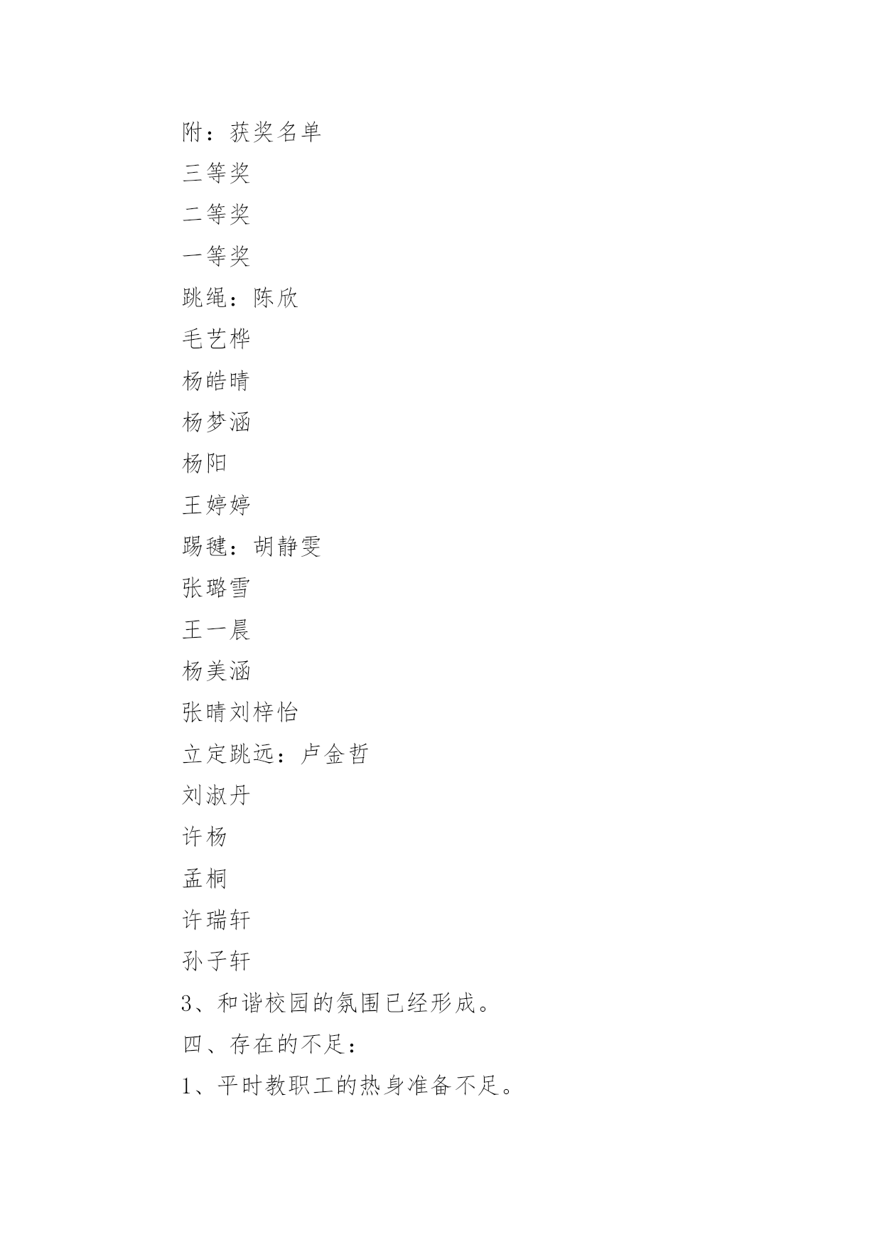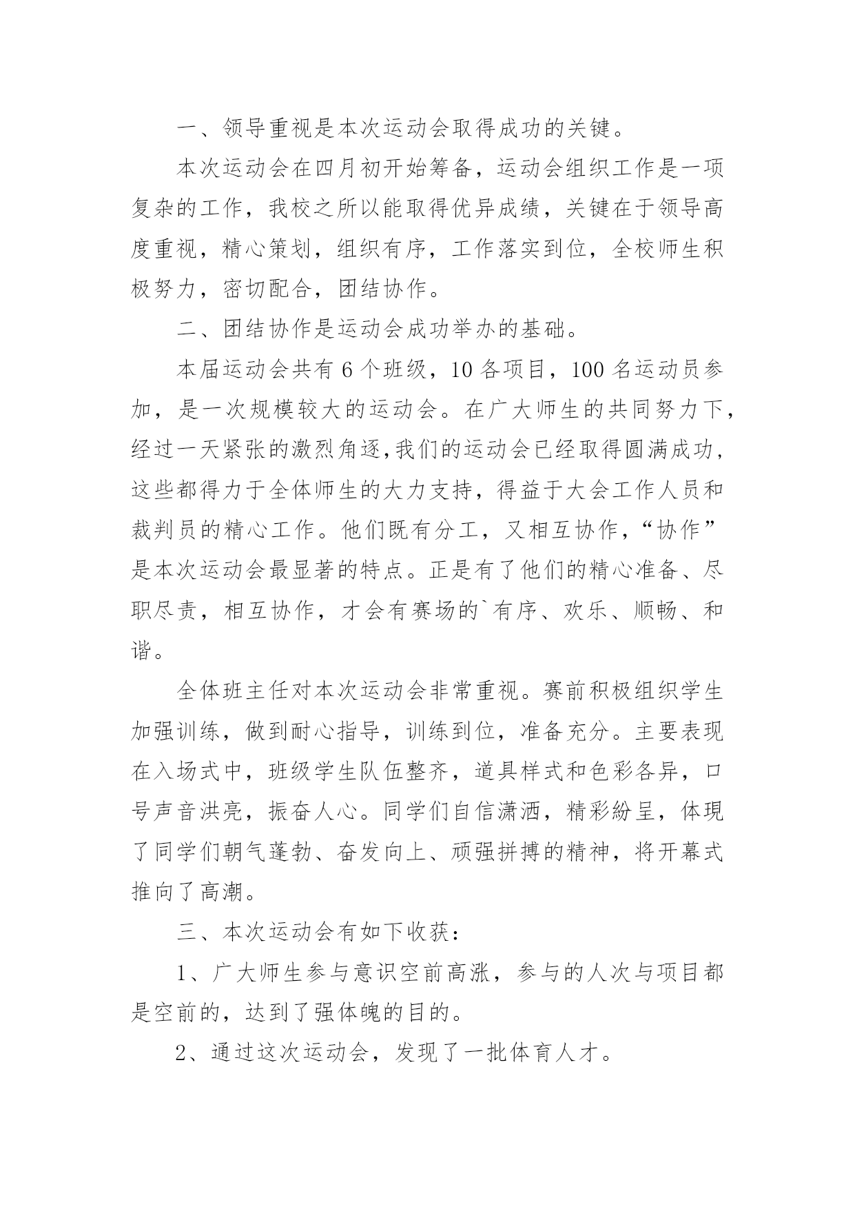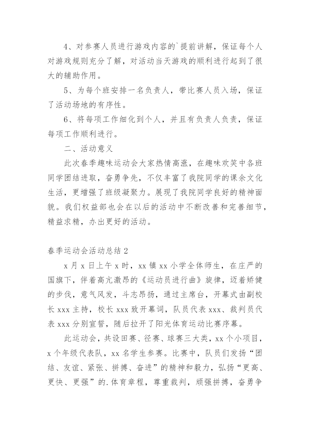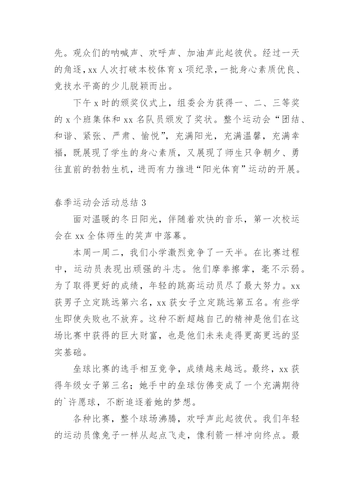 春季运动会活动总结总结是指社会团体、企业单位和个人对某一阶段的学习、工作或其完成情况加以回顾和分析,得出教训和一些规律性认识的一种书面材料,它可以提升我们发现问题的能力,让我们来为自己写一份总结吧。那么你真的懂得怎么写总结吗?以下是小编整理的春季运动会活动总结,希望能够帮助到大家。春季运动会活动总结1为了丰富初中学生课余生活,促进同学间的团结协作能力,培养集体精神,学校在体操馆成功举办了以“携手趣味运动,共奏青春乐章”为主题的春季趣味运动会。活动一共分为8个游戏项目,游戏开始前设有开场杯子舞表演,游戏中场设有衣原体走秀表演。一、活动优点1、活动场地为室内,提高了学生们的积极性,减小了游戏阻力,提高了游戏的安全性。2、开场的杯子舞表演,让更多同学参与到了本次活动中,提高了活动的参与度的同时,培养了大家的协作精神。3、游戏内容新颖,其中融入智慧与团结等要素,充分提高游戏的吸引力。例如“众人皆醉我独醒”、“百变星君”等游戏项目充分考验了团体协作能力,赢得了了大家的笑声与掌声。4、对参赛人员进行游戏内容的`提前讲解,保证每个人对游戏规则充分了解,对活动当天游戏的顺利进行起到了很大的辅助作用。5、为每个班安排一名负责人,带比赛人员入场,保证了活动场地的有序性。6、将每项工作细化到个人,并且有负责人负责,保证每项工作顺利进行。二、活动意义此次春季趣味运动会大家热情高涨,在趣味欢笑中各班同学团结进取,奋勇争先,不仅丰富了我院同学的课余文化生活,更增强了班级凝聚力。展现了我院同学良好的精神面貌。我们权益部也会在以后的活动中不断改善和完善细节,精益求精,办出更好的活动。春季运动会活动总结2x月x日上午x时,xx镇xx小学全体师生,在庄严的国旗下,伴着高亢激昂的《运动员进行曲》旋律,迈着矫健的步伐,意气风发,斗志昂扬,通过主席台,开幕式由副校长xxx主持,校长xxx致开幕词,队员代表xxx、裁判员代表xxx分别宣誓,随后拉开了阳光体育运动比赛序幕。此运动会,共设田赛、径赛、球赛三大类,xx个小项目,x个年级代表队,xx名学生参赛。比赛中,队员们发扬“团结、友谊、紧张、拼搏、奋进”的精神和毅力,弘扬“更高、更快、更强”的.体育章程,尊重裁判,顽强拼搏,奋勇争先。观众们的呐喊声、欢呼声、加油声此起彼伏。经过一天的角逐,xx人次打破本校体育x项纪录,一批身心素质优良、竞技水平高的少儿脱颖而出。下午x时的颁奖仪式上,组委会为获得一、二、三等奖的x个班集体和xx名队员颁发了奖状。整个运动会“团结、和谐、紧张、严肃、愉悦”,充满阳光,充满温馨,充满幸福,既展现了学生的身心素质,又展现了师生只争朝夕、勇往直前的勃勃生机,进而有力推进“阳光体育”运动的开展。春季运动会活动总结3面对温暖的冬日阳光,伴随着欢快的音乐,第一次校运会在xx全体师生的笑声中落幕。本周一周二,我们小学激烈竞争了一天半。在比赛过程中,运动员表现出顽强的斗志。他们摩拳擦掌,毫不示弱。为了取得更好的成绩,年轻的跳高运动员尽了最大努力。xx获男子立定跳远第六名,xx获女子立定跳远第五名。有些学生即使失败也不放弃。这种不断超越自己的精神是他们在这场比赛中获得的巨大财富,也是他们未来走得更高更远的坚实基础。垒球比赛的选手相互竞争,成绩越来越远。最终,xx获得年级女子第三名;她手中的垒球仿佛变成了一个充满期待的`许愿球,不断追逐着她的梦想。各种比赛,整个球场沸腾,欢呼声此起彼伏。我们年轻的运动员像兔子一样从起点飞走,像利箭一样冲向终点。最终,我们的同学xx获得了年级男子200米第五名;xx在年级女子200米比赛中获得第七名。xx获女子800米第五名;无论选手是否排名,在我们观众的心中,这些年轻的运动员都打出了不屈不挠、顽强拼搏的体育精神,他们都是运动场上的“英雄”。总之,这次校运会圆满成功,赛场上挥汗如雨,主席台上笑容满面。这次运动会的同学们表现出了轰轰烈烈的作风和顽强的作风,这次精彩的运动会将长久地留在我们的记忆里。春季运动会活动总结4春日的阳光洒满操场,我校的春季运动会圆满落幕。这次活动,不仅锻炼了孩子们的身体,更培养了他们的团队协作精神和竞争意识。活动前期,各班级积极准备,同学们热情高涨。比赛当天,操场上欢声笑语,气氛热烈。跑步、跳远、接力……每一项比赛都吸引了众多师生的目光。选手们全力以赴,观众也为他们加油鼓劲,展现了团结、拼搏的体育精神。此外,活动还增设了亲子项目,让家长们也参与其中,增进了家校之间的联系。家长们纷纷表示,这样的'活动既锻炼了孩子,又拉近了与孩子的距离,非常有意义。此次运动会,不仅是一次体育盛会,更是一次教育盛会。它让孩子们明白了团队合作的重要性,体验了成功的喜悦和失败的挫折。在未来的日子里,希望同学们能继续发扬这种精神,勇攀高峰,创造更加辉煌的明天。总之,这次春季运动会取