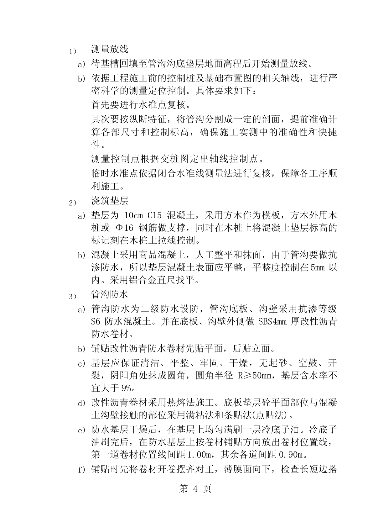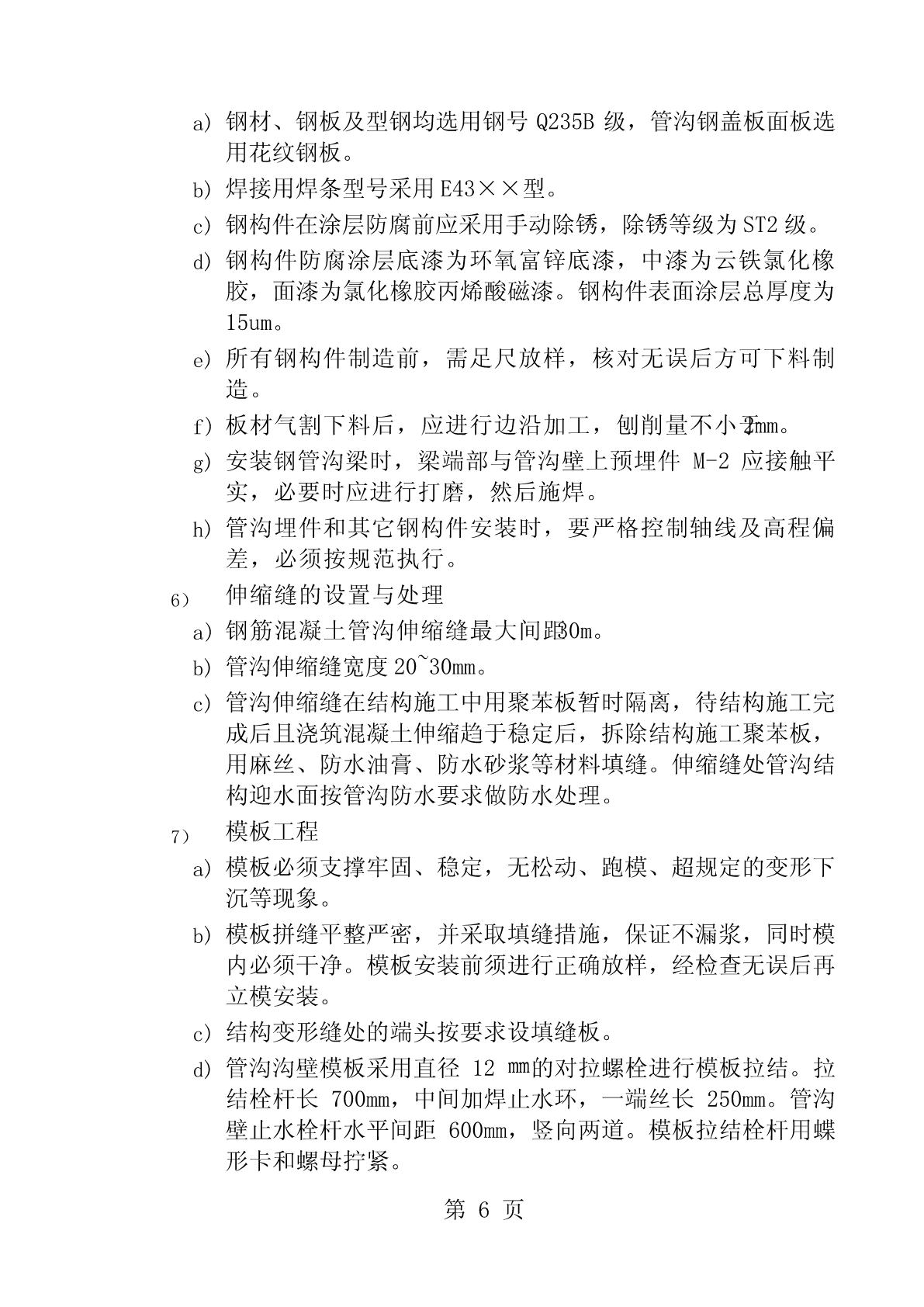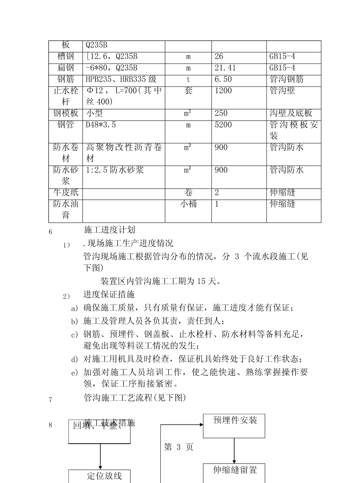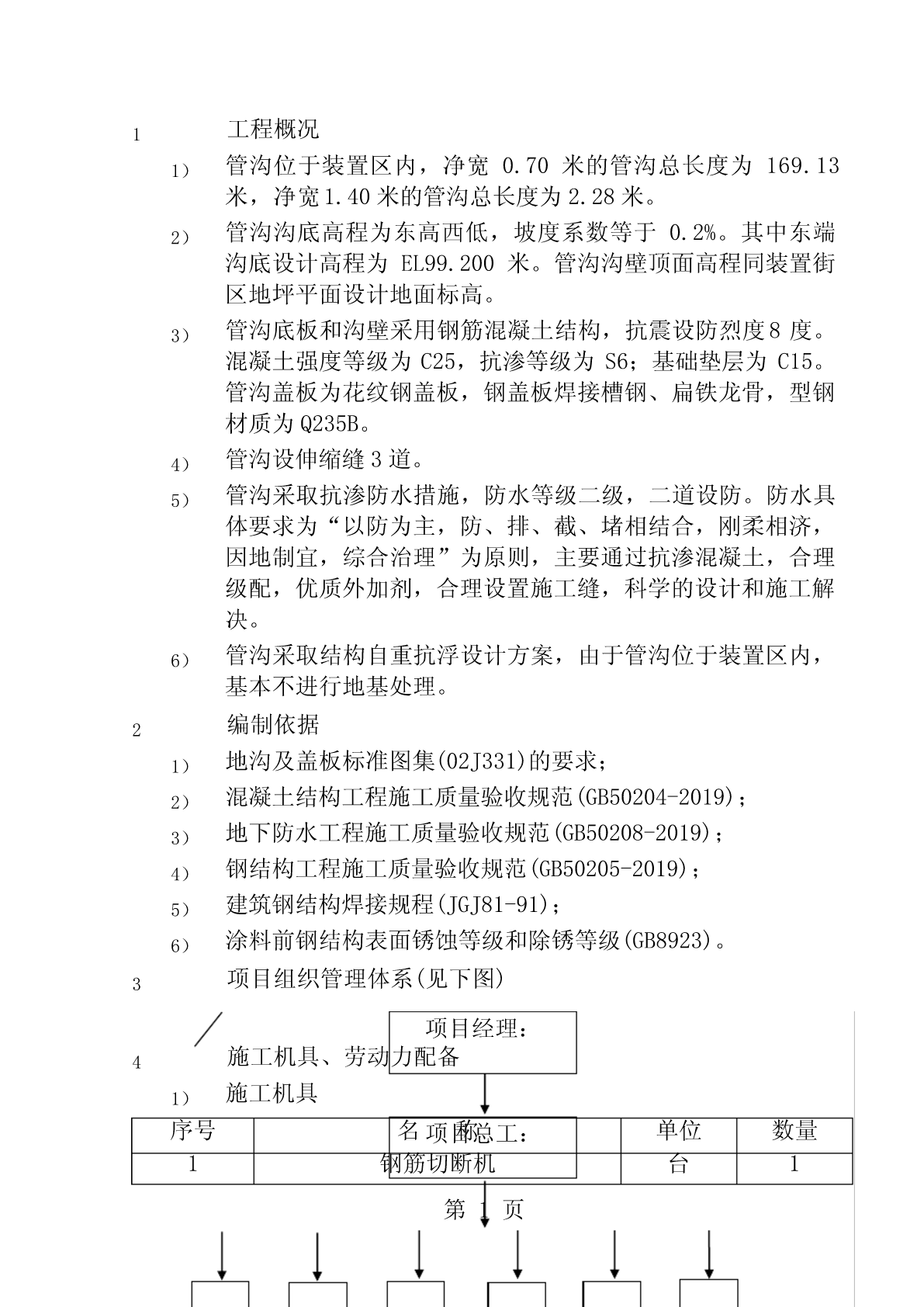 目录1工程概况.............................................12编制依据.............................................13项目组织管理体系.....................................24施工机具、劳动力配备.................................15施工用材料计划.......................................16施工进度计划.........................................37管沟施工工艺流程.....................................38施工技术措施.........................................39安全文明.............................................710工作危险分析(JHA)记录表...........................81工程概况1)管沟位于装置区内,净宽0.70米的管沟总长度为169.13米,净宽1.40米的管沟总长度为2.28米。2)管沟沟底高程为东高西低,坡度系数等于0.2%。其中东端沟底设计高程为EL99.200米。管沟沟壁顶面高程同装置街区地坪平面设计地面标高。3)管沟底板和沟壁采用钢筋混凝土结构,抗震设防烈度8度。混凝土强度等级为C25,抗渗等级为S6;基础垫层为C15。管沟盖板为花纹钢盖板,钢盖板焊接槽钢、扁铁龙骨,型钢材质为Q235B。4)管沟设伸缩缝3道。5)管沟采取抗渗防水措施,防水等级二级,二道设防。防水具体要求为“以防为主,防、排、截、堵相结合,刚柔相济,因地制宜,综合治理”为原则,主要通过抗渗混凝土,合理级配,优质外加剂,合理设置施工缝,科学的设计和施工解决。6)管沟采取结构自重抗浮设计方案,由于管沟位于装置区内,基本不进行地基处理。2编制依据1)地沟及盖板标准图集(02J331)的要求;2)混凝土结构工程施工质量验收规范(GB50204-2019);3)地下防水工程施工质量验收规范(GB50208-2019);4)钢结构工程施工质量验收规范(GB50205-2019);5)建筑钢结构焊接规程(JGJ81-91);6)涂料前钢结构表面锈蚀等级和除锈等级(GB8923)。3项目组织管理体系(见下图)项目经理:4施工机具、劳动力配备1)施工机具序号名项目称总工:单位数量1钢筋切断机台12钢筋调直机台13钢筋成型机台14钢筋弯弧机台1513m长臂反铲挖掘机台1620t自卸式运输车台27蛙式打夯机台18直流电焊机台29氧气、乙炔套210混凝土振动棒只211角磨机台42)劳动力序号名称人数1电工12混凝土工23钢筋工124模板工125电焊工46普工155施工用材料计划物资名规格型号计量单位所需数量使用部位称角铁L63*6,Q235Bm354.55M-1钢板-8*180*180,Q235Bm²1M-2槽钢[12.6,Q235Bm3.5GL15-6槽钢[10,Q235Bm10.3GL8-4角铁L50*6,Q235Bm2.9SC8-1钢板-10*400*400,m²12.53埋板B-1Q235B花纹钢-8*900*495,Q235Bm²164.34GB8-4板槽钢[10,Q235Bm752.71GB8-4扁钢-6*80,Q235Bm887.14GB8-4花纹钢-8*1600*495,m²5.04GB15-4板Q235B槽钢[12.6,Q235Bm26GB15-4扁钢-6*80,Q235Bm21.41GB15-4钢筋HPB235、HRB335级t6.50管沟钢筋止水栓Φ12,L=700(其中套1200管沟壁杆丝400)钢模板小型m²250沟壁及底板钢管D48*3.5m5200管沟模板安装防水卷高聚物改性沥青卷m²900管沟防水材材防水砂1:2.5防水砂浆m²900管沟防水浆牛皮纸卷2伸缩缝防水油小桶1伸缩缝膏6施工进度计划1).现场施工生产进度情况管沟现场施工根据管沟分布的情况,分3个流水段施工(见下图)装置区内管沟施工工期为15天。2)进度保证措施a)确保施工质量,只有质量有保证,施工进度才能有保证;b)施工及管理人员各负其责,责任到人;c)钢筋、预埋件、钢盖板、止水栓杆、防水材料等备料充足,避免出现等料误工情况的发生;d)对施工用机具及时