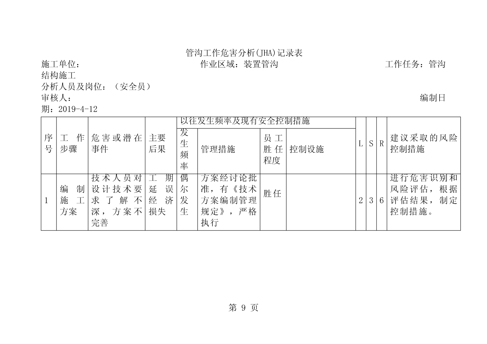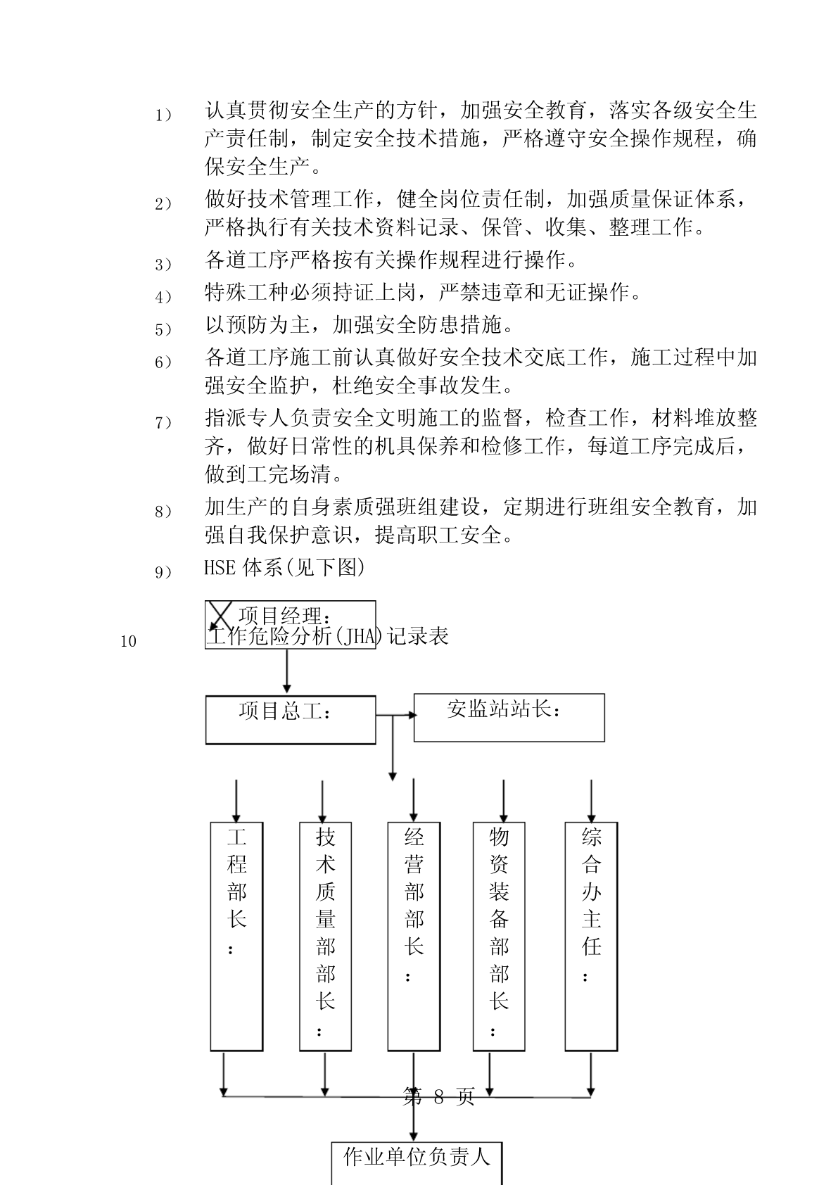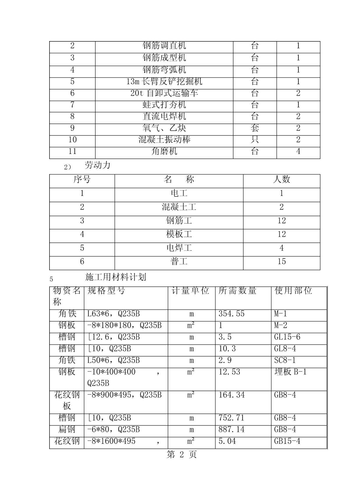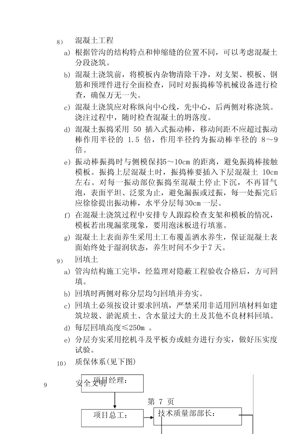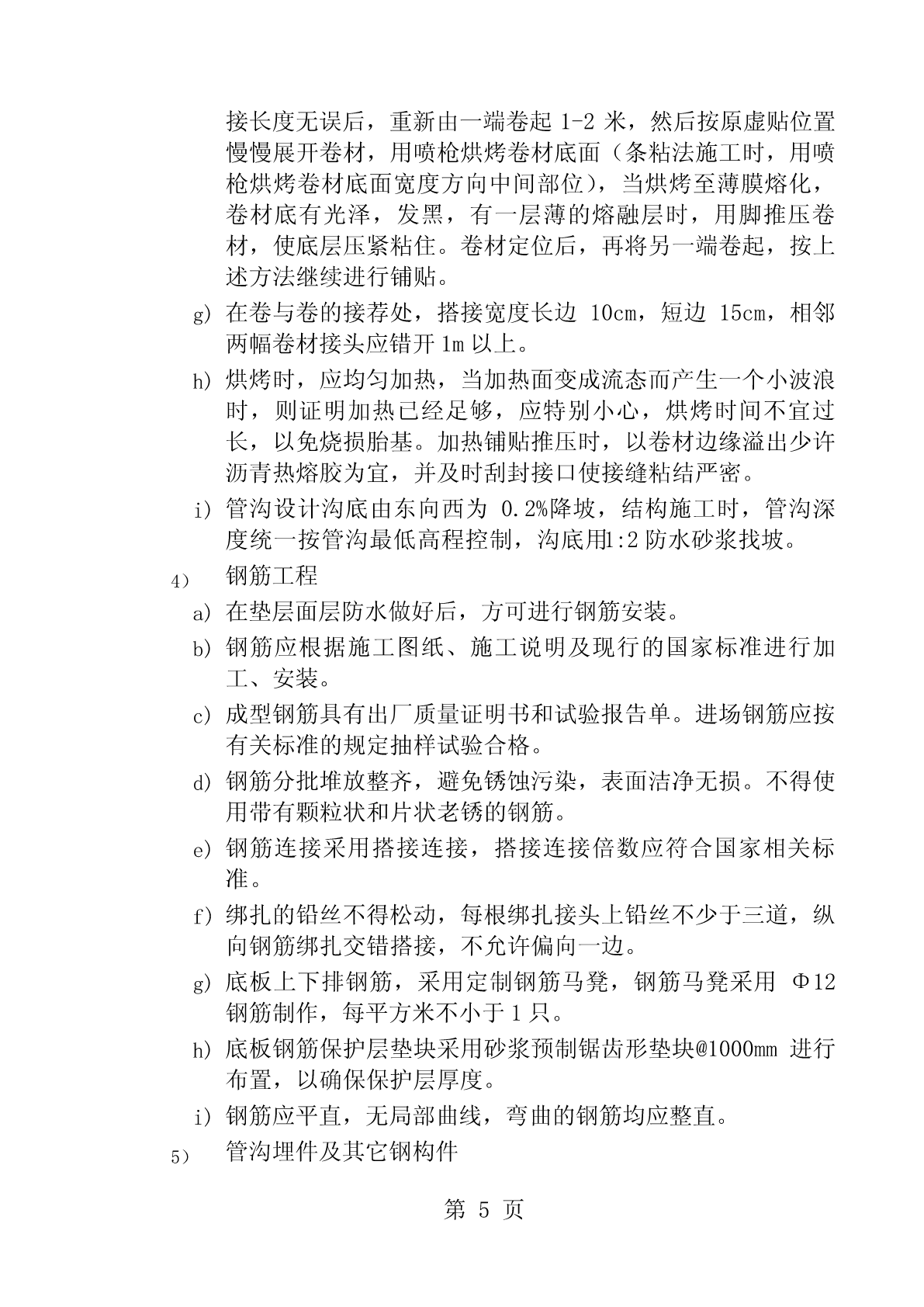 目录1工程概况.............................................12编制依据.............................................13项目组织管理体系.....................................24施工机具、劳动力配备.................................15施工用材料计划.......................................16施工进度计划.........................................37管沟施工工艺流程.....................................38施工技术措施.........................................39安全文明.............................................710工作危险分析(JHA)记录表...........................81工程概况1)管沟位于装置区内,净宽0.70米的管沟总长度为169.13米,净宽1.40米的管沟总长度为2.28米。2)管沟沟底高程为东高西低,坡度系数等于0.2%。其中东端沟底设计高程为EL99.200米。管沟沟壁顶面高程同装置街区地坪平面设计地面标高。3)管沟底板和沟壁采用钢筋混凝土结构,抗震设防烈度8度。混凝土强度等级为C25,抗渗等级为S6;基础垫层为C15。管沟盖板为花纹钢盖板,钢盖板焊接槽钢、扁铁龙骨,型钢材质为Q235B。4)管沟设伸缩缝3道。5)管沟采取抗渗防水措施,防水等级二级,二道设防。防水具体要求为“以防为主,防、排、截、堵相结合,刚柔相济,因地制宜,综合治理”为原则,主要通过抗渗混凝土,合理级配,优质外加剂,合理设置施工缝,科学的设计和施工解决。6)管沟采取结构自重抗浮设计方案,由于管沟位于装置区内,基本不进行地基处理。2编制依据1)地沟及盖板标准图集(02J331)的要求;2)混凝土结构工程施工质量验收规范(GB50204-2019);3)地下防水工程施工质量验收规范(GB50208-2019);4)钢结构工程施工质量验收规范(GB50205-2019);5)建筑钢结构焊接规程(JGJ81-91);6)涂料前钢结构表面锈蚀等级和除锈等级(GB8923)。3项目组织管理体系(见下图)项目经理:4施工机具、劳动力配备1)施工机具序号名项目称总工:单位数量1钢筋切断机台12钢筋调直机台13钢筋成型机台14钢筋弯弧机台1513m长臂反铲挖掘机台1620t自卸式运输车台27蛙式打夯机台18直流电焊机台29氧气、乙炔套210混凝土振动棒只211角磨机台42)劳动力序号名称人数1电工12混凝土工23钢筋工124模板工125电焊工46普工155施工用材料计划物资名规格型号计量单位所需数量使用部位称角铁L63*6,Q235Bm354.55M-1钢板-8*180*180,Q235Bm²1M-2槽钢[12.6,Q235Bm3.5GL15-6槽钢[10,Q235Bm10.3GL8-4角铁L50*6,Q235Bm2.9SC8-1钢板-10*400*400,m²12.53埋板B-1Q235B花纹钢-8*900*495,Q235Bm²164.34GB8-4板槽钢[10,Q235Bm752.71GB8-4扁钢-6*80,Q235Bm887.14GB8-4花纹钢-8*1600*495,m²5.04GB15-4板Q235B槽钢[12.6,Q235Bm26GB15-4扁钢-6*80,Q235Bm21.41GB15-4钢筋HPB235、HRB335级t6.50管沟钢筋止水栓Φ12,L=700(其中套1200管沟壁杆丝400)钢模板小型m²250沟壁及底板钢管D48*3.5m5200管沟模板安装防水卷高聚物改性沥青卷m²900管沟防水材材防水砂1:2.5防水砂浆m²900管沟防水浆牛皮纸卷2伸缩缝防水油小桶1伸缩缝膏6施工进度计划1).现场施工生产进度情况管沟现场施工根据管沟分布的情况,分3个流水段施工(见下图)装置区内管沟施工工期为15天。2)进度保证措施a)确保施工质量,只有质量有保证,施工进度才能有保证;b)施工及管理人员各负其责,责任到人;c)钢筋、预埋件、钢盖板、止水栓杆、防水材料等备料充足,避免出现等料误工情况的发生;d)对施工用机具及时