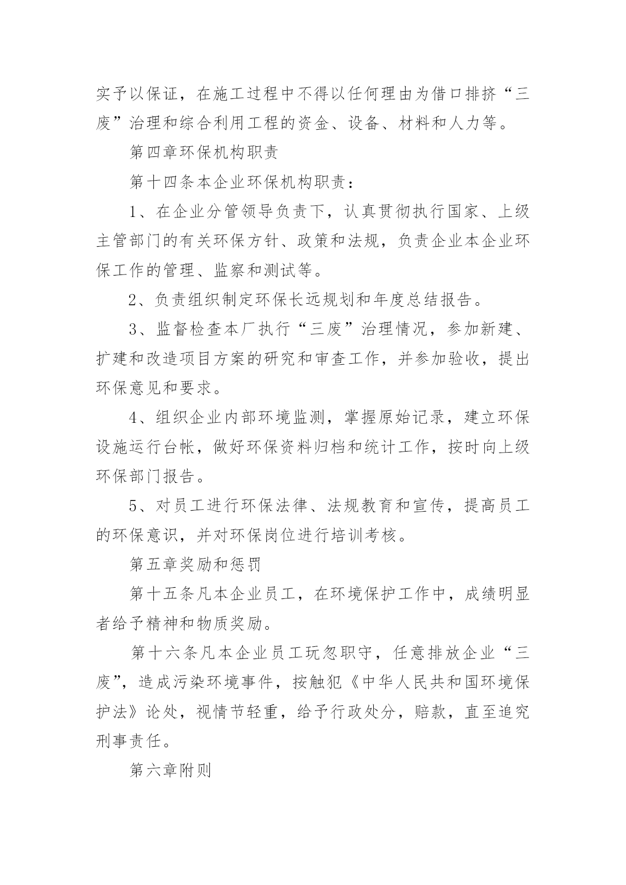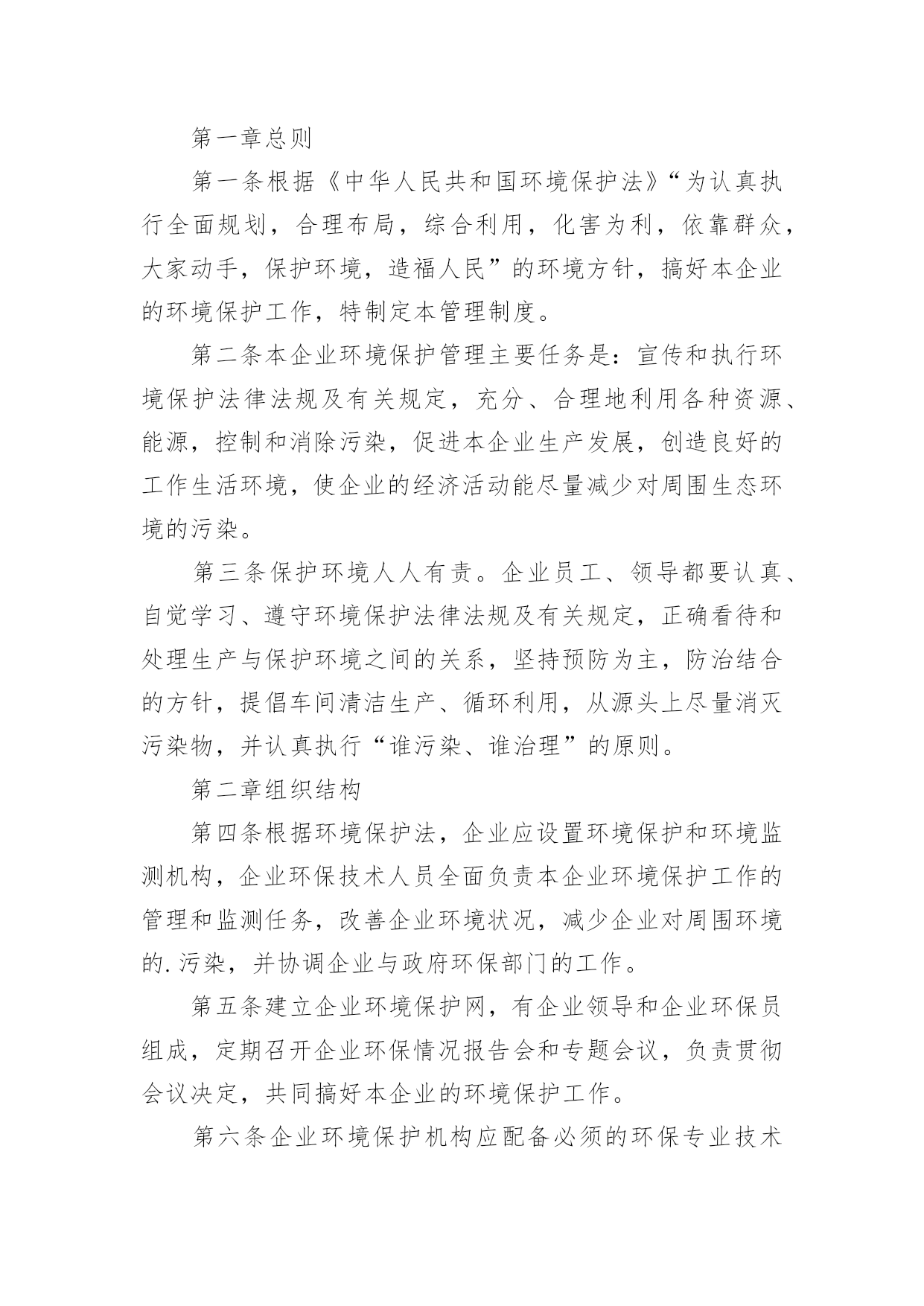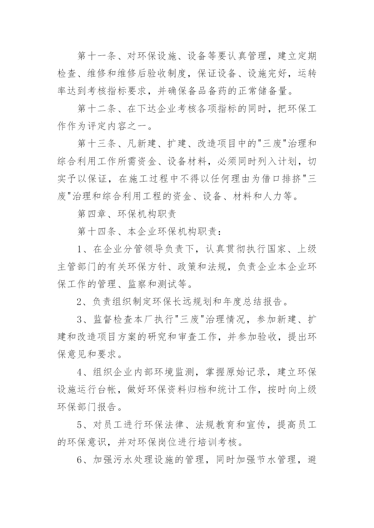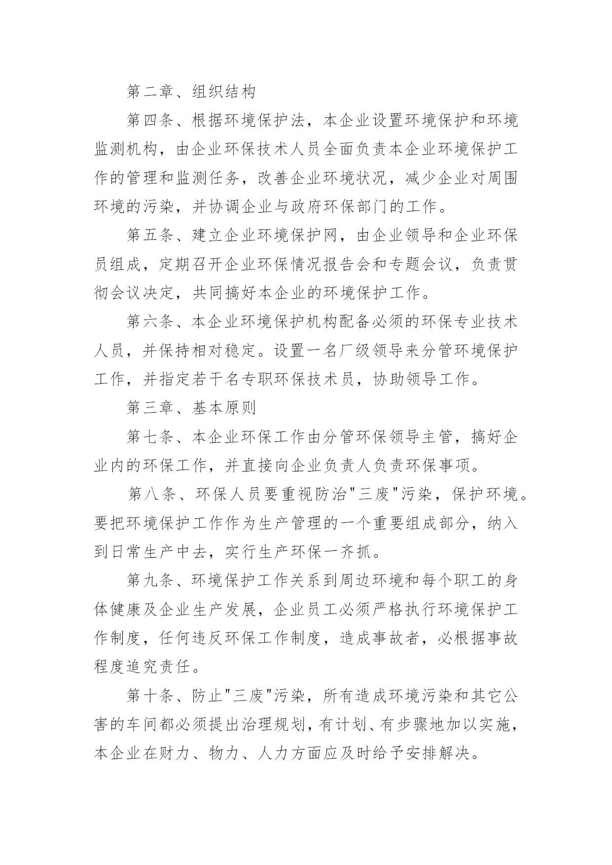 企业环保规章制度企业环保规章制度在日新月异的现代社会中,很多情况下我们都会接触到制度,制度就是在人类社会当中人们行为的准则。想学习拟定制度却不知道该请教谁?以下是小编精心整理的企业环保规章制度,欢迎大家借鉴与参考,希望对大家有所帮助。企业环保规章制度1第一章、总则第一条、根据《中华人民共和国环境保护法》"为认真执行全面规划,合理布局,综合利用,化害为利,依靠群众,大家动手,保护环境,造福人民"的环境方针,搞好本企业的环境保护工作,特制定本规章制度。第二条、本企业环境保护主要任务是:宣传和执行环境保护法律法规及有关规定,充分、合理地利用各种资源、能源,控制和消除污染,促进本企业生产发展,创造良好的工作生活环境,使企业的经济活动能尽量减少对周围生态环境的污染。第三条、保护环境人人有责。企业员工、领导都要认真、自觉学习、遵守环境保护法律法规及有关规定,正确看待和处理生产与保护环境之间的关系,坚持预防为主,防治结合的方针,提倡车间清洁生产、循环利用,从源头消灭污染物。第二章、组织结构第四条、根据环境保护法,本企业设置环境保护和环境监测机构,由企业环保技术人员全面负责本企业环境保护工作的管理和监测任务,改善企业环境状况,减少企业对周围环境的污染,并协调企业与政府环保部门的工作。第五条、建立企业环境保护网,由企业领导和企业环保员组成,定期召开企业环保情况报告会和专题会议,负责贯彻会议决定,共同搞好本企业的环境保护工作。第六条、本企业环境保护机构配备必须的环保专业技术人员,并保持相对稳定。设置一名厂级领导来分管环境保护工作,并指定若干名专职环保技术员,协助领导工作。第三章、基本原则第七条、本企业环保工作由分管环保领导主管,搞好企业内的环保工作,并直接向企业负责人负责环保事项。第八条、环保人员要重视防治"三废"污染,保护环境。要把环境保护工作作为生产管理的一个重要组成部分,纳入到日常生产中去,实行生产环保一齐抓。第九条、环境保护工作关系到周边环境和每个职工的身体健康及企业生产发展,企业员工必须严格执行环境保护工作制度,任何违反环保工作制度,造成事故者,必根据事故程度追究责任。第十条、防止"三废"污染,所有造成环境污染和其它公害的车间都必须提出治理规划,有计划、有步骤地加以实施,本企业在财力、物力、人力方面应及时给予安排解决。第十一条、对环保设施、设备等要认真管理,建立定期检查、维修和维修后验收制度,保证设备、设施完好,运转率达到考核指标要求,并确保备品备药的正常储备量。第十二条、在下达企业考核各项指标的同时,把环保工作作为评定内容之一。第十三条、凡新建、扩建、改造项目中的"三废"治理和综合利用工作所需资金、设备材料,必须同时列入计划,切实予以保证,在施工过程中不得以任何理由为借口排挤"三废"治理和综合利用工程的资金、设备、材料和人力等。第四章、环保机构职责第十四条、本企业环保机构职责:1、在企业分管领导负责下,认真贯彻执行国家、上级主管部门的有关环保方针、政策和法规,负责企业本企业环保工作的管理、监察和测试等。2、负责组织制定环保长远规划和年度总结报告。3、监督检查本厂执行"三废"治理情况,参加新建、扩建和改造项目方案的研究和审查工作,并参加验收,提出环保意见和要求。4、组织企业内部环境监测,掌握原始记录,建立环保设施运行台帐,做好环保资料归档和统计工作,按时向上级环保部门报告。5、对员工进行环保法律、法规教育和宣传,提高员工的环保意识,并对环保岗位进行培训考核。6、加强污水处理设施的管理,同时加强节水管理,避免浪费水资源现象。7、企业每年邀请环保局监测部门来厂进行监测,持续改进,加强对环境质量的监督管理。8、企业环保人员要经常深入现场,对环保设施运转使用情况及污染现象进行检查、指导,并对职工提出的环境问题予以答复,对于存在的环保问题提出整改意见,限期整改。9、企业各生产工序应积极采用清洁生产工艺,努力实现废物综合利用。10、企业每年投入相当比例的资金用于污染治理及防治,新技术研发应用,持续改善厂区环境状况。第五章、奖励和惩罚第十五条、凡本企业员工,在环境保护工作中,成绩明显者给予精神和物质奖励。第十六条、凡本企业员工玩忽职守,任意排放企业"三废",造成污染环境事件,按触犯《中华人民共和国环境保护法》论处,视情节轻重,给予行政处分,赔款,直至追究刑事责任。第六章、附则第十七条、本制度与国家法律、法规等部门文件有抵触时,按上级文件规定执行。第十八条、本管理制度属企业规章制度的一部分,有企业负责贯彻落实和执行。管理部门要严格执行,并监督、检查。企业环保规章制度2第一章总则第一条根据《中华人民共和国环境保护法》“为认真执行全面规划,合理布局,综合利用,化害为利,依靠群众,大家动手,保护环境,造福人民”的环境方针,搞好本企业的环境保护工作,特制定