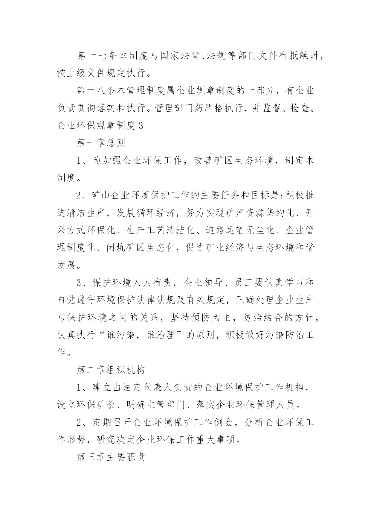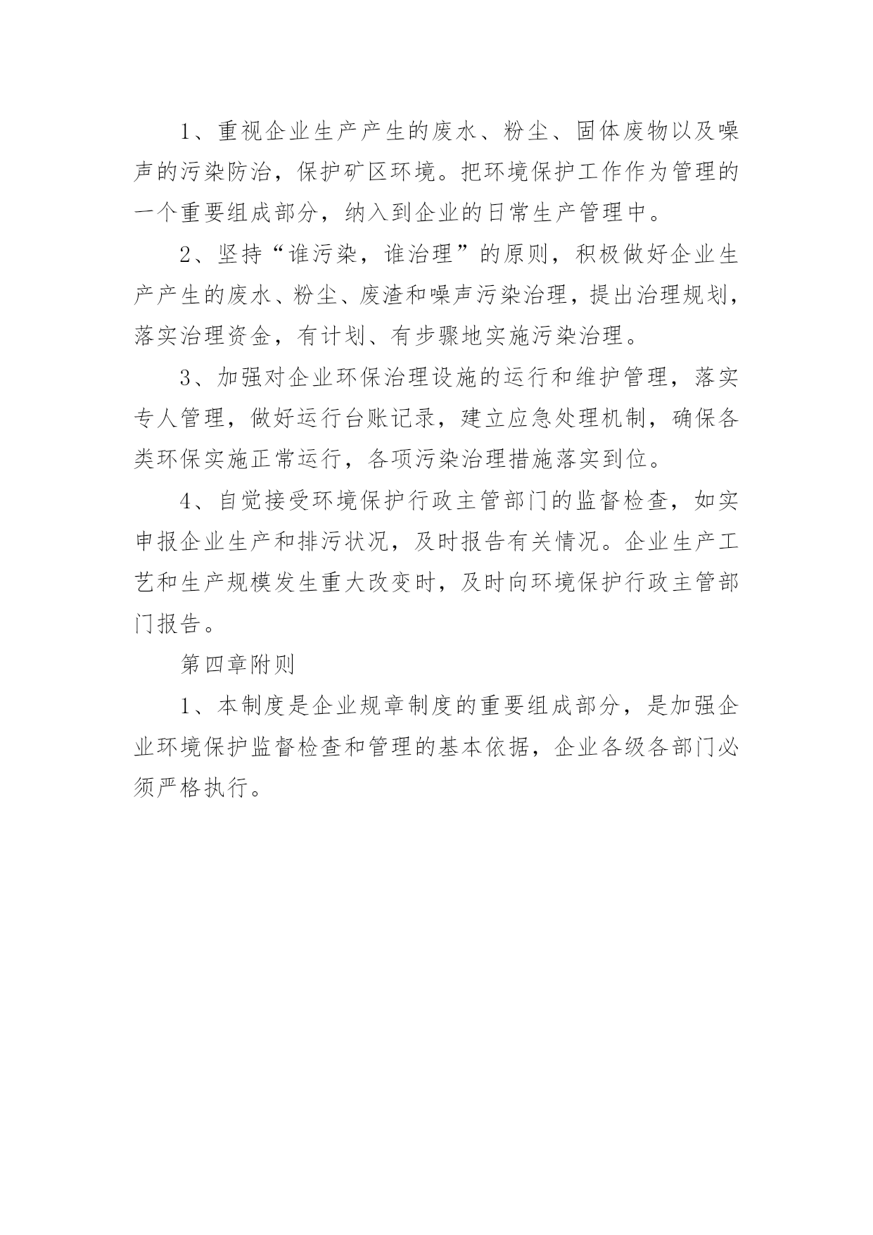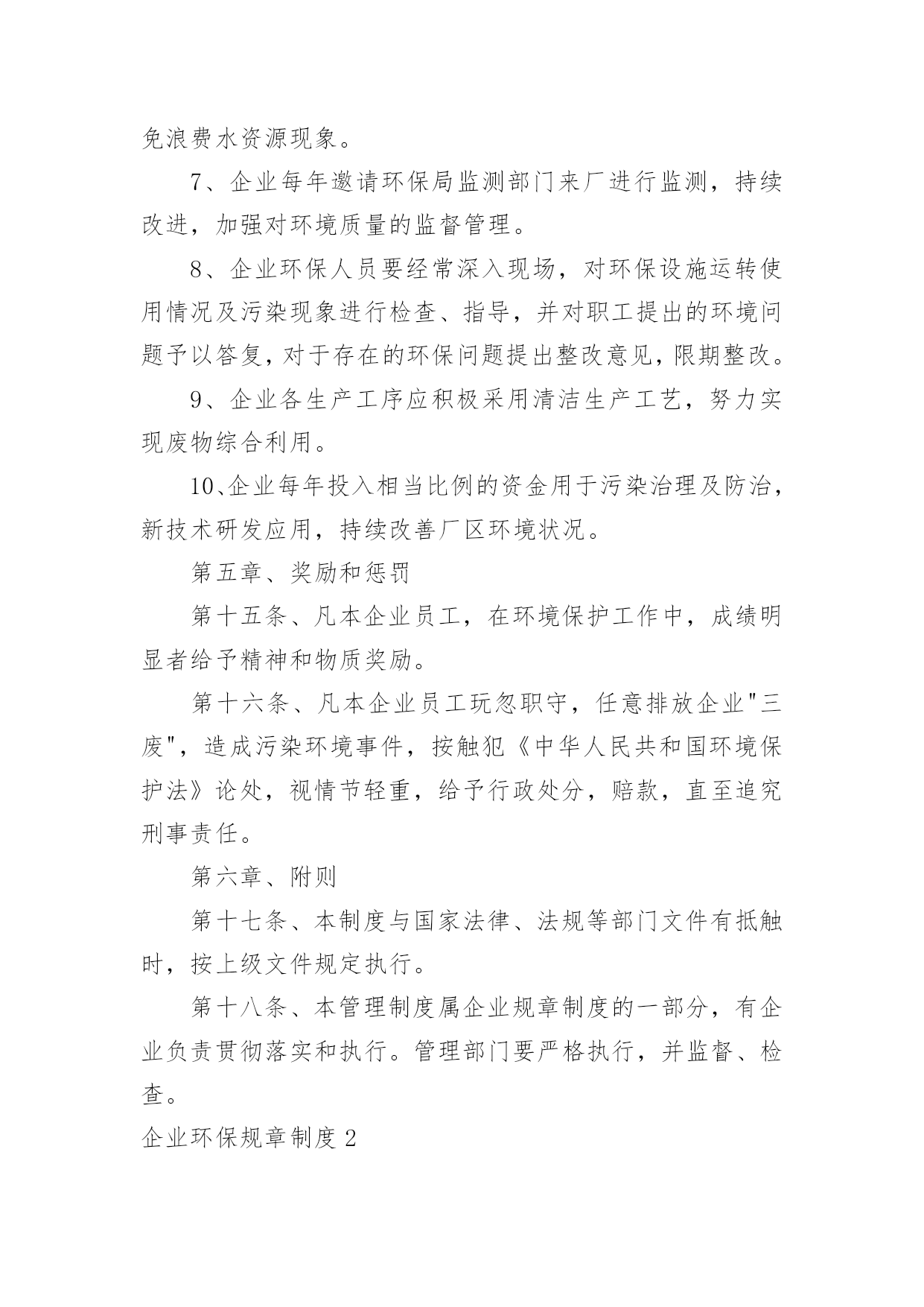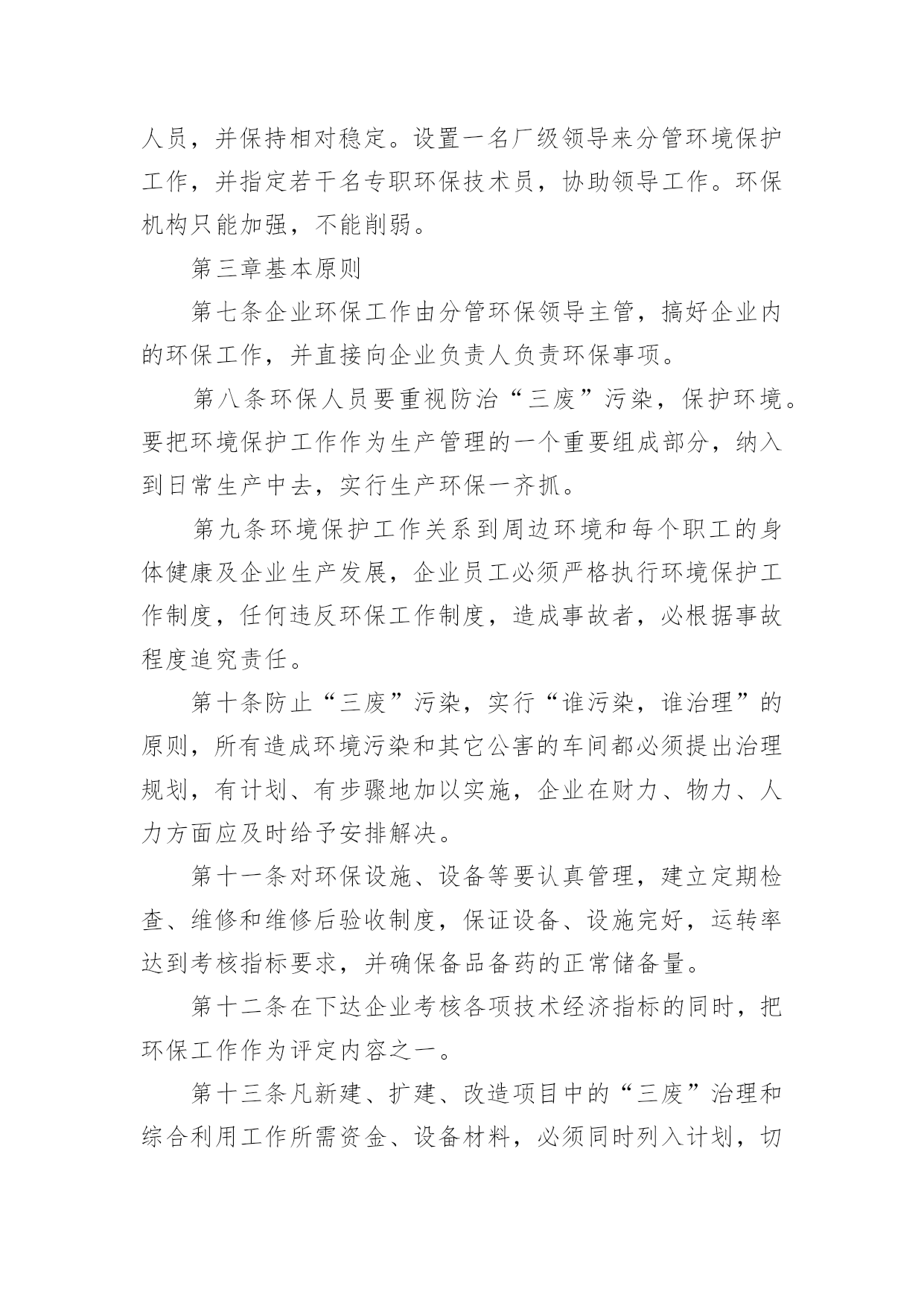企业环保规章制度企业环保规章制度在日新月异的现代社会中,很多情况下我们都会接触到制度,制度就是在人类社会当中人们行为的准则。想学习拟定制度却不知道该请教谁?以下是小编精心整理的企业环保规章制度,欢迎大家借鉴与参考,希望对大家有所帮助。企业环保规章制度1第一章、总则第一条、根据《中华人民共和国环境保护法》"为认真执行全面规划,合理布局,综合利用,化害为利,依靠群众,大家动手,保护环境,造福人民"的环境方针,搞好本企业的环境保护工作,特制定本规章制度。第二条、本企业环境保护主要任务是:宣传和执行环境保护法律法规及有关规定,充分、合理地利用各种资源、能源,控制和消除污染,促进本企业生产发展,创造良好的工作生活环境,使企业的经济活动能尽量减少对周围生态环境的污染。第三条、保护环境人人有责。企业员工、领导都要认真、自觉学习、遵守环境保护法律法规及有关规定,正确看待和处理生产与保护环境之间的关系,坚持预防为主,防治结合的方针,提倡车间清洁生产、循环利用,从源头消灭污染物。第二章、组织结构第四条、根据环境保护法,本企业设置环境保护和环境监测机构,由企业环保技术人员全面负责本企业环境保护工作的管理和监测任务,改善企业环境状况,减少企业对周围环境的污染,并协调企业与政府环保部门的工作。第五条、建立企业环境保护网,由企业领导和企业环保员组成,定期召开企业环保情况报告会和专题会议,负责贯彻会议决定,共同搞好本企业的环境保护工作。第六条、本企业环境保护机构配备必须的环保专业技术人员,并保持相对稳定。设置一名厂级领导来分管环境保护工作,并指定若干名专职环保技术员,协助领导工作。第三章、基本原则第七条、本企业环保工作由分管环保领导主管,搞好企业内的环保工作,并直接向企业负责人负责环保事项。第八条、环保人员要重视防治"三废"污染,保护环境。要把环境保护工作作为生产管理的一个重要组成部分,纳入到日常生产中去,实行生产环保一齐抓。第九条、环境保护工作关系到周边环境和每个职工的身体健康及企业生产发展,企业员工必须严格执行环境保护工作制度,任何违反环保工作制度,造成事故者,必根据事故程度追究责任。第十条、防止"三废"污染,所有造成环境污染和其它公害的车间都必须提出治理规划,有计划、有步骤地加以实施,本企业在财力、物力、人力方面应及时给予安排解决。第十一条、对环保设施、设备等要认真管理,建立定期检查、维修和维修后验收制度,保证设备、设施完好,运转率达到考核指标要求,并确保备品备药的正常储备量。第十二条、在下达企业考核各项指标的同时,把环保工作作为评定内容之一。第十三条、凡新建、扩建、改造项目中的"三废"治理和综合利用工作所需资金、设备材料,必须同时列入计划,切实予以保证,在施工过程中不得以任何理由为借口排挤"三废"治理和综合利用工程的资金、设备、材料和人力等。第四章、环保机构职责第十四条、本企业环保机构职责:1、在企业分管领导负责下,认真贯彻执行国家、上级主管部门的有关环保方针、政策和法规,负责企业本企业环保工作的管理、监察和测试等。2、负责组织制定环保长远规划和年度总结报告。3、监督检查本厂执行"三废"治理情况,参加新建、扩建和改造项目方案的研究和审查工作,并参加验收,提出环保意见和要求。4、组织企业内部环境监测,掌握原始记录,建立环保设施运行台帐,做好环保资料归档和统计工作,按时向上级环保部门报告。5、对员工进行环保法律、法规教育和宣传,提高员工的环保意识,并对环保岗位进行培训考核。6、加强污水处理设施的管理,同时加强节水管理,避免浪费水资源现象。7、企业每年邀请环保局监测部门来厂进行监测,持续改进,加强对环境质量的监督管理。8、企业环保人员要经常深入现场,对环保设施运转使用情况及污染现象进行检查、指导,并对职工提出的环境问题予以答复,对于存在的环保问题提出整改意见,限期整改。9、企业各生产工序应积极采用清洁生产工艺,努力实现废物综合利用。10、企业每年投入相当比例的资金用于污染治理及防治,新技术研发应用,持续改善厂区环境状况。第五章、奖励和惩罚第十五条、凡本企业员工,在环境保护工作中,成绩明显者给予精神和物质奖励。第十六条、凡本企业员工玩忽职守,任意排放企业"三废",造成污染环境事件,按触犯《中华人民共和国环境保护法》论处,视情节轻重,给予行政处分,赔款,直至追究刑事责任。第六章、附则第十七条、本制度与国家法律、法规等部门文件有抵触时,按上级文件规定执行。第十八条、本管理制度属企业规章制度的一部分,有企业负责贯彻落实和执行。管理部门要严格执行,并监督、检查。企业环保规章制度2第一章总则第一条根据《中华人民共和国环境保护法》“为认真执行全面规划,合理布局,综合利用,化害为利,依靠群众,大家动手,保护环境,造福人民”的环境方针,搞好本企业的环境保护工作,特制定