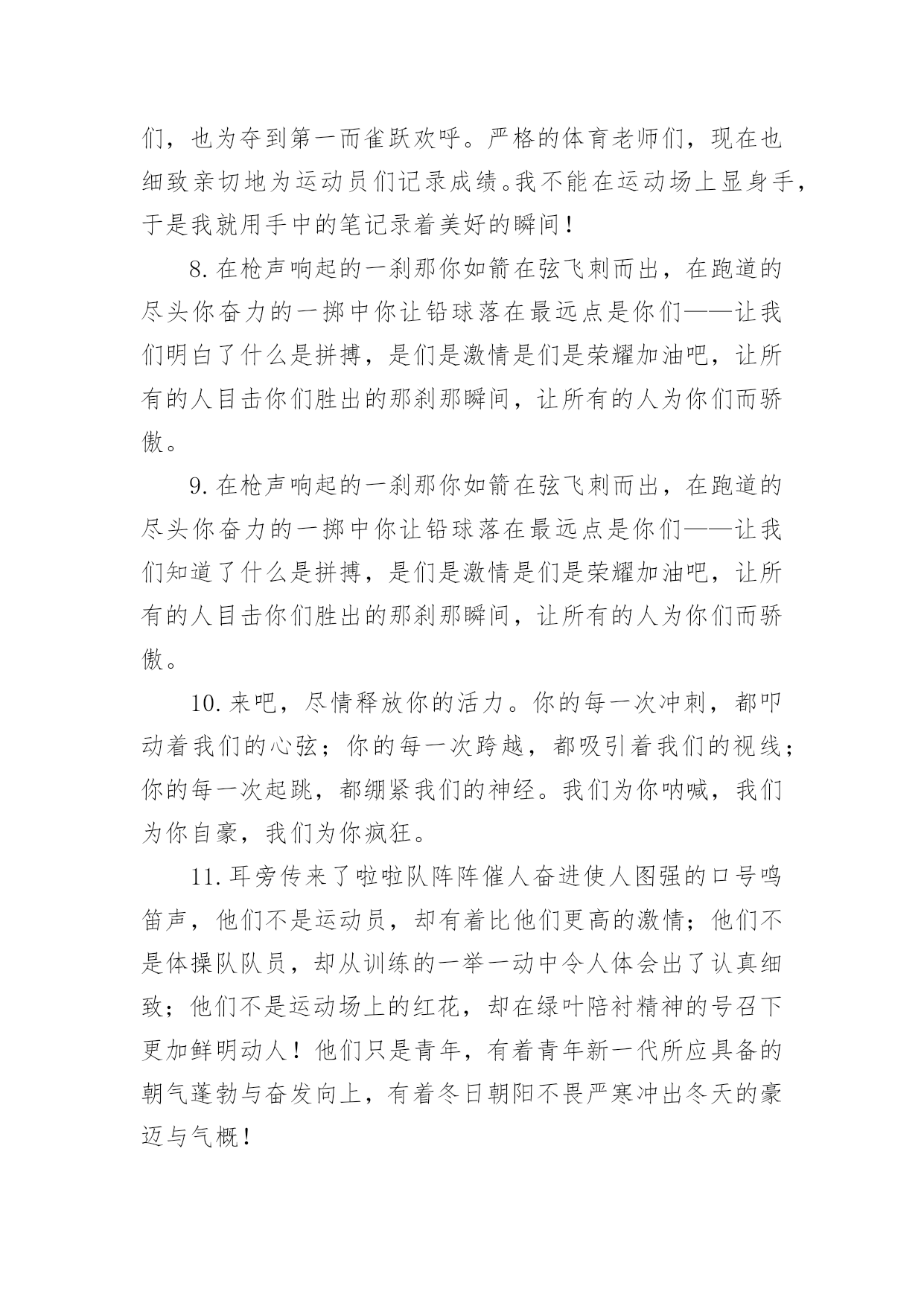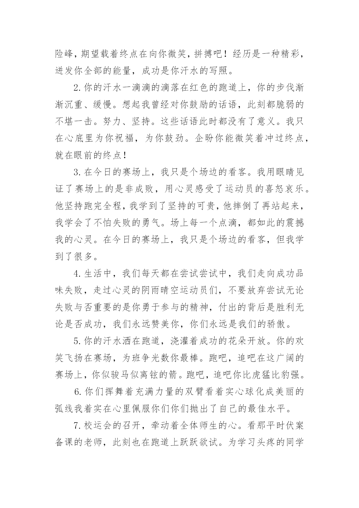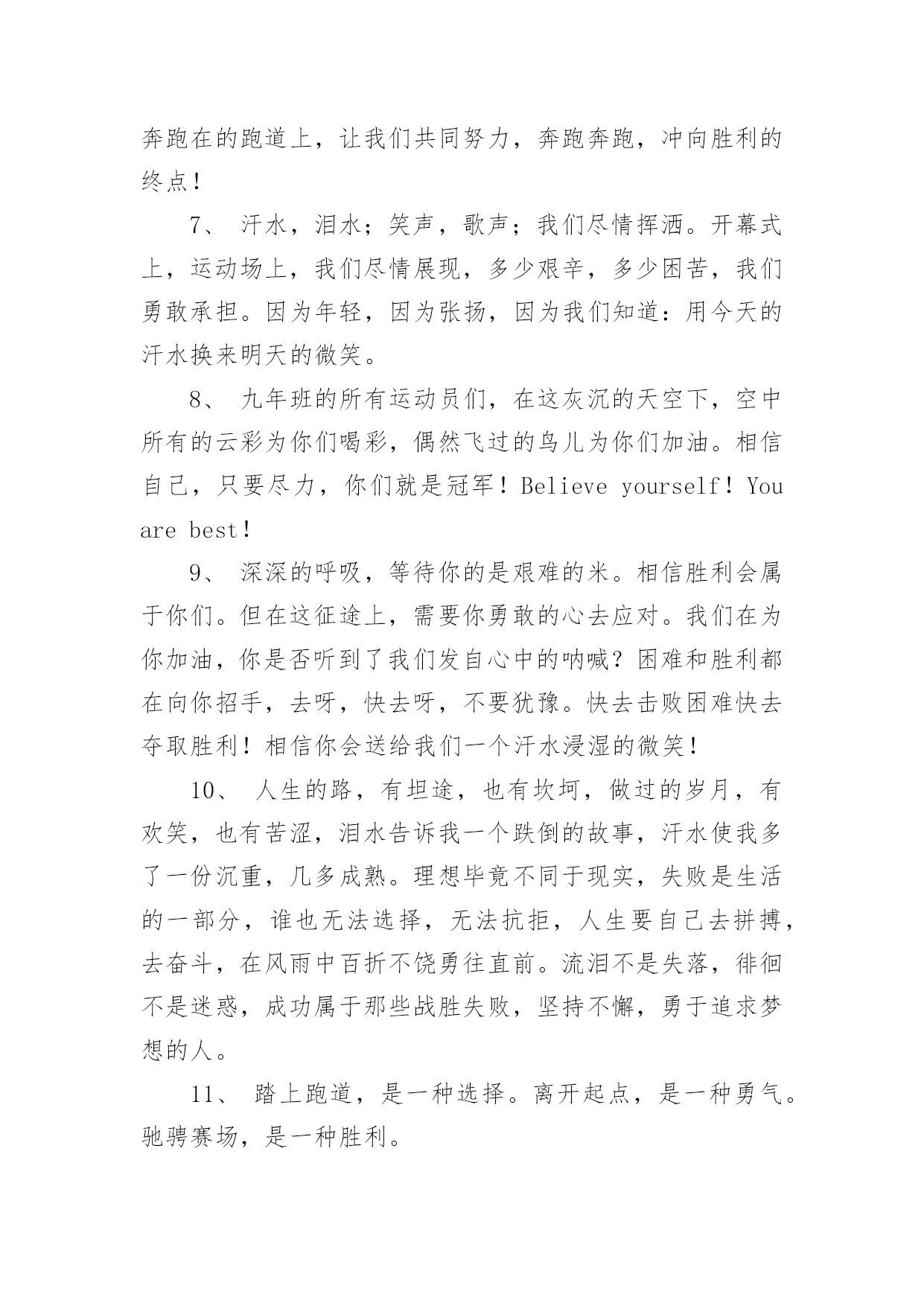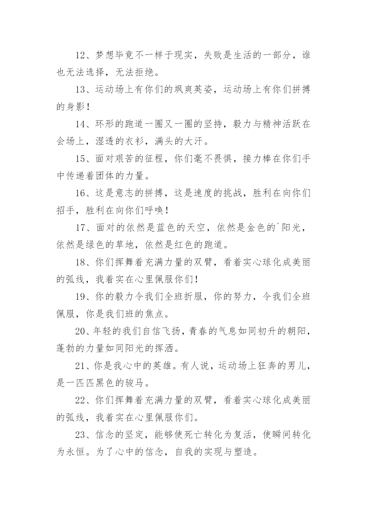 运动会加油稿运动会加油稿在快速变化和不断变革的今天,需要使用加油稿的情境愈发增多,适当使用加油稿可以给对方打气加油。那么加油稿一般是怎么写的呢?以下是小编精心整理的运动会加油稿,仅供参考,大家一起来看看吧。运动会加油稿1今天又是一年一度的运动会,昨天我就像喝了百罐蛮牛一样兴奋。昨晚我猛数羊,数倒数不清,才开始昏昏欲睡。我来到学校猛打哈欠,快到进场的时候我精神马向闪电般冲劲我的头脑瞬间精神百倍。运动会我听来宾致词,终于致词完毕,我已经睡觉了。我最有信心的市个人跑、团体接力。终于轮到我的'个人跑,原本遥遥领先的,结果被象野豹般的吴家贤给追过了。可是我一点也不灰心,因为我还有团体接力团体接力开始,我帮我们般的陈圣泓加油,到我跑的时候,妈妈用狮吼功的功夫来帮我加油。我在运动会背后的意义,就是胜不娇,败不馁。运动会加油稿21.不为鲜花的围绕,不为刹那的荣耀,只有执着的信念,化作不停的奔跑,心中燃烧着梦想,脚下不停的步伐,你用行动述说着过程的重要,没有无尽的终点,没有无法攀登的险峰,期望载着终点在向你微笑,拼搏吧!经历是一种精彩,迸发你全部的能量,成功是你汗水的写照。2.你的汗水一滴滴的滴落在红色的跑道上,你的步伐渐渐沉重、缓慢。想起我曾经对你鼓励的话语,此刻都脆弱的不堪一击。努力、坚持。这些话语此时都没有了意义。我只在心底里为你祝福,为你鼓劲。企盼你能微笑着冲过终点,就在眼前的终点!3.在今日的赛场上,我只是个场边的看客。我用眼睛见证了赛场上的是非成败,用心灵感受了运动员的喜怒哀乐。他坚持跑完全程,我学到了坚持的可贵,他摔倒了再站起来,我学会了不怕失败的勇气。场上每一个点滴,都如此的震撼我的心灵。在今日的赛场上,我只是个场边的看客,但我学到了很多。4.生活中,我们每天都在尝试尝试中,我们走向成功品味失败,走过心灵的阴雨晴空运动员们,不要放弃尝试无论失败与否重要的是你勇于参与的精神,付出的背后是胜利无论是否成功,我们永远赞美你,你们永远是我们的骄傲。5.你的汗水洒在跑道,浇灌着成功的花朵开放。你的欢笑飞扬在赛场,为班争光数你最棒。跑吧,追吧在这广阔的赛场上,你似骏马似离铉的箭。跑吧,追吧你比虎猛比豹强。6.你们挥舞着充满力量的双臂看着实心球化成美丽的弧线我着实在心里佩服你们你们抛出了自己的最佳水平。7.校运会的召开,牵动着全体师生的心。看那平时伏案备课的老师,此刻也在跑道上跃跃欲试。为学习头疼的同学们,也为夺到第一而雀跃欢呼。严格的体育老师们,现在也细致亲切地为运动员们记录成绩。我不能在运动场上显身手,于是我就用手中的笔记录着美好的瞬间!8.在枪声响起的一刹那你如箭在弦飞刺而出,在跑道的尽头你奋力的一掷中你让铅球落在最远点是你们——让我们明白了什么是拼搏,是们是激情是们是荣耀加油吧,让所有的人目击你们胜出的那刹那瞬间,让所有的人为你们而骄傲。9.在枪声响起的一刹那你如箭在弦飞刺而出,在跑道的尽头你奋力的一掷中你让铅球落在最远点是你们——让我们知道了什么是拼搏,是们是激情是们是荣耀加油吧,让所有的人目击你们胜出的那刹那瞬间,让所有的人为你们而骄傲。10.来吧,尽情释放你的活力。你的每一次冲刺,都叩动着我们的心弦;你的每一次跨越,都吸引着我们的视线;你的每一次起跳,都绷紧我们的神经。我们为你呐喊,我们为你自豪,我们为你疯狂。11.耳旁传来了啦啦队阵阵催人奋进使人图强的口号鸣笛声,他们不是运动员,却有着比他们更高的激情;他们不是体操队队员,却从训练的一举一动中令人体会出了认真细致;他们不是运动场上的红花,却在绿叶陪衬精神的号召下更加鲜明动人!他们只是青年,有着青年新一代所应具备的朝气蓬勃与奋发向上,有着冬日朝阳不畏严寒冲出冬天的豪迈与气概!12.泰戈尔在诗中说,天空没有翅膀的影子,但我已飞过;艾青对朋友说,也许有人到达不了彼岸,但我们共同拥有大海。也许你们没有显赫的成绩,但运动场上留下了你们的足迹。也许你们没有奖品,但我们心中留下了你们拼搏的身影。所有的努力都是为了迎接这一刹那,所有的拼搏都是为了这一声令下。13.理想毕竟不同于现实,失败是生活的一部分,谁也无法选择,无法拒绝。人生要自己去拼搏,去奋斗,在风雨中百折不挠勇往前。14.理想毕竟不同于现实,失败是生活的一部分,谁也无法选择,无法拒绝。人生要自己去拼搏,去奋斗,在风雨中百折不挠勇往前进,在集资的每个驿站上都留下一段不悔的回忆。流泪不是失落,徘徊不是迷惑,成功属于那些战胜失败,坚持不懈、勇于追求梦想的'人。加油吧,运动健儿们!15.加油吧,运动健儿们!阵阵有力的步伐,声声有劲的呐喊,运动场上洒下我们青春的点点滴滴。旗摇摇,鼓声声,这里挡不助的是青春活力;枪声响起,”预备起跑”,挡不助的是健儿们如火般的气势。英雄舍我其谁,胜利当仁不让,声声誓言浸透着健儿们的昂扬斗志。朋友们,为运动健儿