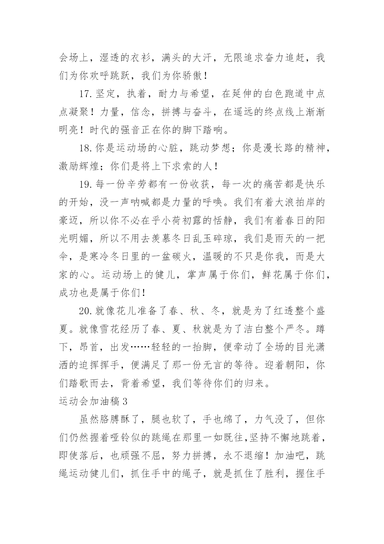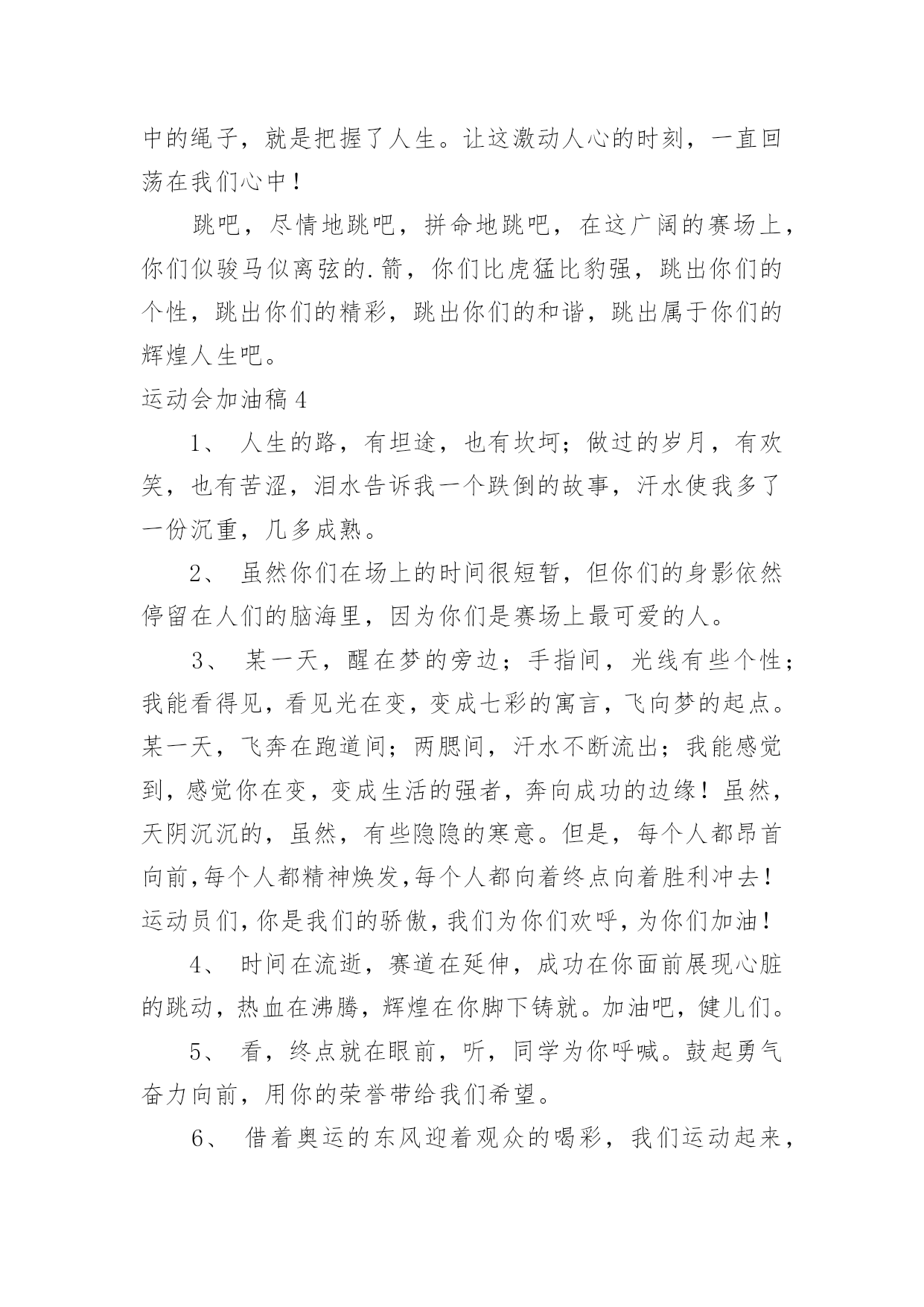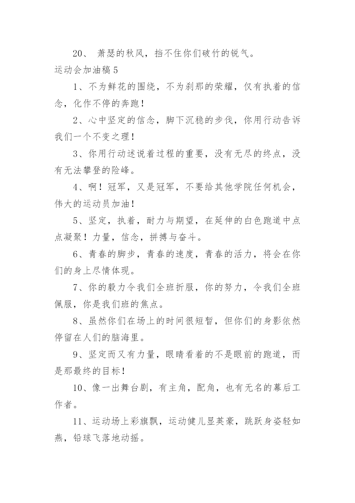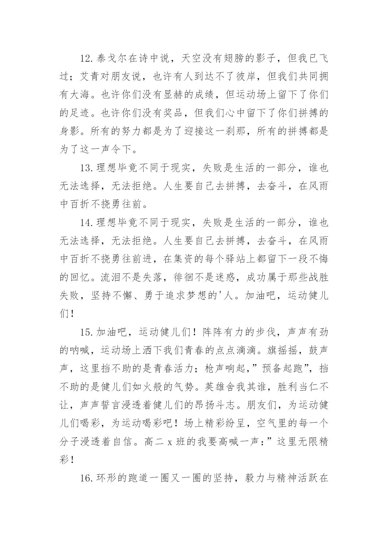 运动会加油稿运动会加油稿在快速变化和不断变革的今天,需要使用加油稿的情境愈发增多,适当使用加油稿可以给对方打气加油。那么加油稿一般是怎么写的呢?以下是小编精心整理的运动会加油稿,仅供参考,大家一起来看看吧。运动会加油稿1今天又是一年一度的运动会,昨天我就像喝了百罐蛮牛一样兴奋。昨晚我猛数羊,数倒数不清,才开始昏昏欲睡。我来到学校猛打哈欠,快到进场的时候我精神马向闪电般冲劲我的头脑瞬间精神百倍。运动会我听来宾致词,终于致词完毕,我已经睡觉了。我最有信心的市个人跑、团体接力。终于轮到我的'个人跑,原本遥遥领先的,结果被象野豹般的吴家贤给追过了。可是我一点也不灰心,因为我还有团体接力团体接力开始,我帮我们般的陈圣泓加油,到我跑的时候,妈妈用狮吼功的功夫来帮我加油。我在运动会背后的意义,就是胜不娇,败不馁。运动会加油稿21.不为鲜花的围绕,不为刹那的荣耀,只有执着的信念,化作不停的奔跑,心中燃烧着梦想,脚下不停的步伐,你用行动述说着过程的重要,没有无尽的终点,没有无法攀登的险峰,期望载着终点在向你微笑,拼搏吧!经历是一种精彩,迸发你全部的能量,成功是你汗水的写照。2.你的汗水一滴滴的滴落在红色的跑道上,你的步伐渐渐沉重、缓慢。想起我曾经对你鼓励的话语,此刻都脆弱的不堪一击。努力、坚持。这些话语此时都没有了意义。我只在心底里为你祝福,为你鼓劲。企盼你能微笑着冲过终点,就在眼前的终点!3.在今日的赛场上,我只是个场边的看客。我用眼睛见证了赛场上的是非成败,用心灵感受了运动员的喜怒哀乐。他坚持跑完全程,我学到了坚持的可贵,他摔倒了再站起来,我学会了不怕失败的勇气。场上每一个点滴,都如此的震撼我的心灵。在今日的赛场上,我只是个场边的看客,但我学到了很多。4.生活中,我们每天都在尝试尝试中,我们走向成功品味失败,走过心灵的阴雨晴空运动员们,不要放弃尝试无论失败与否重要的是你勇于参与的精神,付出的背后是胜利无论是否成功,我们永远赞美你,你们永远是我们的骄傲。5.你的汗水洒在跑道,浇灌着成功的花朵开放。你的欢笑飞扬在赛场,为班争光数你最棒。跑吧,追吧在这广阔的赛场上,你似骏马似离铉的箭。跑吧,追吧你比虎猛比豹强。6.你们挥舞着充满力量的双臂看着实心球化成美丽的弧线我着实在心里佩服你们你们抛出了自己的最佳水平。7.校运会的召开,牵动着全体师生的心。看那平时伏案备课的老师,此刻也在跑道上跃跃欲试。为学习头疼的同学们,也为夺到第一而雀跃欢呼。严格的体育老师们,现在也细致亲切地为运动员们记录成绩。我不能在运动场上显身手,于是我就用手中的笔记录着美好的瞬间!8.在枪声响起的一刹那你如箭在弦飞刺而出,在跑道的尽头你奋力的一掷中你让铅球落在最远点是你们——让我们明白了什么是拼搏,是们是激情是们是荣耀加油吧,让所有的人目击你们胜出的那刹那瞬间,让所有的人为你们而骄傲。9.在枪声响起的一刹那你如箭在弦飞刺而出,在跑道的尽头你奋力的一掷中你让铅球落在最远点是你们——让我们知道了什么是拼搏,是们是激情是们是荣耀加油吧,让所有的人目击你们胜出的那刹那瞬间,让所有的人为你们而骄傲。10.来吧,尽情释放你的活力。你的每一次冲刺,都叩动着我们的心弦;你的每一次跨越,都吸引着我们的视线;你的每一次起跳,都绷紧我们的神经。我们为你呐喊,我们为你自豪,我们为你疯狂。11.耳旁传来了啦啦队阵阵催人奋进使人图强的口号鸣笛声,他们不是运动员,却有着比他们更高的激情;他们不是体操队队员,却从训练的一举一动中令人体会出了认真细致;他们不是运动场上的红花,却在绿叶陪衬精神的号召下更加鲜明动人!他们只是青年,有着青年新一代所应具备的朝气蓬勃与奋发向上,有着冬日朝阳不畏严寒冲出冬天的豪迈与气概!12.泰戈尔在诗中说,天空没有翅膀的影子,但我已飞过;艾青对朋友说,也许有人到达不了彼岸,但我们共同拥有大海。也许你们没有显赫的成绩,但运动场上留下了你们的足迹。也许你们没有奖品,但我们心中留下了你们拼搏的身影。所有的努力都是为了迎接这一刹那,所有的拼搏都是为了这一声令下。13.理想毕竟不同于现实,失败是生活的一部分,谁也无法选择,无法拒绝。人生要自己去拼搏,去奋斗,在风雨中百折不挠勇往前。14.理想毕竟不同于现实,失败是生活的一部分,谁也无法选择,无法拒绝。人生要自己去拼搏,去奋斗,在风雨中百折不挠勇往前进,在集资的每个驿站上都留下一段不悔的回忆。流泪不是失落,徘徊不是迷惑,成功属于那些战胜失败,坚持不懈、勇于追求梦想的'人。加油吧,运动健儿们!15.加油吧,运动健儿们!阵阵有力的步伐,声声有劲的呐喊,运动场上洒下我们青春的点点滴滴。旗摇摇,鼓声声,这里挡不助的是青春活力;枪声响起,”预备起跑”,挡不助的是健儿们如火般的气势。英雄舍我其谁,胜利当仁不让,声声誓言浸透着健儿们的昂扬斗志。朋友们,为运动健儿