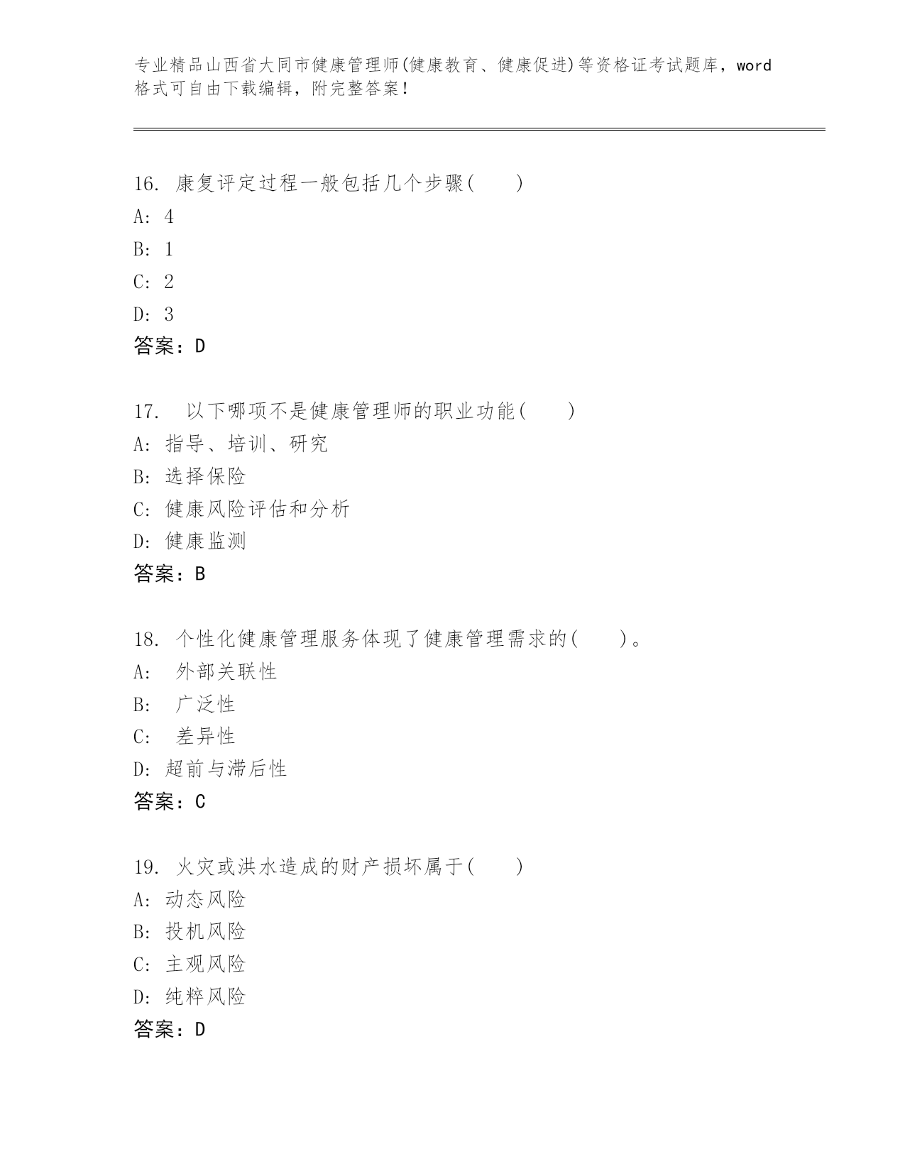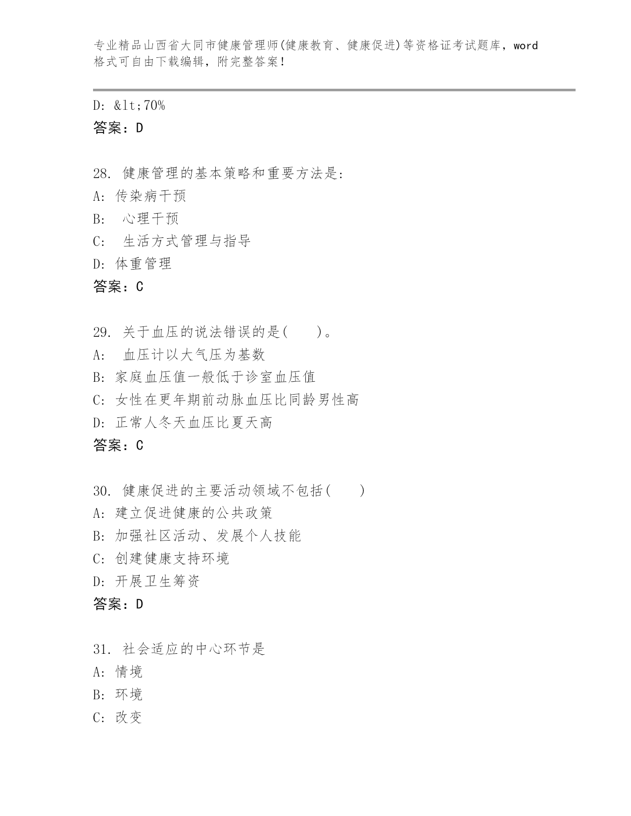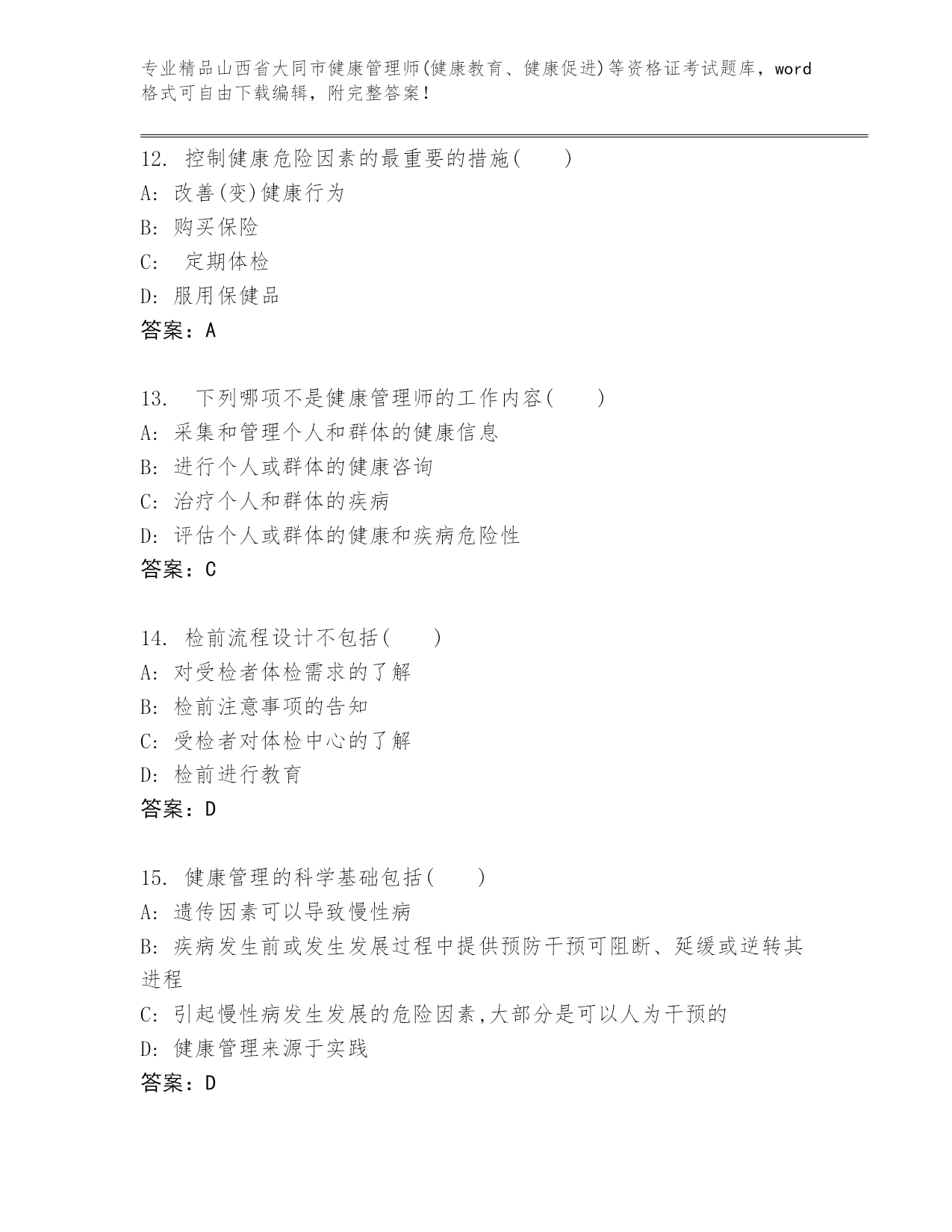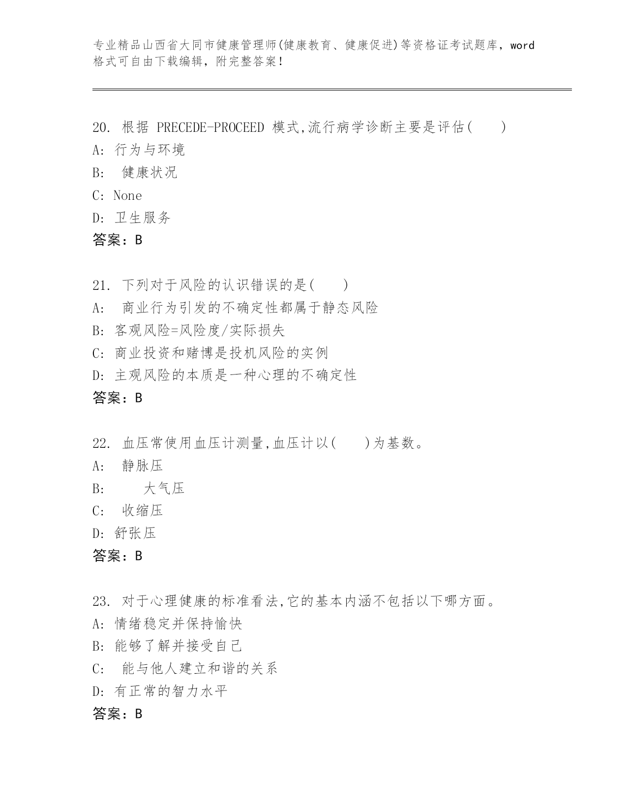 山西省大同市健康管理师(健康教育、健康促进)等资格证考试精品题库各版本.docx