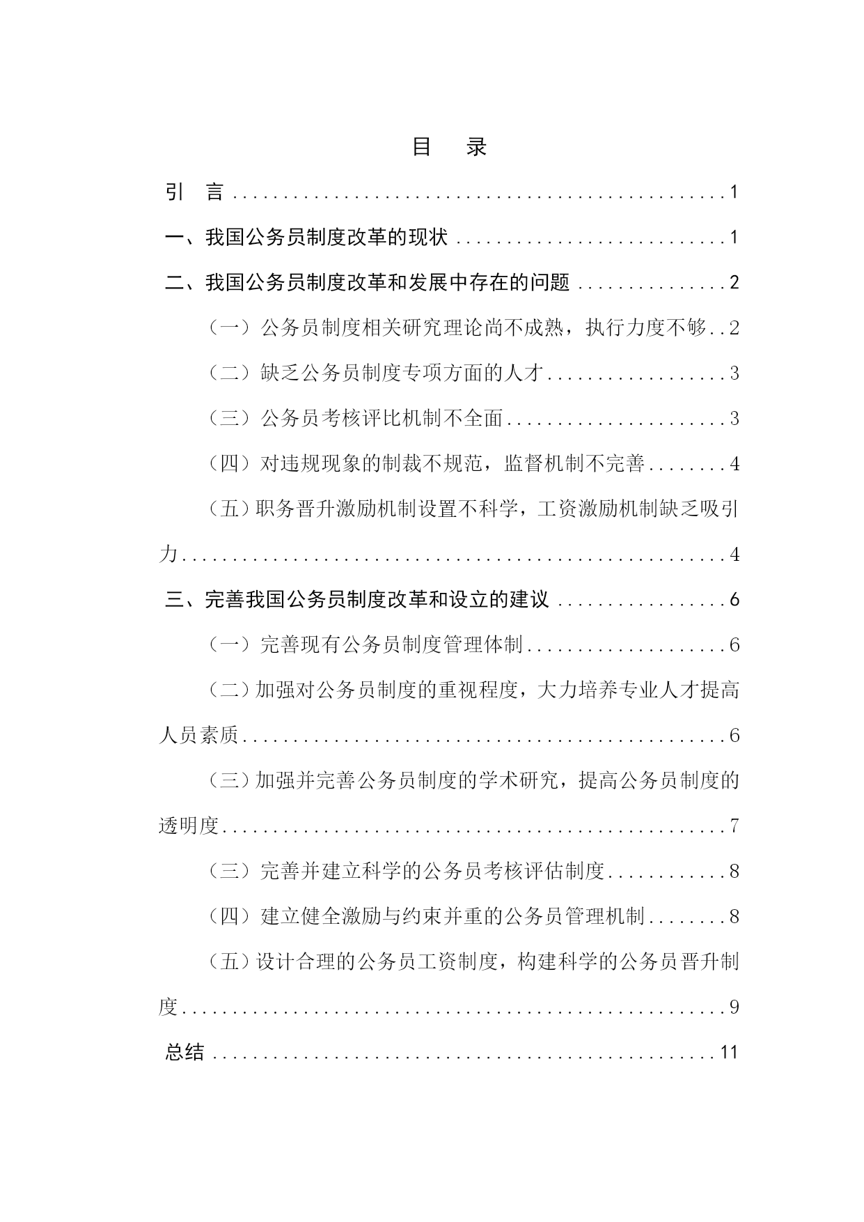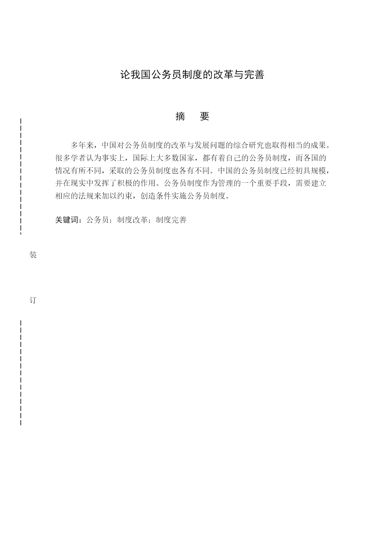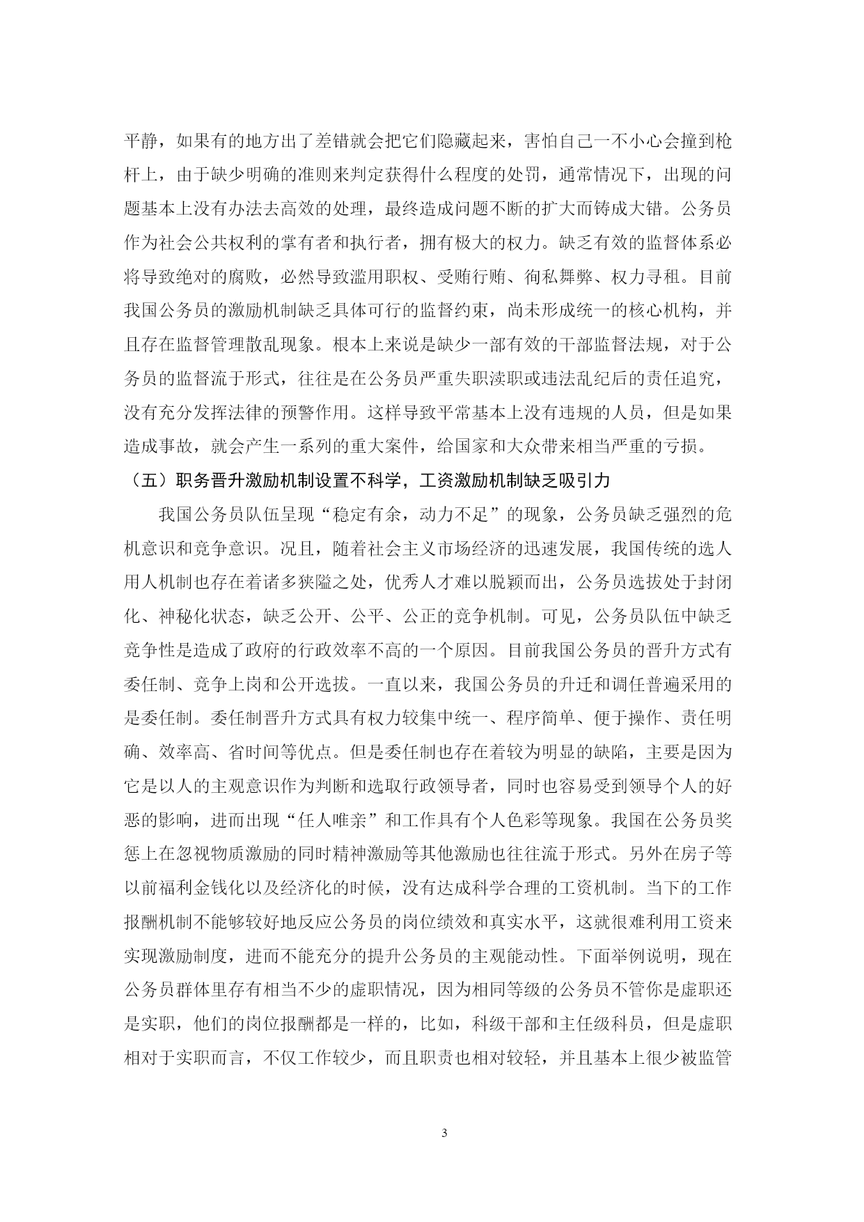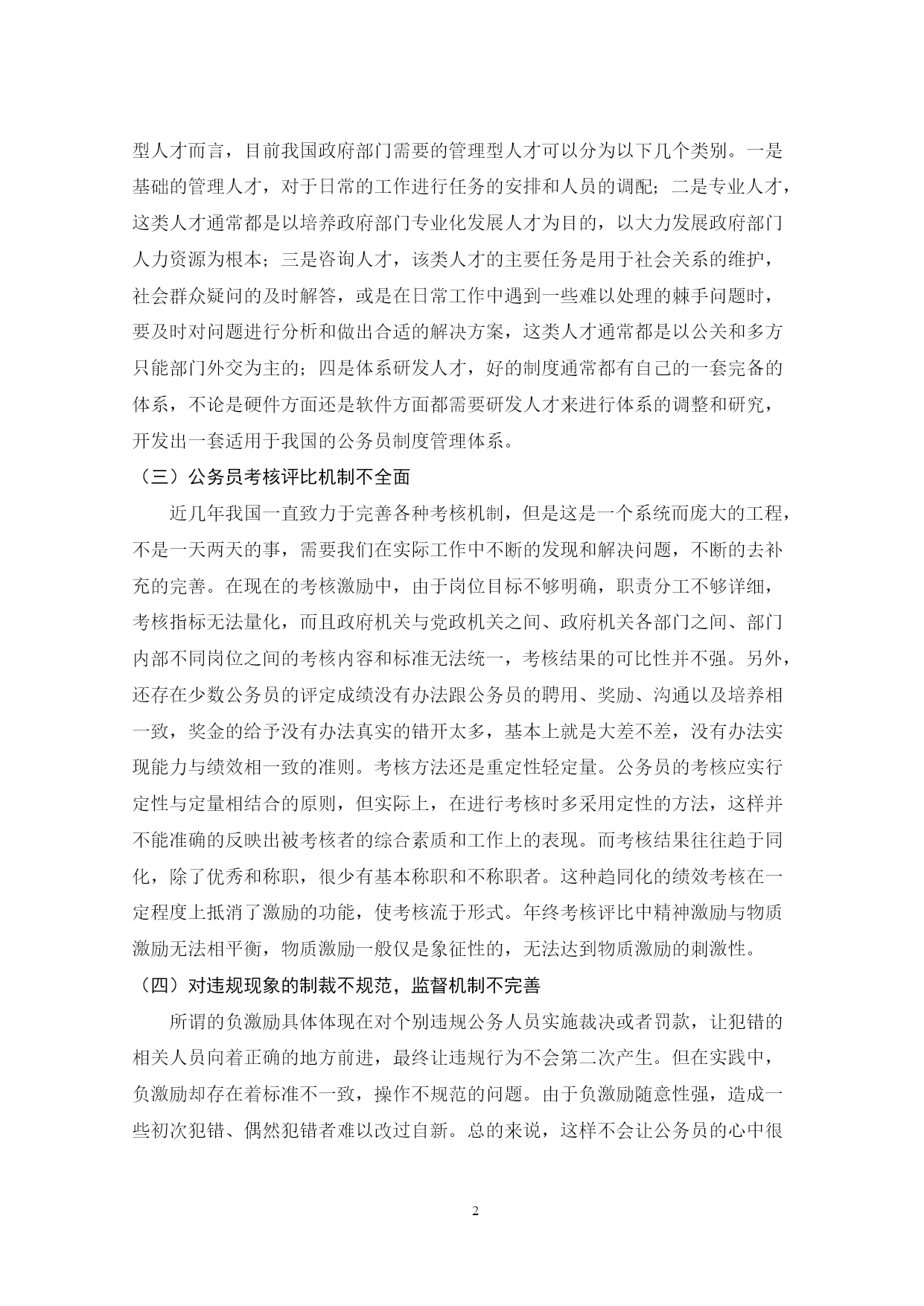 河北省高等教育自学考试毕业论文论我国公务员制度的改革与完善专业:×××(填写自考本科专业名称)作者:×××准考证号:×××指导教师:×××是否拟申请学位:联系电话:完成日期:(定稿完成日期,年月日)论我国公务员制度的改革与完善摘要多年来,中国对公务员制度的改革与发展问题的综合研究也取得相当的成果。很多学者认为事实上,国际上大多数国家,都有着自己的公务员制度,而各国的情况有所不同,采取的公务员制度也各有不同。中国的公务员制度已经初具规模,并在现实中发挥了积极的作用。公务员制度作为管理的一个重要手段,需要建立相应的法规来加以约束,创造条件实施公务员制度。装订线关键词:公务员;制度改革;制度完善目录TOC\*MERGEFORMAT引言PAGEREF_Toc102791一、我国公务员制度改革的现状PAGEREF_Toc310951二、我国公务员制度改革和发展中存在的问题PAGEREF_Toc52272(一)公务员制度相关研究理论尚不成熟,执行力度不够PAGEREF_Toc253052(二)缺乏公务员制度专项方面的人才PAGEREF_Toc301793(三)公务员考核评比机制不全面PAGEREF_Toc279603(四)对违规现象的制裁不规范,监督机制不完善PAGEREF_Toc131994(五)职务晋升激励机制设置不科学,工资激励机制缺乏吸引力PAGEREF_Toc252114三、完善我国公务员制度改革和设立的建议PAGEREF_Toc315066(一)完善现有公务员制度管理体制PAGEREF_Toc326786(二)加强对公务员制度的重视程度,大力培养专业人才提高人员素质PAGEREF_Toc29576(三)加强并完善公务员制度的学术研究,提高公务员制度的透明度PAGEREF_Toc196777(三)完善并建立科学的公务员考核评估制度PAGEREF_Toc10398(四)建立健全激励与约束并重的公务员管理机制PAGEREF_Toc119088(五)设计合理的公务员工资制度,构建科学的公务员晋升制度PAGEREF_Toc150309总结PAGEREF_Toc1648511参考文献PAGEREF_Toc249012PAGE\*MERGEFORMAT11引言我国公务员制度的形成与发展经历了一个曲折变化的过程,政策的制定与执行方式也在时间和宝贵的知识经验下不断的探索积累。从国际经验上来看,已经建立公务员制度管理制度的国家,都是通过立法来明确政府在公务员制度管理中应该承担的责任和义务,并且发挥了应有的作用。在我国,公务员的发展进程同西方发达国家相比,建设路程起步较晚。尽管,在1993年《国家公务员暂行条例》,2006年《中华人民共和国公务员法》的颁发实施及相关的配套法规、政策的出台,使我国的各项改革目前已经取得了很大的成绩,公务员制度也更趋完善,已基本建立有中国特色的国家公务员制度,为社会和谐社会的国家公务员制度建设提供了坚实的基础。但制度变革与社会主义市场经济和发展社会主义民主政治的要求还要一段距离。因而,转变观念、优化体制,完善操作就成为了改善我国公务员制度的现状的当务之急。一、我国公务员制度改革的现状在我国,公务员制度建立的时间还比较短,国内对于公务员管理机制的研究还不是很深入,并且重复现象严重。在国外,公务员管理机制的研究已经取得了显著成就。但我国的公务员管理机制还不完善。如何完善公务员管理机制,提高政府效率,关系到社会经济的发展。同时,随着社会主义市场经济的不断发展,研究符合我国国情的公务员管理机制,提高行政效率,使之更好地为经济的发展服务,关系到国计民生。因此,深入而全面地研究中国公务员管理机制不仅具有理论意义,更具有实际价值。国家行政机关公务员的管理机制一般认为是由激励机制、竞争机制、保障机制、风险机制、更新机制、监控机制一系列相应的机制组合而成,其中激励机制处在非常重要的位置。建立一个科学有效的公务员激励机制具有重要的意义。因为人都是有各种需求的,公务员也不例外。公务员作为“社会人”,也存在各种需求。一个科学有效的公务员激励机制可以使公务员找到适合自己的位置,可以满足其各种需求,为其创造条件,使每个公务员充分实现自身价值,并促进个人的全面发展,推动公务员完善自我,实现其价值目标。科学有效的公务员激励机制能够改变消极思想和行为,充分调动公务员在工作上的主动性和积极性,提高政府公务员管理的有效性。防止公共权利异化、建设廉洁政府的前提,为政府进行公共管理和服务提