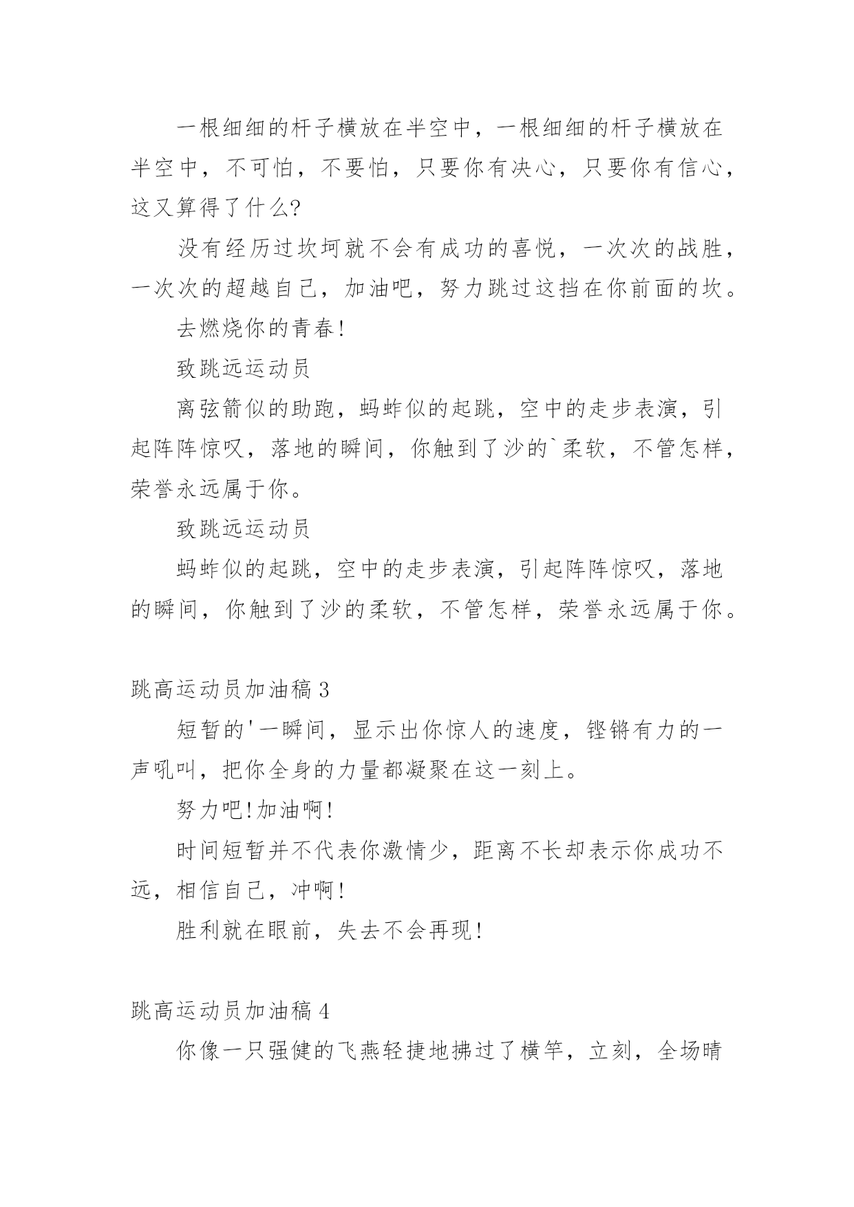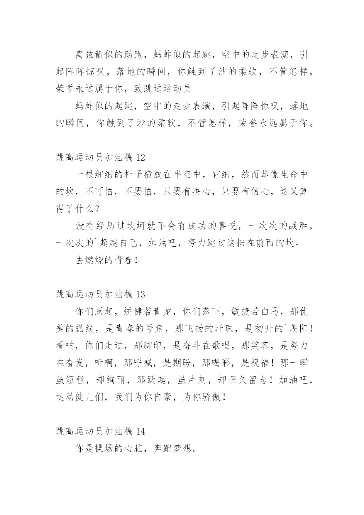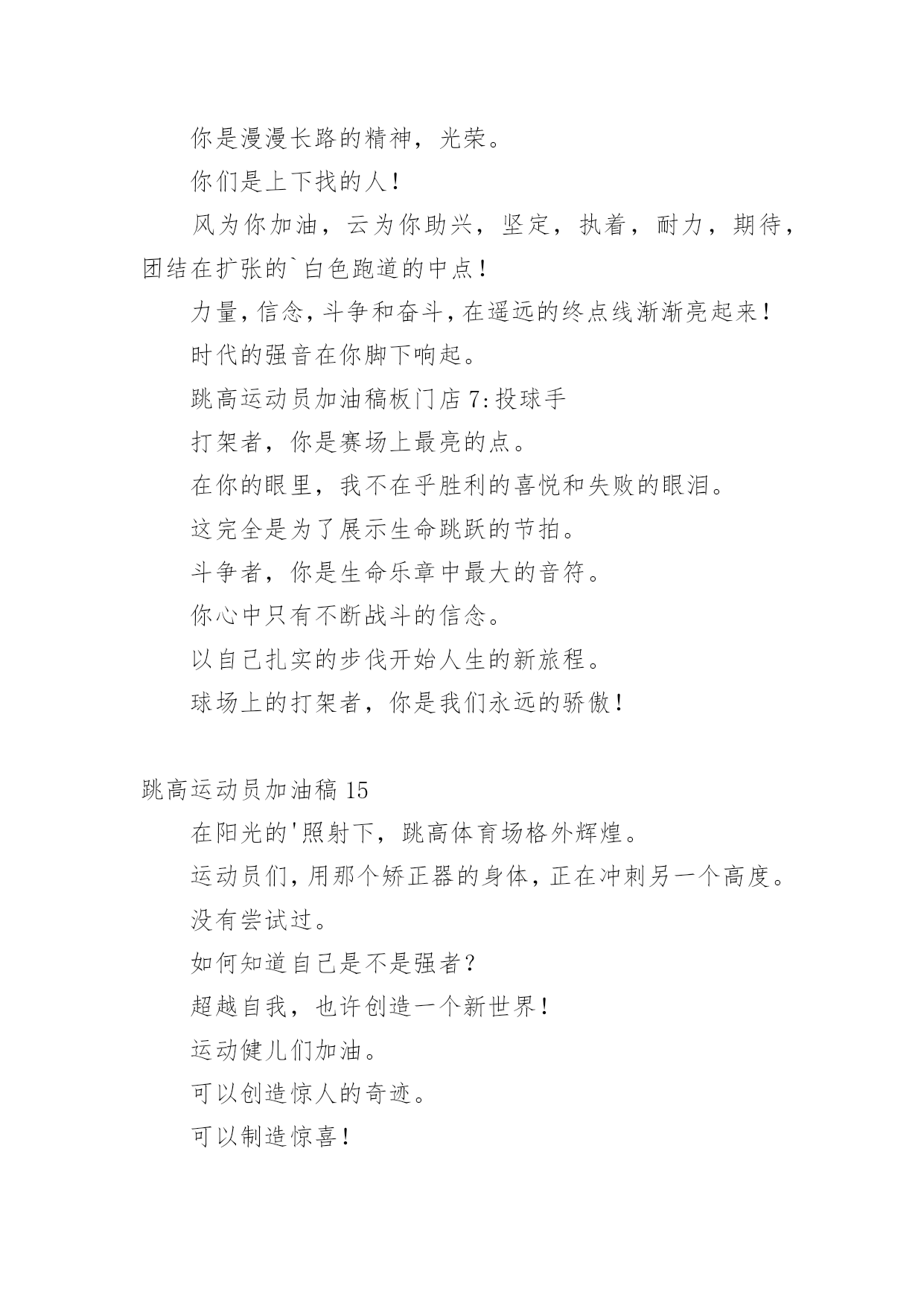 跳高运动员加油稿在现在社会,接触并使用加油稿的人越来越多,借助加油稿可以给对方传达鼓励。为了让您在写加油稿时更加简单方便,下面是小编为大家收集的跳高运动员加油稿,欢迎阅读与收藏。跳高运动员加油稿1高跳投左手遮不住汗水右手遮不住太阳完整的眼睛这是一种吃饱的欲望。飘飘然跳跃的'心在沸腾像燕子一样快激烈的鹰欢乐举起双臂沉浸在反复轮回的场景中汗水滴,眼泪不断涌现在阳光下闪耀。跳高运动员加油稿2跳高运动员一根细细的杆子横放在半空中,一根细细的杆子横放在半空中,不可怕,不要怕,只要你有决心,只要你有信心,这又算得了什么?没有经历过坎坷就不会有成功的喜悦,一次次的战胜,一次次的超越自己,加油吧,努力跳过这挡在你前面的坎。去燃烧你的青春!致跳远运动员离弦箭似的助跑,蚂蚱似的起跳,空中的走步表演,引起阵阵惊叹,落地的瞬间,你触到了沙的`柔软,不管怎样,荣誉永远属于你。致跳远运动员蚂蚱似的起跳,空中的走步表演,引起阵阵惊叹,落地的瞬间,你触到了沙的柔软,不管怎样,荣誉永远属于你。跳高运动员加油稿3短暂的'一瞬间,显示出你惊人的速度,铿锵有力的一声吼叫,把你全身的力量都凝聚在这一刻上。努力吧!加油啊!时间短暂并不代表你激情少,距离不长却表示你成功不远,相信自己,冲啊!胜利就在眼前,失去不会再现!跳高运动员加油稿4你像一只强健的飞燕轻捷地拂过了横竿,立刻,全场晴天霹雳般哄起一片欢呼声。在喝彩声中横竿升上了新的高度伴随着这喝彩声你又开头向新的、更高的目标攀登你像一只轻快的.小鹿,奔跃在那指向成功的横杆间。一次,两次,不灭的是你那必胜的信念。最终,在那感动人心的瞬间一跃后,你露出了成功的微笑。跳高运动员加油稿5那里需要活力那里要哭需要掌声。起飞的.时候,我们为你鼓掌祝贺。当你失败的时候,我们也为你鼓掌,为你骄傲。当我再次想起掌声的时候,你们已经站在起跑线上了。朋友,往前冲!我们在为你鼓掌。跳高运动员加油稿6《拼!拼!拼!》生命需要运动,世界需要自动。*的运动员们,大家是雄心勃勃的'一代大家是勇争第一的一代。一生能有几回搏,此时不搏待何时。拼!拼!拼!拼出大家的豪情,也拼出大家斗志昂扬的气概。在赛场上,大家英姿飒爽!*加油!*必胜!跳高运动员加油稿7你是操场的心脏,奔跑梦想。你是漫漫长路的精神,荣耀。你们是上下找的人!风为你加油,云为你助兴,坚决,执着,耐力,期待,团结在扩张的白色跑道的中点!力量,信念,斗争和奋斗,在遥远的`终点线渐渐亮起来!时代的强音在你脚下响起。跳高运动员加油稿8左手遮不住汗水右手遮不住太阳满场的'眼睛是满场的渴望。跨出的脚踩在云层飞跃的心儿在沸腾致跳高运动员加油稿致跳高运动员加油稿轻捷如燕威猛如鹰欢乐扬起了臂膀沉浸在反复轮回的场面中汗水淌过,泪水泡过在太阳下发出光芒。跳高运动员加油稿9你是操场的心脏,是奔跑的梦想。你是漫长道路的精神。我很荣幸。你们是上下找的人!风为你加油,云为你助兴,坚定,执着,耐力,期待,团结在扩张的白色跑道的中点!力量,信念,斗争,斗争,在遥远的终点线渐渐亮起来!时代的`强音在你脚下响起。跳高运动员加油原告板门店7:投手打架者,你是赛场上最亮的点。在你的眼里,我不在乎胜利的喜悦和失败的眼泪。这完全是为了展示生命跳跃的节拍。斗争者,你是生命乐章中最大的音符。你心中只有不断战斗的信念。以自己扎实的步伐开始人生的新旅程。球场上的打架者,你是我们永远的骄傲!跳高运动员加油稿10这里需要激情,这里需要呐喊,这里同样需要掌声。当你乘胜而归,我们为你鼓掌,为你祝贺,当你失败而来,我们同样为你鼓掌,为你骄傲。当掌声再一次想起的时候,你已经站在了起跑线上,朋友,向前冲!我们在为你鼓掌。跳高运动员加油稿11一、在阳光的照耀下,跳高的比赛场地格外辉煌,运动健儿们,用那矫键的身躯,冲刺着一个又一个的高度,致跳高运动员运动会。没有尝试,怎会知道自己是否为强者,超越自己,也许会创造一番新天地!运动健儿们加油吧,去创造一份份奇奇迹,去创造一份份惊喜!二、一根细细的杆子横放在半空中,它细,然而却像你生命中的坎,不可怕,不要怕,只要你有决心,只要你有信心,这又算得了什么?没有经历过坎坷就不会有成功的'喜悦,一次次的战胜,一次次的超越自己,加油吧,努力跳过这挡在你前面的坎。去燃烧你的青春!致跳远运动员离弦箭似的助跑,蚂蚱似的起跳,空中的走步表演,引起阵阵惊叹,落地的瞬间,你触到了沙的柔软,不管怎样,荣誉永远属于你,致跳远运动员蚂蚱似的起跳,空中的走步表演,引起阵阵惊叹,落地的瞬间,你触到了沙的柔软,不管怎样,荣誉永远属于你。跳高运动员加油稿12一根细细的杆子横放在半空中,它细,然而却像生命中的坎,不可怕,不要怕,只要有决心,只要有信心,这又算得了什么?没有经历过坎坷就不会有成功的喜悦,一次次的战胜,一次次的`超越自己,加油吧,努力跳过这挡在前