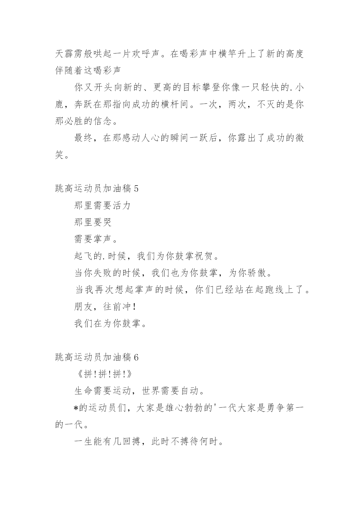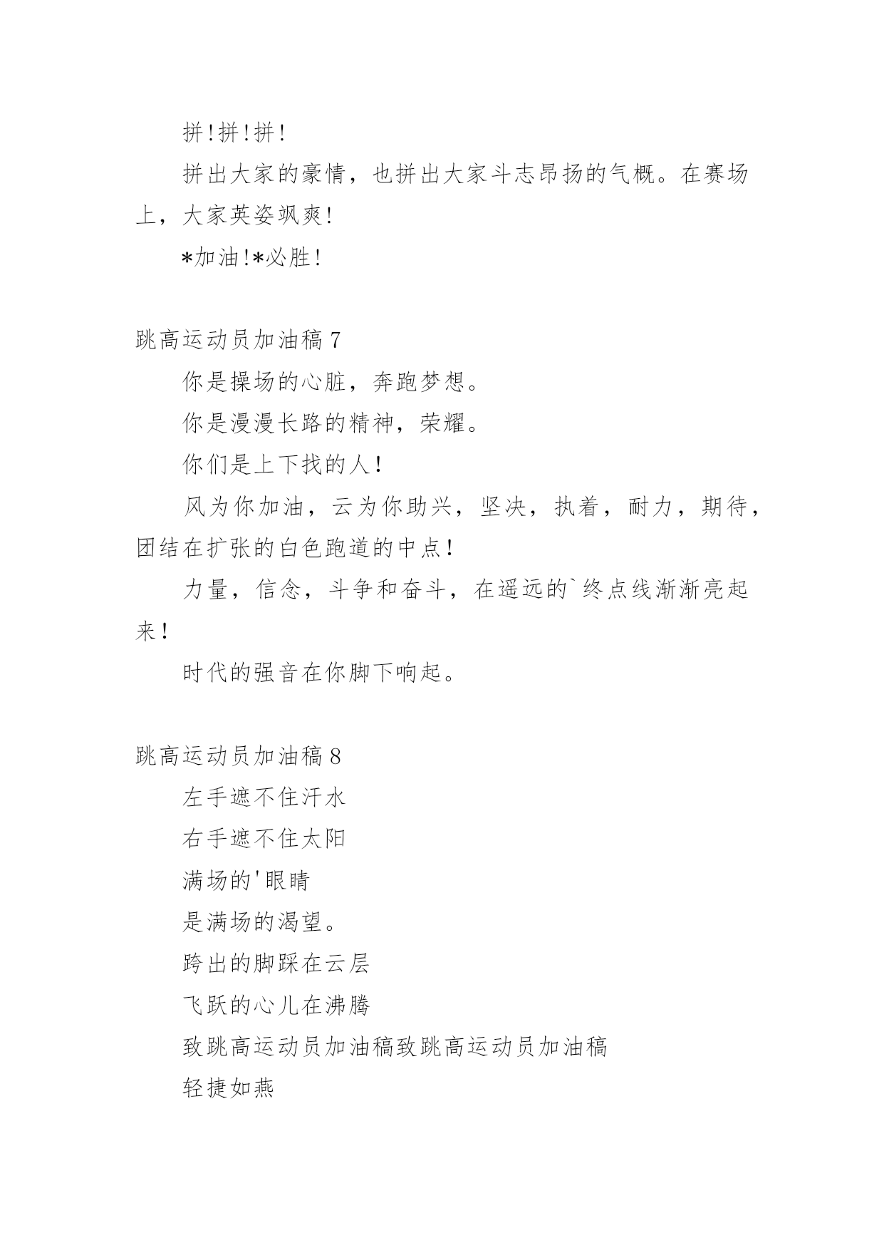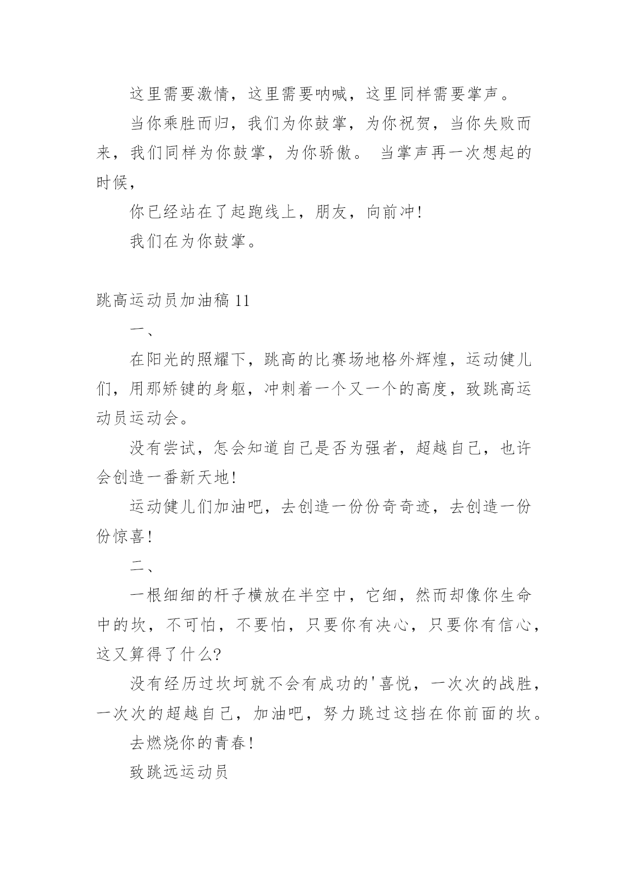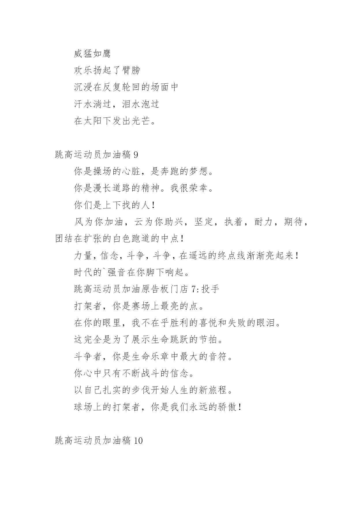 跳高运动员加油稿在现在社会,接触并使用加油稿的人越来越多,借助加油稿可以给对方传达鼓励。为了让您在写加油稿时更加简单方便,下面是小编为大家收集的跳高运动员加油稿,欢迎阅读与收藏。跳高运动员加油稿1高跳投左手遮不住汗水右手遮不住太阳完整的眼睛这是一种吃饱的欲望。飘飘然跳跃的'心在沸腾像燕子一样快激烈的鹰欢乐举起双臂沉浸在反复轮回的场景中汗水滴,眼泪不断涌现在阳光下闪耀。跳高运动员加油稿2跳高运动员一根细细的杆子横放在半空中,一根细细的杆子横放在半空中,不可怕,不要怕,只要你有决心,只要你有信心,这又算得了什么?没有经历过坎坷就不会有成功的喜悦,一次次的战胜,一次次的超越自己,加油吧,努力跳过这挡在你前面的坎。去燃烧你的青春!致跳远运动员离弦箭似的助跑,蚂蚱似的起跳,空中的走步表演,引起阵阵惊叹,落地的瞬间,你触到了沙的`柔软,不管怎样,荣誉永远属于你。致跳远运动员蚂蚱似的起跳,空中的走步表演,引起阵阵惊叹,落地的瞬间,你触到了沙的柔软,不管怎样,荣誉永远属于你。跳高运动员加油稿3短暂的'一瞬间,显示出你惊人的速度,铿锵有力的一声吼叫,把你全身的力量都凝聚在这一刻上。努力吧!加油啊!时间短暂并不代表你激情少,距离不长却表示你成功不远,相信自己,冲啊!胜利就在眼前,失去不会再现!跳高运动员加油稿4你像一只强健的飞燕轻捷地拂过了横竿,立刻,全场晴天霹雳般哄起一片欢呼声。在喝彩声中横竿升上了新的高度伴随着这喝彩声你又开头向新的、更高的目标攀登你像一只轻快的.小鹿,奔跃在那指向成功的横杆间。一次,两次,不灭的是你那必胜的信念。最终,在那感动人心的瞬间一跃后,你露出了成功的微笑。跳高运动员加油稿5那里需要活力那里要哭需要掌声。起飞的.时候,我们为你鼓掌祝贺。当你失败的时候,我们也为你鼓掌,为你骄傲。当我再次想起掌声的时候,你们已经站在起跑线上了。朋友,往前冲!我们在为你鼓掌。跳高运动员加油稿6《拼!拼!拼!》生命需要运动,世界需要自动。*的运动员们,大家是雄心勃勃的'一代大家是勇争第一的一代。一生能有几回搏,此时不搏待何时。拼!拼!拼!拼出大家的豪情,也拼出大家斗志昂扬的气概。在赛场上,大家英姿飒爽!*加油!*必胜!跳高运动员加油稿7你是操场的心脏,奔跑梦想。你是漫漫长路的精神,荣耀。你们是上下找的人!风为你加油,云为你助兴,坚决,执着,耐力,期待,团结在扩张的白色跑道的中点!力量,信念,斗争和奋斗,在遥远的`终点线渐渐亮起来!时代的强音在你脚下响起。跳高运动员加油稿8左手遮不住汗水右手遮不住太阳满场的'眼睛是满场的渴望。跨出的脚踩在云层飞跃的心儿在沸腾致跳高运动员加油稿致跳高运动员加油稿轻捷如燕威猛如鹰欢乐扬起了臂膀沉浸在反复轮回的场面中汗水淌过,泪水泡过在太阳下发出光芒。跳高运动员加油稿9你是操场的心脏,是奔跑的梦想。你是漫长道路的精神。我很荣幸。你们是上下找的人!风为你加油,云为你助兴,坚定,执着,耐力,期待,团结在扩张的白色跑道的中点!力量,信念,斗争,斗争,在遥远的终点线渐渐亮起来!时代的`强音在你脚下响起。跳高运动员加油原告板门店7:投手打架者,你是赛场上最亮的点。在你的眼里,我不在乎胜利的喜悦和失败的眼泪。这完全是为了展示生命跳跃的节拍。斗争者,你是生命乐章中最大的音符。你心中只有不断战斗的信念。以自己扎实的步伐开始人生的新旅程。球场上的打架者,你是我们永远的骄傲!跳高运动员加油稿10这里需要激情,这里需要呐喊,这里同样需要掌声。当你乘胜而归,我们为你鼓掌,为你祝贺,当你失败而来,我们同样为你鼓掌,为你骄傲。当掌声再一次想起的时候,你已经站在了起跑线上,朋友,向前冲!我们在为你鼓掌。跳高运动员加油稿11一、在阳光的照耀下,跳高的比赛场地格外辉煌,运动健儿们,用那矫键的身躯,冲刺着一个又一个的高度,致跳高运动员运动会。没有尝试,怎会知道自己是否为强者,超越自己,也许会创造一番新天地!运动健儿们加油吧,去创造一份份奇奇迹,去创造一份份惊喜!二、一根细细的杆子横放在半空中,它细,然而却像你生命中的坎,不可怕,不要怕,只要你有决心,只要你有信心,这又算得了什么?没有经历过坎坷就不会有成功的'喜悦,一次次的战胜,一次次的超越自己,加油吧,努力跳过这挡在你前面的坎。去燃烧你的青春!致跳远运动员离弦箭似的助跑,蚂蚱似的起跳,空中的走步表演,引起阵阵惊叹,落地的瞬间,你触到了沙的柔软,不管怎样,荣誉永远属于你,致跳远运动员蚂蚱似的起跳,空中的走步表演,引起阵阵惊叹,落地的瞬间,你触到了沙的柔软,不管怎样,荣誉永远属于你。跳高运动员加油稿12一根细细的杆子横放在半空中,它细,然而却像生命中的坎,不可怕,不要怕,只要有决心,只要有信心,这又算得了什么?没有经历过坎坷就不会有成功的喜悦,一次次的战胜,一次次的`超越自己,加油吧,努力跳过这挡在前