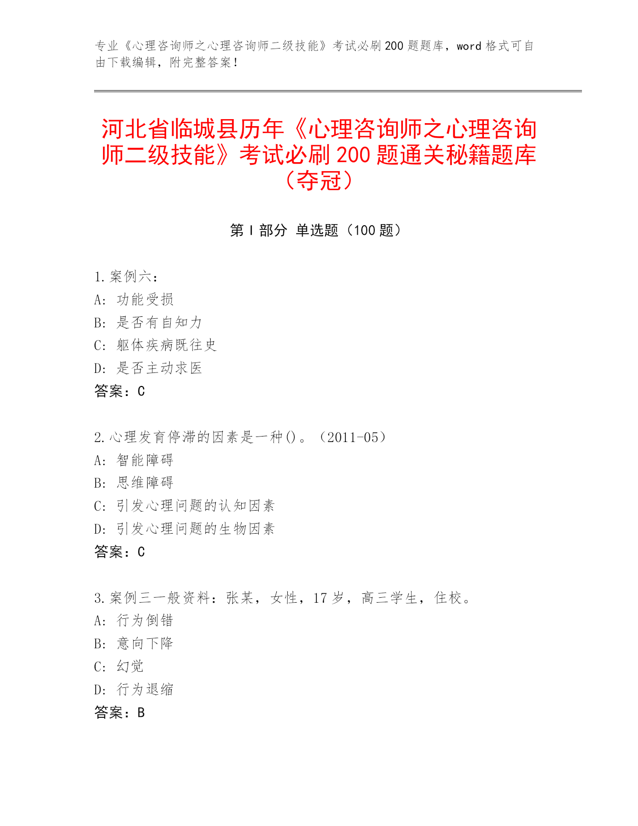 河北省临城县历年《心理咨询师之心理咨询师二级技能》考试必刷200题通关秘籍题库(夺冠)