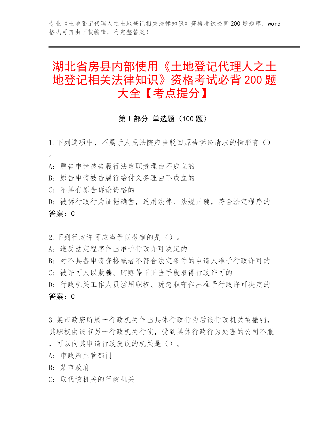 湖北省房县内部使用《土地登记代理人之土地登记相关法律知识》资格考试必背200题大全【考点提分】.docx