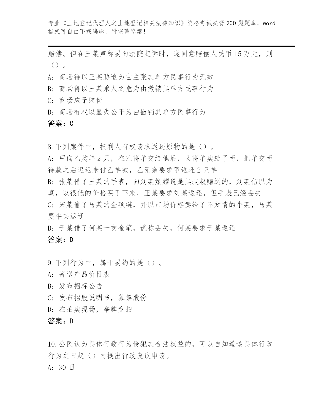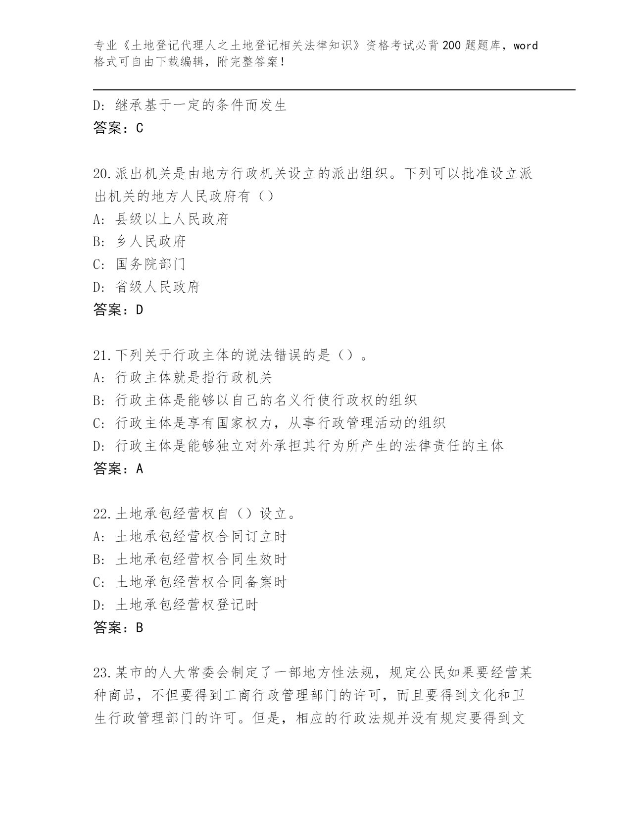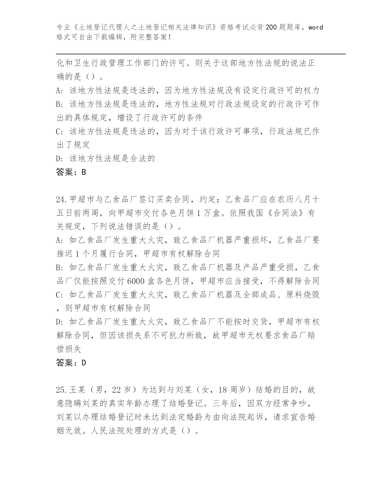 2024黑龙江省泰来县《土地登记代理人之土地登记相关法律知识》资格考试必刷200题真题(网校专用)