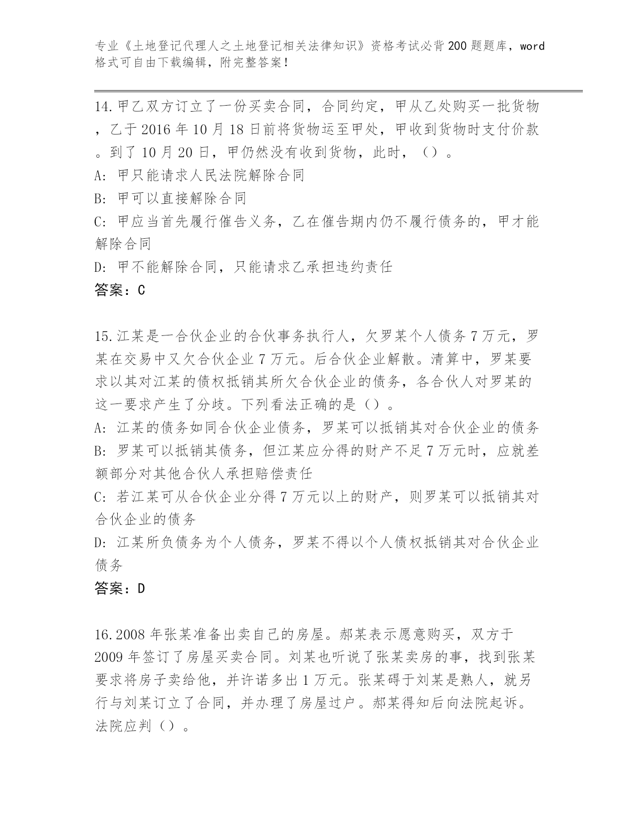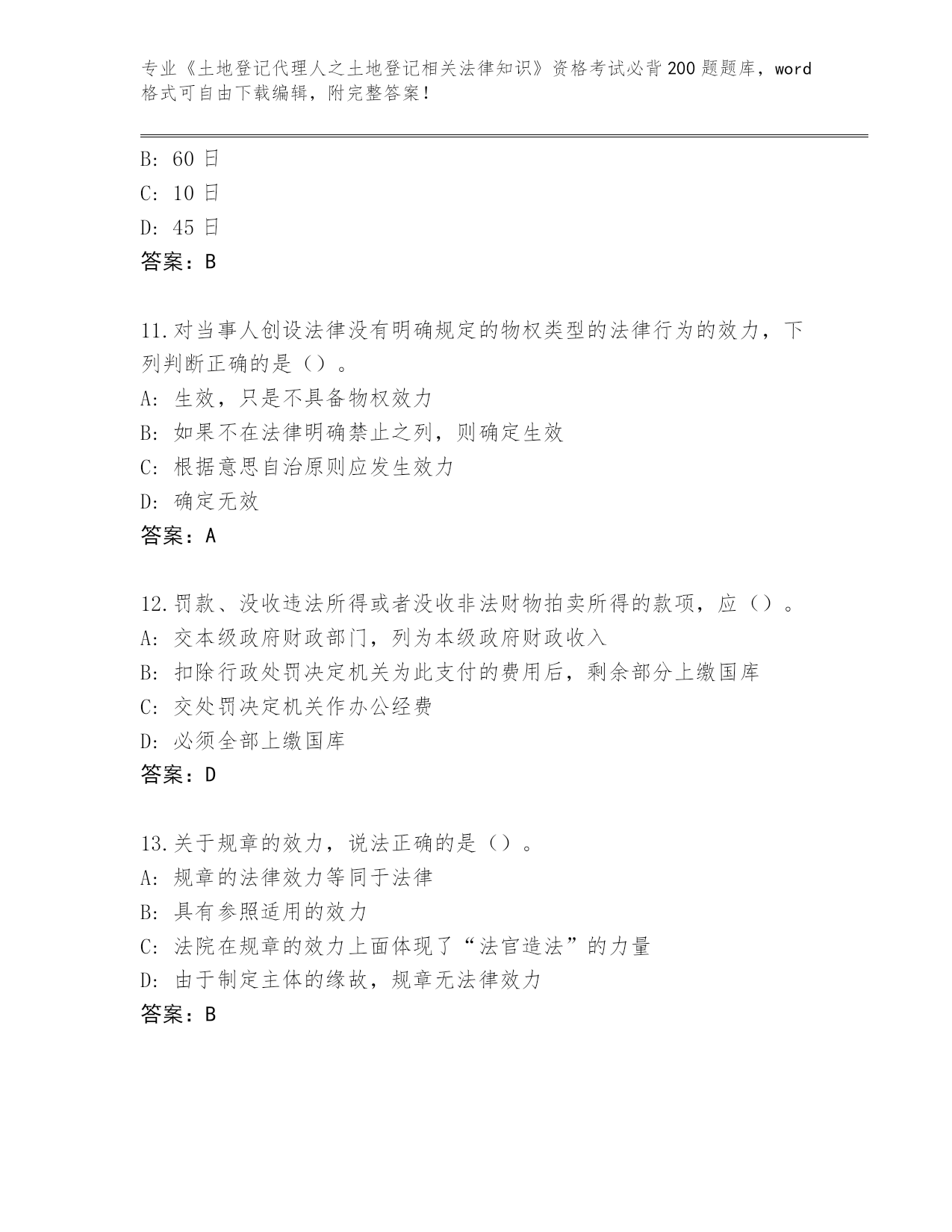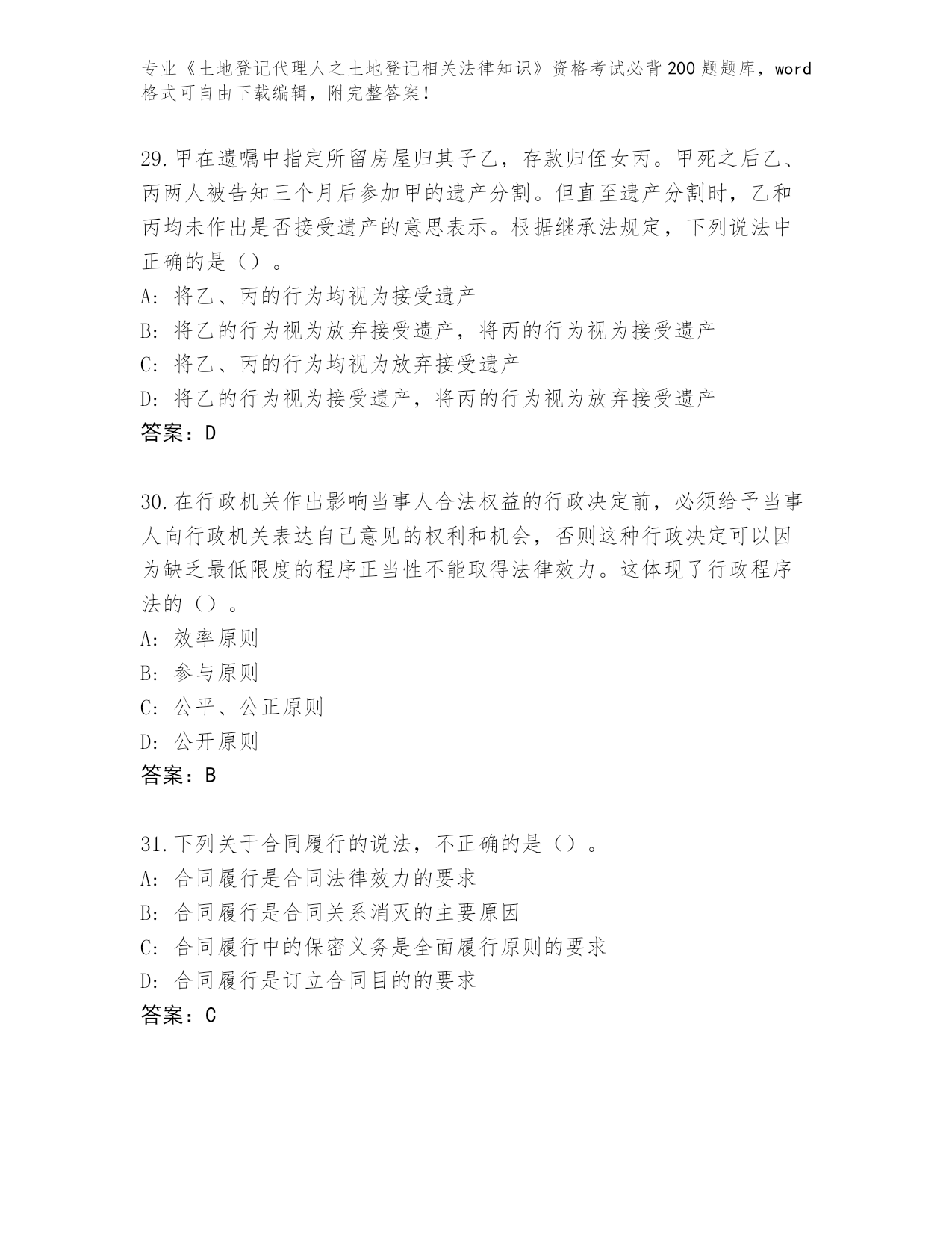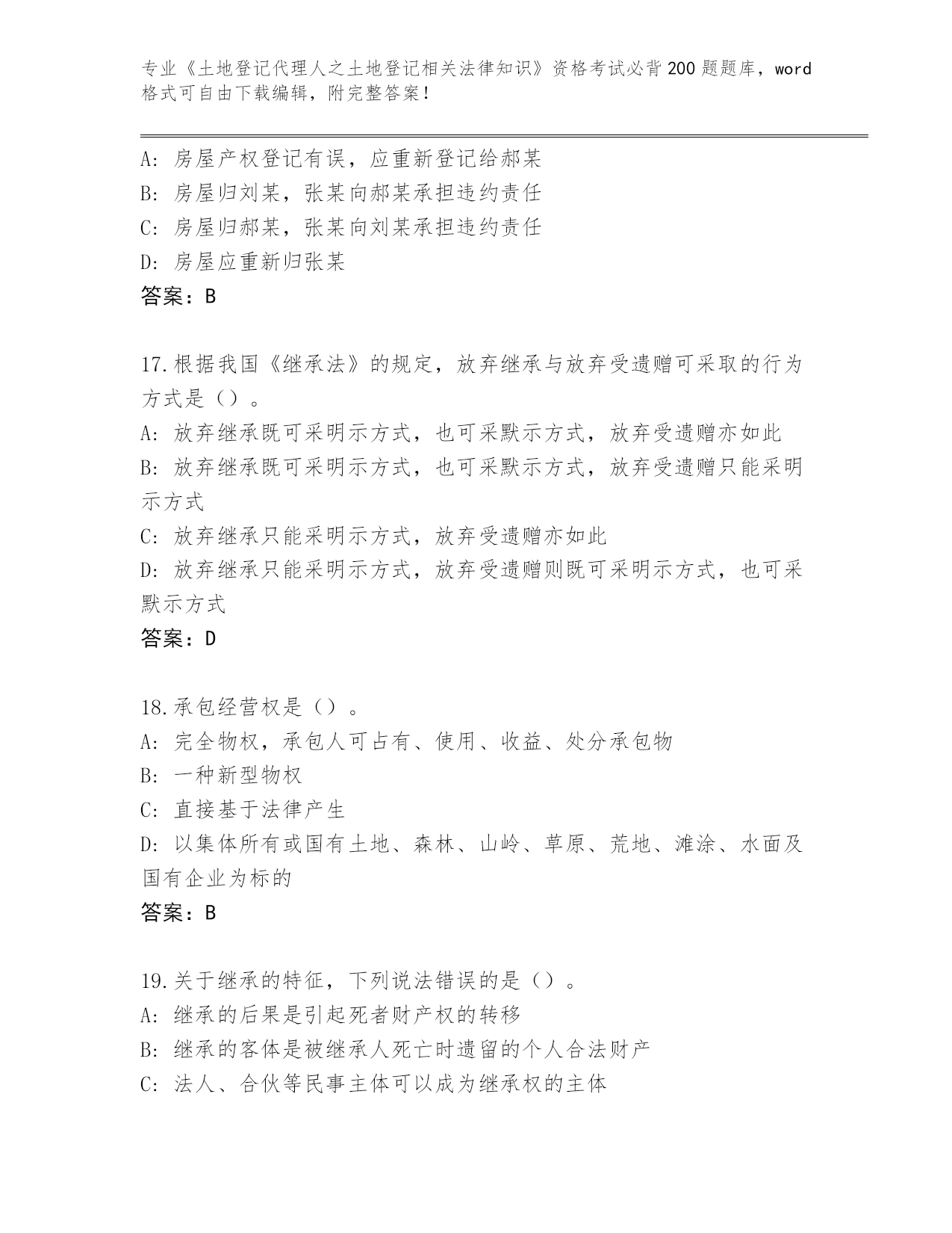 湖北省房县内部使用《土地登记代理人之土地登记相关法律知识》资格考试必背200题大全【考点提分】