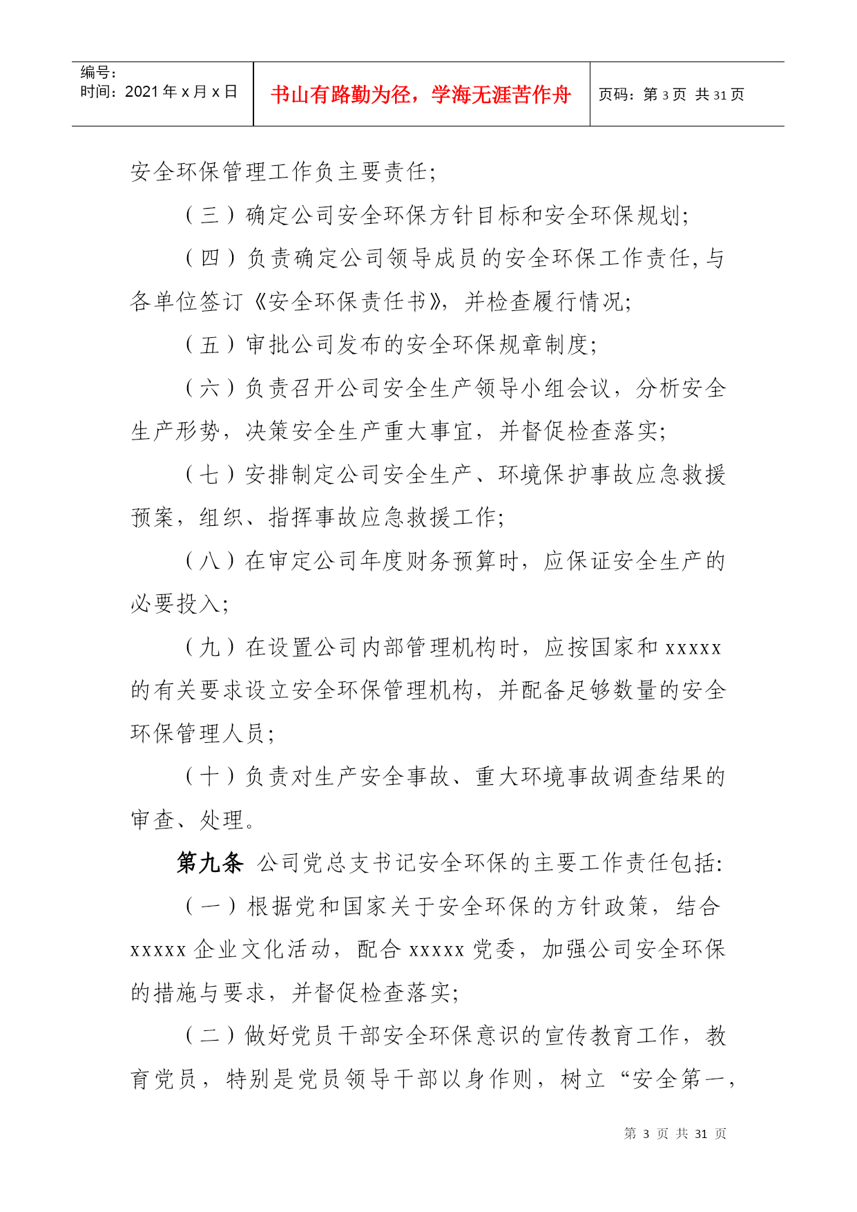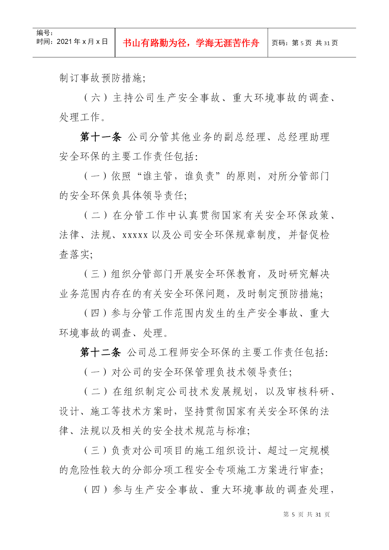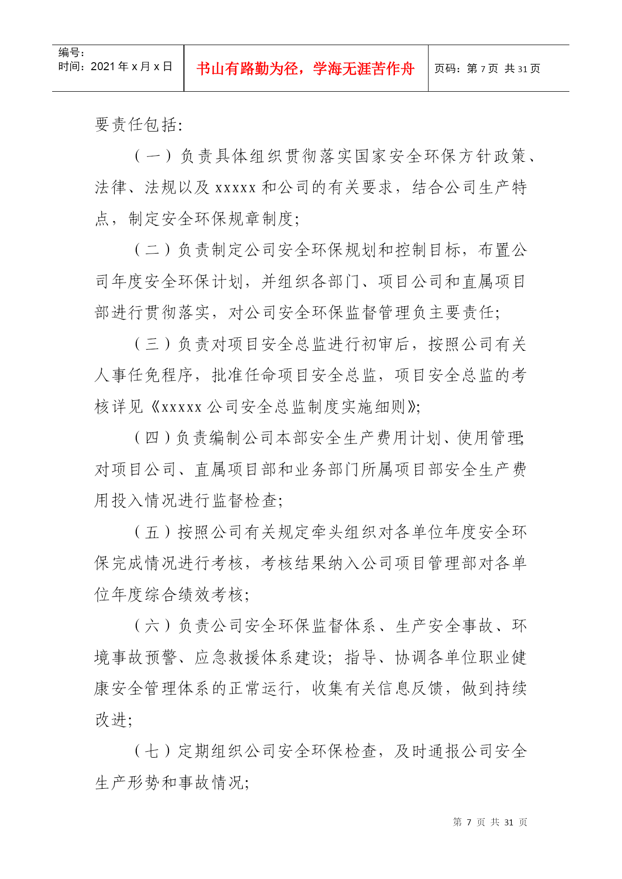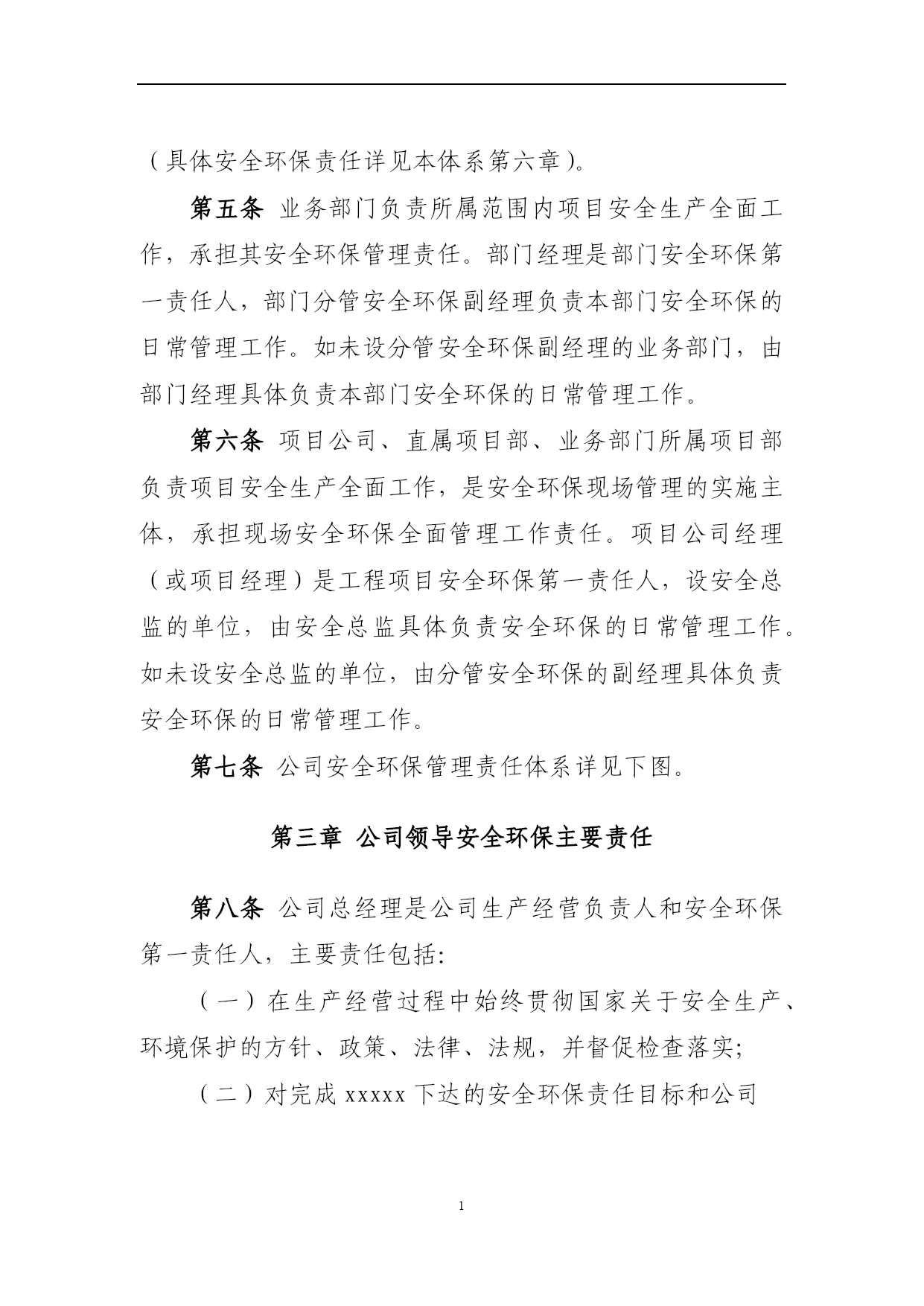 PAGEPAGE\*MERGEFORMAT1xxxxx公司安全环保管理责任体系第一章总则第一条为贯彻落实“安全第一、预防为主、综合治理”的方针,按照xxxxx公司(以下简称xxxxx)“集团统一领导,安监部门统一协调,各单位各部门各司其职、各负其责,谁主管谁负责,一把手负总责,党组织提供思想组织保证”的要求,进一步增强全体员工的安全环保意识,规范xxxxx公司(以下简称公司)安全环保管理,落实各级安全环保责任,制定本责任体系。第二条本责任体系适用于公司各级人员、各部门和各单位。第二章安全环保责任体系第三条公司承担公司范围内所有项目的安全环保管理责任。公司总经理是公司安全环保第一责任人,负责公司安全生产、环境保护全面工作;分管安全生产的副总经理负责公司安全环保的全面监督管理工作;公司安全总监负责公司安全环保的日常具体监督管理工作;党总支书记、副总经理、总经理助理负责各分管部门的安全环保管理工作。项目公司直属项目部财务部第四条各部门负责与本部门职责相关的安全环保工作(具体安全环保责任详见本体系第六章)。第五条业务部门负责所属范围内项目安全生产全面工作,承担其安全环保管理责任。部门经理是部门安全环保第一责任人,部门分管安全环保副经理负责本部门安全环保的日常管理工作。如未设分管安全环保副经理的业务部门,由部门经理具体负责本部门安全环保的日常管理工作。第六条项目公司、直属项目部、业务部门所属项目部负责项目安全生产全面工作,是安全环保现场管理的实施主体,承担现场安全环保全面管理工作责任。项目公司经理(或项目经理)是工程项目安全环保第一责任人,设安全总监的单位,由安全总监具体负责安全环保的日常管理工作。如未设安全总监的单位,由分管安全环保的副经理具体负责安全环保的日常管理工作。第七条公司安全环保管理责任体系详见下图。第三章公司领导安全环保主要责任第八条公司总经理是公司生产经营负责人和安全环保第一责任人,主要责任包括:(一)在生产经营过程中始终贯彻国家关于安全生产、环境保护的方针、政策、法律、法规,并督促检查落实;(二)对完成xxxxx下达的安全环保责任目标和公司PAGE2编号:时间:2021年x月x日书山有路勤为径,学海无涯苦作舟页码:第PAGE30页共NUMPAGES31页第PAGE\*MERGEFORMAT30页共NUMPAGES\*MERGEFORMAT31页安全环保管理工作负主要责任;(三)确定公司安全环保方针目标和安全环保规划;(四)负责确定公司领导成员的安全环保工作责任,与各单位签订《安全环保责任书》,并检查履行情况;(五)审批公司发布的安全环保规章制度;(六)负责召开公司安全生产领导小组会议,分析安全生产形势,决策安全生产重大事宜,并督促检查落实;(七)安排制定公司安全生产、环境保护事故应急救援预案,组织、指挥事故应急救援工作;(八)在审定公司年度财务预算时,应保证安全生产的必要投入;(九)在设置公司内部管理机构时,应按国家和xxxxx的有关要求设立安全环保管理机构,并配备足够数量的安全环保管理人员;(十)负责对生产安全事故、重大环境事故调查结果的审查、处理。第九条公司党总支书记安全环保的主要工作责任包括:(一)根据党和国家关于安全环保的方针政策,结合xxxxx企业文化活动,配合xxxxx党委,加强公司安全环保的措施与要求,并督促检查落实;(二)做好党员干部安全环保意识的宣传教育工作,教育党员,特别是党员领导干部以身作则,树立“安全第一,预防为主,综合治理”的安全生产指导思想。并督促各党支部做好对党员强化安全环保意识和遵章守纪的教育;(三)组织公司开展党员身边无事故活动,严肃处理因“有令不行、有禁不止”而发生重大责任事故的党员。把在安全生产中的表现,列为考核党支部和党员干部的一项重要内容;(四)表彰安全生产中涌现出的先进人物与事迹;(五)参与对生产安全事故的调查、处理工作。召开党组织会议,分析事故原因、追查事故责任,研究防范措施,对主要责任者做出党纪处分。第十条公司分管安全环保工作副总经理的主要工作责任包括:(一)贯彻国家安全生产、环境保护方针和xxxxx的有关规定,负责公司安全环保的全面管理工作,对公司的安全环保管理负直接领导责任;(二)结合公司安全环保实际,布置具体的实施措施;(三)布置制定公司安全环保方针、目标、安全环保规划、年度安全环保工作计划、安全环保管理规章制度;(四)主持召开公司安全生产领导小组工作会议,布置安全环保检查,认真处理安全环保中存在的问题,及时消除事故隐患;(五)总结安全生产先进经验,组织进行事故案例分析、制订事故预防措施;(六)主持公司生产安全