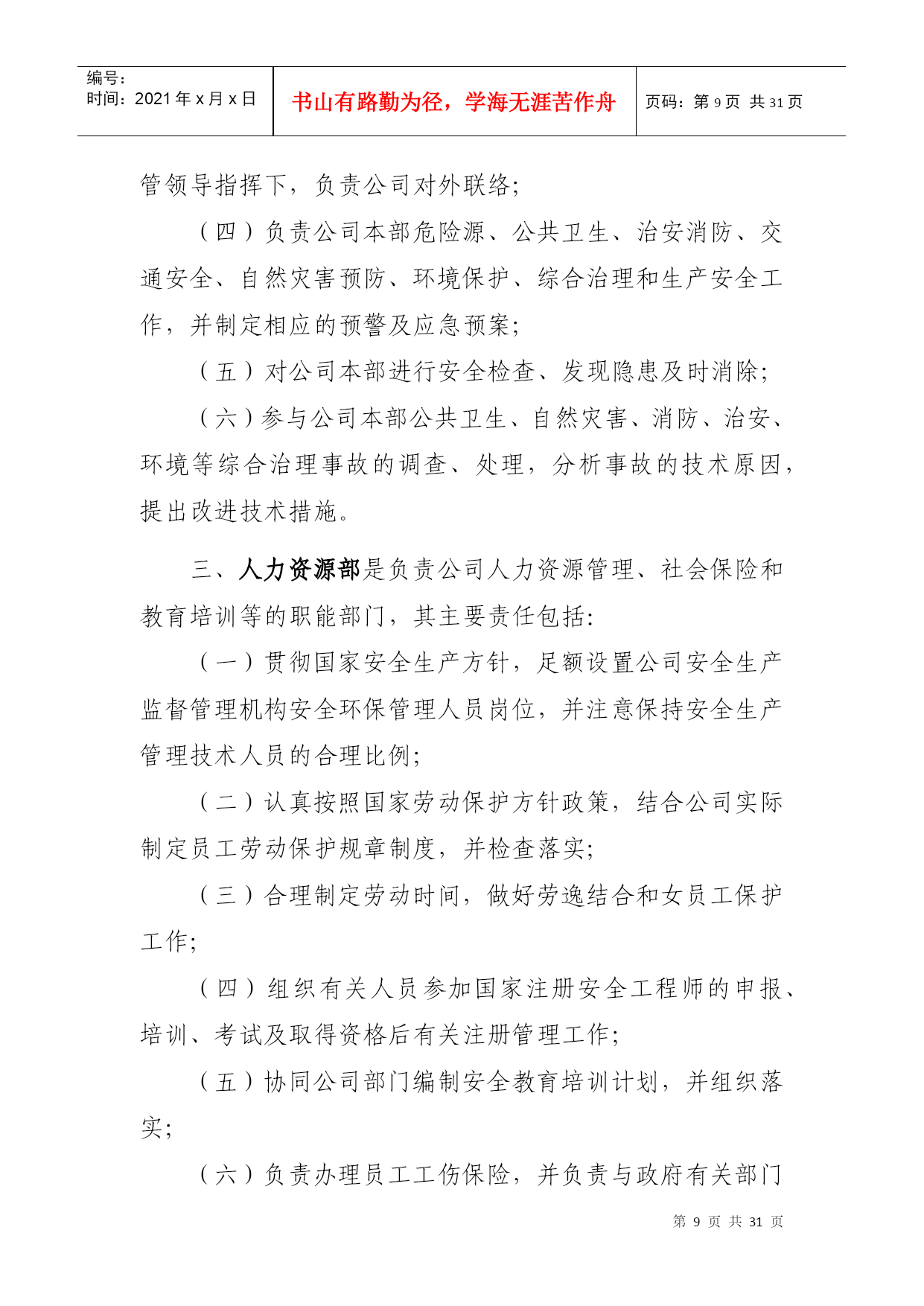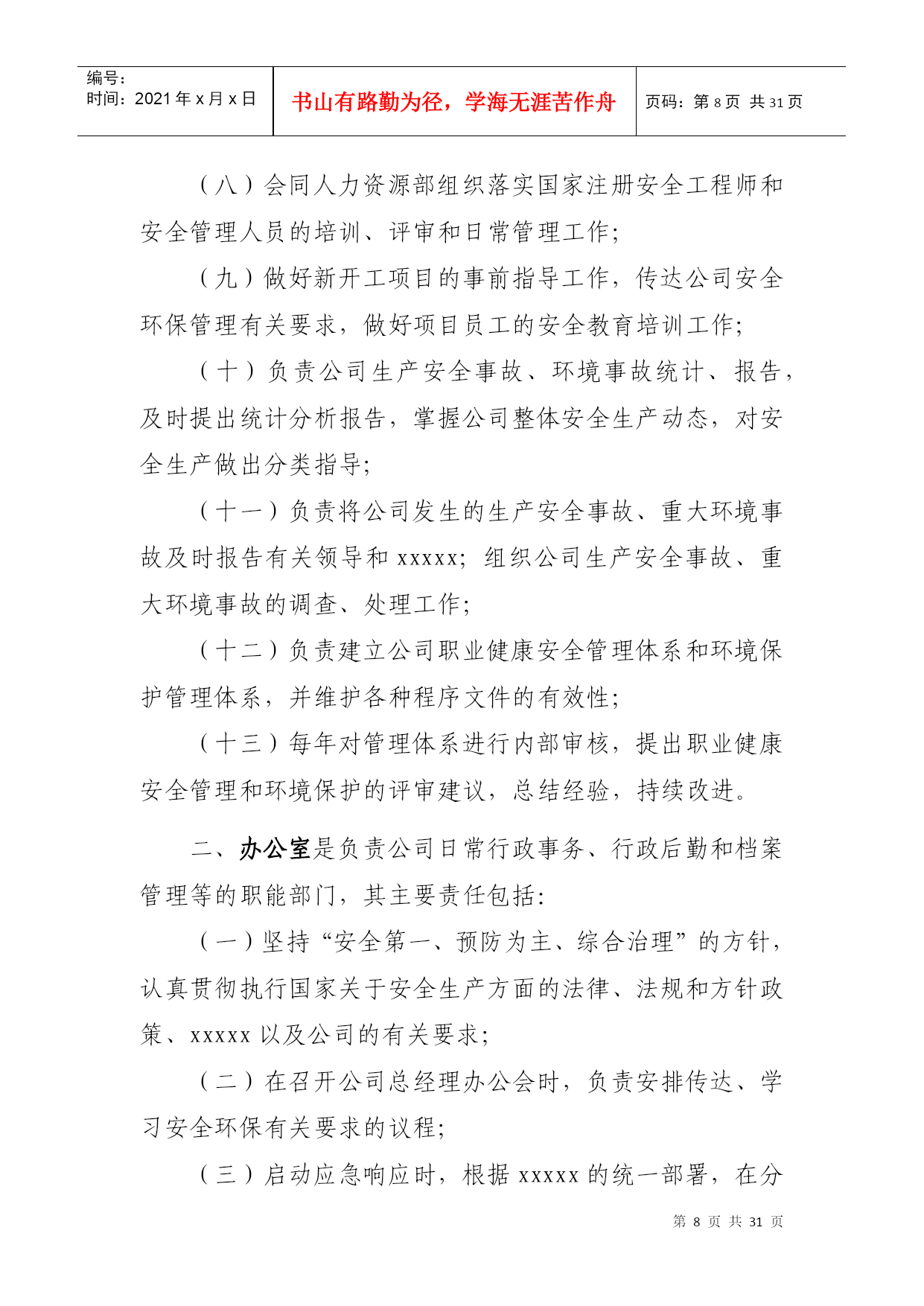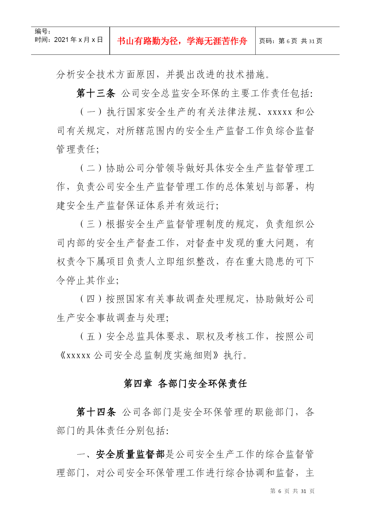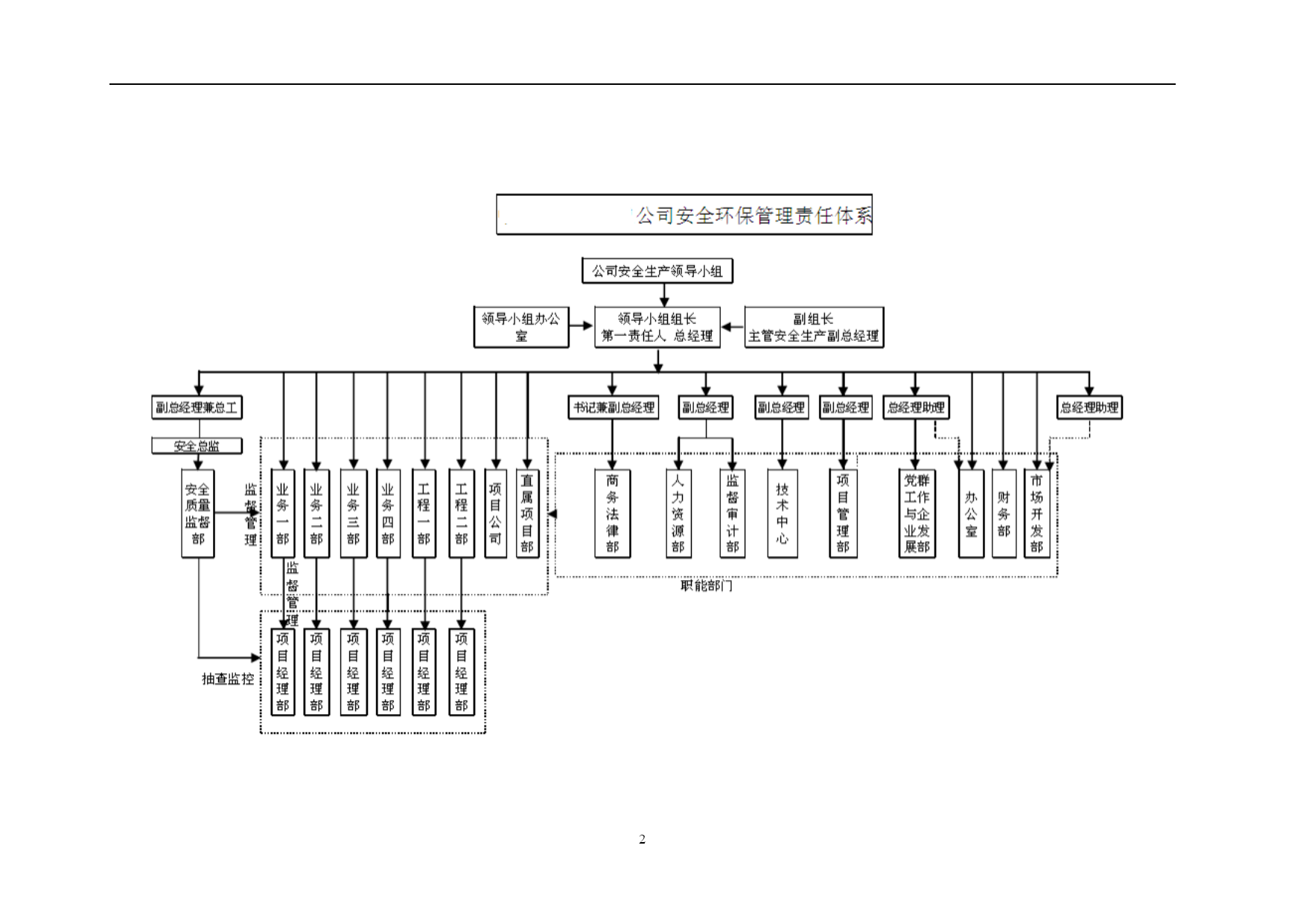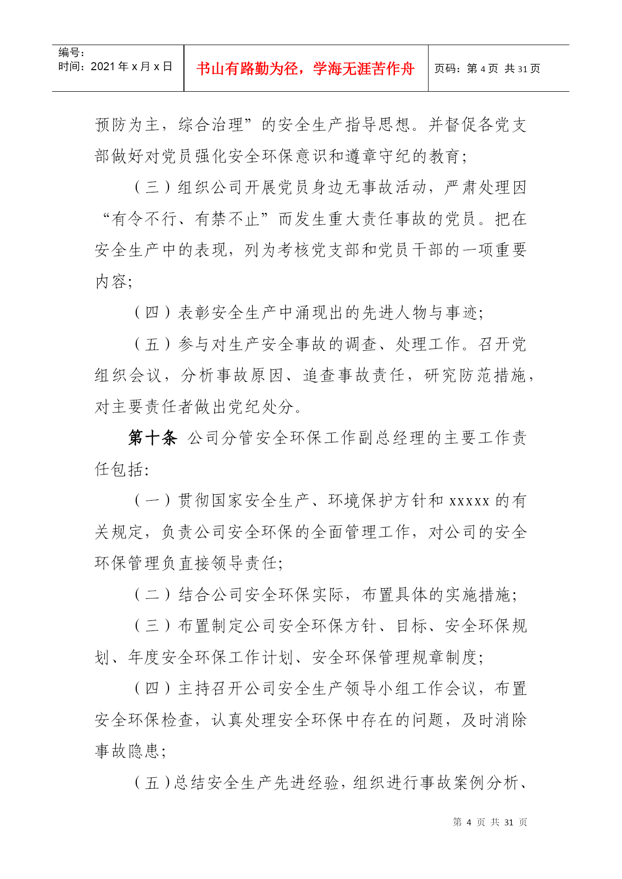 PAGEPAGE\*MERGEFORMAT1xxxxx公司安全环保管理责任体系第一章总则第一条为贯彻落实“安全第一、预防为主、综合治理”的方针,按照xxxxx公司(以下简称xxxxx)“集团统一领导,安监部门统一协调,各单位各部门各司其职、各负其责,谁主管谁负责,一把手负总责,党组织提供思想组织保证”的要求,进一步增强全体员工的安全环保意识,规范xxxxx公司(以下简称公司)安全环保管理,落实各级安全环保责任,制定本责任体系。第二条本责任体系适用于公司各级人员、各部门和各单位。第二章安全环保责任体系第三条公司承担公司范围内所有项目的安全环保管理责任。公司总经理是公司安全环保第一责任人,负责公司安全生产、环境保护全面工作;分管安全生产的副总经理负责公司安全环保的全面监督管理工作;公司安全总监负责公司安全环保的日常具体监督管理工作;党总支书记、副总经理、总经理助理负责各分管部门的安全环保管理工作。项目公司直属项目部财务部第四条各部门负责与本部门职责相关的安全环保工作(具体安全环保责任详见本体系第六章)。第五条业务部门负责所属范围内项目安全生产全面工作,承担其安全环保管理责任。部门经理是部门安全环保第一责任人,部门分管安全环保副经理负责本部门安全环保的日常管理工作。如未设分管安全环保副经理的业务部门,由部门经理具体负责本部门安全环保的日常管理工作。第六条项目公司、直属项目部、业务部门所属项目部负责项目安全生产全面工作,是安全环保现场管理的实施主体,承担现场安全环保全面管理工作责任。项目公司经理(或项目经理)是工程项目安全环保第一责任人,设安全总监的单位,由安全总监具体负责安全环保的日常管理工作。如未设安全总监的单位,由分管安全环保的副经理具体负责安全环保的日常管理工作。第七条公司安全环保管理责任体系详见下图。第三章公司领导安全环保主要责任第八条公司总经理是公司生产经营负责人和安全环保第一责任人,主要责任包括:(一)在生产经营过程中始终贯彻国家关于安全生产、环境保护的方针、政策、法律、法规,并督促检查落实;(二)对完成xxxxx下达的安全环保责任目标和公司PAGE2编号:时间:2021年x月x日书山有路勤为径,学海无涯苦作舟页码:第PAGE30页共NUMPAGES31页第PAGE\*MERGEFORMAT30页共NUMPAGES\*MERGEFORMAT31页安全环保管理工作负主要责任;(三)确定公司安全环保方针目标和安全环保规划;(四)负责确定公司领导成员的安全环保工作责任,与各单位签订《安全环保责任书》,并检查履行情况;(五)审批公司发布的安全环保规章制度;(六)负责召开公司安全生产领导小组会议,分析安全生产形势,决策安全生产重大事宜,并督促检查落实;(七)安排制定公司安全生产、环境保护事故应急救援预案,组织、指挥事故应急救援工作;(八)在审定公司年度财务预算时,应保证安全生产的必要投入;(九)在设置公司内部管理机构时,应按国家和xxxxx的有关要求设立安全环保管理机构,并配备足够数量的安全环保管理人员;(十)负责对生产安全事故、重大环境事故调查结果的审查、处理。第九条公司党总支书记安全环保的主要工作责任包括:(一)根据党和国家关于安全环保的方针政策,结合xxxxx企业文化活动,配合xxxxx党委,加强公司安全环保的措施与要求,并督促检查落实;(二)做好党员干部安全环保意识的宣传教育工作,教育党员,特别是党员领导干部以身作则,树立“安全第一,预防为主,综合治理”的安全生产指导思想。并督促各党支部做好对党员强化安全环保意识和遵章守纪的教育;(三)组织公司开展党员身边无事故活动,严肃处理因“有令不行、有禁不止”而发生重大责任事故的党员。把在安全生产中的表现,列为考核党支部和党员干部的一项重要内容;(四)表彰安全生产中涌现出的先进人物与事迹;(五)参与对生产安全事故的调查、处理工作。召开党组织会议,分析事故原因、追查事故责任,研究防范措施,对主要责任者做出党纪处分。第十条公司分管安全环保工作副总经理的主要工作责任包括:(一)贯彻国家安全生产、环境保护方针和xxxxx的有关规定,负责公司安全环保的全面管理工作,对公司的安全环保管理负直接领导责任;(二)结合公司安全环保实际,布置具体的实施措施;(三)布置制定公司安全环保方针、目标、安全环保规划、年度安全环保工作计划、安全环保管理规章制度;(四)主持召开公司安全生产领导小组工作会议,布置安全环保检查,认真处理安全环保中存在的问题,及时消除事故隐患;(五)总结安全生产先进经验,组织进行事故案例分析、制订事故预防措施;(六)主持公司生产安全