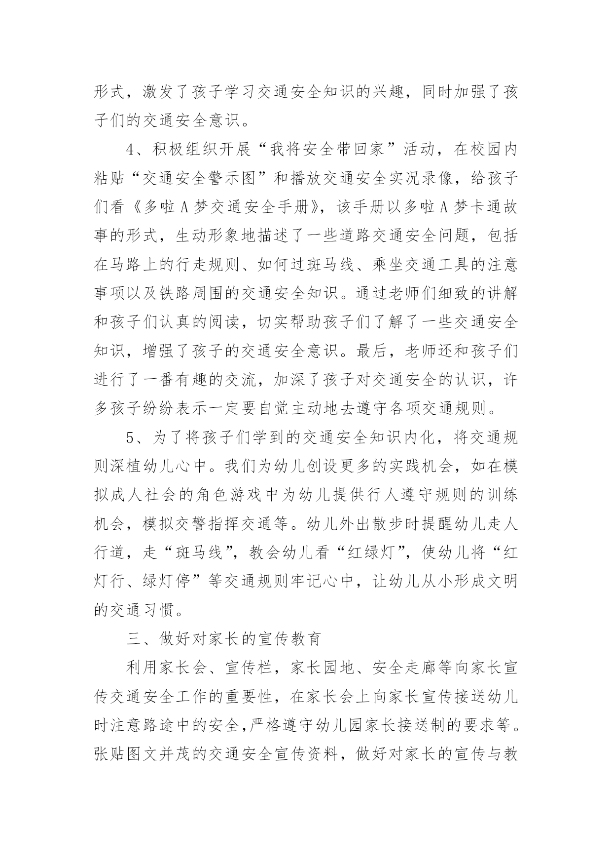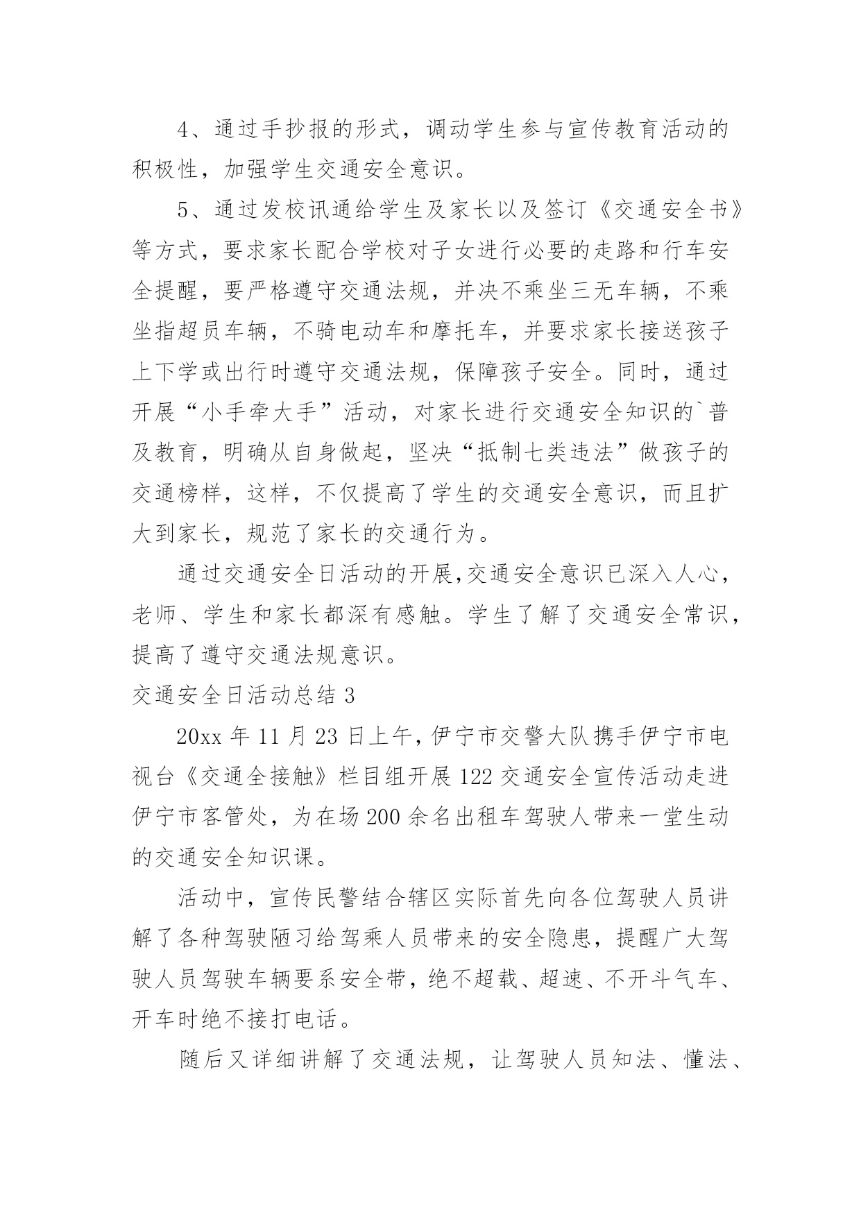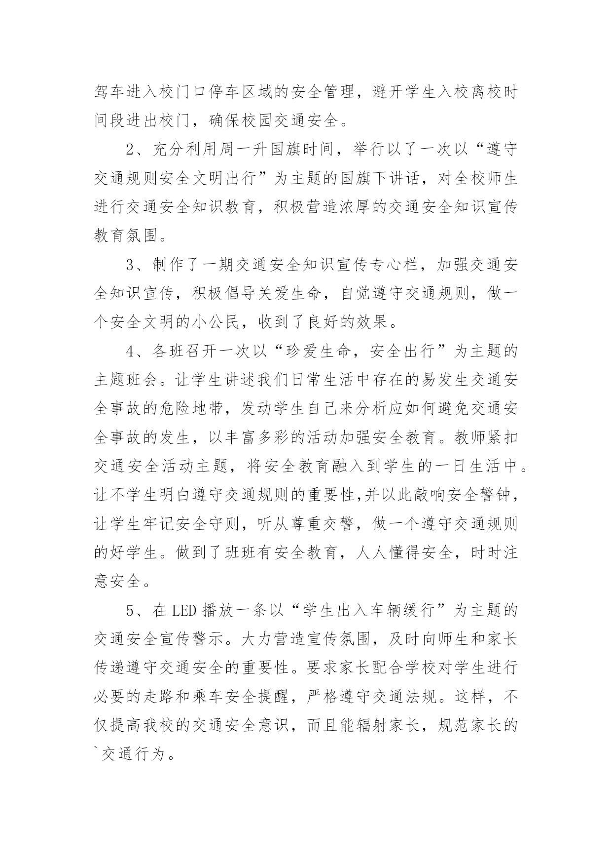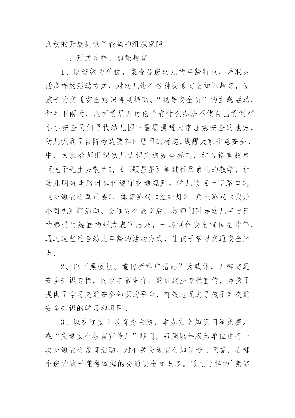 交通安全日活动总结(热门)交通安全日活动总结总结是在某一特定时间段对学习和工作生活或其完成情况,包括取得的成绩、存在的问题及得到的经验和教训加以回顾和分析的书面材料,它能帮我们理顺知识结构,突出重点,突破难点,快快来写一份总结吧。那么你知道总结如何写吗?以下是小编精心整理的交通安全日活动总结,欢迎大家借鉴与参考,希望对大家有所帮助。交通安全日活动总结1生命诚可贵,车祸价更高。交通安全关系着每一个未成年学生的健康成长。未成年学生是道路交通中的弱势群体,最需要接受交通安全的教育,让他们在参与交通安全教育中,知晓安全法制常识,遵守交通法律法规,学会保护自身安全等都是非常重要的。我园有计划地开展了扎实有效的交通安全宣传教育活动,在全园师生中掀起了学习交通安全知识和自我保护的新热潮,收效显著。现将具体活动总结如下:一、健全机制,责任到人,分工明确健全的组织是安全工作的重要组成部分。为此,我园召集全体教师召开了交通安全宣传教育月启动工作会议,并成立了由园长亲自担任组长,全面负责此次交通安全教育活动,以及各部门负责人组成的交通安全宣传月活动领导小组,为活动的开展提供了较强的组织保障。二、形式多样、加强教育1、以班级为单位,集合各班幼儿的年龄特点,采取灵活多样的活动方式,对幼儿进行各种交通安全知识教育,使孩子的交通安全意识得到提高。“我是安全员”的主题活动,针对下雨天、地面滑展开讨论“有什么办法不使自己滑倒?”小小安全员们寻找幼儿园中需要提醒大家注意安全的地方,幼儿找到了台阶旁边要粘贴醒目的标志,提醒大家注意安全。中、大班教师组织幼儿认识交通安全标志,结合语言故事《兔子先生去散步》,《三颗星星》等进行形象化的教学,让幼儿明确走路时如何遵守交通规则。学儿歌《十字路口》,《交通安全真重要》,体育游戏《红绿灯》,角色游戏《我是小司机》等活动。交通安全教育后,教师们引导幼儿将自己的感受用绘画的形式表现出来,一起制作安全宣传图片等,通过这些适合幼儿年龄的活动方式,让孩子学习交通安全知识。2、以“黑板报、宣传栏和广播站”为载体,开辟交通安全知识专栏,内容丰富多样。通过这些专栏宣传,为孩子提供了学习交通安全知识的平台,有效地促进了孩子对交通安全知识的学习和巩固。3、以交通安全教育为主题,举办安全知识问答竞赛。在“交通安全教育宣传月”期间,每周以年级为单位进行一次交通安全教育活动,对有关交通安全知识进行竞答,看哪个班的孩子懂得掌握的交通安全知识多。通过这样的`竞答形式,激发了孩子学习交通安全知识的兴趣,同时加强了孩子们的交通安全意识。4、积极组织开展“我将安全带回家”活动,在校园内粘贴“交通安全警示图”和播放交通安全实况录像,给孩子们看《多啦A梦交通安全手册》,该手册以多啦A梦卡通故事的形式,生动形象地描述了一些道路交通安全问题,包括在马路上的行走规则、如何过斑马线、乘坐交通工具的注意事项以及铁路周围的交通安全知识。通过老师们细致的讲解和孩子们认真的阅读,切实帮助孩子们了解了一些交通安全知识,增强了孩子的交通安全意识。最后,老师还和孩子们进行了一番有趣的交流,加深了孩子对交通安全的认识,许多孩子纷纷表示一定要自觉主动地去遵守各项交通规则。5、为了将孩子们学到的交通安全知识内化,将交通规则深植幼儿心中。我们为幼儿创设更多的实践机会,如在模拟成人社会的角色游戏中为幼儿提供行人遵守规则的训练机会,模拟交警指挥交通等。幼儿外出散步时提醒幼儿走人行道,走“斑马线”,教会幼儿看“红绿灯”,使幼儿将“红灯行、绿灯停”等交通规则牢记心中,让幼儿从小形成文明的交通习惯。三、做好对家长的宣传教育利用家长会、宣传栏,家长园地、安全走廊等向家长宣传交通安全工作的重要性,在家长会上向家长宣传接送幼儿时注意路途中的安全,严格遵守幼儿园家长接送制的要求等。张贴图文并茂的交通安全宣传资料,做好对家长的宣传与教育,强调幼儿的交通安全,保证幼儿的安全。交通安全日活动总结220xx年XX月XX日是第三个“全国交通安全日”。我校根据上级文件精神,在我校开展形式多样的教育活动,加大了交通安全的宣传力度,增强了全师生的交通安全观念,现把活动总结如下:我校成立“学校交通安全宣传周活动领导小组”,负责组织和安排学校的交通安全教育工作,把学生的交通安全列入重要的议事日程。根据文件精神,提出活动的方案;开展全校性的教育活动,通过国旗下讲话宣传的同时,还通过学校的LED、学生自做手抄报、黑板报等形式进行交通安全宣传等等。具体活动如下:1、利用班会课,对学生普及交通安全知识,实现了交通安全教育进学校的目的。2、利用各种载体,广泛开展“文通安全日”活动。进行国旗下讲话,在校园悬挂交通日主题横幅,在学校电子屏上滚动播放宣传交通安全,各班黑板报出“交通安全”专刊进行宣传,开展学校交通宣传专栏,校园广播室开展“每天安