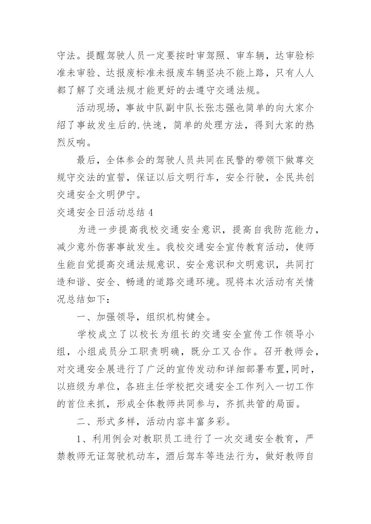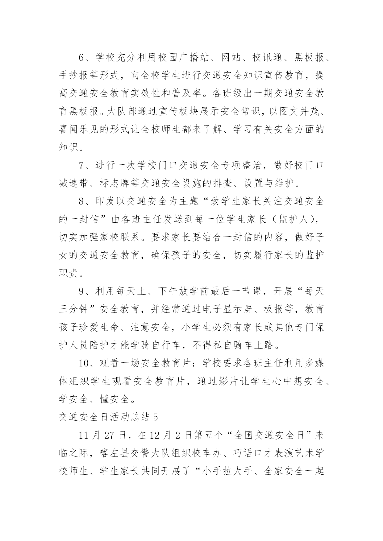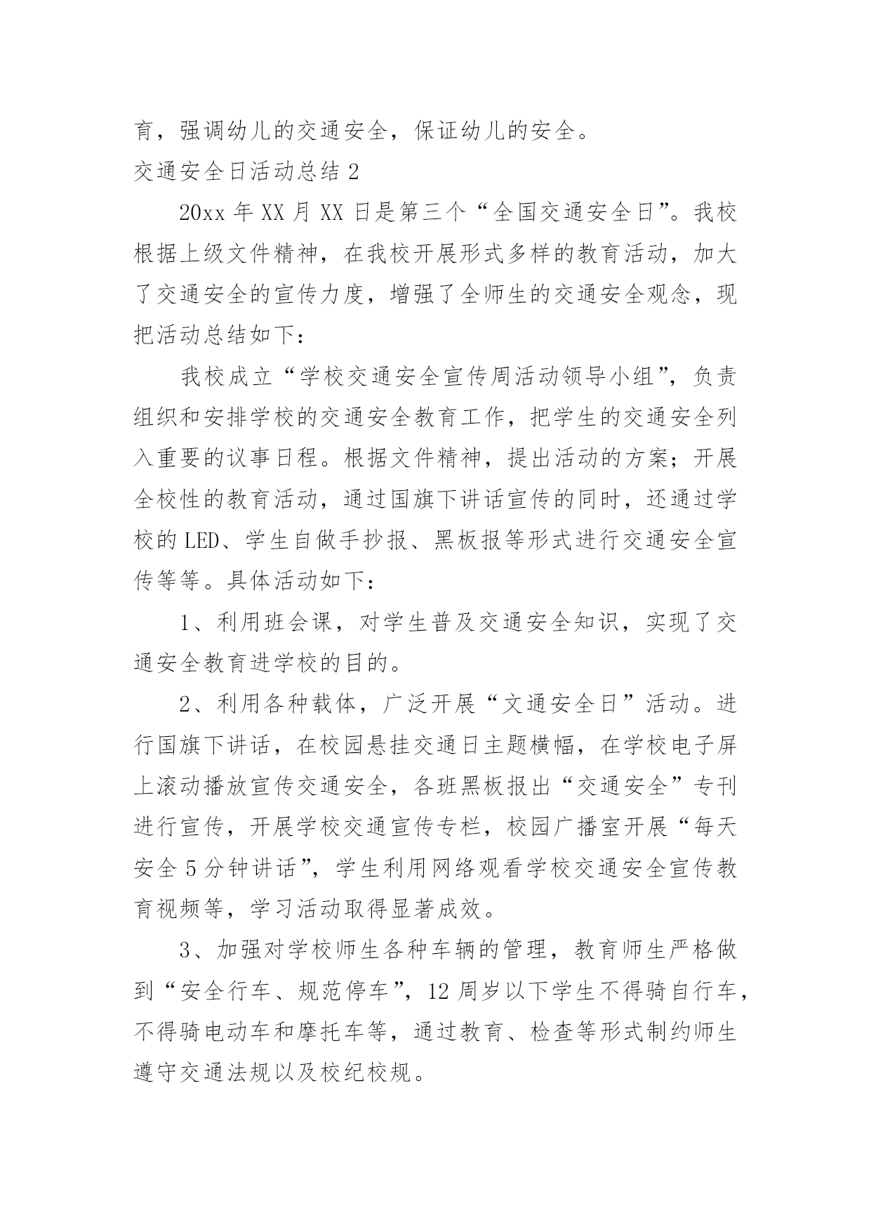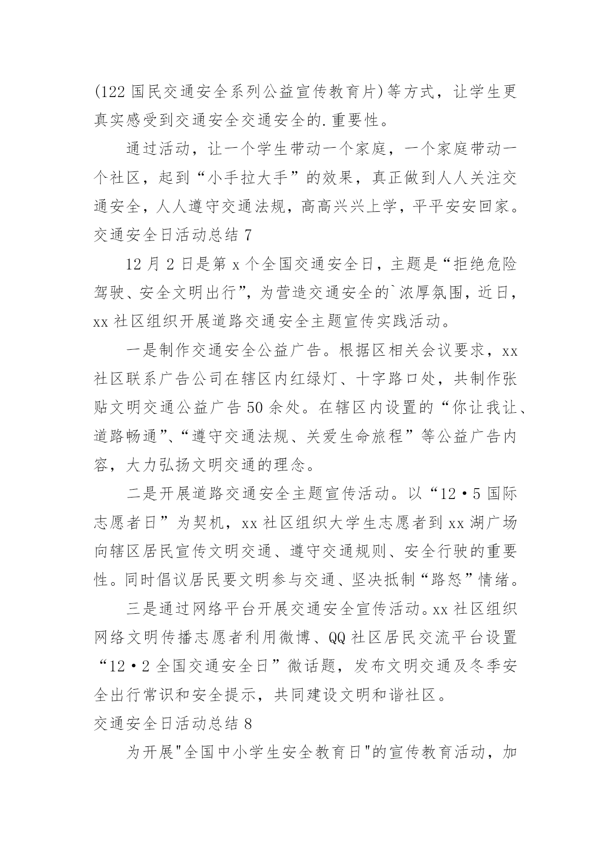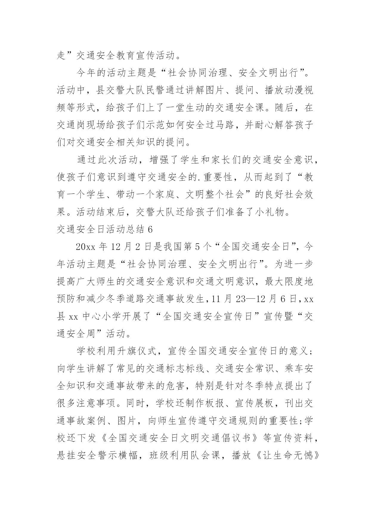 交通安全日活动总结(热门)交通安全日活动总结总结是在某一特定时间段对学习和工作生活或其完成情况,包括取得的成绩、存在的问题及得到的经验和教训加以回顾和分析的书面材料,它能帮我们理顺知识结构,突出重点,突破难点,快快来写一份总结吧。那么你知道总结如何写吗?以下是小编精心整理的交通安全日活动总结,欢迎大家借鉴与参考,希望对大家有所帮助。交通安全日活动总结1生命诚可贵,车祸价更高。交通安全关系着每一个未成年学生的健康成长。未成年学生是道路交通中的弱势群体,最需要接受交通安全的教育,让他们在参与交通安全教育中,知晓安全法制常识,遵守交通法律法规,学会保护自身安全等都是非常重要的。我园有计划地开展了扎实有效的交通安全宣传教育活动,在全园师生中掀起了学习交通安全知识和自我保护的新热潮,收效显著。现将具体活动总结如下:一、健全机制,责任到人,分工明确健全的组织是安全工作的重要组成部分。为此,我园召集全体教师召开了交通安全宣传教育月启动工作会议,并成立了由园长亲自担任组长,全面负责此次交通安全教育活动,以及各部门负责人组成的交通安全宣传月活动领导小组,为活动的开展提供了较强的组织保障。二、形式多样、加强教育1、以班级为单位,集合各班幼儿的年龄特点,采取灵活多样的活动方式,对幼儿进行各种交通安全知识教育,使孩子的交通安全意识得到提高。“我是安全员”的主题活动,针对下雨天、地面滑展开讨论“有什么办法不使自己滑倒?”小小安全员们寻找幼儿园中需要提醒大家注意安全的地方,幼儿找到了台阶旁边要粘贴醒目的标志,提醒大家注意安全。中、大班教师组织幼儿认识交通安全标志,结合语言故事《兔子先生去散步》,《三颗星星》等进行形象化的教学,让幼儿明确走路时如何遵守交通规则。学儿歌《十字路口》,《交通安全真重要》,体育游戏《红绿灯》,角色游戏《我是小司机》等活动。交通安全教育后,教师们引导幼儿将自己的感受用绘画的形式表现出来,一起制作安全宣传图片等,通过这些适合幼儿年龄的活动方式,让孩子学习交通安全知识。2、以“黑板报、宣传栏和广播站”为载体,开辟交通安全知识专栏,内容丰富多样。通过这些专栏宣传,为孩子提供了学习交通安全知识的平台,有效地促进了孩子对交通安全知识的学习和巩固。3、以交通安全教育为主题,举办安全知识问答竞赛。在“交通安全教育宣传月”期间,每周以年级为单位进行一次交通安全教育活动,对有关交通安全知识进行竞答,看哪个班的孩子懂得掌握的交通安全知识多。通过这样的`竞答形式,激发了孩子学习交通安全知识的兴趣,同时加强了孩子们的交通安全意识。4、积极组织开展“我将安全带回家”活动,在校园内粘贴“交通安全警示图”和播放交通安全实况录像,给孩子们看《多啦A梦交通安全手册》,该手册以多啦A梦卡通故事的形式,生动形象地描述了一些道路交通安全问题,包括在马路上的行走规则、如何过斑马线、乘坐交通工具的注意事项以及铁路周围的交通安全知识。通过老师们细致的讲解和孩子们认真的阅读,切实帮助孩子们了解了一些交通安全知识,增强了孩子的交通安全意识。最后,老师还和孩子们进行了一番有趣的交流,加深了孩子对交通安全的认识,许多孩子纷纷表示一定要自觉主动地去遵守各项交通规则。5、为了将孩子们学到的交通安全知识内化,将交通规则深植幼儿心中。我们为幼儿创设更多的实践机会,如在模拟成人社会的角色游戏中为幼儿提供行人遵守规则的训练机会,模拟交警指挥交通等。幼儿外出散步时提醒幼儿走人行道,走“斑马线”,教会幼儿看“红绿灯”,使幼儿将“红灯行、绿灯停”等交通规则牢记心中,让幼儿从小形成文明的交通习惯。三、做好对家长的宣传教育利用家长会、宣传栏,家长园地、安全走廊等向家长宣传交通安全工作的重要性,在家长会上向家长宣传接送幼儿时注意路途中的安全,严格遵守幼儿园家长接送制的要求等。张贴图文并茂的交通安全宣传资料,做好对家长的宣传与教育,强调幼儿的交通安全,保证幼儿的安全。交通安全日活动总结220xx年XX月XX日是第三个“全国交通安全日”。我校根据上级文件精神,在我校开展形式多样的教育活动,加大了交通安全的宣传力度,增强了全师生的交通安全观念,现把活动总结如下:我校成立“学校交通安全宣传周活动领导小组”,负责组织和安排学校的交通安全教育工作,把学生的交通安全列入重要的议事日程。根据文件精神,提出活动的方案;开展全校性的教育活动,通过国旗下讲话宣传的同时,还通过学校的LED、学生自做手抄报、黑板报等形式进行交通安全宣传等等。具体活动如下:1、利用班会课,对学生普及交通安全知识,实现了交通安全教育进学校的目的。2、利用各种载体,广泛开展“文通安全日”活动。进行国旗下讲话,在校园悬挂交通日主题横幅,在学校电子屏上滚动播放宣传交通安全,各班黑板报出“交通安全”专刊进行宣传,开展学校交通宣传专栏,校园广播室开展“每天安