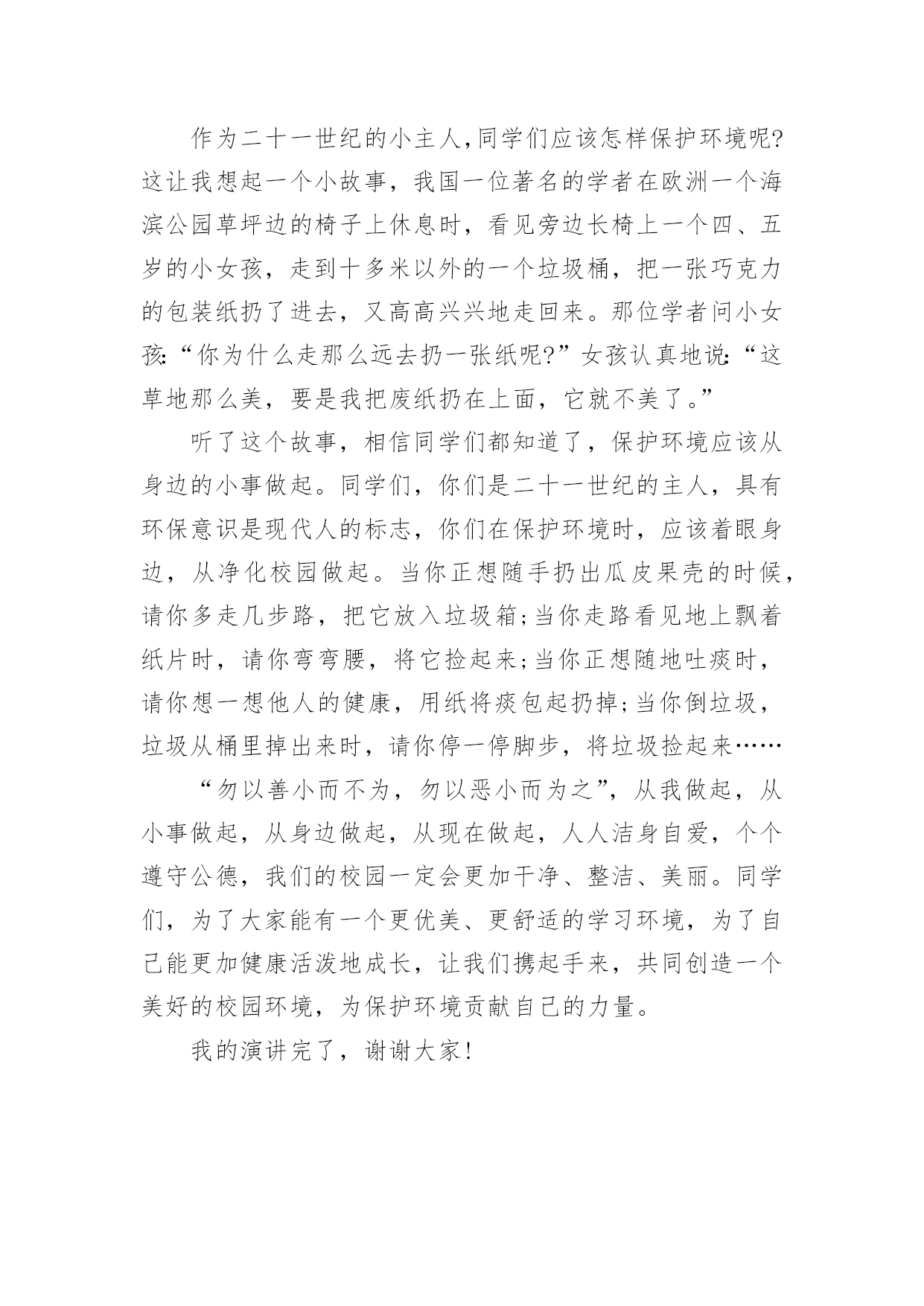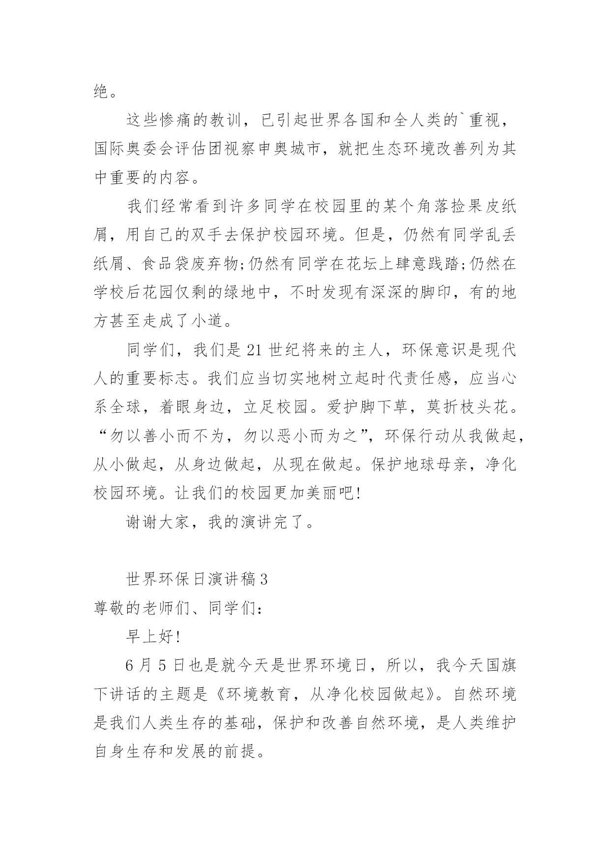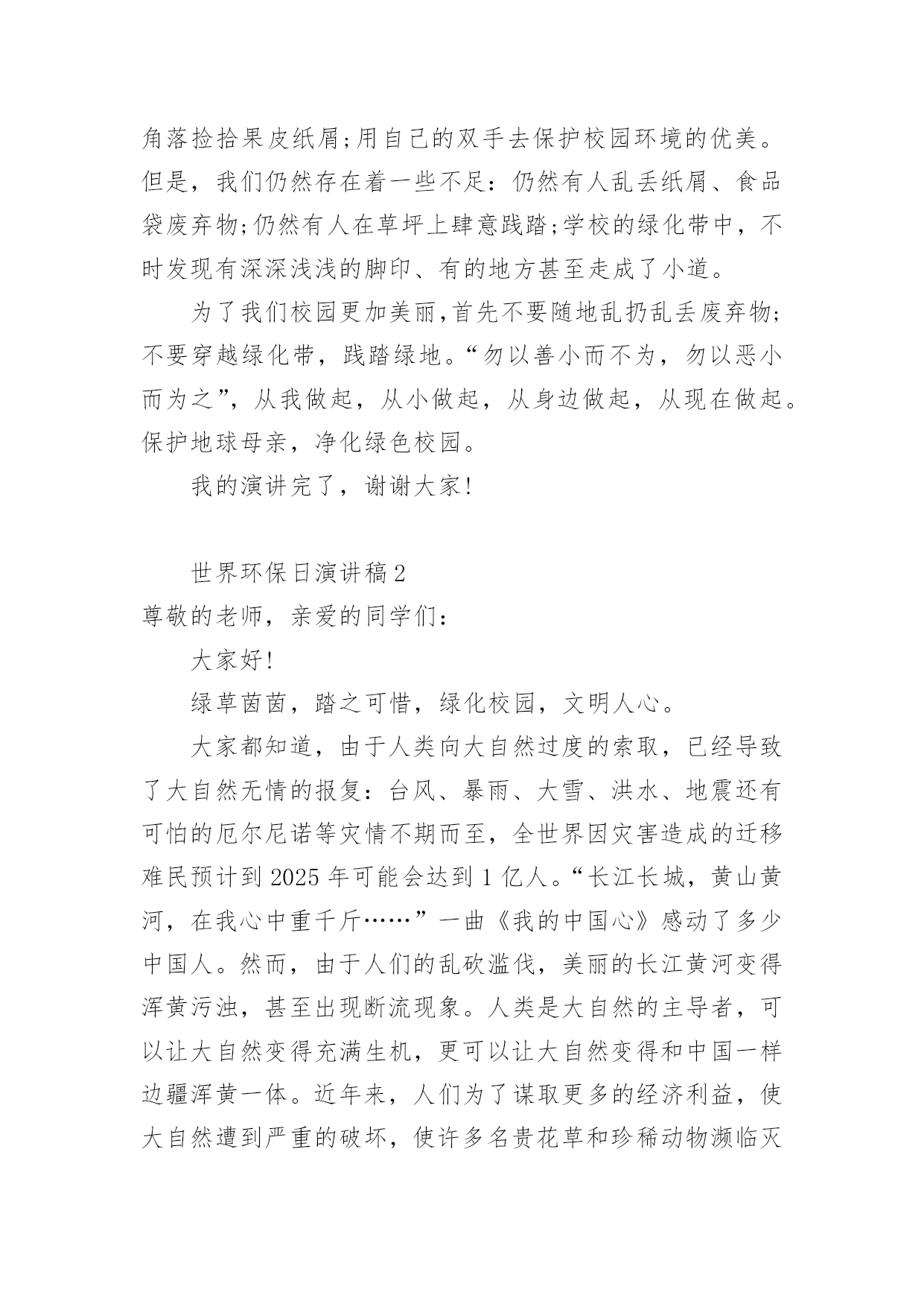 世界环保日演讲稿世界环保日演讲稿范文演讲稿的写法比较灵活,可以根据会议的内容、一件事事后的感想、需要等情况而有所区别。在当下社会,演讲稿在我们的视野里出现的频率越来越高,大家知道演讲稿的格式吗?以下是小编精心整理的世界环保日演讲稿,仅供参考,欢迎大家阅读。世界环保日演讲稿1尊敬的老师,亲爱的同学们:大家好,今天我演讲的题目是《保护地球母亲,净化校园环境》。我们都知道,地球是迄今为止人类所知道的宇宙中唯一可以承载人类生命的星球。人类在地球上生活已有几百万年的历史,在这漫长的岁月中,人类就是依靠地球上的资源(空气、水分、阳光)生存、繁衍、发展的,所以,地球是人类的母亲。世界文学大师雨果说:"大自然既是善良的慈母,同时也是冷酷的屠夫。"近年来,人类由于对环境不够珍惜,随心所欲,滥伐林木,滥建厂房,生存环境遭到了严重破坏,各种环境问题接踵而至:水土流失,洪水肆虐,火灾频发……空中烟囱林立,浓烟滚滚,河中死鱼漂荡,污水滔滔;地上垃圾遍布,废渣成堆……这是多么可怕的后果呀!在课间休息时,我们经常看到许多同学在校园里的各个角落捡拾果皮纸屑;用自己的双手去保护校园环境的优美。但是,我们仍然存在着一些不足:仍然有人乱丢纸屑、食品袋废弃物;仍然有人在草坪上肆意践踏;学校的绿化带中,不时发现有深深浅浅的脚印、有的地方甚至走成了小道。为了我们校园更加美丽,首先不要随地乱扔乱丢废弃物;不要穿越绿化带,践踏绿地。“勿以善小而不为,勿以恶小而为之”,从我做起,从小做起,从身边做起,从现在做起。保护地球母亲,净化绿色校园。我的演讲完了,谢谢大家!世界环保日演讲稿2尊敬的老师,亲爱的同学们:大家好!绿草茵茵,踏之可惜,绿化校园,文明人心。大家都知道,由于人类向大自然过度的索取,已经导致了大自然无情的报复:台风、暴雨、大雪、洪水、地震还有可怕的厄尔尼诺等灾情不期而至,全世界因灾害造成的迁移难民预计到2025年可能会达到1亿人。“长江长城,黄山黄河,在我心中重千斤……”一曲《我的中国心》感动了多少中国人。然而,由于人们的乱砍滥伐,美丽的长江黄河变得浑黄污浊,甚至出现断流现象。人类是大自然的主导者,可以让大自然变得充满生机,更可以让大自然变得和中国一样边疆浑黄一体。近年来,人们为了谋取更多的经济利益,使大自然遭到严重的破坏,使许多名贵花草和珍稀动物濒临灭绝。这些惨痛的教训,已引起世界各国和全人类的`重视,国际奥委会评估团视察申奥城市,就把生态环境改善列为其中重要的内容。我们经常看到许多同学在校园里的某个角落捡果皮纸屑,用自己的双手去保护校园环境。但是,仍然有同学乱丢纸屑、食品袋废弃物;仍然有同学在花坛上肆意践踏;仍然在学校后花园仅剩的绿地中,不时发现有深深的脚印,有的地方甚至走成了小道。同学们,我们是21世纪将来的主人,环保意识是现代人的重要标志。我们应当切实地树立起时代责任感,应当心系全球,着眼身边,立足校园。爱护脚下草,莫折枝头花。“勿以善小而不为,勿以恶小而为之”,环保行动从我做起,从小做起,从身边做起,从现在做起。保护地球母亲,净化校园环境。让我们的校园更加美丽吧!谢谢大家,我的演讲完了。世界环保日演讲稿3尊敬的老师们、同学们:早上好!6月5日也是就今天是世界环境日,所以,我今天国旗下讲话的主题是《环境教育,从净化校园做起》。自然环境是我们人类生存的基础,保护和改善自然环境,是人类维护自身生存和发展的前提。作为二十一世纪的小主人,同学们应该怎样保护环境呢?这让我想起一个小故事,我国一位著名的学者在欧洲一个海滨公园草坪边的椅子上休息时,看见旁边长椅上一个四、五岁的小女孩,走到十多米以外的一个垃圾桶,把一张巧克力的包装纸扔了进去,又高高兴兴地走回来。那位学者问小女孩:“你为什么走那么远去扔一张纸呢?”女孩认真地说:“这草地那么美,要是我把废纸扔在上面,它就不美了。”听了这个故事,相信同学们都知道了,保护环境应该从身边的小事做起。同学们,你们是二十一世纪的主人,具有环保意识是现代人的标志,你们在保护环境时,应该着眼身边,从净化校园做起。当你正想随手扔出瓜皮果壳的时候,请你多走几步路,把它放入垃圾箱;当你走路看见地上飘着纸片时,请你弯弯腰,将它捡起来;当你正想随地吐痰时,请你想一想他人的健康,用纸将痰包起扔掉;当你倒垃圾,垃圾从桶里掉出来时,请你停一停脚步,将垃圾捡起来……“勿以善小而不为,勿以恶小而为之”,从我做起,从小事做起,从身边做起,从现在做起,人人洁身自爱,个个遵守公德,我们的校园一定会更加干净、整洁、美丽。同学们,为了大家能有一个更优美、更舒适的学习环境,为了自己能更加健康活泼地成长,让我们携起手来,共同创造一个美好的校园环境,为保护环境贡献自己的力量。我的演讲完了,谢谢大家!