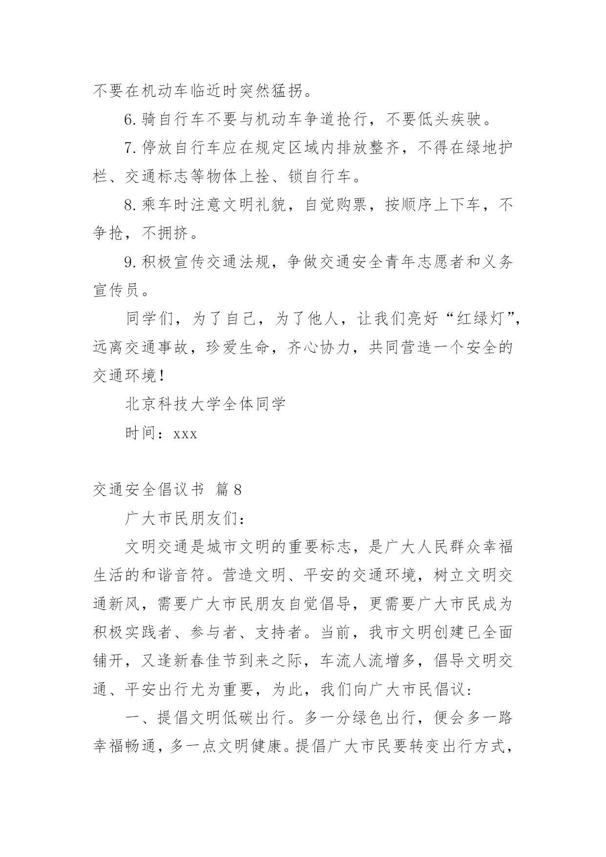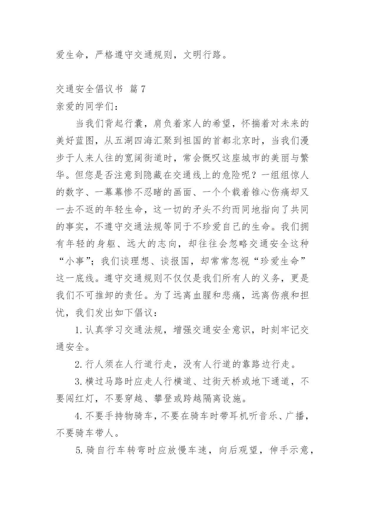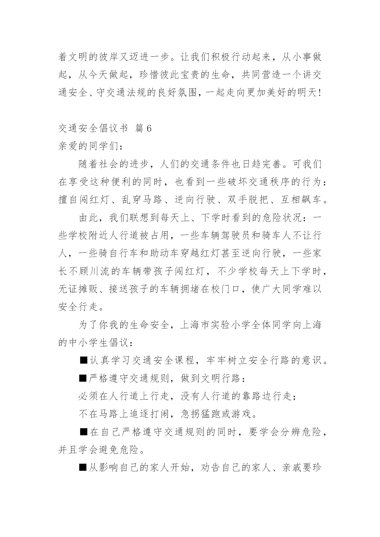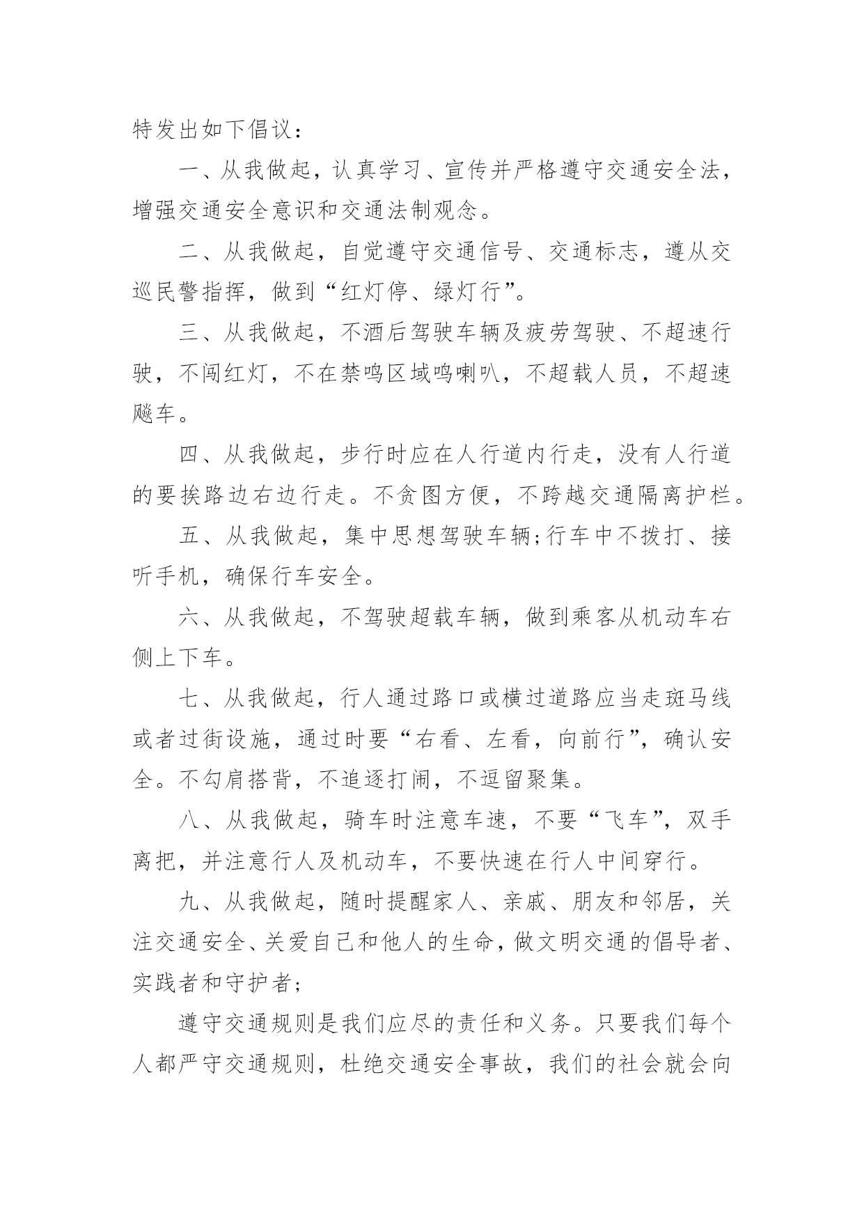 交通安全倡议书交通安全倡议书范文集合八篇在不断进步的时代,倡议书使用的情况越来越多,倡议书作为一种公开提议性的专用书信,其在写作上有一定的规范。那么一般倡议书是怎么写的呢?以下是小编整理的交通安全倡议书8篇,欢迎阅读与收藏。交通安全倡议书篇1亲爱的同学们:校园安全是我们学习生活的基本保障,校园文明是我们成长成才的有力保证。为了贯彻落实中央综治委、教育部、公安部《关于深入开展安全文明校园创建活动的意见》精神以及湖北省有关部门的《实施意见》,维护校园安全稳定,建设和谐文明校园,校团委、校学生会特向我校全体同学发出以下倡议:一、增强安全意识,重视安全防范。提高自我保护意识,注意人身及财产安全;学习安全知识,提高安全防范能力;重视安全防范,消除安全隐患;当人身、财产安全受到侵害时,及时向有关部门寻求救济。二、遵守校园秩序,维护校园稳定。严格遵守学校各项规章制度,维持良好的校园秩序;崇尚科学,提高觉悟,反对迷信,反对邪教,保持思想政治稳定;积极配合学校及相关部门的安全管理工作,维护校园及周边环境稳定。三、规范日常行为,养成良好习惯。在日常学习与生活中,严于律己,明礼修身,诚实守信,勤俭奋斗,遵守校规校纪与社会功德,爱护公共环境与卫生,养成良好的行为习惯,做文明的新时代大学生。四、营造和谐环境,创建文明校园。配合学校各项管理工作,尊重师长,团结同学,营造和谐的校园环境;保持饱满的精神风貌,营造良好的校风与学风,建设积极向上的校园文化,传播文明思想,创建文明校园。同学们,让我们携起手来,为将我校建设成为安全、稳定、文明的大学而贡献自己的力量!交通安全倡议书篇2全体员工:你们好!生活在这个喧嚣繁华的城镇让我们的生活变得精彩而便利,然而随着大家生活水平的不断提升只要我们走上马路,拥挤的车辆便在我们眼前来来往往。你是否感受到潜伏在我们周围的危险呢?因为上下班赶时间不遵守交通法规或存有麻痹和侥幸心理,我们看到了血的事实,经受了血的教训,那一幕幕令人心痛、惨不忍睹的场景,那一个个因抢救无效而离去的人们,最后留下的'都是心灵上的创伤和对离去者无尽的痛惜。在痛惜他们的同时,更应该清醒地认识到:遵守交通法规,就是珍爱生命!营造安全、文明、畅通的交通环境,是我们生命安全的重要保障。但在我们身边,车辆乱停乱放、占道、抢道、逆行、行人横穿马路等不文明交通行为却大量存在,一次次让人们付出了惨重的代价。血的教训再次警醒我们,文明交通就是珍爱生命,我们要从自身做起,增强交通安全意识和交通法制观念,自觉遵守交通法规,积极维护交通秩序!公司向全体员工发出如下倡议:一、从我做起,骑车(摩托车电动车)和搭乘摩托车佩戴安全头盔;增强交通安全意识,提高自我保护能力!二、从我做起,骑文明车,走文明路。自觉遵守交通安全法律法规,遵守交通信号、交通标志、交通标线,坚决抵制闯红灯、车辆超速、逆向行驶、强行超车、酒后骑车、乱停乱放等一切不文明交通行为!三、从我做起,不要与机动车辆及行人抢行,骑车时不要急转猛拐,低头疾驶;转弯时,应放慢车速,向后张望,伸手示意行驶方向,不要在机动车临近时突然转弯!四、从我做起,坚持做到“车让人、人让车、车让车、人让人”,共同维护良好的交通环境!五、从我做起,经常教育和提醒家人、亲戚、朋友和邻居,树立文明交通意识,关爱自己和他人的生命,做文明交通的倡导者、实践者和守护者!亲爱的公司员工,让我们携起手来,珍视安全、珍惜健康、珍爱生命。亲爱的同事们,让我们共同树立对自己负责、对家庭负责、对社会负责的责任感从我做起,从现在做起,平安出行,文明出行,让生命之树常青!交通安全倡议书篇3同学们:平平安安出门,快快乐乐回家。这是每一个家庭每一个孩子的愿望。为积极响应“全市中小学生交通安全教育宣传月”活动,进一步提高中小学生交通安全法制意识,预防和减少涉及中小学生的交通事故,充分发挥在校学生青年在道路交通安全中的模范带头作用,共建一个安全、有序、畅通的交通环境,学校团总支向全体学生发出以下倡议:遵守交通规则,从我做起。1、认真学习、宣传并严格遵守《中华人民共和国道路交通安全法》,注意从自身做起,增强交通安全意识和交通法制观念;2、自觉遵守交通信号、交通标志、交通标线,服从交通警察的指挥;通过路口要遵守“红灯停、绿灯行”,做到停车不越线;3、人车各行其道,在没有分车道的路段,要靠右行驶;行人须在人行横道内行走,在没有人行横道的路段要靠路边右侧行走;4、不骑车带人,不违章载物;与同学结伴行走时,不在公路上追逐玩耍、三五成群并肩行走或聚集停留;5、确保自行车闸、铃、锁、牌齐全有效,要在划有停车区域停放车辆,不乱停、乱放;6、骑自行车横过机动车道时,应下车推行;行人横穿马路时须走人行横道;不斜穿、猛跑,不贪图方便翻越、钻跨交通隔离护栏和隔离墩;7、乘坐公交车时,请在站台或人行道上