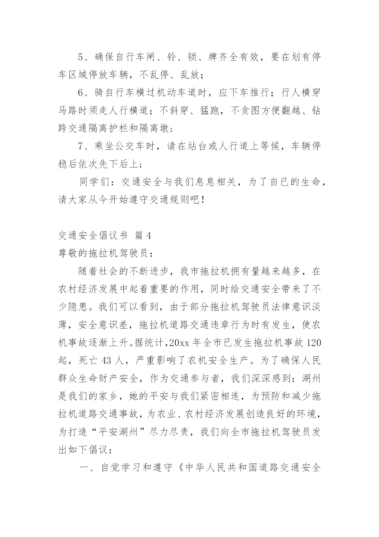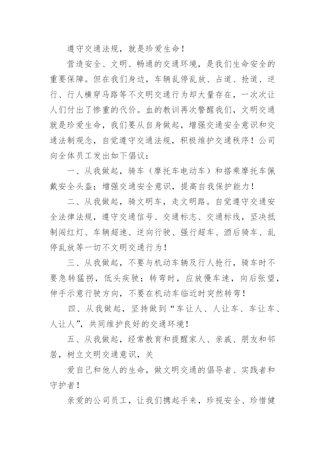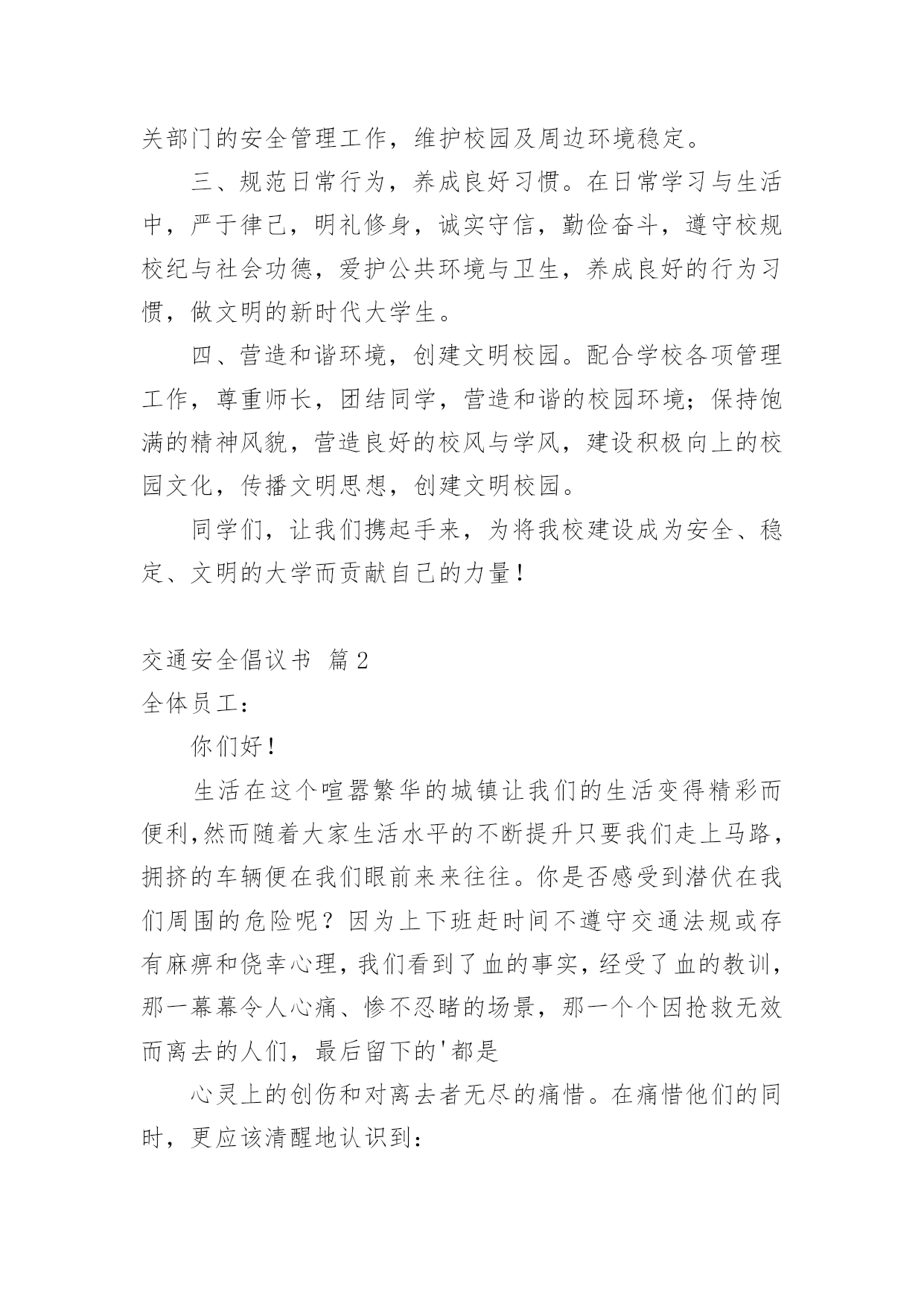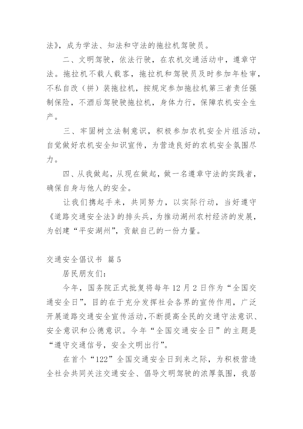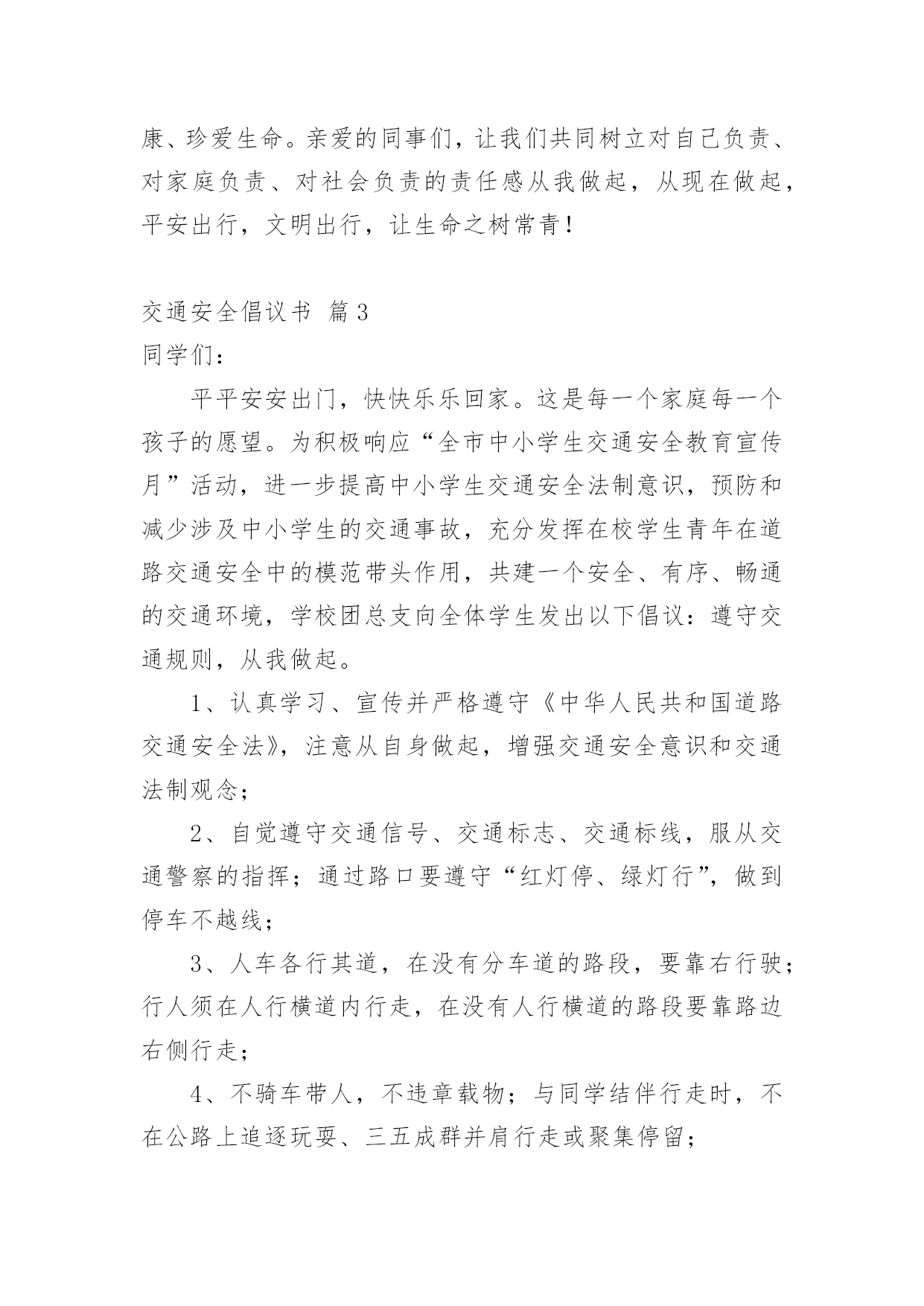 交通安全倡议书交通安全倡议书范文集合八篇在不断进步的时代,倡议书使用的情况越来越多,倡议书作为一种公开提议性的专用书信,其在写作上有一定的规范。那么一般倡议书是怎么写的呢?以下是小编整理的交通安全倡议书8篇,欢迎阅读与收藏。交通安全倡议书篇1亲爱的同学们:校园安全是我们学习生活的基本保障,校园文明是我们成长成才的有力保证。为了贯彻落实中央综治委、教育部、公安部《关于深入开展安全文明校园创建活动的意见》精神以及湖北省有关部门的《实施意见》,维护校园安全稳定,建设和谐文明校园,校团委、校学生会特向我校全体同学发出以下倡议:一、增强安全意识,重视安全防范。提高自我保护意识,注意人身及财产安全;学习安全知识,提高安全防范能力;重视安全防范,消除安全隐患;当人身、财产安全受到侵害时,及时向有关部门寻求救济。二、遵守校园秩序,维护校园稳定。严格遵守学校各项规章制度,维持良好的校园秩序;崇尚科学,提高觉悟,反对迷信,反对邪教,保持思想政治稳定;积极配合学校及相关部门的安全管理工作,维护校园及周边环境稳定。三、规范日常行为,养成良好习惯。在日常学习与生活中,严于律己,明礼修身,诚实守信,勤俭奋斗,遵守校规校纪与社会功德,爱护公共环境与卫生,养成良好的行为习惯,做文明的新时代大学生。四、营造和谐环境,创建文明校园。配合学校各项管理工作,尊重师长,团结同学,营造和谐的校园环境;保持饱满的精神风貌,营造良好的校风与学风,建设积极向上的校园文化,传播文明思想,创建文明校园。同学们,让我们携起手来,为将我校建设成为安全、稳定、文明的大学而贡献自己的力量!交通安全倡议书篇2全体员工:你们好!生活在这个喧嚣繁华的城镇让我们的生活变得精彩而便利,然而随着大家生活水平的不断提升只要我们走上马路,拥挤的车辆便在我们眼前来来往往。你是否感受到潜伏在我们周围的危险呢?因为上下班赶时间不遵守交通法规或存有麻痹和侥幸心理,我们看到了血的事实,经受了血的教训,那一幕幕令人心痛、惨不忍睹的场景,那一个个因抢救无效而离去的人们,最后留下的'都是心灵上的创伤和对离去者无尽的痛惜。在痛惜他们的同时,更应该清醒地认识到:遵守交通法规,就是珍爱生命!营造安全、文明、畅通的交通环境,是我们生命安全的重要保障。但在我们身边,车辆乱停乱放、占道、抢道、逆行、行人横穿马路等不文明交通行为却大量存在,一次次让人们付出了惨重的代价。血的教训再次警醒我们,文明交通就是珍爱生命,我们要从自身做起,增强交通安全意识和交通法制观念,自觉遵守交通法规,积极维护交通秩序!公司向全体员工发出如下倡议:一、从我做起,骑车(摩托车电动车)和搭乘摩托车佩戴安全头盔;增强交通安全意识,提高自我保护能力!二、从我做起,骑文明车,走文明路。自觉遵守交通安全法律法规,遵守交通信号、交通标志、交通标线,坚决抵制闯红灯、车辆超速、逆向行驶、强行超车、酒后骑车、乱停乱放等一切不文明交通行为!三、从我做起,不要与机动车辆及行人抢行,骑车时不要急转猛拐,低头疾驶;转弯时,应放慢车速,向后张望,伸手示意行驶方向,不要在机动车临近时突然转弯!四、从我做起,坚持做到“车让人、人让车、车让车、人让人”,共同维护良好的交通环境!五、从我做起,经常教育和提醒家人、亲戚、朋友和邻居,树立文明交通意识,关爱自己和他人的生命,做文明交通的倡导者、实践者和守护者!亲爱的公司员工,让我们携起手来,珍视安全、珍惜健康、珍爱生命。亲爱的同事们,让我们共同树立对自己负责、对家庭负责、对社会负责的责任感从我做起,从现在做起,平安出行,文明出行,让生命之树常青!交通安全倡议书篇3同学们:平平安安出门,快快乐乐回家。这是每一个家庭每一个孩子的愿望。为积极响应“全市中小学生交通安全教育宣传月”活动,进一步提高中小学生交通安全法制意识,预防和减少涉及中小学生的交通事故,充分发挥在校学生青年在道路交通安全中的模范带头作用,共建一个安全、有序、畅通的交通环境,学校团总支向全体学生发出以下倡议:遵守交通规则,从我做起。1、认真学习、宣传并严格遵守《中华人民共和国道路交通安全法》,注意从自身做起,增强交通安全意识和交通法制观念;2、自觉遵守交通信号、交通标志、交通标线,服从交通警察的指挥;通过路口要遵守“红灯停、绿灯行”,做到停车不越线;3、人车各行其道,在没有分车道的路段,要靠右行驶;行人须在人行横道内行走,在没有人行横道的路段要靠路边右侧行走;4、不骑车带人,不违章载物;与同学结伴行走时,不在公路上追逐玩耍、三五成群并肩行走或聚集停留;5、确保自行车闸、铃、锁、牌齐全有效,要在划有停车区域停放车辆,不乱停、乱放;6、骑自行车横过机动车道时,应下车推行;行人横穿马路时须走人行横道;不斜穿、猛跑,不贪图方便翻越、钻跨交通隔离护栏和隔离墩;7、乘坐公交车时,请在站台或人行道上