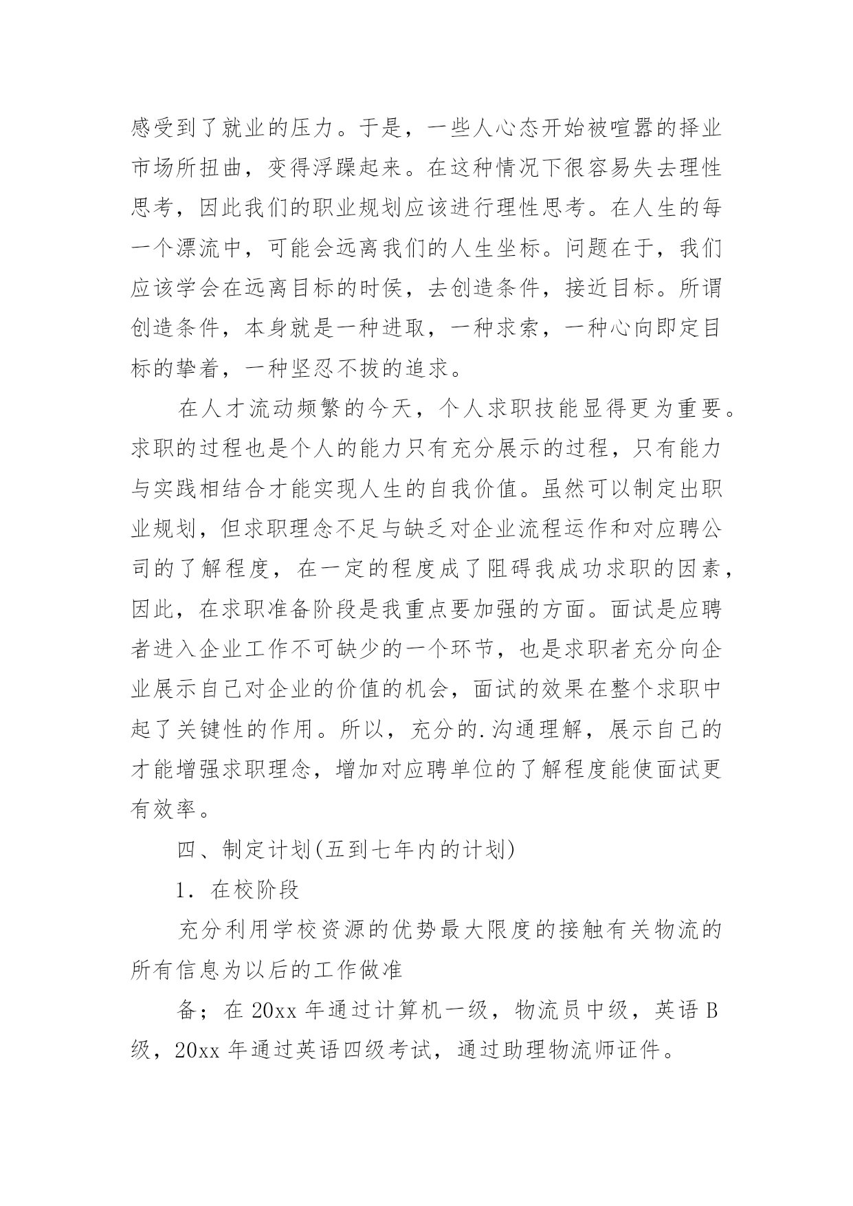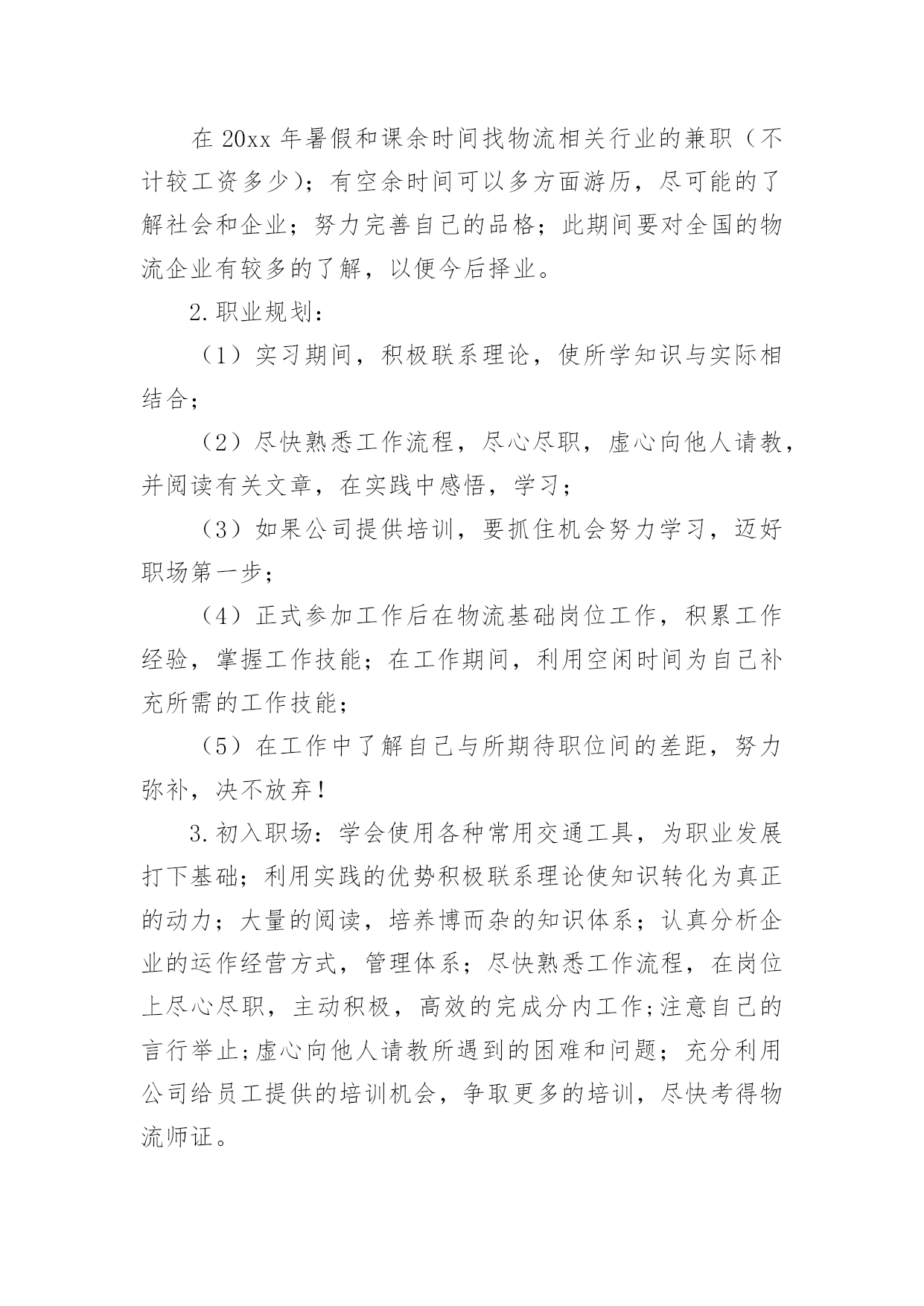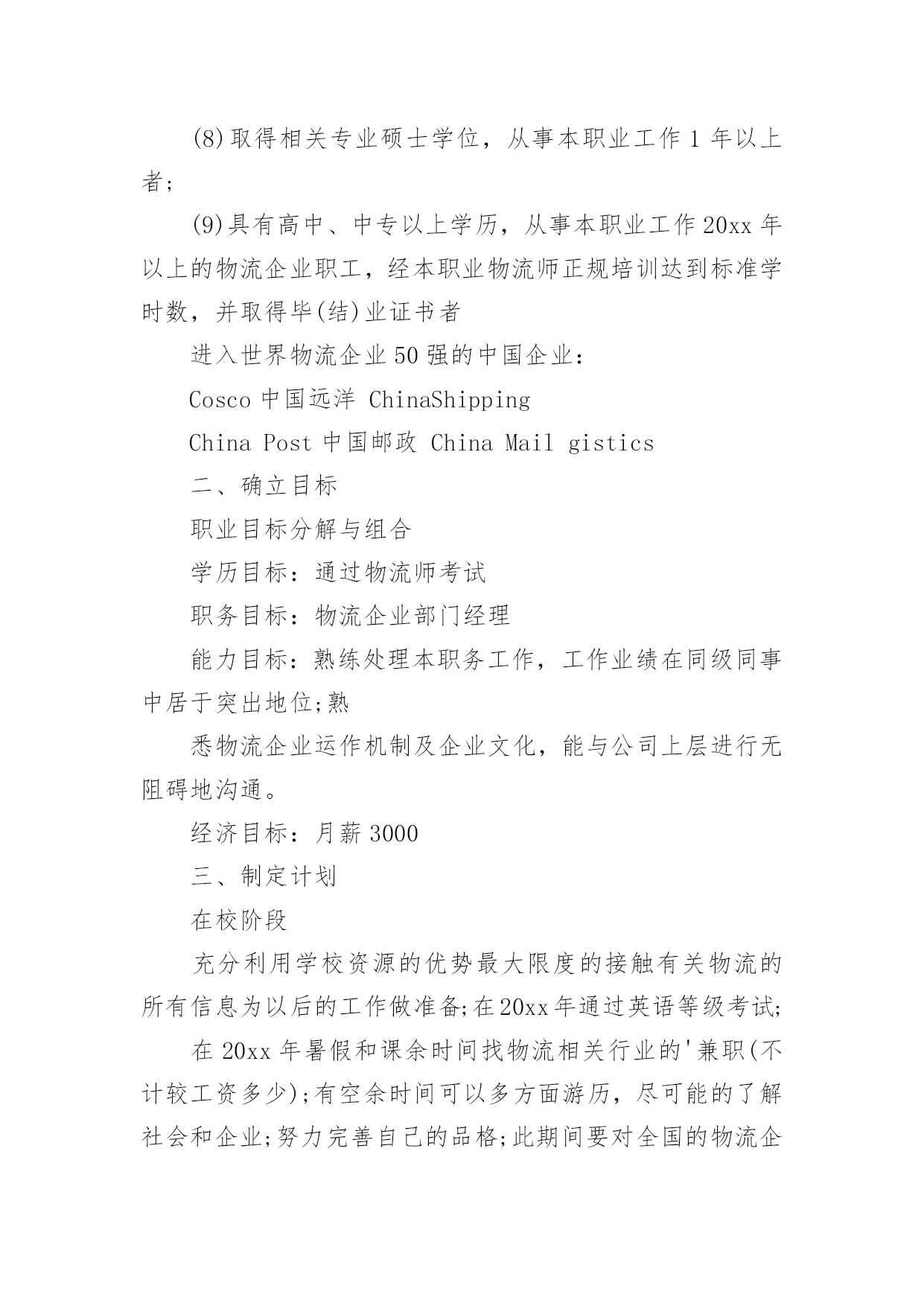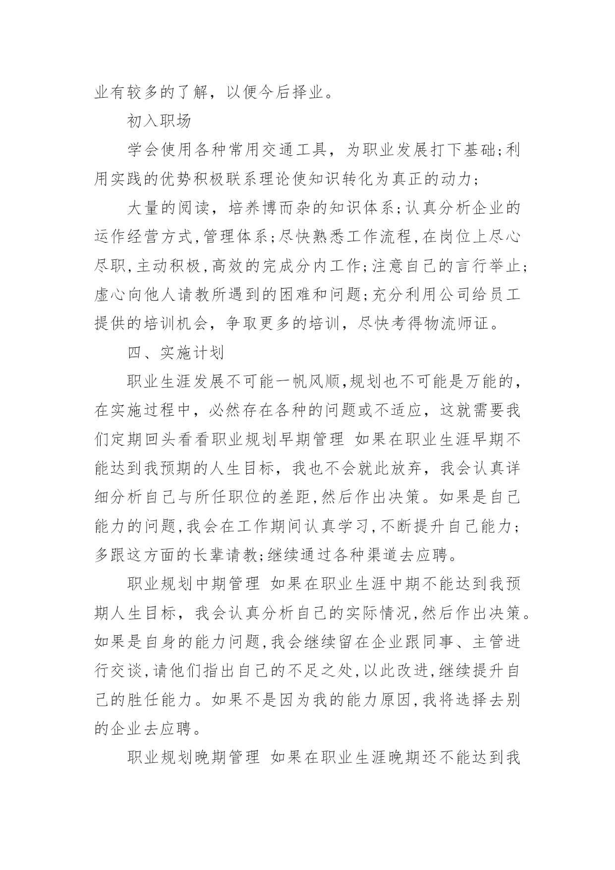 物流职业规划书物流职业规划书岁月流逝,流出一缕清泉,流出一阵芳香,工作了许久,你还记得当初的目标吗?该好好规划一下自己接下来的职业发展道路了。职业规划怎么写才能切实有效地帮助到自己将来的发展呢?以下是小编整理的物流职业规划书,欢迎阅读,希望大家能够喜欢。物流职业规划书1一、职业评价物流管理简介物流管理(LogisticsManagement)物流管理的定义:物流管理(LogisticsManagement)是指在社会再生产过程中,根据物质资料实体流动的规律,应用管理的基本原理和科学方法,对物流活动进行计划、组织、指挥、协调、控制和监督,使各项物流活动实现最佳的协调与配合,以降低物流成本,提高物流效率和经济效益。现代物流管理是建立在系统论、信息论和控制论的基础上的。物流管理主要有4个特点:(1)以实现客户满意为第一目标;(2)以企业整体最优为目的;(3)以信息为中心;(4)重效率更重效果。物流师(具备以下条件之一者)(1)取得本职业助理物流师职业资格证书后,连续从事本职业工作4年以上,经本职业物流师正规培训达到标准学时数,并取得毕(结)业证书者;(2)取得本职业助理物流师职业资格证书后,连续从事本职业工作5年以上者;(3)具有相关专业大专、高级技工学校以上学历,取得本职业助理物流师职业资格证书后,连续从事本职业工作3年以上或连续从事本职业工作2年以上经本职业物流师正规培训达到标准学时数,并取得毕(结)业证书者;(4)大学专科(含高级技校)以上相关专业学历,连续从事本职业工作6年以上,经本职业物流师正规培训达到标准学时数,并取得毕(结)业证书者;(5)大学专科(含高级技校)以上相关专业学历,连续从事本职业工作5年以上,担任物流企业中层管理工作1年以上,经本职业物流师正规培训达到标准学时数,并取得毕(结)业证书者;(6)大学本科以上相关专业学历,连续从事本职业工作3年以上,经本职业物流师正规培训达到标准学时数,并取得毕(结)业证书者;(7)大学本科以上相关专业学历,连续从事本职业工作5年以上者;(8)取得相关专业硕士学位,从事本职业工作1年以上者;(9)具有高中、中专以上学历,从事本职业工作20xx年以上的物流企业职工,经本职业物流师正规培训达到标准学时数,并取得毕(结)业证书者进入世界物流企业50强的中国企业:Cosco中国远洋ChinaShippingChinaPost中国邮政ChinaMailgistics二、确立目标职业目标分解与组合学历目标:通过物流师考试职务目标:物流企业部门经理能力目标:熟练处理本职务工作,工作业绩在同级同事中居于突出地位;熟悉物流企业运作机制及企业文化,能与公司上层进行无阻碍地沟通。经济目标:月薪3000三、制定计划在校阶段充分利用学校资源的优势最大限度的接触有关物流的所有信息为以后的工作做准备;在20xx年通过英语等级考试;在20xx年暑假和课余时间找物流相关行业的'兼职(不计较工资多少);有空余时间可以多方面游历,尽可能的了解社会和企业;努力完善自己的品格;此期间要对全国的物流企业有较多的了解,以便今后择业。初入职场学会使用各种常用交通工具,为职业发展打下基础;利用实践的优势积极联系理论使知识转化为真正的动力;大量的阅读,培养博而杂的知识体系;认真分析企业的运作经营方式,管理体系;尽快熟悉工作流程,在岗位上尽心尽职,主动积极,高效的完成分内工作;注意自己的言行举止;虚心向他人请教所遇到的困难和问题;充分利用公司给员工提供的培训机会,争取更多的培训,尽快考得物流师证。四、实施计划职业生涯发展不可能一帆风顺,规划也不可能是万能的,在实施过程中,必然存在各种的问题或不适应,这就需要我们定期回头看看职业规划早期管理如果在职业生涯早期不能达到我预期的人生目标,我也不会就此放弃,我会认真详细分析自己与所任职位的差距,然后作出决策。如果是自己能力的问题,我会在工作期间认真学习,不断提升自己能力;多跟这方面的长辈请教;继续通过各种渠道去应聘。职业规划中期管理如果在职业生涯中期不能达到我预期人生目标,我会认真分析自己的实际情况,然后作出决策。如果是自身的能力问题,我会继续留在企业跟同事、主管进行交谈,请他们指出自己的不足之处,以此改进,继续提升自己的胜任能力。如果不是因为我的能力原因,我将选择去别的企业去应聘。职业规划晚期管理如果在职业生涯晚期还不能达到我预期人生目标,我还是应该认真的分析问题的所在,如果是因为我本身不具备胜任这个职位的能力的话,我将考虑转行。五、评估成果目标的完成度如果我的职业生涯顺利的话,我会再接再厉。如果不能达到我预期的目标,我将考虑转行。调整目标现状与社会环境的分析在我竭尽全力也完成不了我所定的目标时,我会把眼光转移。中国政治稳定,经济持续发展。在全球经济一体化环境中演绎着重要的角色。经