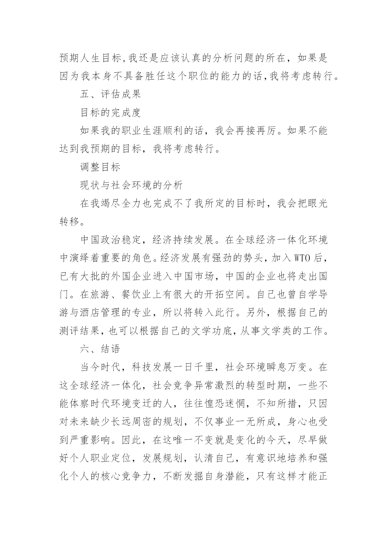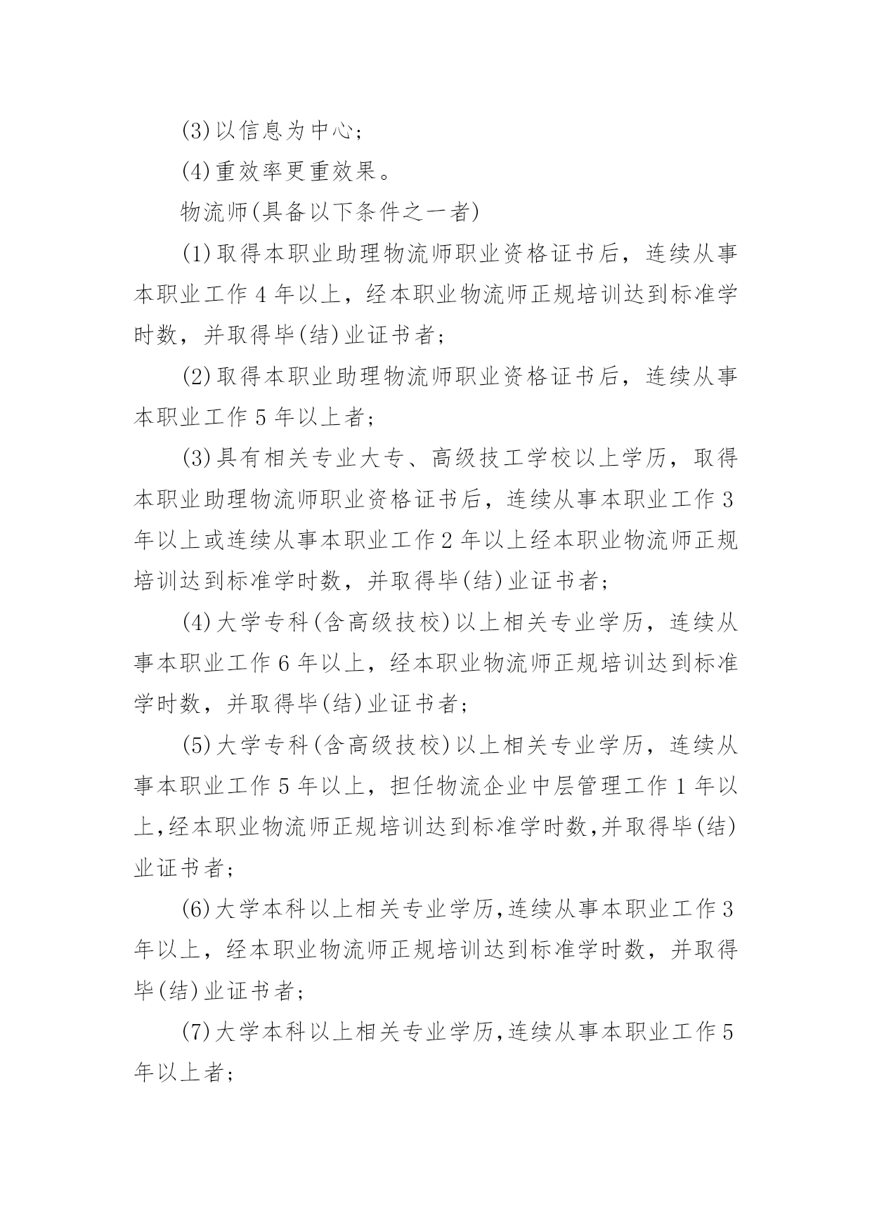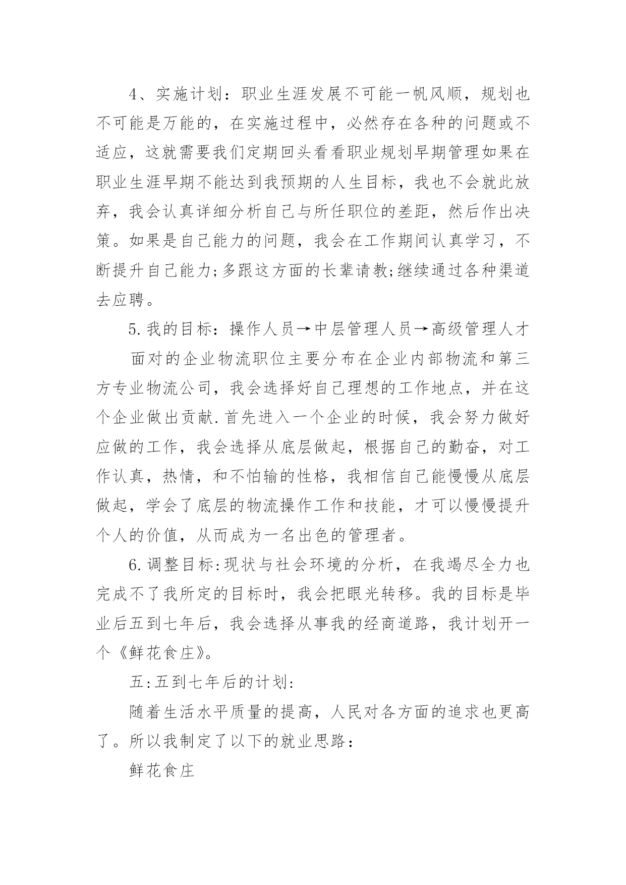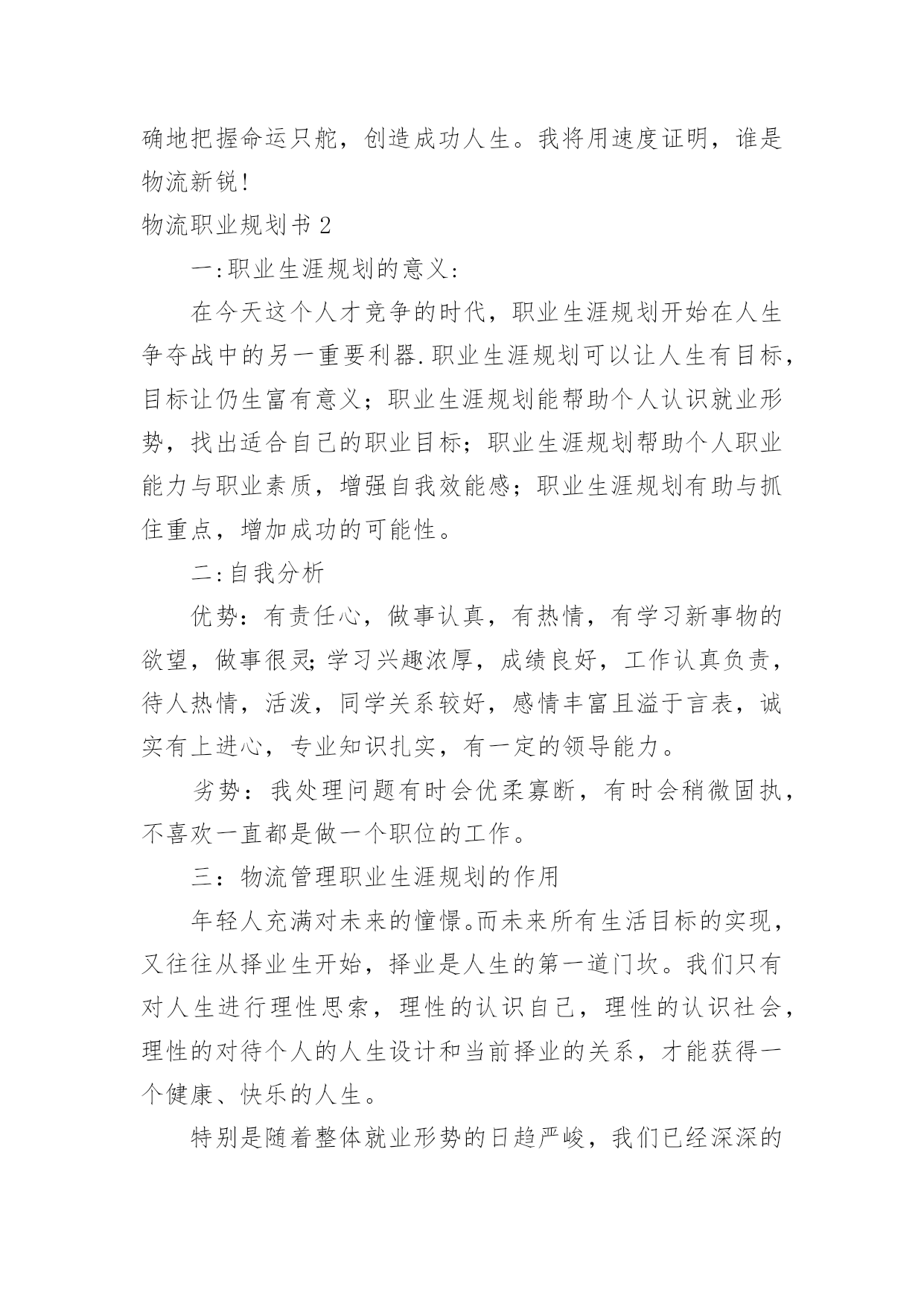 物流职业规划书物流职业规划书岁月流逝,流出一缕清泉,流出一阵芳香,工作了许久,你还记得当初的目标吗?该好好规划一下自己接下来的职业发展道路了。职业规划怎么写才能切实有效地帮助到自己将来的发展呢?以下是小编整理的物流职业规划书,欢迎阅读,希望大家能够喜欢。物流职业规划书1一、职业评价物流管理简介物流管理(LogisticsManagement)物流管理的定义:物流管理(LogisticsManagement)是指在社会再生产过程中,根据物质资料实体流动的规律,应用管理的基本原理和科学方法,对物流活动进行计划、组织、指挥、协调、控制和监督,使各项物流活动实现最佳的协调与配合,以降低物流成本,提高物流效率和经济效益。现代物流管理是建立在系统论、信息论和控制论的基础上的。物流管理主要有4个特点:(1)以实现客户满意为第一目标;(2)以企业整体最优为目的;(3)以信息为中心;(4)重效率更重效果。物流师(具备以下条件之一者)(1)取得本职业助理物流师职业资格证书后,连续从事本职业工作4年以上,经本职业物流师正规培训达到标准学时数,并取得毕(结)业证书者;(2)取得本职业助理物流师职业资格证书后,连续从事本职业工作5年以上者;(3)具有相关专业大专、高级技工学校以上学历,取得本职业助理物流师职业资格证书后,连续从事本职业工作3年以上或连续从事本职业工作2年以上经本职业物流师正规培训达到标准学时数,并取得毕(结)业证书者;(4)大学专科(含高级技校)以上相关专业学历,连续从事本职业工作6年以上,经本职业物流师正规培训达到标准学时数,并取得毕(结)业证书者;(5)大学专科(含高级技校)以上相关专业学历,连续从事本职业工作5年以上,担任物流企业中层管理工作1年以上,经本职业物流师正规培训达到标准学时数,并取得毕(结)业证书者;(6)大学本科以上相关专业学历,连续从事本职业工作3年以上,经本职业物流师正规培训达到标准学时数,并取得毕(结)业证书者;(7)大学本科以上相关专业学历,连续从事本职业工作5年以上者;(8)取得相关专业硕士学位,从事本职业工作1年以上者;(9)具有高中、中专以上学历,从事本职业工作20xx年以上的物流企业职工,经本职业物流师正规培训达到标准学时数,并取得毕(结)业证书者进入世界物流企业50强的中国企业:Cosco中国远洋ChinaShippingChinaPost中国邮政ChinaMailgistics二、确立目标职业目标分解与组合学历目标:通过物流师考试职务目标:物流企业部门经理能力目标:熟练处理本职务工作,工作业绩在同级同事中居于突出地位;熟悉物流企业运作机制及企业文化,能与公司上层进行无阻碍地沟通。经济目标:月薪3000三、制定计划在校阶段充分利用学校资源的优势最大限度的接触有关物流的所有信息为以后的工作做准备;在20xx年通过英语等级考试;在20xx年暑假和课余时间找物流相关行业的'兼职(不计较工资多少);有空余时间可以多方面游历,尽可能的了解社会和企业;努力完善自己的品格;此期间要对全国的物流企业有较多的了解,以便今后择业。初入职场学会使用各种常用交通工具,为职业发展打下基础;利用实践的优势积极联系理论使知识转化为真正的动力;大量的阅读,培养博而杂的知识体系;认真分析企业的运作经营方式,管理体系;尽快熟悉工作流程,在岗位上尽心尽职,主动积极,高效的完成分内工作;注意自己的言行举止;虚心向他人请教所遇到的困难和问题;充分利用公司给员工提供的培训机会,争取更多的培训,尽快考得物流师证。四、实施计划职业生涯发展不可能一帆风顺,规划也不可能是万能的,在实施过程中,必然存在各种的问题或不适应,这就需要我们定期回头看看职业规划早期管理如果在职业生涯早期不能达到我预期的人生目标,我也不会就此放弃,我会认真详细分析自己与所任职位的差距,然后作出决策。如果是自己能力的问题,我会在工作期间认真学习,不断提升自己能力;多跟这方面的长辈请教;继续通过各种渠道去应聘。职业规划中期管理如果在职业生涯中期不能达到我预期人生目标,我会认真分析自己的实际情况,然后作出决策。如果是自身的能力问题,我会继续留在企业跟同事、主管进行交谈,请他们指出自己的不足之处,以此改进,继续提升自己的胜任能力。如果不是因为我的能力原因,我将选择去别的企业去应聘。职业规划晚期管理如果在职业生涯晚期还不能达到我预期人生目标,我还是应该认真的分析问题的所在,如果是因为我本身不具备胜任这个职位的能力的话,我将考虑转行。五、评估成果目标的完成度如果我的职业生涯顺利的话,我会再接再厉。如果不能达到我预期的目标,我将考虑转行。调整目标现状与社会环境的分析在我竭尽全力也完成不了我所定的目标时,我会把眼光转移。中国政治稳定,经济持续发展。在全球经济一体化环境中演绎着重要的角色。经