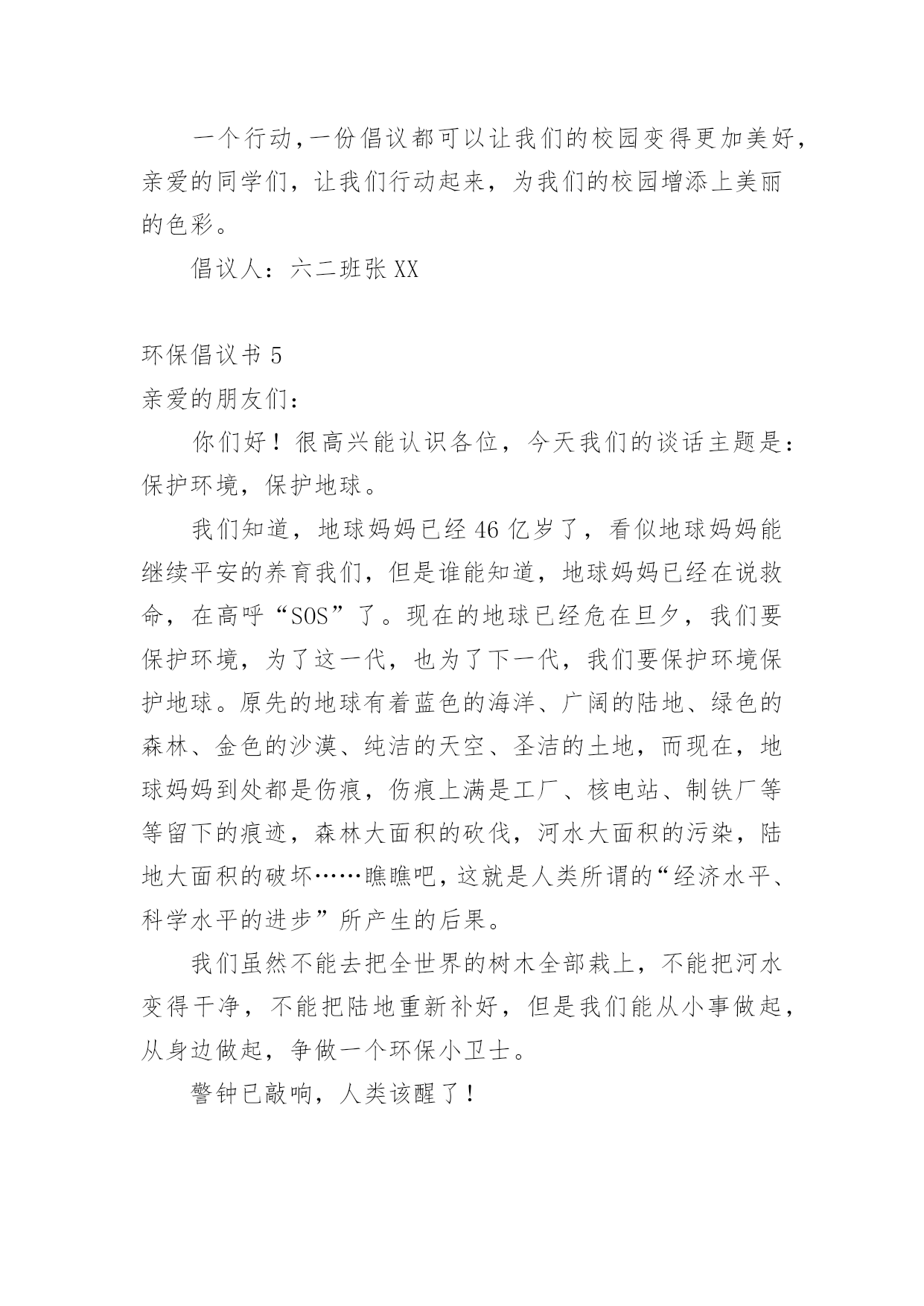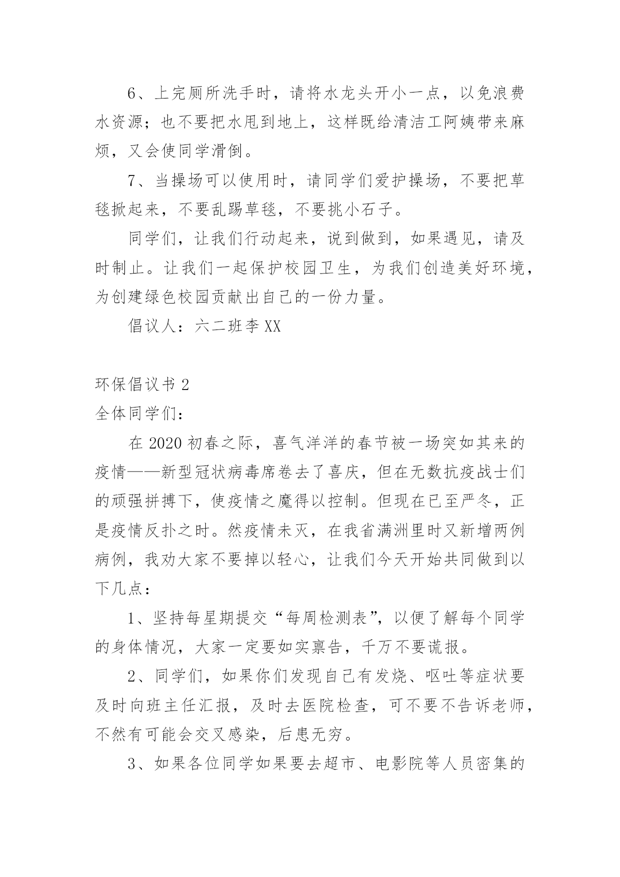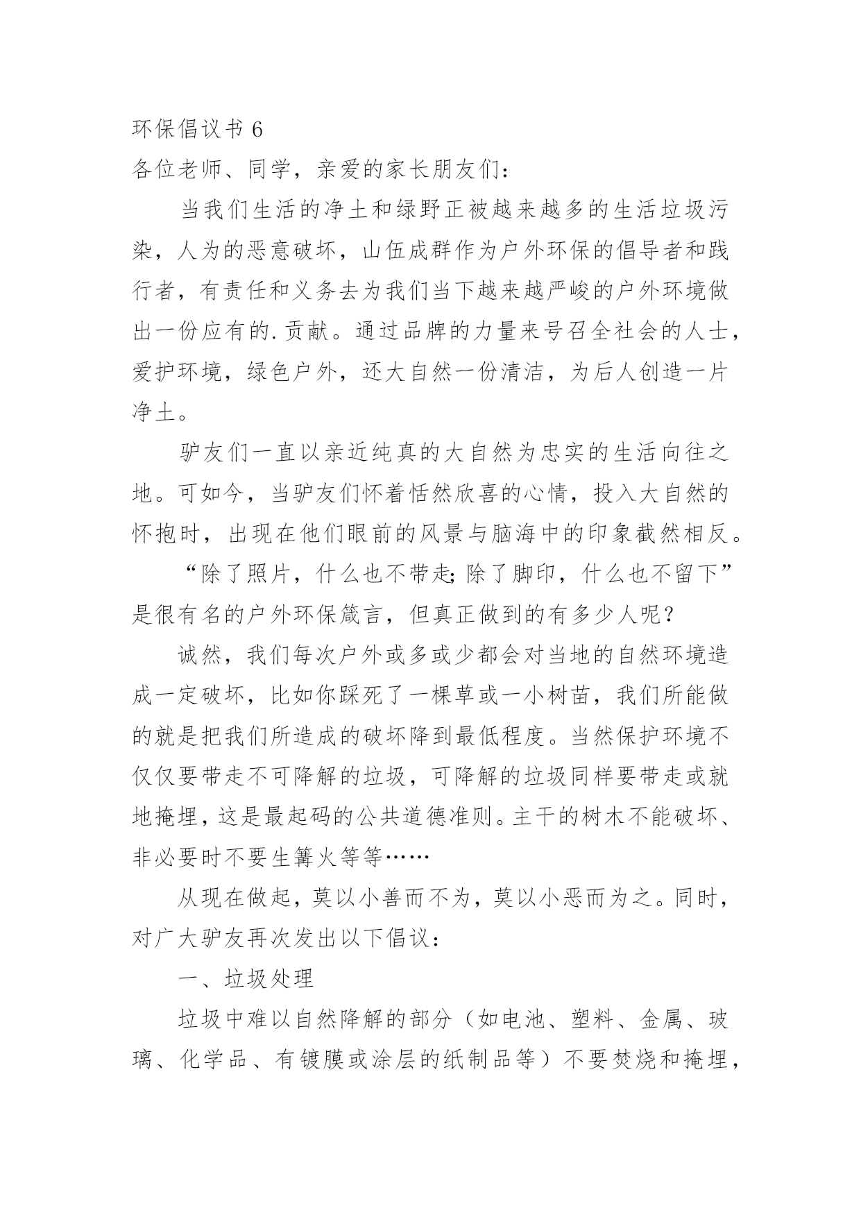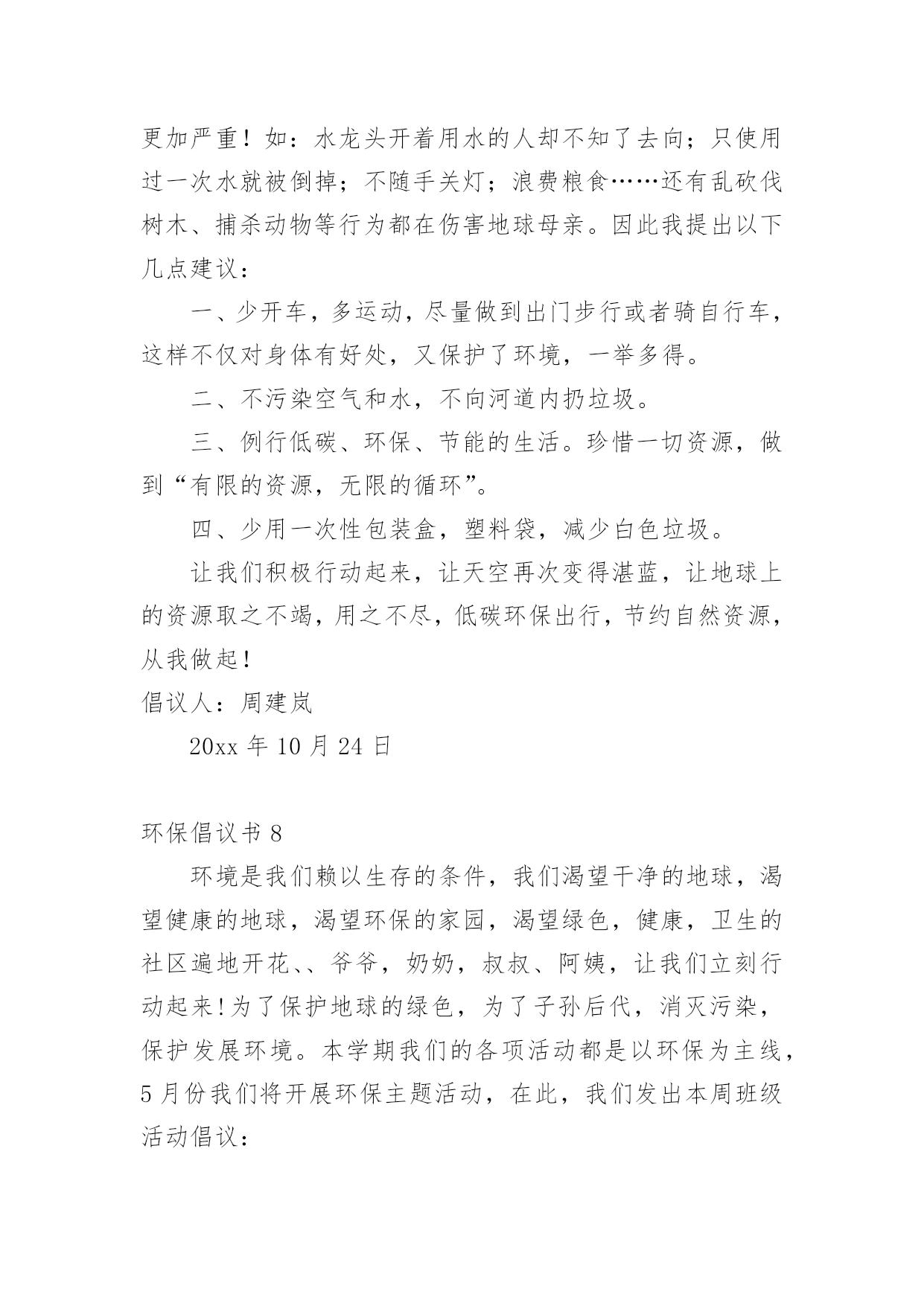 环保倡议书环保倡议书集锦15篇在现在社会,需要使用倡议书的事情愈发增多,倡议书具有公开性的特征,是一种广而告之的书信。你所见过的倡议书是什么样的呢?下面是小编帮大家整理的环保倡议书,仅供参考,希望能够帮助到大家。环保倡议书1同学们:学校是我们学习的地方,学校为了给我们创造舒适整洁的学习环境,为我们搭建了综合楼,重建了操场,铺上了悬浮地板,为了使学校环境整洁大方,在这里我向全校同学们倡议,让我们从今天开始做到以下几点:1、在悬浮地板上不要涂画,不要用锋利的东西刻画;不要在上面撒水,容易结冰;不要在上面糊彩泥等软绵绵的洗不掉的东西。2、在学校里不要吃零食,不要带早餐进校吃,不要在校园内乱扔垃圾,见到垃圾及时捡起来。3、在新综合楼内不要拥挤、跑跳,要轻声慢步过走廊。4、使用新厕所时要及时冲刷干净,保持厕所卫生干净。如果低年级小朋友摁按不动,可以请高年级同学或清洁工阿姨帮忙。5、不要往厕所便池内扔石子、树枝树叶等杂物。6、上完厕所洗手时,请将水龙头开小一点,以免浪费水资源;也不要把水甩到地上,这样既给清洁工阿姨带来麻烦,又会使同学滑倒。7、当操场可以使用时,请同学们爱护操场,不要把草毯掀起来,不要乱踢草毯,不要挑小石子。同学们,让我们行动起来,说到做到,如果遇见,请及时制止。让我们一起保护校园卫生,为我们创造美好环境,为创建绿色校园贡献出自己的一份力量。倡议人:六二班李XX环保倡议书2全体同学们:在2020初春之际,喜气洋洋的春节被一场突如其来的疫情——新型冠状病毒席卷去了喜庆,但在无数抗疫战士们的顽强拼搏下,使疫情之魔得以控制。但现在已至严冬,正是疫情反扑之时。然疫情未灭,在我省满洲里时又新增两例病例,我劝大家不要掉以轻心,让我们今天开始共同做到以下几点:1、坚持每星期提交“每周检测表”,以便了解每个同学的身体情况,大家一定要如实禀告,千万不要谎报。2、同学们,如果你们发现自己有发烧、呕吐等症状要及时向班主任汇报,及时去医院检查,可不要不告诉老师,不然有可能会交叉感染,后患无穷。3、如果各位同学如果要去超市、电影院等人员密集的地方,请务必带上口罩,尽量避免与人员接触,就算是谈话交流,也应与人员保持1。5米距离。4、如果要去外地返回时,请进行核酸检测以及隔离观察,要时刻牢记哦。同学们倡议与履行是两个密不可分的行为,让我们遵守承诺,认真履行。在我们的共同努力下。疫情之魔定将消灭!倡议人:六二班李XX环保倡议书3公司各单位、全体职工:良好的生态环境是人类社会持续发展的基础,是我们每个人耐以生存最基本的需求。为缓解市县冬防期大气污染防治压力,使我们的家园更加靓丽、生活更加幸福、环境更加美好,特向各单位及全体职工倡议:一、争做“低碳环保、绿色出行”的宣传者。低碳生活,无处不在,各单位要进一步加强低碳知识的学习和宣传,提高低碳意识,树立低碳理念,倡导低碳生活。广大职工要深入宣传“低碳环保”的意义和方式,带动更多的人参与到行动中来,为保卫蓝天多贡献一份力量。二、争做“低碳环保、绿色出行”的践行者。倡导新风,从我做起,公司各单位要尽量减少公务用车,能合并用车的尽量拼车出行或乘坐公共交通工具出行。广大职工上下班尽量不开私家车,尽可能采用步行、单车等低碳方式出行。我们生活在同一片蓝天下,呼吸着同样的空气,为了我们的健康,为了我们的家园更加美好,让我们一起行动起来,从我做起,从现在做起,秉承低碳环保,选择绿色出行、环保出行。xx20xx年xx月xx日环保倡议书4同学们:我校内部已经铺设了悬浮地板,这是学校自行购买的,为了美化校园,给同学们一个舒适的活动空间,消耗了人力、物力,只为了让我们有一个好的学习环境,然而有些同学却不爱惜,随意破坏、抠起悬浮地板。校园是我们学习的乐园,玩耍的天地,我们在快乐玩耍时,要爱护我们的悬浮地板,否则过不了多久,悬浮地板就会残破不堪。在这里我想呼吁大家积极地做到以下几点:1、在打扫环境卫生时或玩耍时,尽量不要使用铁制工具或尖锐的物品,以免留下划痕,2、在玩耍时,请不要因为好玩儿而抠起悬浮地板,或用坚硬的物体敲打悬浮地板。3、尽量不要在学校喝饮料或吃泡泡糖,因为饮料洒在悬浮地板上,或将泡泡糖吐在悬浮地板上,会让地板变得粘黏。4、当看到破坏悬浮地板的行为应当及时制止,并劝说其改正。一个行动,一份倡议都可以让我们的校园变得更加美好,亲爱的同学们,让我们行动起来,为我们的校园增添上美丽的色彩。倡议人:六二班张XX环保倡议书5亲爱的朋友们:你们好!很高兴能认识各位,今天我们的谈话主题是:保护环境,保护地球。我们知道,地球妈妈已经46亿岁了,看似地球妈妈能继续平安的养育我们,但是谁能知道,地球妈妈已经在说救命,在高呼“SOS”了。现在的地球已经危在旦夕,我们要保护环境,为了这一代,也为了下一代,我们要保护环境保护地球。原先的地球有着蓝