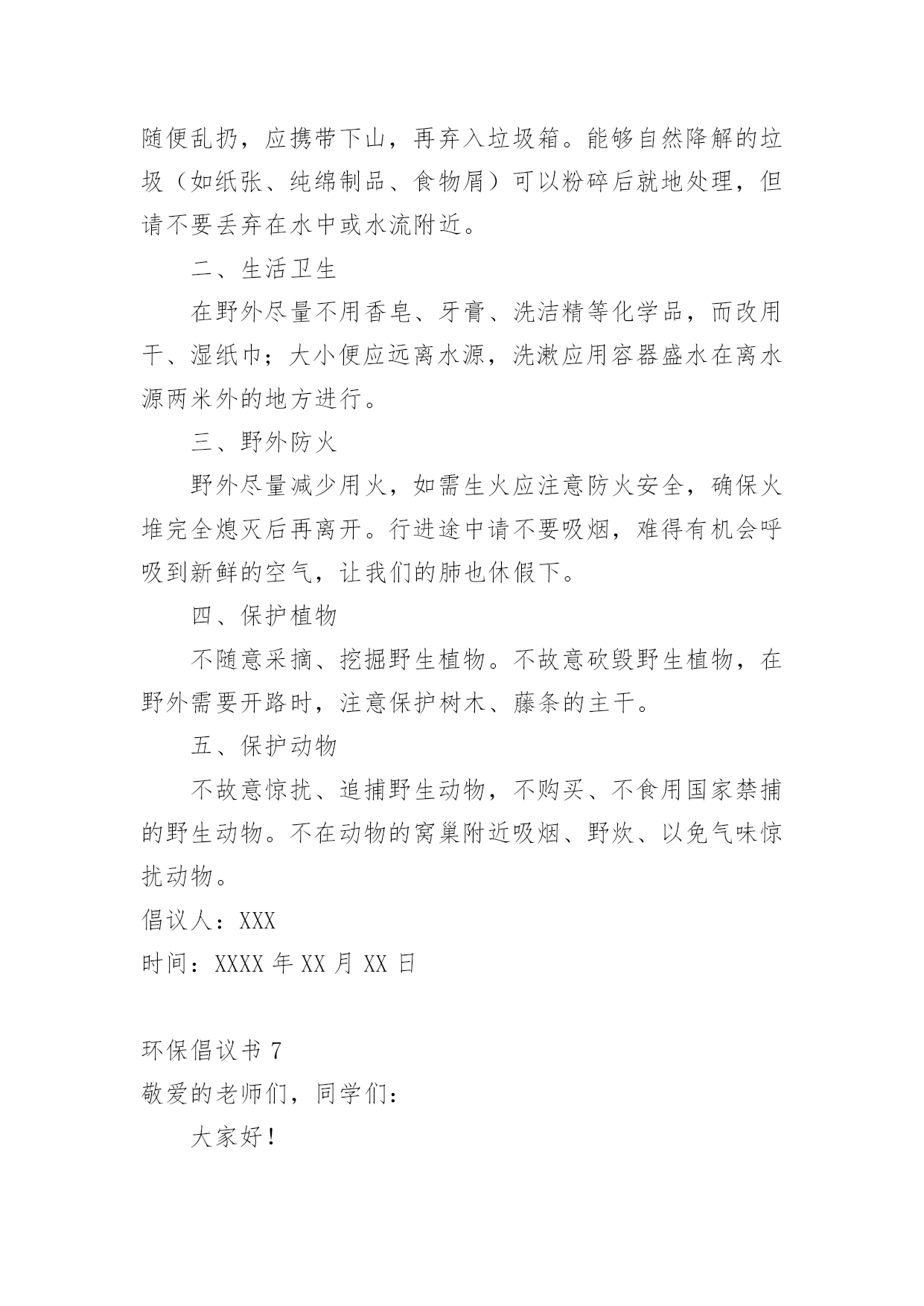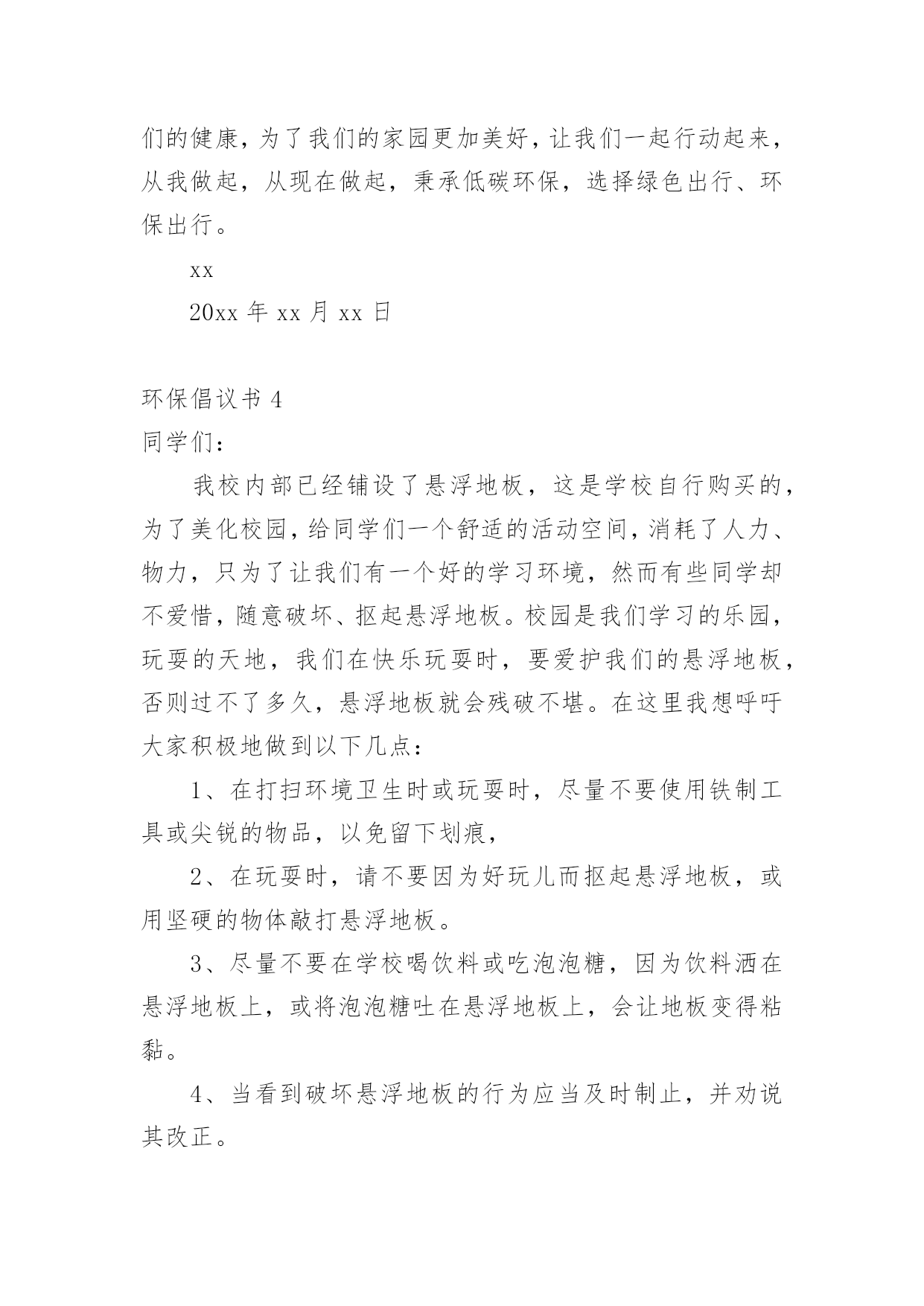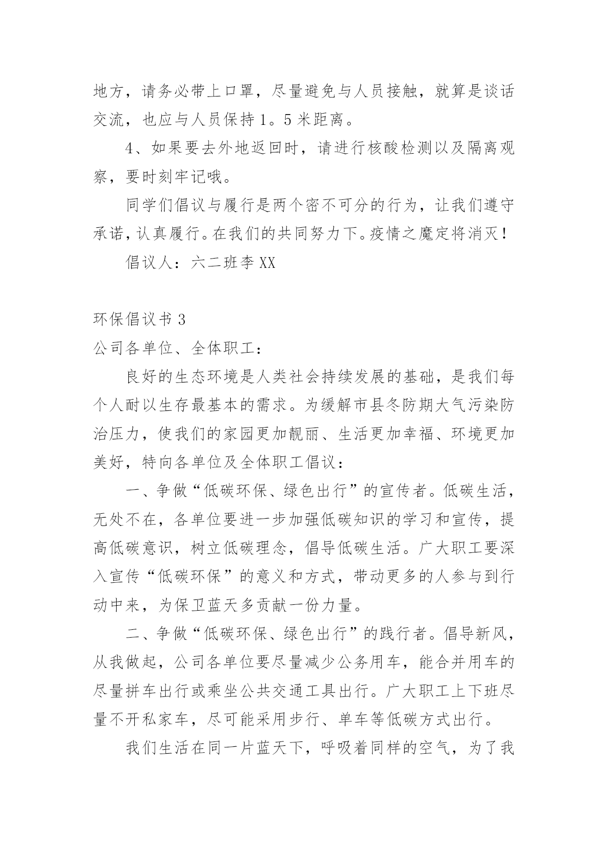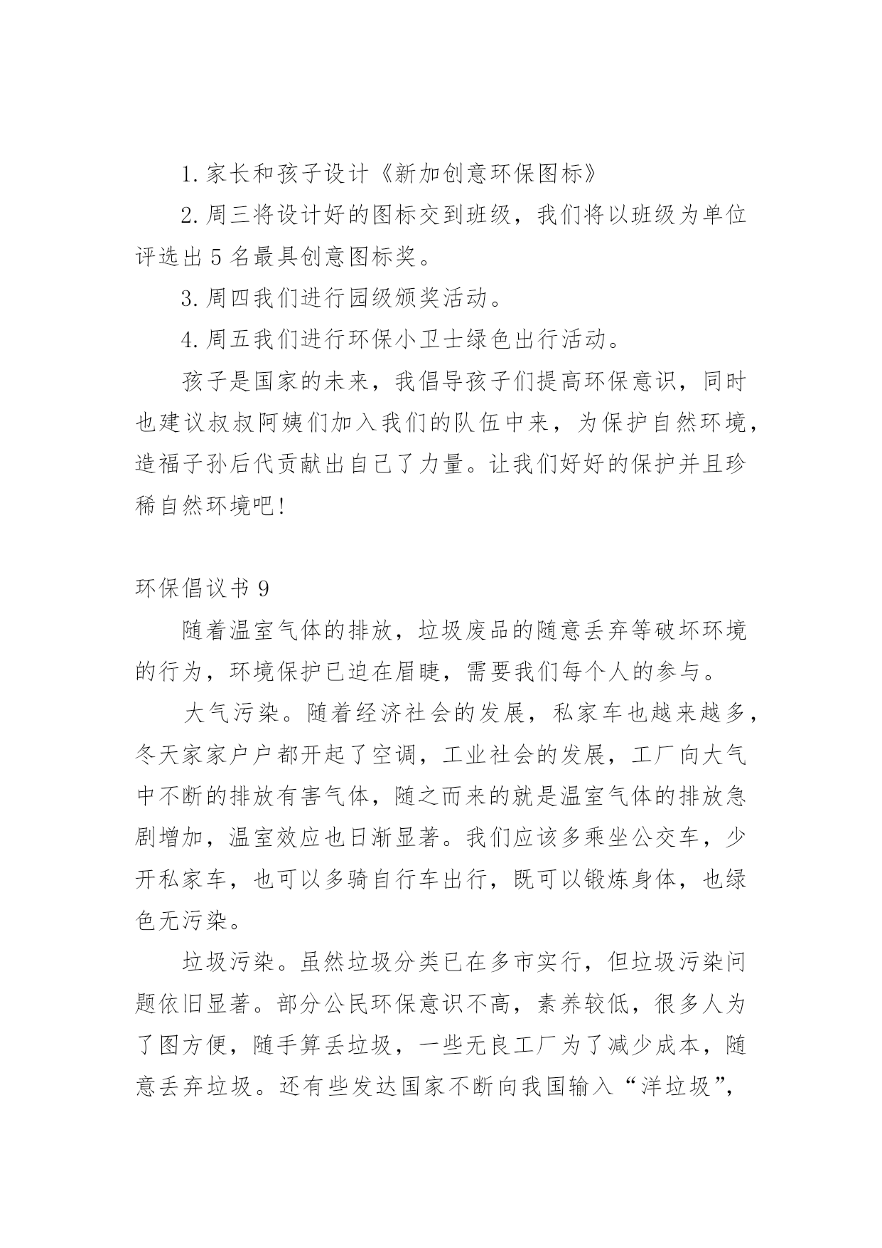 环保倡议书环保倡议书集锦15篇在现在社会,需要使用倡议书的事情愈发增多,倡议书具有公开性的特征,是一种广而告之的书信。你所见过的倡议书是什么样的呢?下面是小编帮大家整理的环保倡议书,仅供参考,希望能够帮助到大家。环保倡议书1同学们:学校是我们学习的地方,学校为了给我们创造舒适整洁的学习环境,为我们搭建了综合楼,重建了操场,铺上了悬浮地板,为了使学校环境整洁大方,在这里我向全校同学们倡议,让我们从今天开始做到以下几点:1、在悬浮地板上不要涂画,不要用锋利的东西刻画;不要在上面撒水,容易结冰;不要在上面糊彩泥等软绵绵的洗不掉的东西。2、在学校里不要吃零食,不要带早餐进校吃,不要在校园内乱扔垃圾,见到垃圾及时捡起来。3、在新综合楼内不要拥挤、跑跳,要轻声慢步过走廊。4、使用新厕所时要及时冲刷干净,保持厕所卫生干净。如果低年级小朋友摁按不动,可以请高年级同学或清洁工阿姨帮忙。5、不要往厕所便池内扔石子、树枝树叶等杂物。6、上完厕所洗手时,请将水龙头开小一点,以免浪费水资源;也不要把水甩到地上,这样既给清洁工阿姨带来麻烦,又会使同学滑倒。7、当操场可以使用时,请同学们爱护操场,不要把草毯掀起来,不要乱踢草毯,不要挑小石子。同学们,让我们行动起来,说到做到,如果遇见,请及时制止。让我们一起保护校园卫生,为我们创造美好环境,为创建绿色校园贡献出自己的一份力量。倡议人:六二班李XX环保倡议书2全体同学们:在2020初春之际,喜气洋洋的春节被一场突如其来的疫情——新型冠状病毒席卷去了喜庆,但在无数抗疫战士们的顽强拼搏下,使疫情之魔得以控制。但现在已至严冬,正是疫情反扑之时。然疫情未灭,在我省满洲里时又新增两例病例,我劝大家不要掉以轻心,让我们今天开始共同做到以下几点:1、坚持每星期提交“每周检测表”,以便了解每个同学的身体情况,大家一定要如实禀告,千万不要谎报。2、同学们,如果你们发现自己有发烧、呕吐等症状要及时向班主任汇报,及时去医院检查,可不要不告诉老师,不然有可能会交叉感染,后患无穷。3、如果各位同学如果要去超市、电影院等人员密集的地方,请务必带上口罩,尽量避免与人员接触,就算是谈话交流,也应与人员保持1。5米距离。4、如果要去外地返回时,请进行核酸检测以及隔离观察,要时刻牢记哦。同学们倡议与履行是两个密不可分的行为,让我们遵守承诺,认真履行。在我们的共同努力下。疫情之魔定将消灭!倡议人:六二班李XX环保倡议书3公司各单位、全体职工:良好的生态环境是人类社会持续发展的基础,是我们每个人耐以生存最基本的需求。为缓解市县冬防期大气污染防治压力,使我们的家园更加靓丽、生活更加幸福、环境更加美好,特向各单位及全体职工倡议:一、争做“低碳环保、绿色出行”的宣传者。低碳生活,无处不在,各单位要进一步加强低碳知识的学习和宣传,提高低碳意识,树立低碳理念,倡导低碳生活。广大职工要深入宣传“低碳环保”的意义和方式,带动更多的人参与到行动中来,为保卫蓝天多贡献一份力量。二、争做“低碳环保、绿色出行”的践行者。倡导新风,从我做起,公司各单位要尽量减少公务用车,能合并用车的尽量拼车出行或乘坐公共交通工具出行。广大职工上下班尽量不开私家车,尽可能采用步行、单车等低碳方式出行。我们生活在同一片蓝天下,呼吸着同样的空气,为了我们的健康,为了我们的家园更加美好,让我们一起行动起来,从我做起,从现在做起,秉承低碳环保,选择绿色出行、环保出行。xx20xx年xx月xx日环保倡议书4同学们:我校内部已经铺设了悬浮地板,这是学校自行购买的,为了美化校园,给同学们一个舒适的活动空间,消耗了人力、物力,只为了让我们有一个好的学习环境,然而有些同学却不爱惜,随意破坏、抠起悬浮地板。校园是我们学习的乐园,玩耍的天地,我们在快乐玩耍时,要爱护我们的悬浮地板,否则过不了多久,悬浮地板就会残破不堪。在这里我想呼吁大家积极地做到以下几点:1、在打扫环境卫生时或玩耍时,尽量不要使用铁制工具或尖锐的物品,以免留下划痕,2、在玩耍时,请不要因为好玩儿而抠起悬浮地板,或用坚硬的物体敲打悬浮地板。3、尽量不要在学校喝饮料或吃泡泡糖,因为饮料洒在悬浮地板上,或将泡泡糖吐在悬浮地板上,会让地板变得粘黏。4、当看到破坏悬浮地板的行为应当及时制止,并劝说其改正。一个行动,一份倡议都可以让我们的校园变得更加美好,亲爱的同学们,让我们行动起来,为我们的校园增添上美丽的色彩。倡议人:六二班张XX环保倡议书5亲爱的朋友们:你们好!很高兴能认识各位,今天我们的谈话主题是:保护环境,保护地球。我们知道,地球妈妈已经46亿岁了,看似地球妈妈能继续平安的养育我们,但是谁能知道,地球妈妈已经在说救命,在高呼“SOS”了。现在的地球已经危在旦夕,我们要保护环境,为了这一代,也为了下一代,我们要保护环境保护地球。原先的地球有着蓝