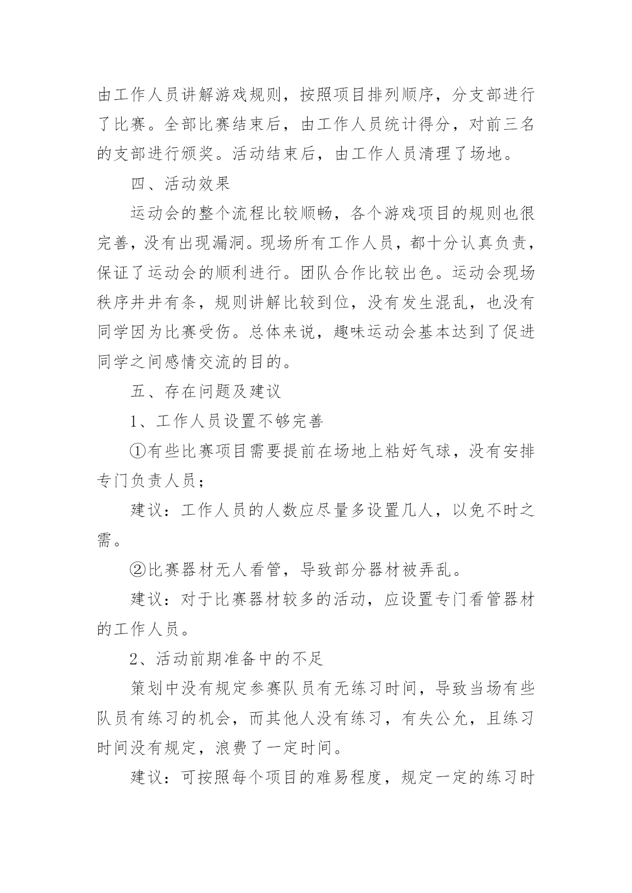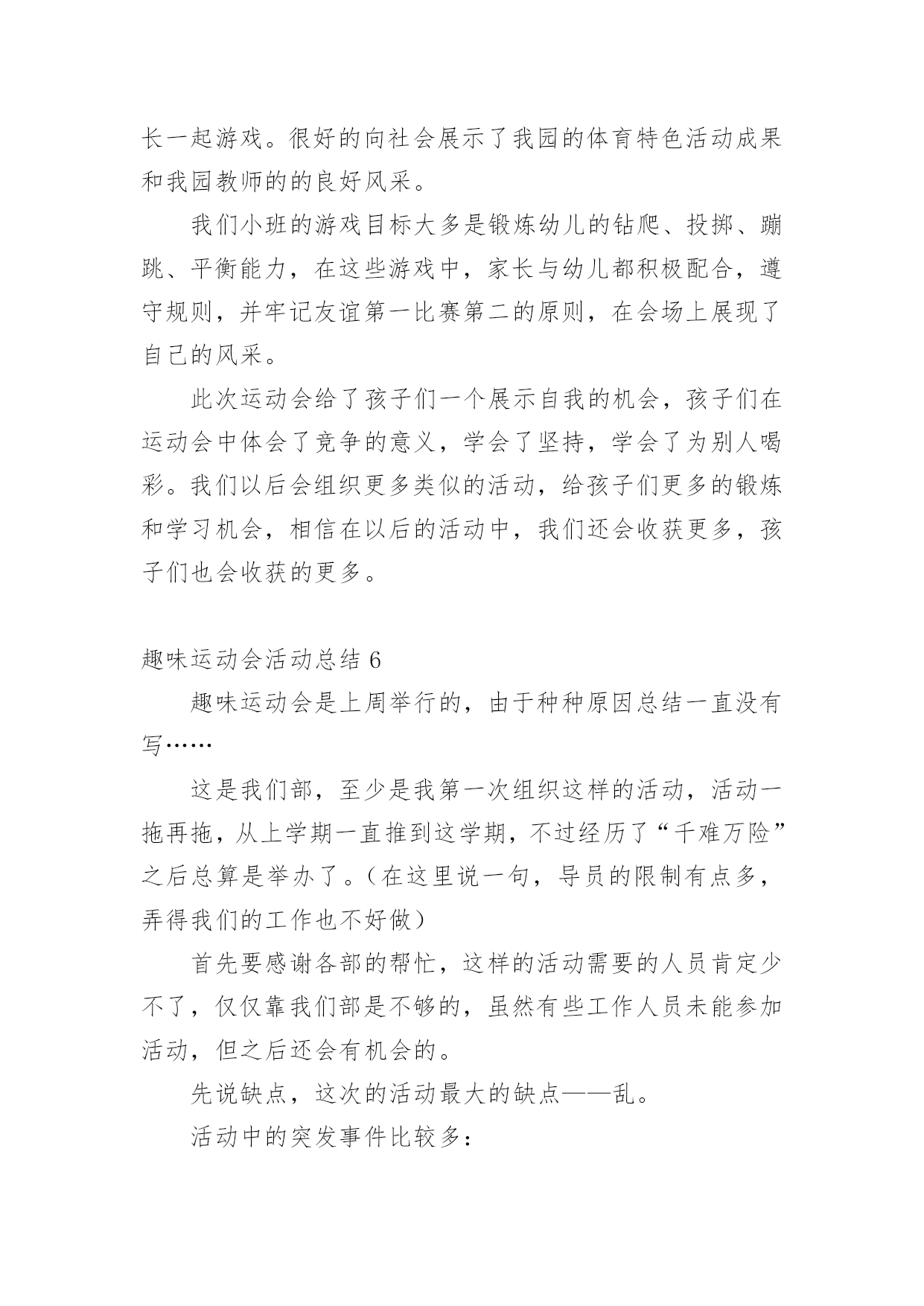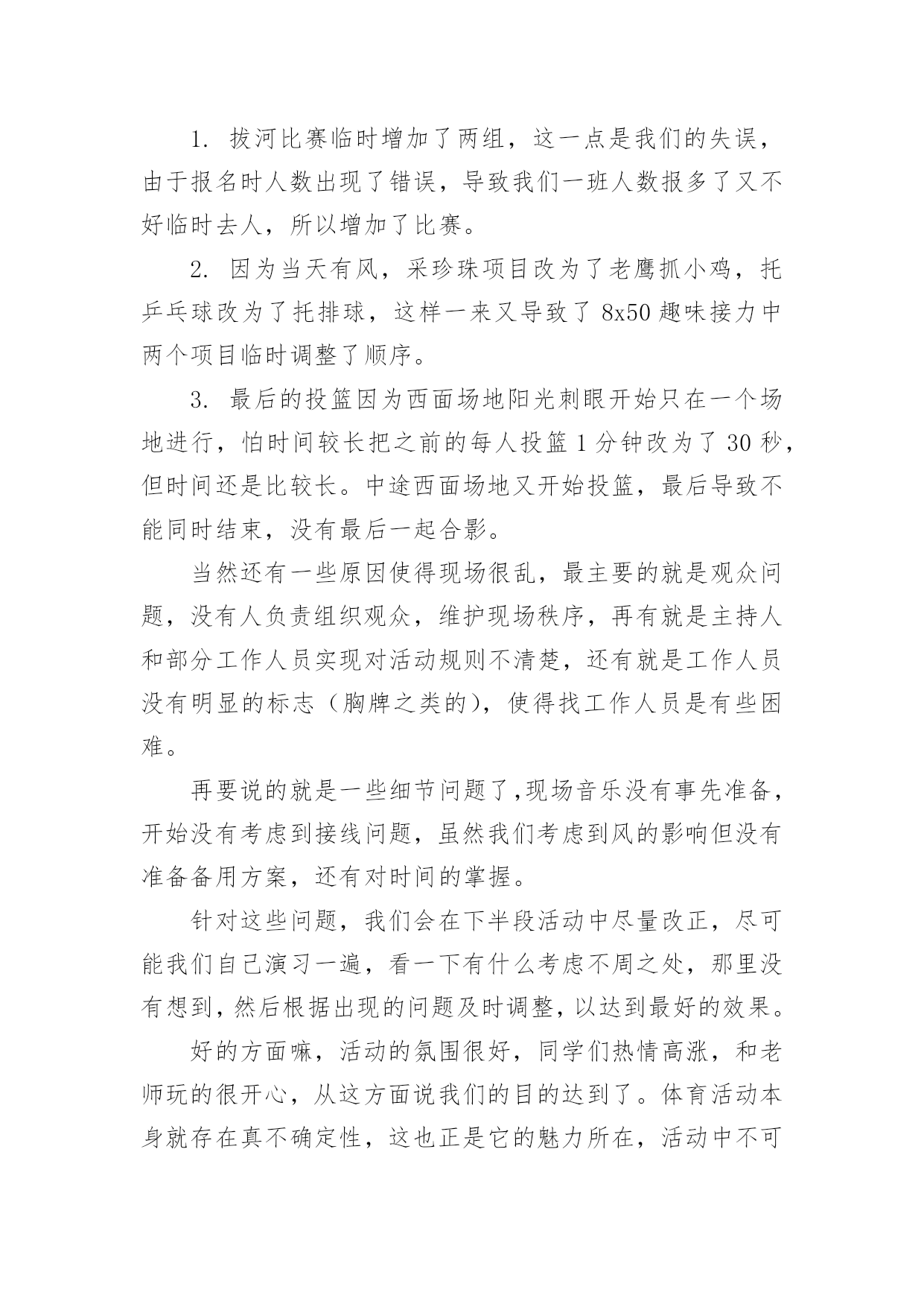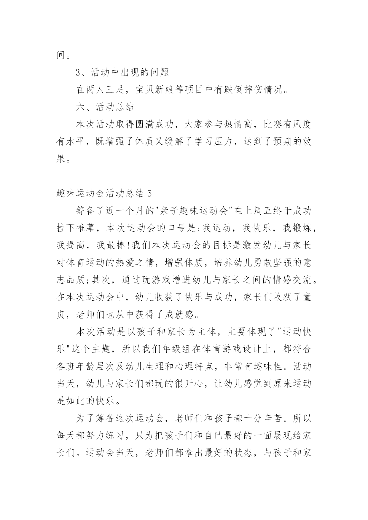 趣味运动会活动总结总结是事后对某一阶段的学习或工作情况作加以回顾检查并分析评价的书面材料,它可以有效锻炼我们的语言组织能力,不妨坐下来好好写写总结吧。如何把总结做到重点突出呢?下面是小编为大家收集的趣味运动会活动总结,欢迎阅读,希望大家能够喜欢。趣味运动会活动总结1为了活跃教职工的业余文化生活,充实学校活动内容,增强教职工身体素质,推动学校体育工作发展,我校于4月底在潍坊中学体育场同学生运动会一并举行了4×100米男女混合接力赛,5月初在学校操场举行了25米往返9人团体跳绳跑和自行车慢骑比赛。4×100米接力比赛中,每位参赛者奋力拼搏,使出全身力气,显出了专业运动员的气质。王金花老师巾帼不让须眉,把其他的教师甩在了身后,成为全场的焦点。25米往返9人团体跳绳跑比赛中,工会一组的老师配合默契,在整个比赛过程中没有出现一点失误,当之无愧的取得了冠军。自行车慢骑比的是平衡感和耐心,马靖老师整个比赛过程都处于非常稳定的状态,引来观赛者阵阵的掌声。整个活动教职工积极投入,热情参与,充分体现了友谊第一,比赛第二的体育精神,体现出教职工充满活力,团结协作,努力进取的良好风貌,受到了良好的效果。趣味运动会活动总结2为了帮助家长了解大班阶段幼儿的运动目标以及亲子运动的意义,提高家长在亲子运动过程中的观察和指导能力。20xx年11月29日、12月1日,XX幼儿园开展“亲子运动欢乐多”大班家教系列指导活动。本次主题式系列活动主要分三个板块,首先,各班根据实际情况开展前期沙龙式指导,通过教师和家长的有效互动,让家长了解本次家长学校的意义、家长沙龙的新模式、亲子运动的重要性以及大班阶段幼儿的运动目标;其次,通过开展亲子运动现场体验活动,各班教师清晰直观地了解本班亲子运动的现状和问题;然后,各班集中家长进行活动后的交流反馈,每位家长对照“观察内容、指导建议”两项内容,分组讨论、具体描述本次亲子运动以及家长观察指导的情况,并进行反思和问题反馈。最后,教师针对家长们的疑惑进行详细解答,总结分享有关亲子运动的优秀经验。通过本次亲子运动系列指导活动,帮助家长梳理了亲子运动的内容以及形式,提高了家长在亲子运动中的观察和指导能力。趣味运动会活动总结320xx年春季田径运动会在学校领导的大力支持和关心下,通过各科室的协作和配合,以及全校师生的共同努力,各项工作已安全、顺利地结束了,达到了预期举办的目的。为了进一步改进和提高工作,现对本届运动会小结如下:一、组织有序、宣传有力1、制定和发布规程根据我校传统和现有的实际情况,依据田径运动的普及、发展与提高的原则。在三个星期前组织全体体育教师利用课余活动的时间,认真学习裁判规则和研究竞赛规程,包括比赛时间、比赛项目、计分办法、奖励办法、比赛的特定规则等。2、成立大会组委会及裁判员委员会组织机构由竞赛组、保卫组、后勤组、宣传组等组成。组织名单及裁判员名单确定后,学校领导及时召开了筹备协调会,会议邀请了全体体育教师参加,会上对各组、各项工作进行了具体细节的分工。接着又召开了一次全校性的教职工大会,对相关的工作人员和裁判员认真的作了培训。宣传组、保卫组、后勤组、均做了大量的赛前准备工作。3、本次比赛学校进行了大量的宣传工作,包括对参赛运动员的和运动会赛事的宣传,据统计,各班宣传报道40余篇,在全院范围内形成了一个良好的活围。二、赛事回顾、精彩无限本次运动会总成绩如下:第一名:一年一班二年二班三年三班四年一班五年二班六年三班第二名:一年三班二年三班三年一班四年三班五年一班六年一班精神文明班级:一年二班二年一班三年二班四年二班五年三班六年二班六年四班六年五班三、携手共进、展望未来本次运动会本着“趣味性”的原则,在全体裁判员及工作人员的努力下,为700多名运动员提供了一个公平、公正、充分发挥潜力、创造优异运动成绩的机会。为期一天的运动会,在取得优异比赛成绩的同时,使得本次运动会成为一个欢乐、团结、文明、进取的大会,充分展示了八小师生良好的精神风貌。也预示着八小的明天会更加辉煌。总之,春季田径运动会的圆满成功,与校领导的重视和师生的共同努力是分不开的,通过这次运动会的成功开展,我们相信,八小的明天会更好。当然,在本届校运动会中,我们还存在许多不足之处,期待我们去改正,我们将不断地总结经验,争取把全校性的大型活动搞得更加有声有色。趣味运动会活动总结4一、活动背景为了丰富校园生活,增强大学生强身健体的意识,培养团结协作的精神,增进同学之间的感情交流,天水师范学院学生会于20xx年10月27日举办了趣味运动会。二、活动之前的准备1、在学生会各部成员的商讨下,确定举办趣味运动会,并成立了趣味运动会负责小组。在大家的共同精心策划下,形成了书面策划。2、联系院会宣传部、通讯部以及文艺部等各部门,协助合作。3、提前申请塑胶操场为活动场所,并在活动之