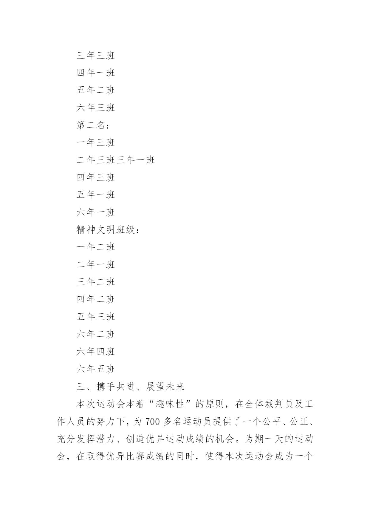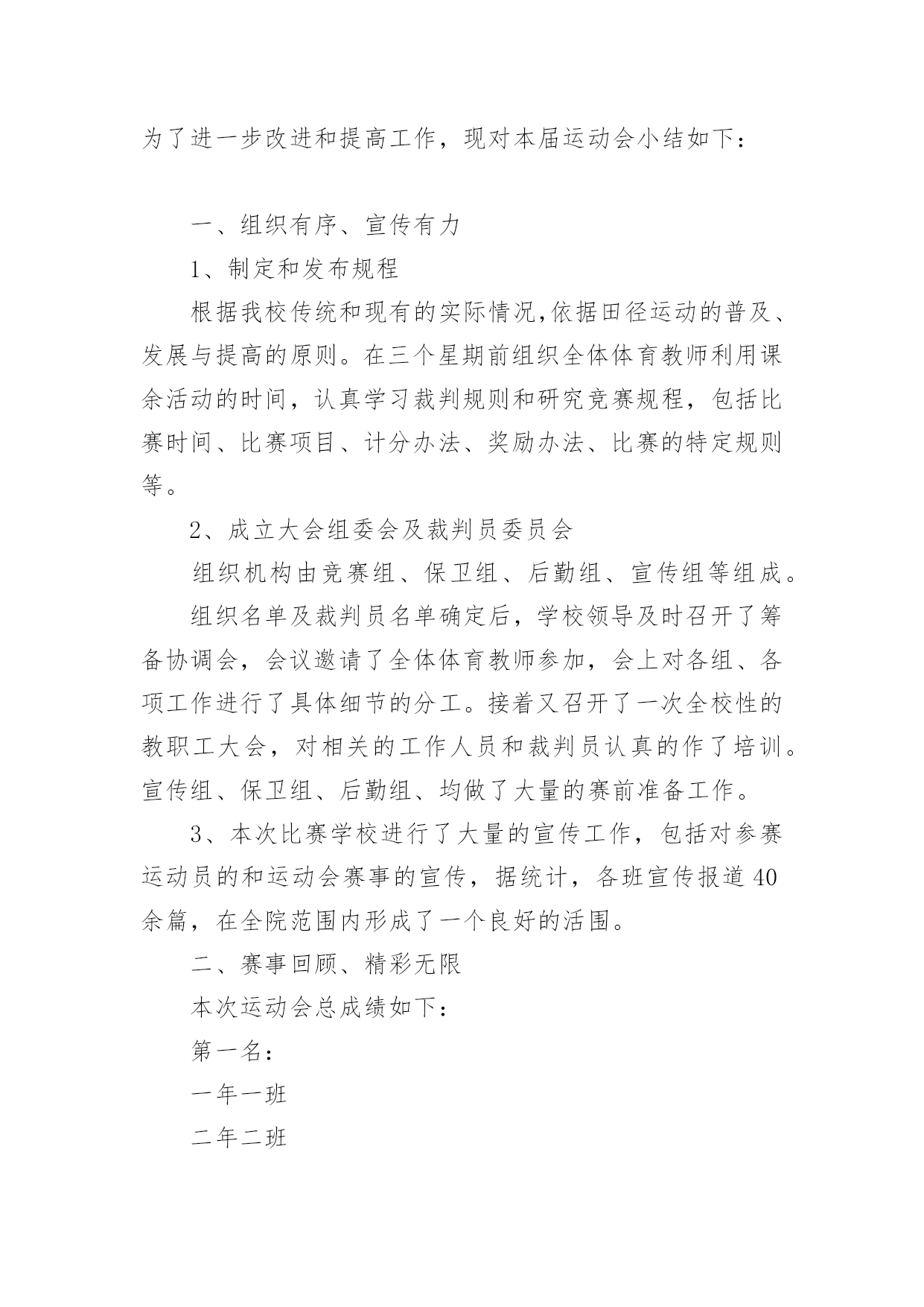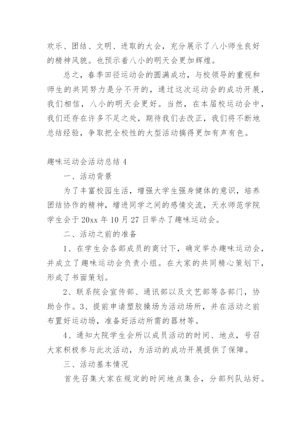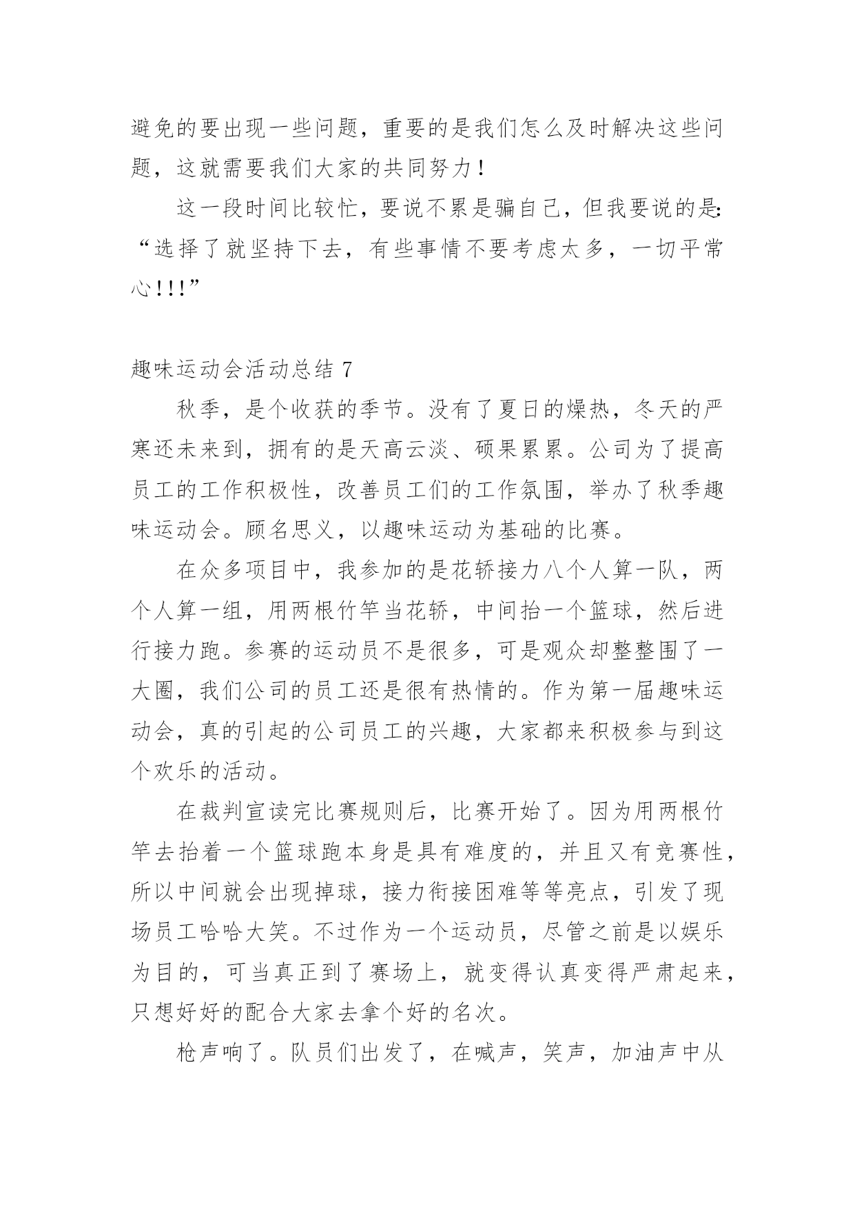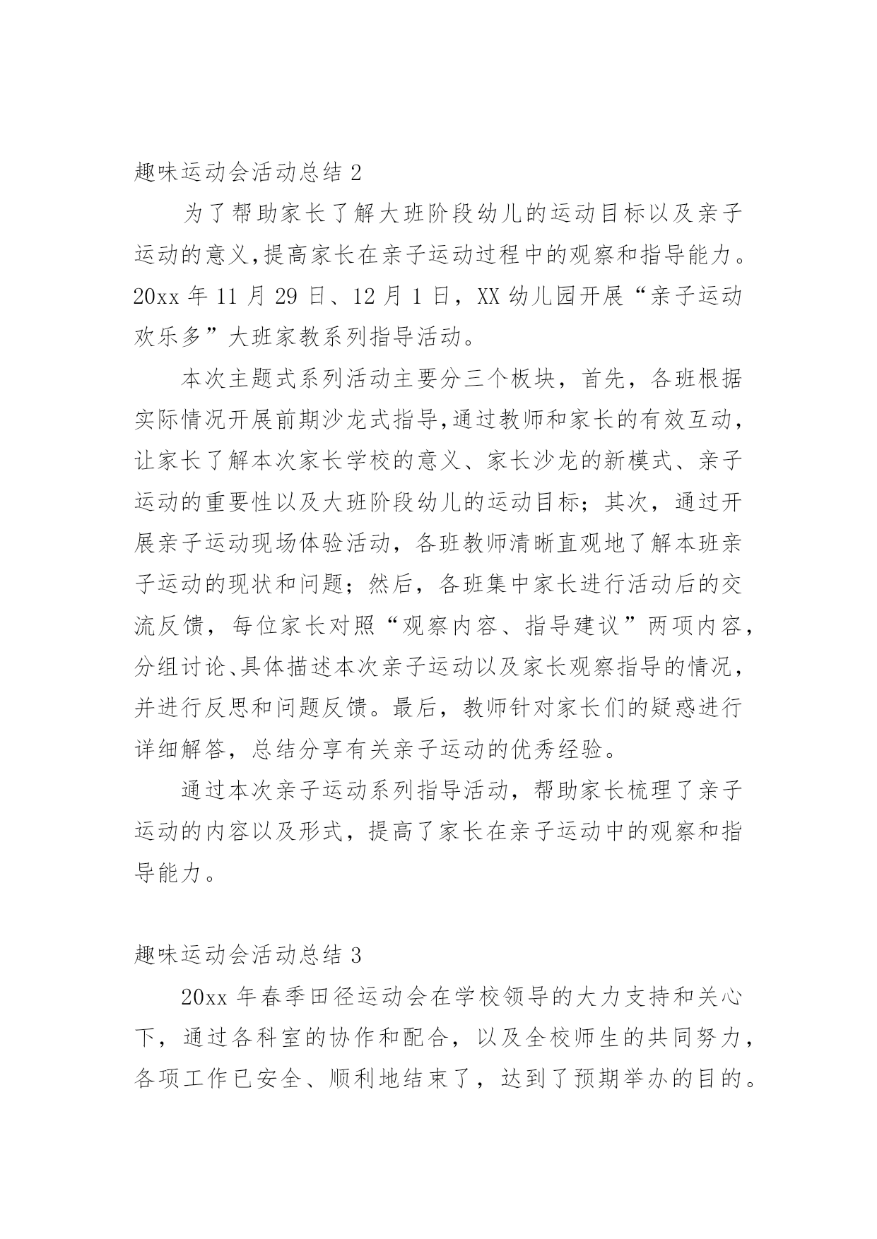 趣味运动会活动总结总结是事后对某一阶段的学习或工作情况作加以回顾检查并分析评价的书面材料,它可以有效锻炼我们的语言组织能力,不妨坐下来好好写写总结吧。如何把总结做到重点突出呢?下面是小编为大家收集的趣味运动会活动总结,欢迎阅读,希望大家能够喜欢。趣味运动会活动总结1为了活跃教职工的业余文化生活,充实学校活动内容,增强教职工身体素质,推动学校体育工作发展,我校于4月底在潍坊中学体育场同学生运动会一并举行了4×100米男女混合接力赛,5月初在学校操场举行了25米往返9人团体跳绳跑和自行车慢骑比赛。4×100米接力比赛中,每位参赛者奋力拼搏,使出全身力气,显出了专业运动员的气质。王金花老师巾帼不让须眉,把其他的教师甩在了身后,成为全场的焦点。25米往返9人团体跳绳跑比赛中,工会一组的老师配合默契,在整个比赛过程中没有出现一点失误,当之无愧的取得了冠军。自行车慢骑比的是平衡感和耐心,马靖老师整个比赛过程都处于非常稳定的状态,引来观赛者阵阵的掌声。整个活动教职工积极投入,热情参与,充分体现了友谊第一,比赛第二的体育精神,体现出教职工充满活力,团结协作,努力进取的良好风貌,受到了良好的效果。趣味运动会活动总结2为了帮助家长了解大班阶段幼儿的运动目标以及亲子运动的意义,提高家长在亲子运动过程中的观察和指导能力。20xx年11月29日、12月1日,XX幼儿园开展“亲子运动欢乐多”大班家教系列指导活动。本次主题式系列活动主要分三个板块,首先,各班根据实际情况开展前期沙龙式指导,通过教师和家长的有效互动,让家长了解本次家长学校的意义、家长沙龙的新模式、亲子运动的重要性以及大班阶段幼儿的运动目标;其次,通过开展亲子运动现场体验活动,各班教师清晰直观地了解本班亲子运动的现状和问题;然后,各班集中家长进行活动后的交流反馈,每位家长对照“观察内容、指导建议”两项内容,分组讨论、具体描述本次亲子运动以及家长观察指导的情况,并进行反思和问题反馈。最后,教师针对家长们的疑惑进行详细解答,总结分享有关亲子运动的优秀经验。通过本次亲子运动系列指导活动,帮助家长梳理了亲子运动的内容以及形式,提高了家长在亲子运动中的观察和指导能力。趣味运动会活动总结320xx年春季田径运动会在学校领导的大力支持和关心下,通过各科室的协作和配合,以及全校师生的共同努力,各项工作已安全、顺利地结束了,达到了预期举办的目的。为了进一步改进和提高工作,现对本届运动会小结如下:一、组织有序、宣传有力1、制定和发布规程根据我校传统和现有的实际情况,依据田径运动的普及、发展与提高的原则。在三个星期前组织全体体育教师利用课余活动的时间,认真学习裁判规则和研究竞赛规程,包括比赛时间、比赛项目、计分办法、奖励办法、比赛的特定规则等。2、成立大会组委会及裁判员委员会组织机构由竞赛组、保卫组、后勤组、宣传组等组成。组织名单及裁判员名单确定后,学校领导及时召开了筹备协调会,会议邀请了全体体育教师参加,会上对各组、各项工作进行了具体细节的分工。接着又召开了一次全校性的教职工大会,对相关的工作人员和裁判员认真的作了培训。宣传组、保卫组、后勤组、均做了大量的赛前准备工作。3、本次比赛学校进行了大量的宣传工作,包括对参赛运动员的和运动会赛事的宣传,据统计,各班宣传报道40余篇,在全院范围内形成了一个良好的活围。二、赛事回顾、精彩无限本次运动会总成绩如下:第一名:一年一班二年二班三年三班四年一班五年二班六年三班第二名:一年三班二年三班三年一班四年三班五年一班六年一班精神文明班级:一年二班二年一班三年二班四年二班五年三班六年二班六年四班六年五班三、携手共进、展望未来本次运动会本着“趣味性”的原则,在全体裁判员及工作人员的努力下,为700多名运动员提供了一个公平、公正、充分发挥潜力、创造优异运动成绩的机会。为期一天的运动会,在取得优异比赛成绩的同时,使得本次运动会成为一个欢乐、团结、文明、进取的大会,充分展示了八小师生良好的精神风貌。也预示着八小的明天会更加辉煌。总之,春季田径运动会的圆满成功,与校领导的重视和师生的共同努力是分不开的,通过这次运动会的成功开展,我们相信,八小的明天会更好。当然,在本届校运动会中,我们还存在许多不足之处,期待我们去改正,我们将不断地总结经验,争取把全校性的大型活动搞得更加有声有色。趣味运动会活动总结4一、活动背景为了丰富校园生活,增强大学生强身健体的意识,培养团结协作的精神,增进同学之间的感情交流,天水师范学院学生会于20xx年10月27日举办了趣味运动会。二、活动之前的准备1、在学生会各部成员的商讨下,确定举办趣味运动会,并成立了趣味运动会负责小组。在大家的共同精心策划下,形成了书面策划。2、联系院会宣传部、通讯部以及文艺部等各部门,协助合作。3、提前申请塑胶操场为活动场所,并在活动之