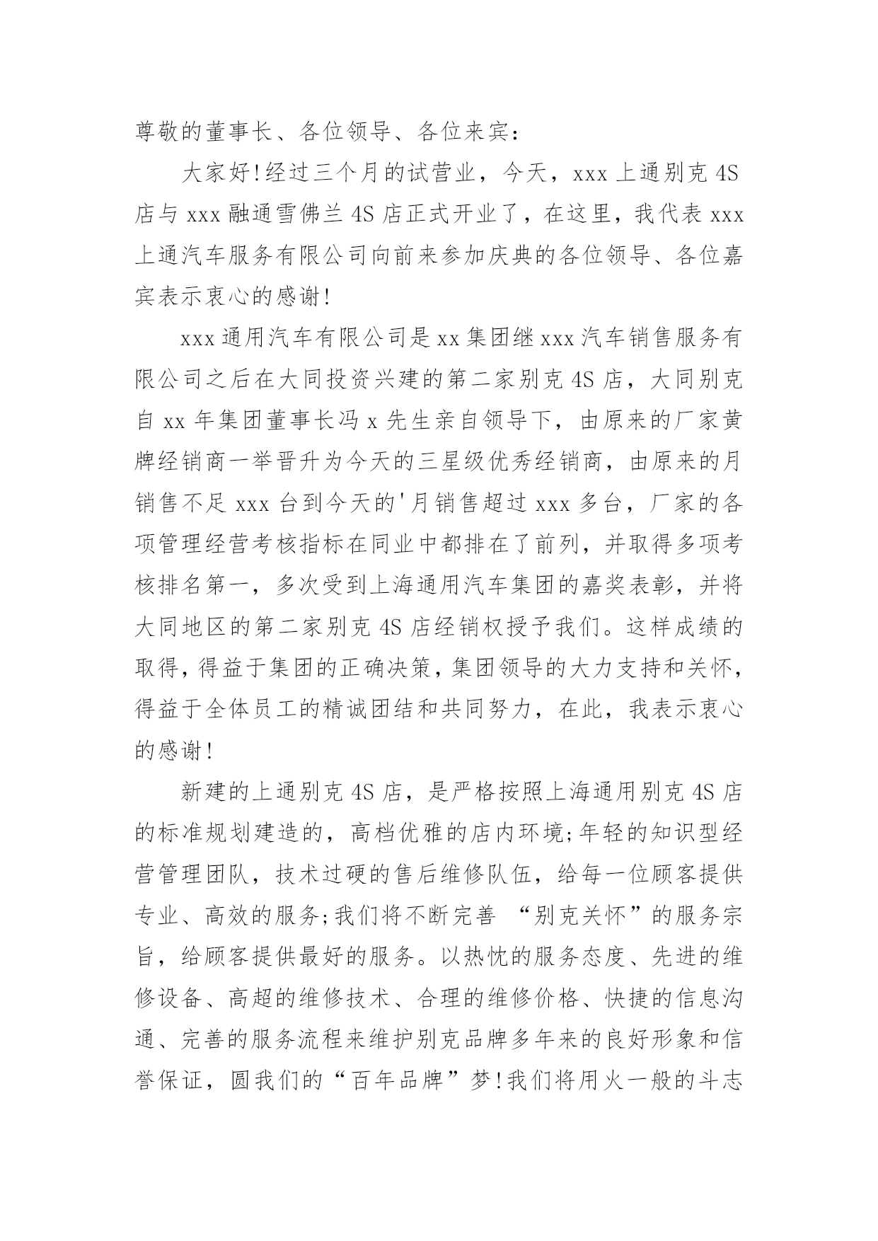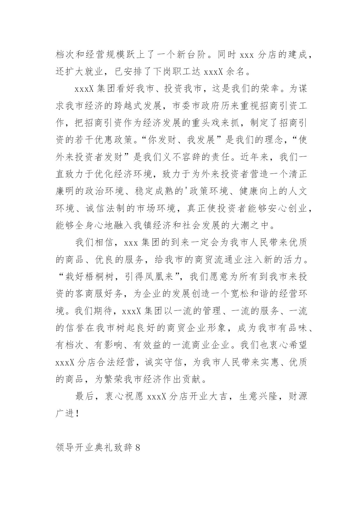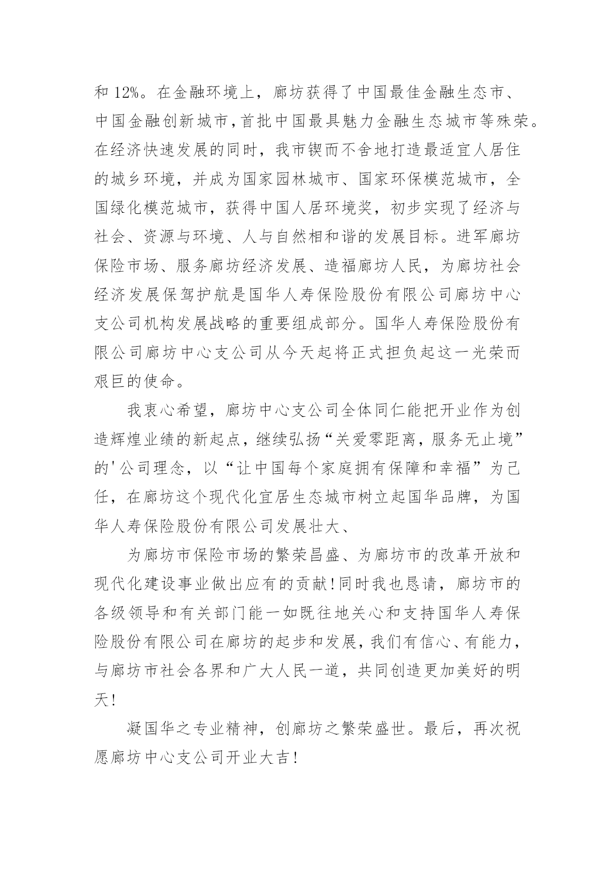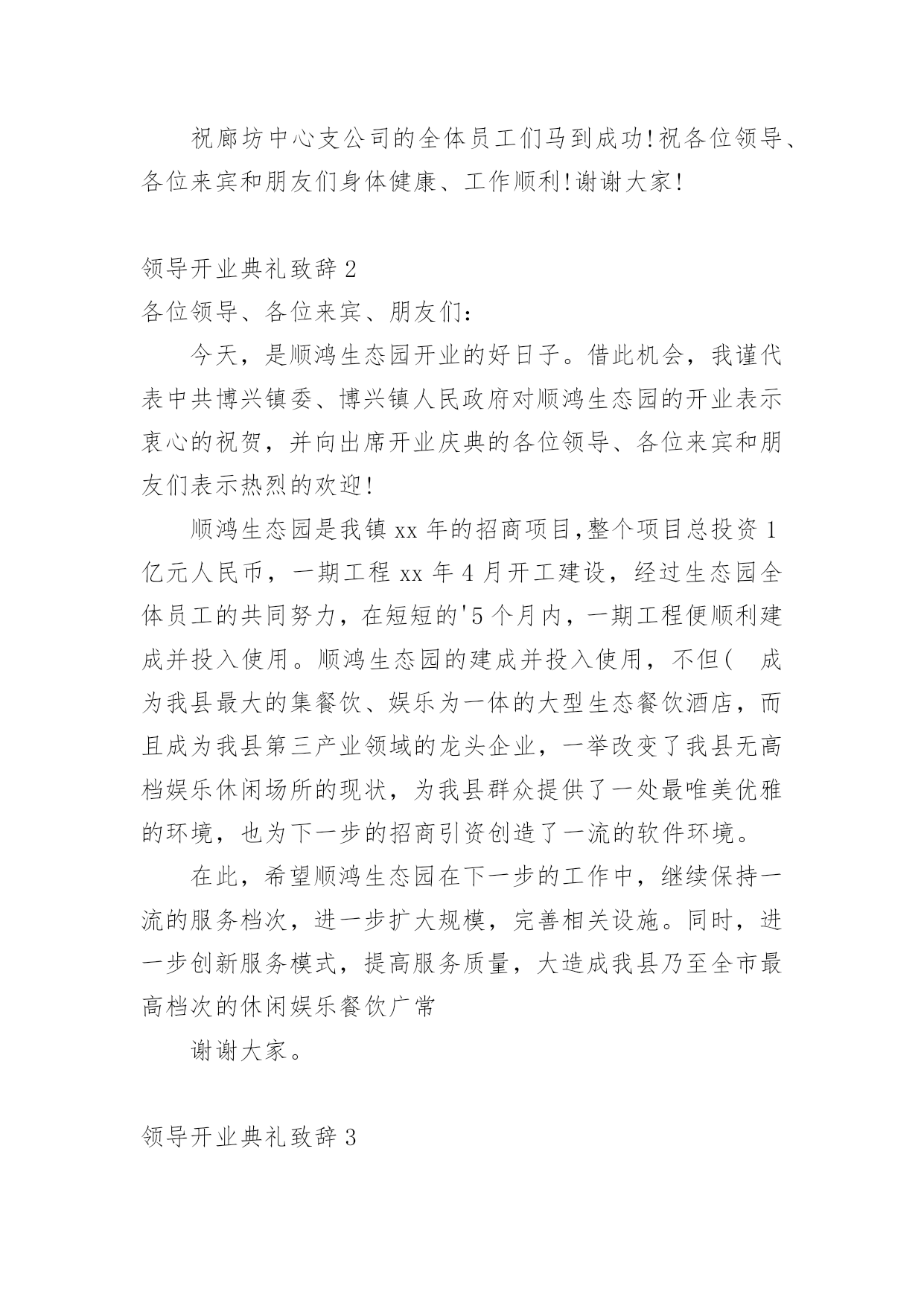 领导开业典礼致辞1领导开业典礼致辞在日复一日的学习、工作或生活中,大家一定都接触过致辞吧,致辞是向他人表达思想感情用的文字或语言。那什么样的致辞才是优秀的呢?下面是小编精心整理的领导开业典礼致辞,希望对大家有所帮助。领导开业典礼致辞1尊敬的各位领导,新闻界的朋友们,各位来宾:上午好!今天,是一个喜庆的日子:在您们的大力支持下,经过全体伙伴数月的紧张筹备,经中国保监会批准,国华人寿保险股份有限公司廊坊中心支公司正式开业了!首先,请允许我代表国华人寿保险股份有限公司廊坊中心支公司总经理室,对各位领导、各位来宾、各位朋友光临廊坊中心支公司开业庆典表示最热烈的欢迎!向廊坊市政府、廊坊市保险行业协会、廊坊市各大银行以及社会各界对国华人寿廊坊中心支公司的支持和厚爱表示诚挚的感谢!同时我也向参与廊坊中心支公司筹备的全体伙伴说一声:你们辛苦了!廊坊,这座位于京津走廊之上的新兴城市,近年来,以经济、社会和谐发展的特色为世人瞩目。城镇居民人均可支配收入22818元、农民人均纯收入8500元,分别增长12.6%和12%。在金融环境上,廊坊获得了中国最佳金融生态市、中国金融创新城市,首批中国最具魅力金融生态城市等殊荣。在经济快速发展的同时,我市锲而不舍地打造最适宜人居住的城乡环境,并成为国家园林城市、国家环保模范城市,全国绿化模范城市,获得中国人居环境奖,初步实现了经济与社会、资源与环境、人与自然相和谐的发展目标。进军廊坊保险市场、服务廊坊经济发展、造福廊坊人民,为廊坊社会经济发展保驾护航是国华人寿保险股份有限公司廊坊中心支公司机构发展战略的重要组成部分。国华人寿保险股份有限公司廊坊中心支公司从今天起将正式担负起这一光荣而艰巨的使命。我衷心希望,廊坊中心支公司全体同仁能把开业作为创造辉煌业绩的新起点,继续弘扬“关爱零距离,服务无止境”的'公司理念,以“让中国每个家庭拥有保障和幸福”为己任,在廊坊这个现代化宜居生态城市树立起国华品牌,为国华人寿保险股份有限公司发展壮大、为廊坊市保险市场的繁荣昌盛、为廊坊市的改革开放和现代化建设事业做出应有的贡献!同时我也恳请,廊坊市的各级领导和有关部门能一如既往地关心和支持国华人寿保险股份有限公司在廊坊的起步和发展,我们有信心、有能力,与廊坊市社会各界和广大人民一道,共同创造更加美好的明天!凝国华之专业精神,创廊坊之繁荣盛世。最后,再次祝愿廊坊中心支公司开业大吉!祝廊坊中心支公司的全体员工们马到成功!祝各位领导、各位来宾和朋友们身体健康、工作顺利!谢谢大家!领导开业典礼致辞2各位领导、各位来宾、朋友们:今天,是顺鸿生态园开业的好日子。借此机会,我谨代表中共博兴镇委、博兴镇人民政府对顺鸿生态园的开业表示衷心的祝贺,并向出席开业庆典的各位领导、各位来宾和朋友们表示热烈的欢迎!顺鸿生态园是我镇xx年的招商项目,整个项目总投资1亿元人民币,一期工程xx年4月开工建设,经过生态园全体员工的共同努力,在短短的'5个月内,一期工程便顺利建成并投入使用。顺鸿生态园的建成并投入使用,不但(成为我县最大的集餐饮、娱乐为一体的大型生态餐饮酒店,而且成为我县第三产业领域的龙头企业,一举改变了我县无高档娱乐休闲场所的现状,为我县群众提供了一处最唯美优雅的环境,也为下一步的招商引资创造了一流的软件环境。在此,希望顺鸿生态园在下一步的工作中,继续保持一流的服务档次,进一步扩大规模,完善相关设施。同时,进一步创新服务模式,提高服务质量,大造成我县乃至全市最高档次的休闲娱乐餐饮广常谢谢大家。领导开业典礼致辞3尊敬的董事长、各位领导、各位来宾:大家好!经过三个月的试营业,今天,xxx上通别克4S店与xxx融通雪佛兰4S店正式开业了,在这里,我代表xxx上通汽车服务有限公司向前来参加庆典的各位领导、各位嘉宾表示衷心的感谢!xxx通用汽车有限公司是xx集团继xxx汽车销售服务有限公司之后在大同投资兴建的第二家别克4S店,大同别克自xx年集团董事长冯x先生亲自领导下,由原来的厂家黄牌经销商一举晋升为今天的三星级优秀经销商,由原来的月销售不足xxx台到今天的'月销售超过xxx多台,厂家的各项管理经营考核指标在同业中都排在了前列,并取得多项考核排名第一,多次受到上海通用汽车集团的嘉奖表彰,并将大同地区的第二家别克4S店经销权授予我们。这样成绩的取得,得益于集团的正确决策,集团领导的大力支持和关怀,得益于全体员工的精诚团结和共同努力,在此,我表示衷心的感谢!新建的上通别克4S店,是严格按照上海通用别克4S店的标准规划建造的,高档优雅的店内环境;年轻的知识型经营管理团队,技术过硬的售后维修队伍,给每一位顾客提供专业、高效的服务;我们将不断完善“别克关怀”的服务宗旨,给顾客提供最好的服务。以热忱的服务态度、先进的维修设备、高超的维修技术、合理的维修价格、快捷的信息沟