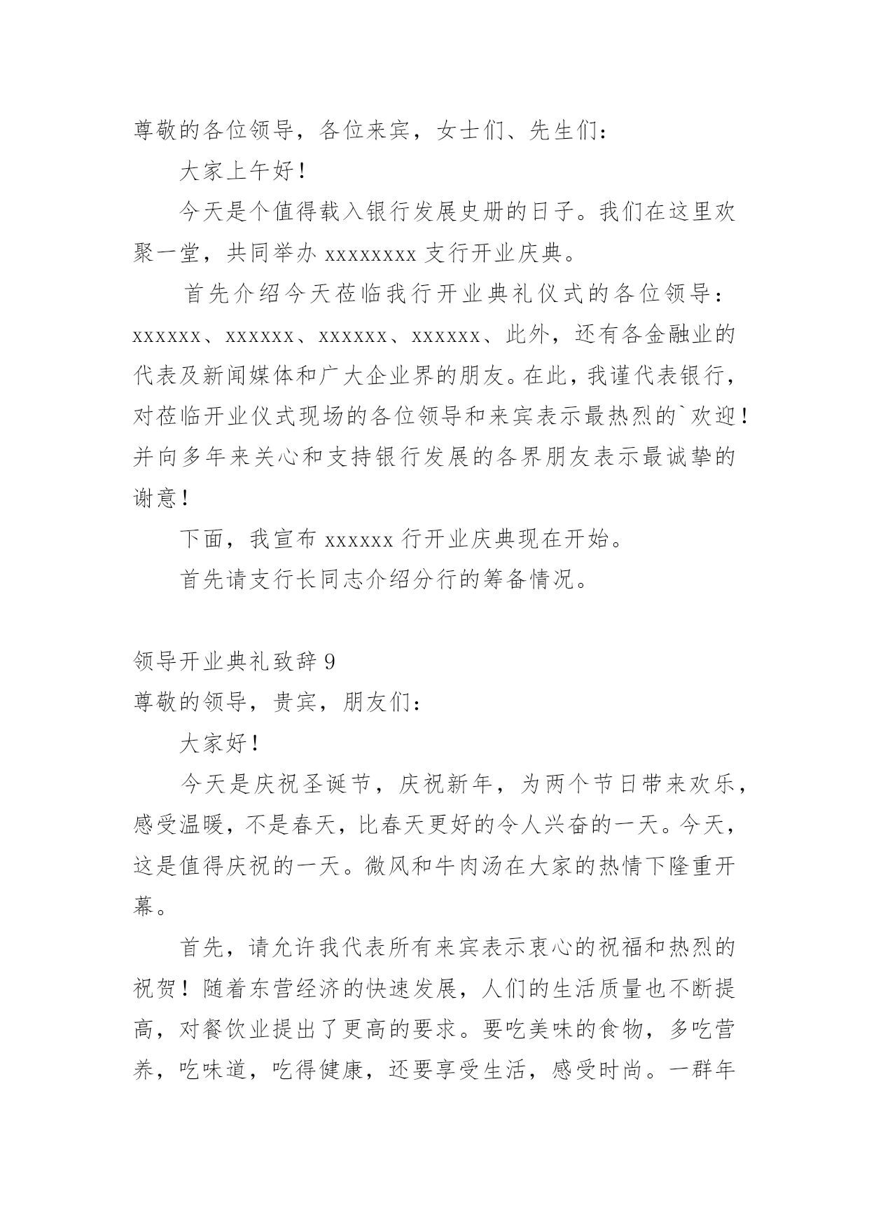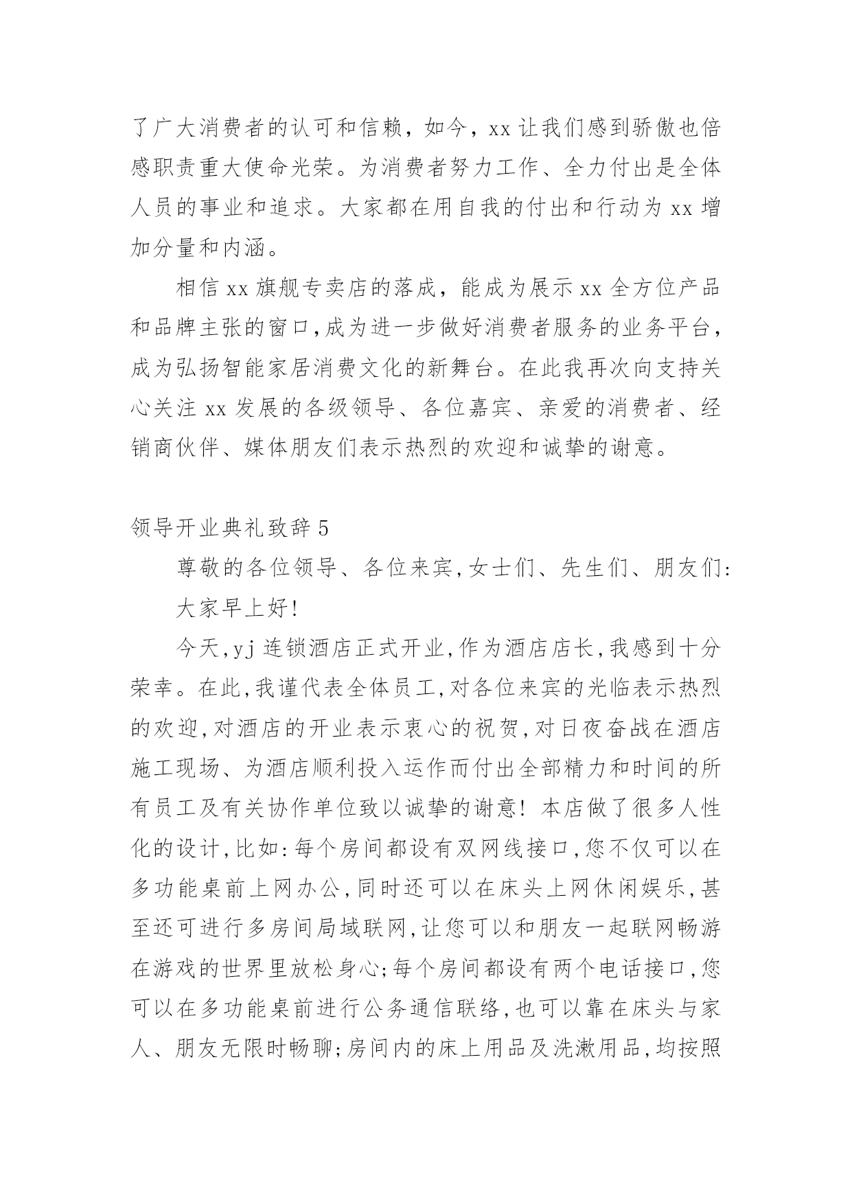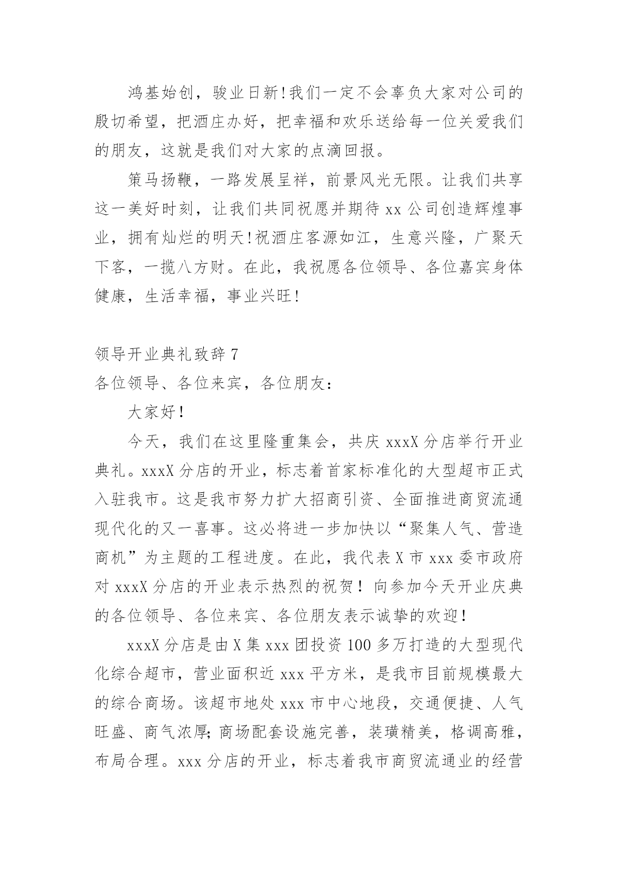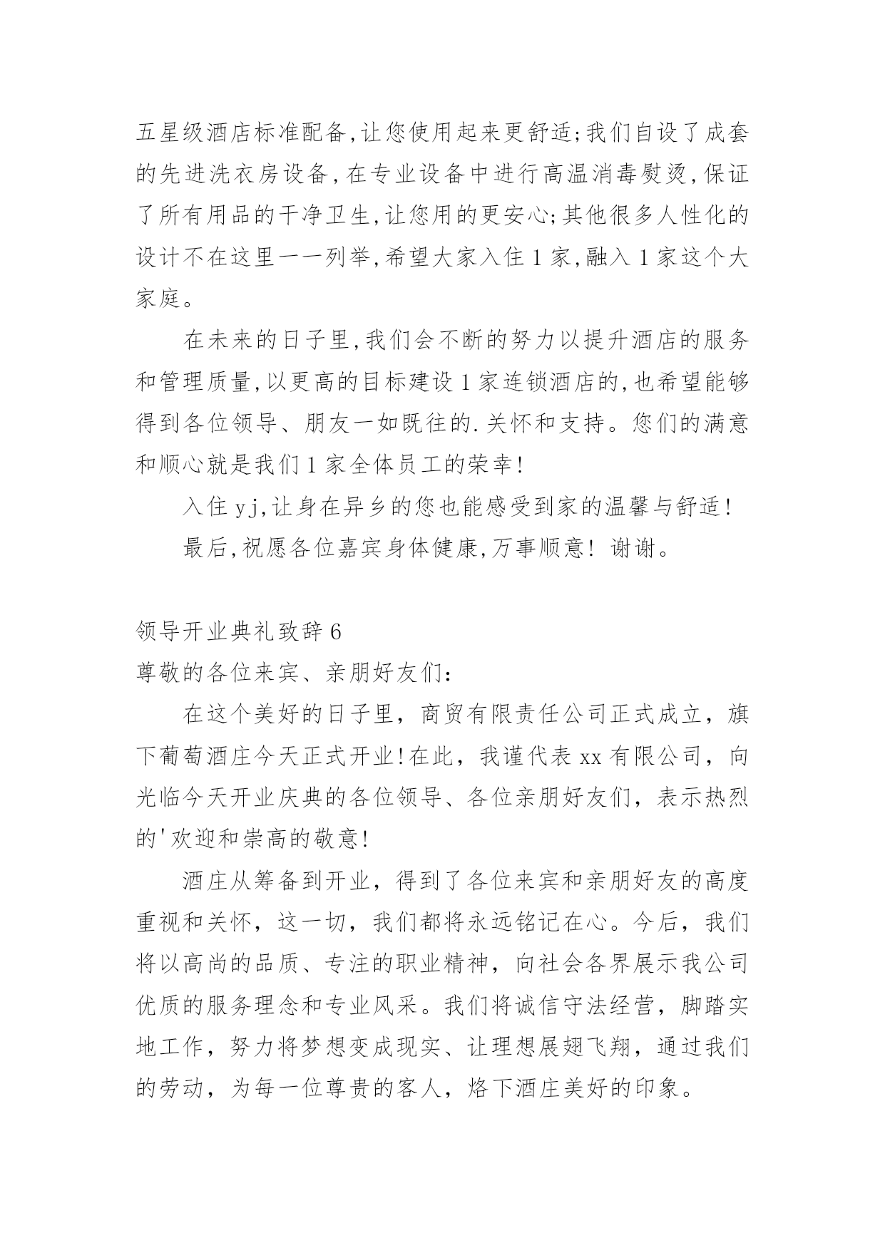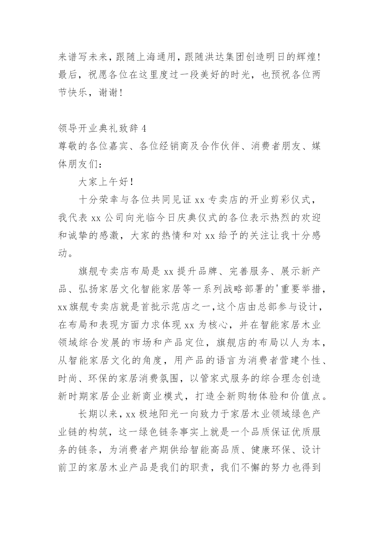 领导开业典礼致辞1领导开业典礼致辞在日复一日的学习、工作或生活中,大家一定都接触过致辞吧,致辞是向他人表达思想感情用的文字或语言。那什么样的致辞才是优秀的呢?下面是小编精心整理的领导开业典礼致辞,希望对大家有所帮助。领导开业典礼致辞1尊敬的各位领导,新闻界的朋友们,各位来宾:上午好!今天,是一个喜庆的日子:在您们的大力支持下,经过全体伙伴数月的紧张筹备,经中国保监会批准,国华人寿保险股份有限公司廊坊中心支公司正式开业了!首先,请允许我代表国华人寿保险股份有限公司廊坊中心支公司总经理室,对各位领导、各位来宾、各位朋友光临廊坊中心支公司开业庆典表示最热烈的欢迎!向廊坊市政府、廊坊市保险行业协会、廊坊市各大银行以及社会各界对国华人寿廊坊中心支公司的支持和厚爱表示诚挚的感谢!同时我也向参与廊坊中心支公司筹备的全体伙伴说一声:你们辛苦了!廊坊,这座位于京津走廊之上的新兴城市,近年来,以经济、社会和谐发展的特色为世人瞩目。城镇居民人均可支配收入22818元、农民人均纯收入8500元,分别增长12.6%和12%。在金融环境上,廊坊获得了中国最佳金融生态市、中国金融创新城市,首批中国最具魅力金融生态城市等殊荣。在经济快速发展的同时,我市锲而不舍地打造最适宜人居住的城乡环境,并成为国家园林城市、国家环保模范城市,全国绿化模范城市,获得中国人居环境奖,初步实现了经济与社会、资源与环境、人与自然相和谐的发展目标。进军廊坊保险市场、服务廊坊经济发展、造福廊坊人民,为廊坊社会经济发展保驾护航是国华人寿保险股份有限公司廊坊中心支公司机构发展战略的重要组成部分。国华人寿保险股份有限公司廊坊中心支公司从今天起将正式担负起这一光荣而艰巨的使命。我衷心希望,廊坊中心支公司全体同仁能把开业作为创造辉煌业绩的新起点,继续弘扬“关爱零距离,服务无止境”的'公司理念,以“让中国每个家庭拥有保障和幸福”为己任,在廊坊这个现代化宜居生态城市树立起国华品牌,为国华人寿保险股份有限公司发展壮大、为廊坊市保险市场的繁荣昌盛、为廊坊市的改革开放和现代化建设事业做出应有的贡献!同时我也恳请,廊坊市的各级领导和有关部门能一如既往地关心和支持国华人寿保险股份有限公司在廊坊的起步和发展,我们有信心、有能力,与廊坊市社会各界和广大人民一道,共同创造更加美好的明天!凝国华之专业精神,创廊坊之繁荣盛世。最后,再次祝愿廊坊中心支公司开业大吉!祝廊坊中心支公司的全体员工们马到成功!祝各位领导、各位来宾和朋友们身体健康、工作顺利!谢谢大家!领导开业典礼致辞2各位领导、各位来宾、朋友们:今天,是顺鸿生态园开业的好日子。借此机会,我谨代表中共博兴镇委、博兴镇人民政府对顺鸿生态园的开业表示衷心的祝贺,并向出席开业庆典的各位领导、各位来宾和朋友们表示热烈的欢迎!顺鸿生态园是我镇xx年的招商项目,整个项目总投资1亿元人民币,一期工程xx年4月开工建设,经过生态园全体员工的共同努力,在短短的'5个月内,一期工程便顺利建成并投入使用。顺鸿生态园的建成并投入使用,不但(成为我县最大的集餐饮、娱乐为一体的大型生态餐饮酒店,而且成为我县第三产业领域的龙头企业,一举改变了我县无高档娱乐休闲场所的现状,为我县群众提供了一处最唯美优雅的环境,也为下一步的招商引资创造了一流的软件环境。在此,希望顺鸿生态园在下一步的工作中,继续保持一流的服务档次,进一步扩大规模,完善相关设施。同时,进一步创新服务模式,提高服务质量,大造成我县乃至全市最高档次的休闲娱乐餐饮广常谢谢大家。领导开业典礼致辞3尊敬的董事长、各位领导、各位来宾:大家好!经过三个月的试营业,今天,xxx上通别克4S店与xxx融通雪佛兰4S店正式开业了,在这里,我代表xxx上通汽车服务有限公司向前来参加庆典的各位领导、各位嘉宾表示衷心的感谢!xxx通用汽车有限公司是xx集团继xxx汽车销售服务有限公司之后在大同投资兴建的第二家别克4S店,大同别克自xx年集团董事长冯x先生亲自领导下,由原来的厂家黄牌经销商一举晋升为今天的三星级优秀经销商,由原来的月销售不足xxx台到今天的'月销售超过xxx多台,厂家的各项管理经营考核指标在同业中都排在了前列,并取得多项考核排名第一,多次受到上海通用汽车集团的嘉奖表彰,并将大同地区的第二家别克4S店经销权授予我们。这样成绩的取得,得益于集团的正确决策,集团领导的大力支持和关怀,得益于全体员工的精诚团结和共同努力,在此,我表示衷心的感谢!新建的上通别克4S店,是严格按照上海通用别克4S店的标准规划建造的,高档优雅的店内环境;年轻的知识型经营管理团队,技术过硬的售后维修队伍,给每一位顾客提供专业、高效的服务;我们将不断完善“别克关怀”的服务宗旨,给顾客提供最好的服务。以热忱的服务态度、先进的维修设备、高超的维修技术、合理的维修价格、快捷的信息沟