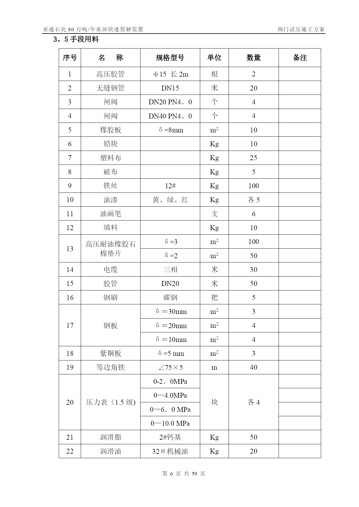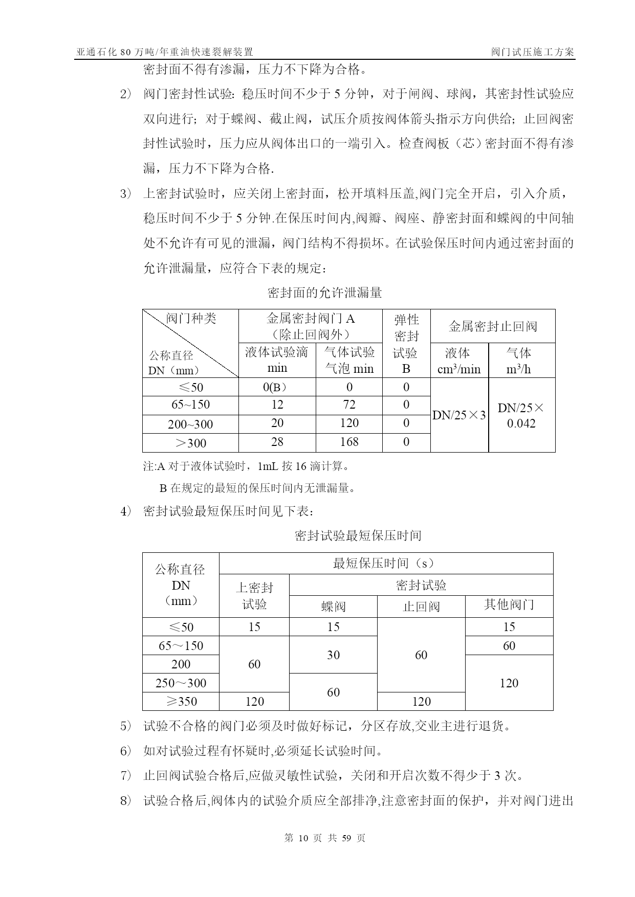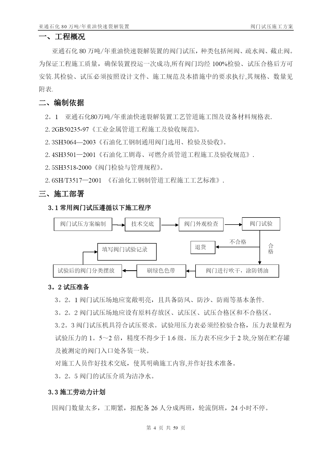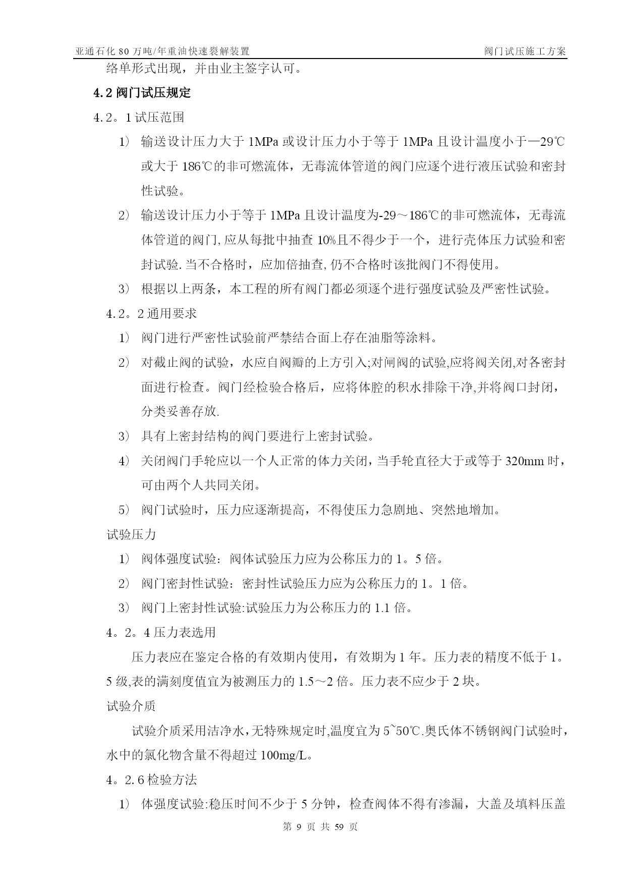 亚通石化80万吨/年重油快速裂解装置阀门试压施工方案第PAGE30页共NUMPAGES59页管线阀门施工方案【实用文档】doc文档可直接使用可编辑,欢迎下载亚通石化80万吨/年重油快速裂解装置阀门试压施工方案编号:SLYJ—SGFA—012胜利油建金属结构厂亚通项目部0版本日期版本说明编写审核批准目录TOC\o”1—1”\h\z\uHYPERLINK\l”_Toc202125817”一、工程概况PAGEREF_Toc202125817\h3HYPERLINK\l"_Toc202125818”二、编制依据PAGEREF_Toc202125818\h3HYPERLINK\l"_Toc202125819"三、施工部署PAGEREF_Toc202125819\h3HYPERLINK\l”_Toc202125820”四、关键工序、重要工序的实施措施PAGEREF_Toc202125820\h7HYPERLINK\l"_Toc202125821"五、质量保证体系及措施PAGEREF_Toc202125821\h10HYPERLINK\l”_Toc202125822”六、安全保证措施PAGEREF_Toc202125822\h12HYPERLINK\l"_Toc202125823"七、试压阀门统计PAGEREF_Toc202125823\h错误!未定义书签。一、工程概况亚通石化80万吨/年重油快速裂解装置的阀门试压,种类包括闸阀、疏水阀、截止阀。为保证工程施工质量,确保装置投运一次成功,所有阀门均经100%检验、试压合格后方可安装.其检验、试压必须按照设计文件、施工规范及本措施中的要求执行,其规格、数量见附表.二、编制依据2。1亚通石化80万吨/年重油快速裂解装置工艺管道施工图及设备材料规格表.2.2GB50235-97《工业金属管道工程施工及验收规范》。2.3SH3064—2003《石油化工钢制通用阀门选用、检验及验收》。2.4SH3501—2001《石油化工剧毒、可燃介质管道工程施工及验收规范》.2.5SH3518-2000《阀门检验与管理规程》。2.6SH/T3517—2001《石油化工钢制管道工程施工工艺标准》.三、施工部署3.1常用阀门试压遵循以下施工程序阀门试压方案编制技术交底阀门试验阀门进行吹干,涂防锈油刷绿色色带试验后的阀门分类摆放填写阀门试验记录合格退货不合格阀门外观检查3。2试压准备3。2。1阀门试压场地应宽敞明亮,且具备防风、防沙、防雨等基本条件.3。2。2阀门试压场地应设有原料存放区、试压区、试压合格区和不合格区。3.2。3阀门试压机具符合试压要求。试验用压力表必须经检验合格,压力表量程为试验压力的1。5~2倍,精度不得少于1.6级。压力表不应少于2块,分别在贮存罐及被测定的阀门入口处各装一块。对施工人员作好技术交底,使其明确施工内容,并作好技术准备。3。2。5阀门的试压介质为洁净水。3.3施工劳动力计划因阀门数量太多,工期紧,拟配备26人分成两班,轮流倒班,24小时不停。劳动力计划一览表序号工种人数备注1钳工42管工43起重24焊工45电工26管理人员27其他43.4试压机具序号名称规格型号单位数量备注1汽车吊16台12电动试压泵SY380/25台23电动试压泵往复式40~70MPa台14试压胎具中套15倒链3t台26倒链2t台27逆变式电焊机ZX7-400S—2台28角向磨光机Ф100台29角向磨光机Ф150台210空气开关三相,10A个111按钮个112光谱分析仪台113贮压罐个114千斤顶QY—5。050T台115千斤顶QY—2。525T台116梅花、套筒扳手套各217手锤2、4、8磅个各218钢字头(数字)6mm套219游标卡尺0。02mm把23。5手段用料序号名称规格型号单位数量备注1高压胶管ф15长2m根22无缝钢管DN15米203闸阀DN20PN4。0个44闸阀DN40PN4。0个45橡胶板δ=8mmm2106铅块Kg107塑料布Kg258破布Kg59铁丝12#Kg10010油漆黄、绿、红Kg各511油画笔支612填料Kg1013高压耐油橡胶石棉垫片δ=3m2100δ=2m25014电缆三相米3015胶管DN20米5016钢刷碳钢把517钢板δ=30mmm23δ=20mmm24δ=10mmm2418紫铜板δ=5mmm2319等边角铁∠75×5m4020压力表(1.5级)0-2。0MPa块各40—4.0MPa0—6。0MPa0—10.0MPa21润滑脂2#钙基Kg5022