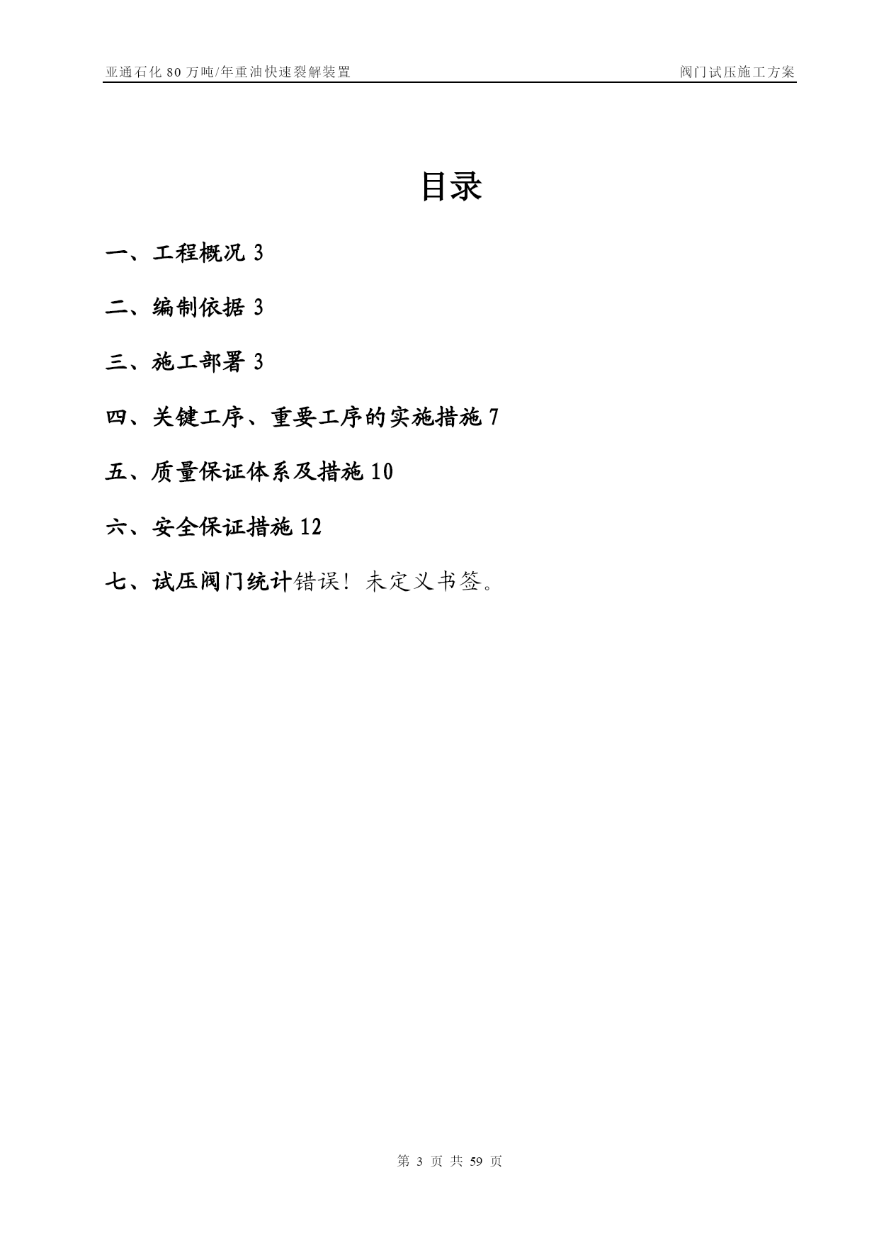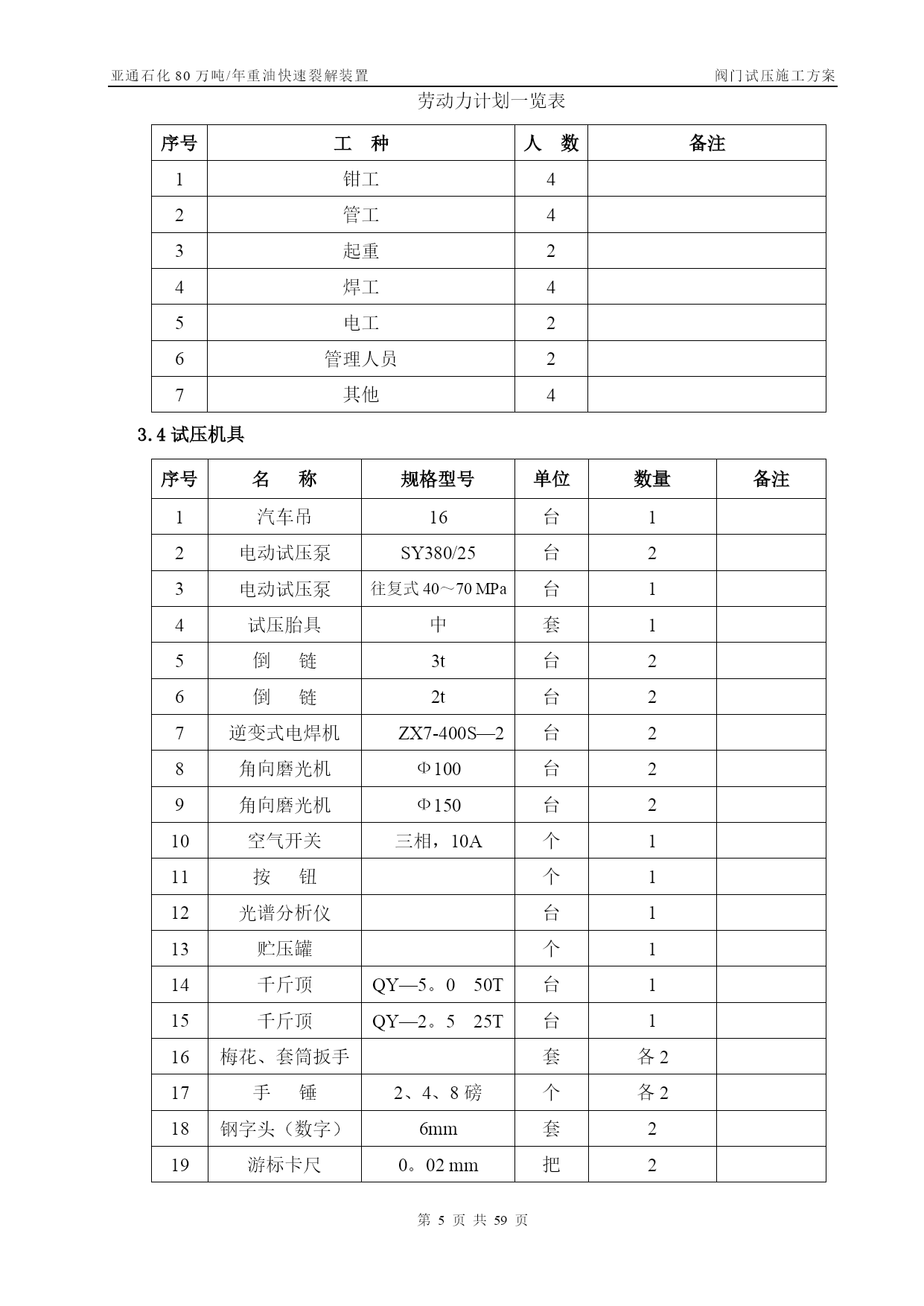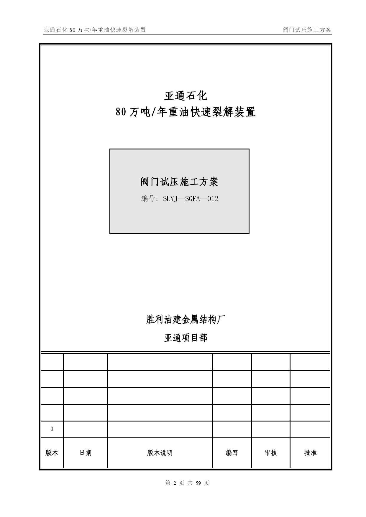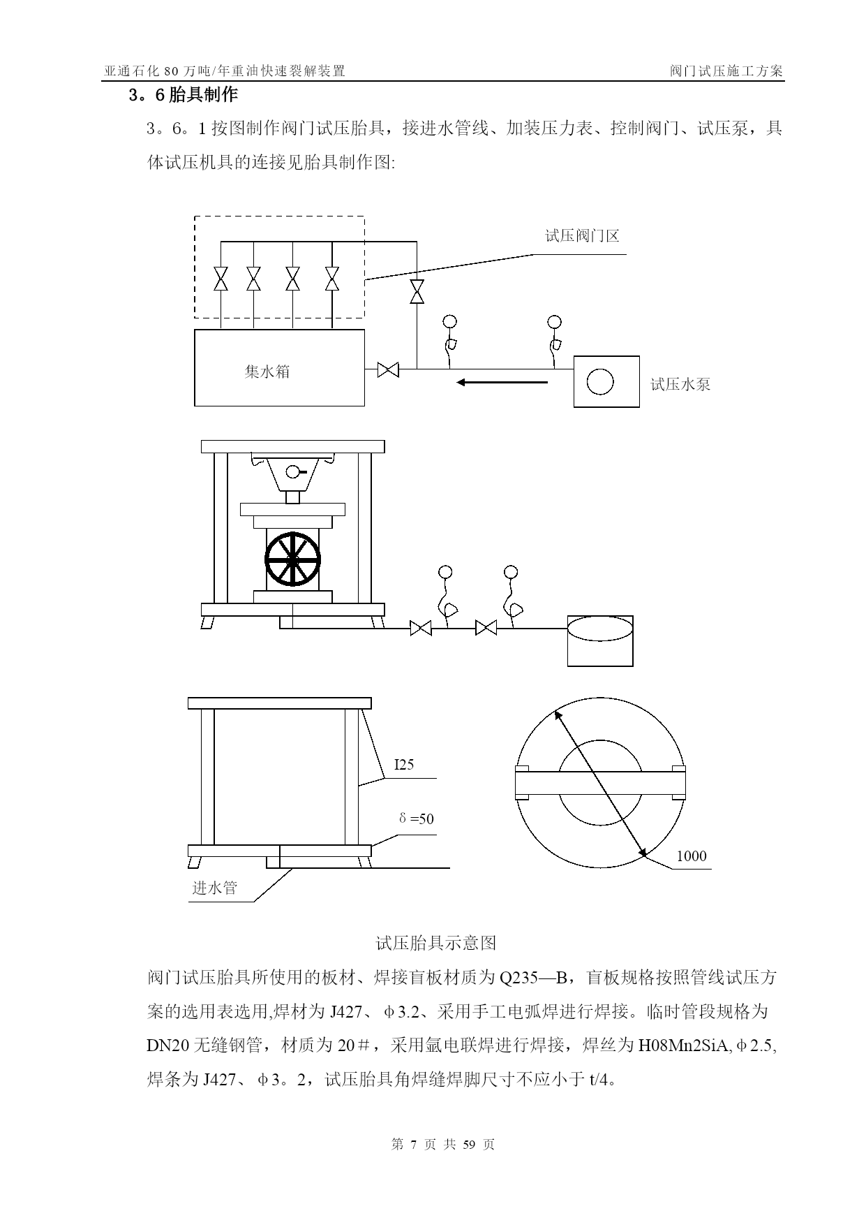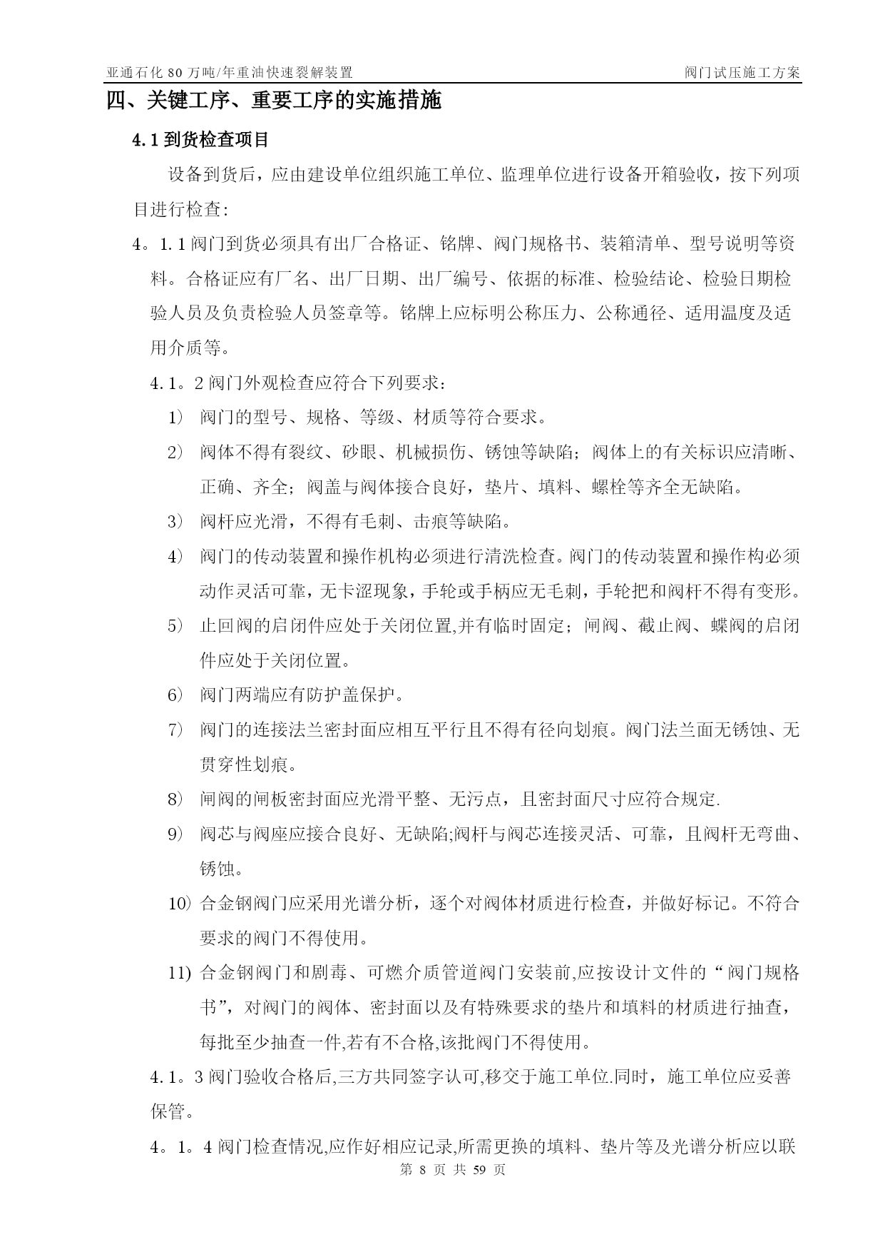亚通石化80万吨/年重油快速裂解装置阀门试压施工方案第PAGE30页共NUMPAGES59页管线阀门施工方案【实用文档】doc文档可直接使用可编辑,欢迎下载亚通石化80万吨/年重油快速裂解装置阀门试压施工方案编号:SLYJ—SGFA—012胜利油建金属结构厂亚通项目部0版本日期版本说明编写审核批准目录TOC\o”1—1”\h\z\uHYPERLINK\l”_Toc202125817”一、工程概况PAGEREF_Toc202125817\h3HYPERLINK\l"_Toc202125818”二、编制依据PAGEREF_Toc202125818\h3HYPERLINK\l"_Toc202125819"三、施工部署PAGEREF_Toc202125819\h3HYPERLINK\l”_Toc202125820”四、关键工序、重要工序的实施措施PAGEREF_Toc202125820\h7HYPERLINK\l"_Toc202125821"五、质量保证体系及措施PAGEREF_Toc202125821\h10HYPERLINK\l”_Toc202125822”六、安全保证措施PAGEREF_Toc202125822\h12HYPERLINK\l"_Toc202125823"七、试压阀门统计PAGEREF_Toc202125823\h错误!未定义书签。一、工程概况亚通石化80万吨/年重油快速裂解装置的阀门试压,种类包括闸阀、疏水阀、截止阀。为保证工程施工质量,确保装置投运一次成功,所有阀门均经100%检验、试压合格后方可安装.其检验、试压必须按照设计文件、施工规范及本措施中的要求执行,其规格、数量见附表.二、编制依据2。1亚通石化80万吨/年重油快速裂解装置工艺管道施工图及设备材料规格表.2.2GB50235-97《工业金属管道工程施工及验收规范》。2.3SH3064—2003《石油化工钢制通用阀门选用、检验及验收》。2.4SH3501—2001《石油化工剧毒、可燃介质管道工程施工及验收规范》.2.5SH3518-2000《阀门检验与管理规程》。2.6SH/T3517—2001《石油化工钢制管道工程施工工艺标准》.三、施工部署3.1常用阀门试压遵循以下施工程序阀门试压方案编制技术交底阀门试验阀门进行吹干,涂防锈油刷绿色色带试验后的阀门分类摆放填写阀门试验记录合格退货不合格阀门外观检查3。2试压准备3。2。1阀门试压场地应宽敞明亮,且具备防风、防沙、防雨等基本条件.3。2。2阀门试压场地应设有原料存放区、试压区、试压合格区和不合格区。3.2。3阀门试压机具符合试压要求。试验用压力表必须经检验合格,压力表量程为试验压力的1。5~2倍,精度不得少于1.6级。压力表不应少于2块,分别在贮存罐及被测定的阀门入口处各装一块。对施工人员作好技术交底,使其明确施工内容,并作好技术准备。3。2。5阀门的试压介质为洁净水。3.3施工劳动力计划因阀门数量太多,工期紧,拟配备26人分成两班,轮流倒班,24小时不停。劳动力计划一览表序号工种人数备注1钳工42管工43起重24焊工45电工26管理人员27其他43.4试压机具序号名称规格型号单位数量备注1汽车吊16台12电动试压泵SY380/25台23电动试压泵往复式40~70MPa台14试压胎具中套15倒链3t台26倒链2t台27逆变式电焊机ZX7-400S—2台28角向磨光机Ф100台29角向磨光机Ф150台210空气开关三相,10A个111按钮个112光谱分析仪台113贮压罐个114千斤顶QY—5。050T台115千斤顶QY—2。525T台116梅花、套筒扳手套各217手锤2、4、8磅个各218钢字头(数字)6mm套219游标卡尺0。02mm把23。5手段用料序号名称规格型号单位数量备注1高压胶管ф15长2m根22无缝钢管DN15米203闸阀DN20PN4。0个44闸阀DN40PN4。0个45橡胶板δ=8mmm2106铅块Kg107塑料布Kg258破布Kg59铁丝12#Kg10010油漆黄、绿、红Kg各511油画笔支612填料Kg1013高压耐油橡胶石棉垫片δ=3m2100δ=2m25014电缆三相米3015胶管DN20米5016钢刷碳钢把517钢板δ=30mmm23δ=20mmm24δ=10mmm2418紫铜板δ=5mmm2319等边角铁∠75×5m4020压力表(1.5级)0-2。0MPa块各40—4.0MPa0—6。0MPa0—10.0MPa21润滑脂2#钙基Kg5022