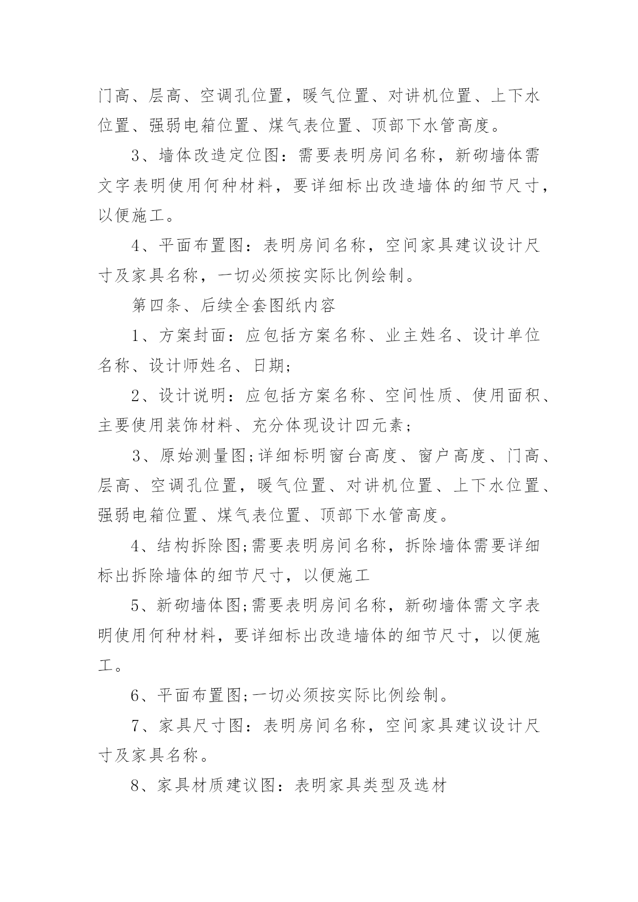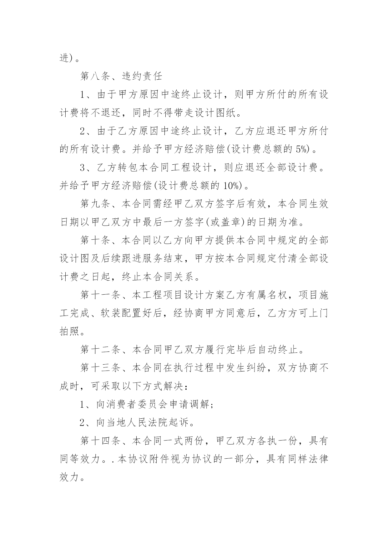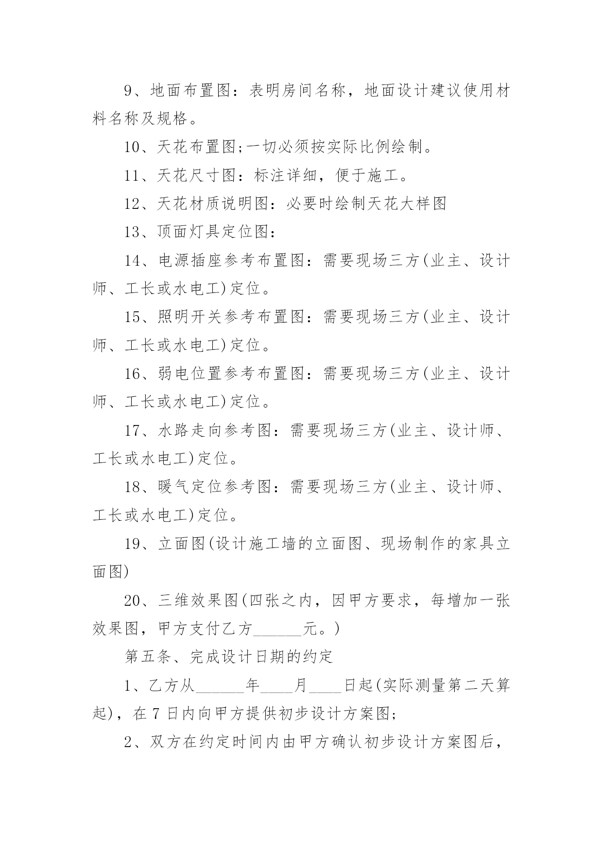 装饰装修设计合同装饰装修设计合同15篇在人们的法律意识不断增强的社会,合同在生活中的使用越来越广泛,它也是减少和防止发生争议的重要措施。那么制定合同书有什么需要注意的呢?以下是小编帮大家整理的装饰装修设计合同,仅供参考,欢迎大家阅读。装饰装修设计合同1甲方姓名:________身份证号:________工程地址(详细地址):________________联系方式:________联系电话:________邮箱:________乙方姓名:________联系电话:________邮箱:________经双方协商,依据《中华人民共和国民法典》以及《中国建筑装饰协会文件》中装协等相关文件规定,就甲方房屋装修装饰设计事宜,签订本合同,并共同履行。第一条、设计收费套内面积(建筑面积乘以0.85为套内面积)100平方米以内,设计收费为______元/套,超过100平米,每超过1平米增加______元。第二条、合作过程及付款方式乙方接受甲方委托邀请后,乙方应根据甲方提供的住宅建筑平面图(必要时应进行现场沟通),并结合甲方所提供的需要求办理如下事宜:1、提出平面布置方案建议。2、建议适合装修风格。3、双方协商签订《装修装饰设计合同》。(1)、合同签定后,甲方付设计订金______元。然后乙方上门详细测量。(2)、初步设计方案由甲方确认修改后,甲方支付至总设计费50%(含之前订金),计人民币______元。然后乙方进行后续全套平面设计图绘制工作。(3)、乙方交付全部图纸,甲方对全套图纸图确认后,乙方进行现场施工交底,甲方支付至总设计费80%;然后由乙方进行后续每周一次的施工跟进工作。竣工并协助完成验收后____日内,付清设计余款20%,计人民币______元。(4)、乙方为甲方提供的最终电脑效果图,不允许修改,如需要修改,费用另议(______元/次/空间)。第三条、初步方案平面图内容1、方案封面:应包括方案名称、业主姓名、设计单位名称、设计师姓名、日期;2、原始平面测绘图:详细标明窗台高度、窗户高度、门高、层高、空调孔位置,暖气位置、对讲机位置、上下水位置、强弱电箱位置、煤气表位置、顶部下水管高度。3、墙体改造定位图:需要表明房间名称,新砌墙体需文字表明使用何种材料,要详细标出改造墙体的细节尺寸,以便施工。4、平面布置图:表明房间名称,空间家具建议设计尺寸及家具名称,一切必须按实际比例绘制。第四条、后续全套图纸内容1、方案封面:应包括方案名称、业主姓名、设计单位名称、设计师姓名、日期;2、设计说明:应包括方案名称、空间性质、使用面积、主要使用装饰材料、充分体现设计四元素;3、原始测量图;详细标明窗台高度、窗户高度、门高、层高、空调孔位置,暖气位置、对讲机位置、上下水位置、强弱电箱位置、煤气表位置、顶部下水管高度。4、结构拆除图;需要表明房间名称,拆除墙体需要详细标出拆除墙体的细节尺寸,以便施工5、新砌墙体图;需要表明房间名称,新砌墙体需文字表明使用何种材料,要详细标出改造墙体的细节尺寸,以便施工。6、平面布置图;一切必须按实际比例绘制。7、家具尺寸图:表明房间名称,空间家具建议设计尺寸及家具名称。8、家具材质建议图:表明家具类型及选材9、地面布置图:表明房间名称,地面设计建议使用材料名称及规格。10、天花布置图;一切必须按实际比例绘制。11、天花尺寸图:标注详细,便于施工。12、天花材质说明图:必要时绘制天花大样图13、顶面灯具定位图:14、电源插座参考布置图:需要现场三方(业主、设计师、工长或水电工)定位。15、照明开关参考布置图:需要现场三方(业主、设计师、工长或水电工)定位。16、弱电位置参考布置图:需要现场三方(业主、设计师、工长或水电工)定位。17、水路走向参考图:需要现场三方(业主、设计师、工长或水电工)定位。18、暖气定位参考图:需要现场三方(业主、设计师、工长或水电工)定位。19、立面图(设计施工墙的立面图、现场制作的家具立面图)20、三维效果图(四张之内,因甲方要求,每增加一张效果图,甲方支付乙方______元。)第五条、完成设计日期的约定1、乙方从______年____月____日起(实际测量第二天算起),在7日内向甲方提供初步设计方案图;2、双方在约定时间内由甲方确认初步设计方案图后,乙方在10日内向甲方提供后续深化设计方案图。3、深化设计方案图确定后在没有其它变动的情况下,乙方在10日内完成效果图制作。第六条、甲方责任1、如期向乙方提交设计所需的资料(提前两天约乙方到现场进行实地测量,并提供物业认可的房型图、结构平面图、意向参考效果图等),并保证所提交资料质量达到装修装饰设计要求。2、按约定的日期和数量付给乙方设计费。3、本装修装饰所需材料、设备的加工定货如需乙方设计人员配合时,所需费用由甲方承担。4、在甲乙双方