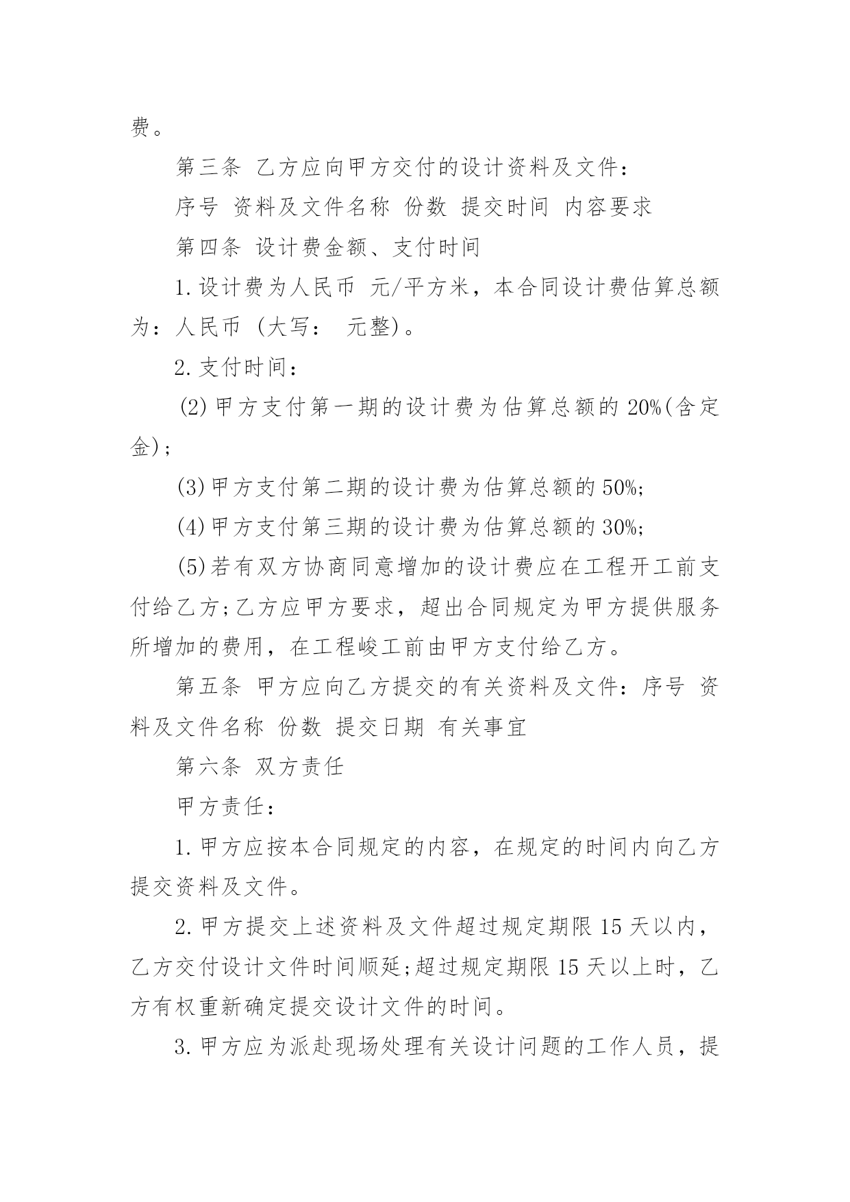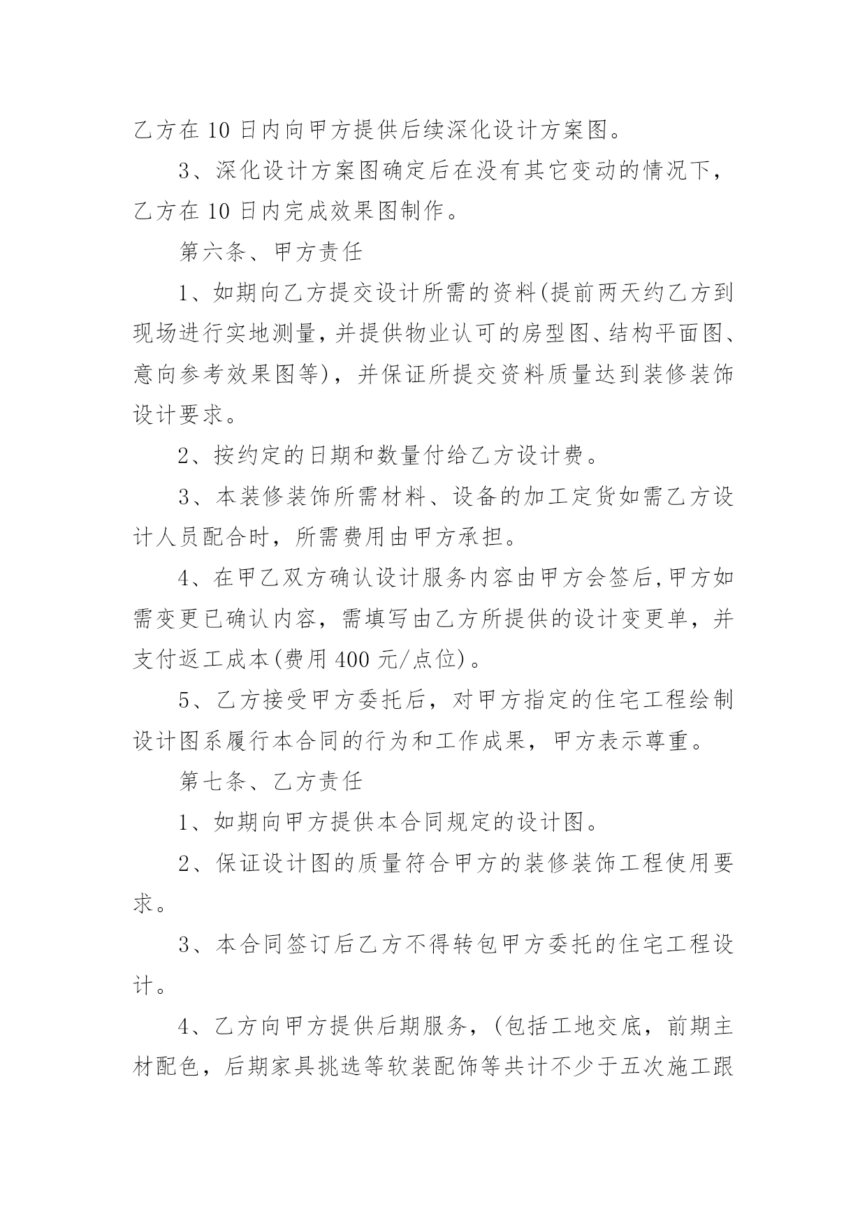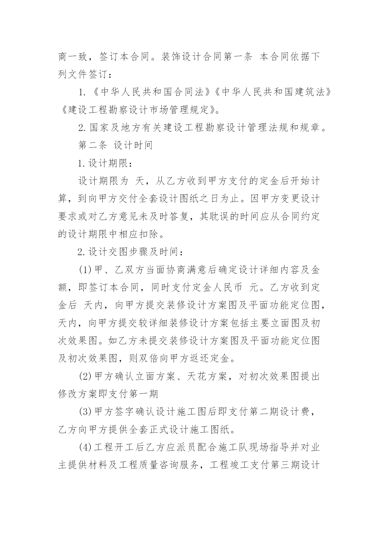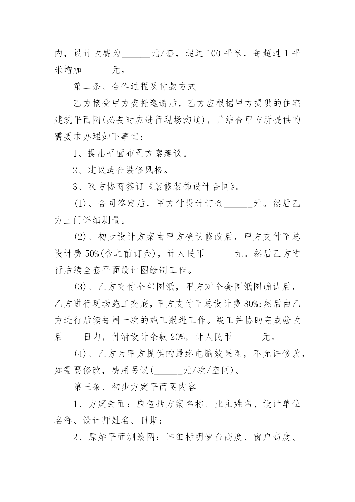 装饰装修设计合同装饰装修设计合同15篇在人们的法律意识不断增强的社会,合同在生活中的使用越来越广泛,它也是减少和防止发生争议的重要措施。那么制定合同书有什么需要注意的呢?以下是小编帮大家整理的装饰装修设计合同,仅供参考,欢迎大家阅读。装饰装修设计合同1甲方姓名:________身份证号:________工程地址(详细地址):________________联系方式:________联系电话:________邮箱:________乙方姓名:________联系电话:________邮箱:________经双方协商,依据《中华人民共和国民法典》以及《中国建筑装饰协会文件》中装协等相关文件规定,就甲方房屋装修装饰设计事宜,签订本合同,并共同履行。第一条、设计收费套内面积(建筑面积乘以0.85为套内面积)100平方米以内,设计收费为______元/套,超过100平米,每超过1平米增加______元。第二条、合作过程及付款方式乙方接受甲方委托邀请后,乙方应根据甲方提供的住宅建筑平面图(必要时应进行现场沟通),并结合甲方所提供的需要求办理如下事宜:1、提出平面布置方案建议。2、建议适合装修风格。3、双方协商签订《装修装饰设计合同》。(1)、合同签定后,甲方付设计订金______元。然后乙方上门详细测量。(2)、初步设计方案由甲方确认修改后,甲方支付至总设计费50%(含之前订金),计人民币______元。然后乙方进行后续全套平面设计图绘制工作。(3)、乙方交付全部图纸,甲方对全套图纸图确认后,乙方进行现场施工交底,甲方支付至总设计费80%;然后由乙方进行后续每周一次的施工跟进工作。竣工并协助完成验收后____日内,付清设计余款20%,计人民币______元。(4)、乙方为甲方提供的最终电脑效果图,不允许修改,如需要修改,费用另议(______元/次/空间)。第三条、初步方案平面图内容1、方案封面:应包括方案名称、业主姓名、设计单位名称、设计师姓名、日期;2、原始平面测绘图:详细标明窗台高度、窗户高度、门高、层高、空调孔位置,暖气位置、对讲机位置、上下水位置、强弱电箱位置、煤气表位置、顶部下水管高度。3、墙体改造定位图:需要表明房间名称,新砌墙体需文字表明使用何种材料,要详细标出改造墙体的细节尺寸,以便施工。4、平面布置图:表明房间名称,空间家具建议设计尺寸及家具名称,一切必须按实际比例绘制。第四条、后续全套图纸内容1、方案封面:应包括方案名称、业主姓名、设计单位名称、设计师姓名、日期;2、设计说明:应包括方案名称、空间性质、使用面积、主要使用装饰材料、充分体现设计四元素;3、原始测量图;详细标明窗台高度、窗户高度、门高、层高、空调孔位置,暖气位置、对讲机位置、上下水位置、强弱电箱位置、煤气表位置、顶部下水管高度。4、结构拆除图;需要表明房间名称,拆除墙体需要详细标出拆除墙体的细节尺寸,以便施工5、新砌墙体图;需要表明房间名称,新砌墙体需文字表明使用何种材料,要详细标出改造墙体的细节尺寸,以便施工。6、平面布置图;一切必须按实际比例绘制。7、家具尺寸图:表明房间名称,空间家具建议设计尺寸及家具名称。8、家具材质建议图:表明家具类型及选材9、地面布置图:表明房间名称,地面设计建议使用材料名称及规格。10、天花布置图;一切必须按实际比例绘制。11、天花尺寸图:标注详细,便于施工。12、天花材质说明图:必要时绘制天花大样图13、顶面灯具定位图:14、电源插座参考布置图:需要现场三方(业主、设计师、工长或水电工)定位。15、照明开关参考布置图:需要现场三方(业主、设计师、工长或水电工)定位。16、弱电位置参考布置图:需要现场三方(业主、设计师、工长或水电工)定位。17、水路走向参考图:需要现场三方(业主、设计师、工长或水电工)定位。18、暖气定位参考图:需要现场三方(业主、设计师、工长或水电工)定位。19、立面图(设计施工墙的立面图、现场制作的家具立面图)20、三维效果图(四张之内,因甲方要求,每增加一张效果图,甲方支付乙方______元。)第五条、完成设计日期的约定1、乙方从______年____月____日起(实际测量第二天算起),在7日内向甲方提供初步设计方案图;2、双方在约定时间内由甲方确认初步设计方案图后,乙方在10日内向甲方提供后续深化设计方案图。3、深化设计方案图确定后在没有其它变动的情况下,乙方在10日内完成效果图制作。第六条、甲方责任1、如期向乙方提交设计所需的资料(提前两天约乙方到现场进行实地测量,并提供物业认可的房型图、结构平面图、意向参考效果图等),并保证所提交资料质量达到装修装饰设计要求。2、按约定的日期和数量付给乙方设计费。3、本装修装饰所需材料、设备的加工定货如需乙方设计人员配合时,所需费用由甲方承担。4、在甲乙双方