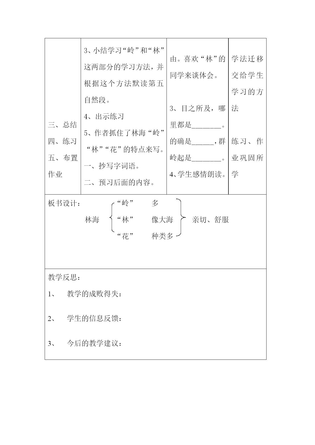 课题2、林海课型精讲课教学目标知识目标了解大兴安岭的美景。能力目标学习环境描写的方法情感目标体会作者的思想感情。练习有感情朗读课文。教学重点了解大兴安岭的美景,学习环境描写的方法。教学难点体会作者的思想感情。教学用具音乐、录音机。教学方法讲读法、自主合作探究教学过程设计教学环节教师活动学生活动设计意图一、导入新课。二、整体感知,深入学习1、范读。2、听录音朗读,出示问题:(1)课文从哪几个方面来描写大兴安岭的,找出各自的特点。(2)为什么把大兴安岭的林称作“林海”。它到底哪个地方像海呢?1、让学生说说听后的感受,学生字、释词2、选择自己喜欢的部分重点阅读。喜欢“岭”这一部分的同学来说理激发学生的学习兴趣进行个性化阅读和感悟三、总结四、练习五、布置作业3、小结学习“岭”和“林”这两部分的学习方法,并根据这个方法默读第五自然段。4、出示练习5、作者抓住了林海“岭”“林”“花”的特点来写。一、抄写字词语。二、预习后面的内容。由。喜欢“林”的同学来谈体会。3、目之所及,哪里都是________。的确是______,群岭起是________。4、学生感情朗读。学法迁移交给学生学习的方法练习、作业巩固所学板书设计:“岭”多林海“林”像大海亲切、舒服“花”种类多教学反思:教学的成败得失:学生的信息反馈:今后的教学建议: