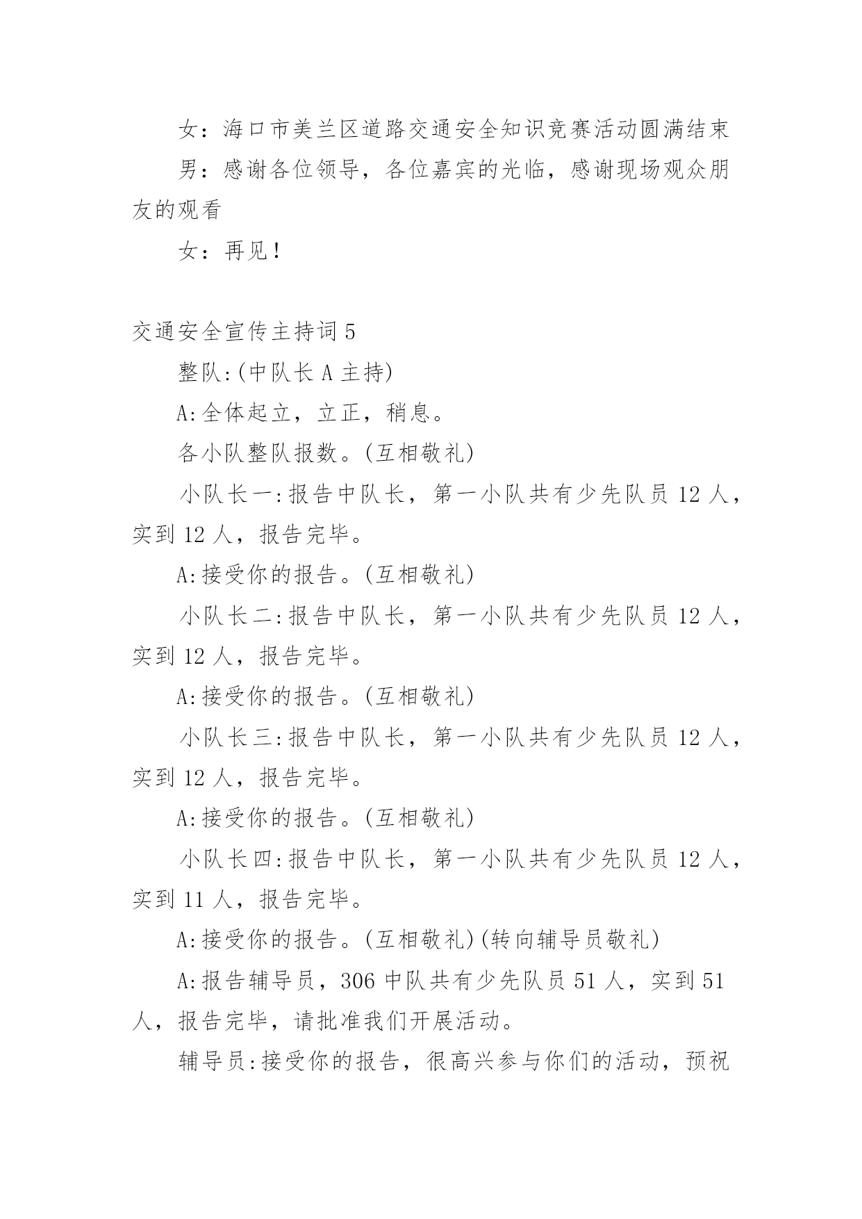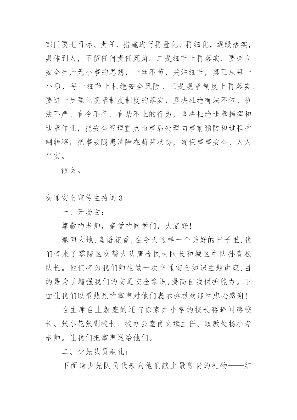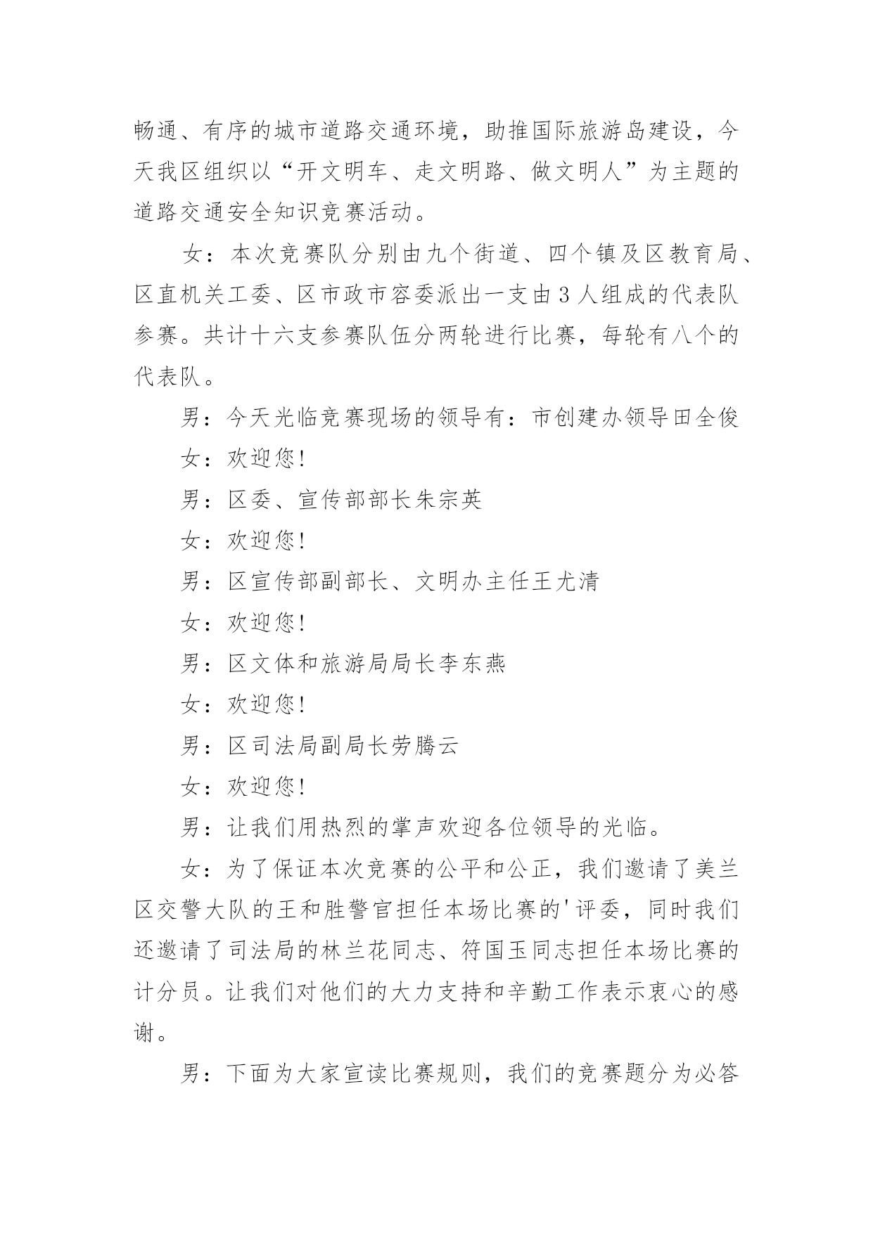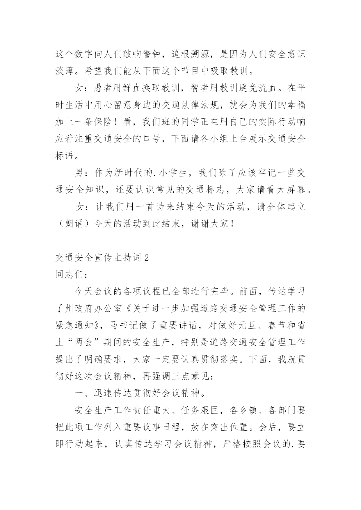 交通安全宣传主持词主持词的写作需要将主题贯穿于所有节目之中。在当今不断发展的世界,很多晚会、集会都通过主持人来活跃气氛,快来参考主持词是怎么写的吧,以下是小编为大家收集的交通安全宣传主持词,欢迎阅读,希望大家能够喜欢。交通安全宣传主持词1男:当我们坐在宽敞明亮的教室,聆听老师的教导时女:当我们愉快地开展班会活动,一起让心灵放飞时男:当大家沉浸在欢乐和幸福中时,你可曾想到,安全是多么重要!女:或许你不会相信,但意外已经发生,不幸征悄悄来临……男:大家请看大屏幕,每天,路上都在发生着另人极度痛心的一幕(播放图片)一次次无奈的叹息,一声声绝望的呼喊,都换不回亲人的生命……女:同学们,这一幕幕触目惊心的画面正在用鲜血和生命换来了教训,使我们警惕,让我们痛心!这在向我们传达着一个信息——交通安全,重于泰山!下面请听张欣怡等带来的演讲《交通安全,重于泰山》男:据统计,我国每年因事故死亡人数约十万人,道路交通死亡人数占60%。我国的交通事故死亡人数居世界首位,平均每天280人死于车祸,其中中小学生占总人数的8%左右。这个数字向人们敲响警钟,追根溯源,是因为人们安全意识淡薄。希望我们能从下面这个节目中吸取教训。女:愚者用鲜血换取教训,智者用教训避免流血。在平时生活中用心留意身边的交通法律法规,就会为我们的幸福加上一条保险!看,我们班的同学正在用自己的实际行动响应着注重交通安全的口号,下面请各小组上台展示交通安全标语。男:作为新时代的.小学生,我们除了应该牢记一些交通安全知识,还要认识常见的交通标志,大家请看大屏幕。女:让我们用一首诗来结束今天的活动,请全体起立(朗诵)今天的活动到此结束,谢谢大家!交通安全宣传主持词2同志们:今天会议的各项议程已全部进行完毕。前面,传达学习了州政府办公室《关于进一步加强道路交通安全管理工作的紧急通知》,马书记做了重要讲话,对做好元旦、春节和省上“两会”期间的安全生产,特别是道路交通安全管理工作提出了明确要求,大家一定要认真贯彻落实。下面,我就贯彻好这次会议精神,再强调三点意见:一、迅速传达贯彻好会议精神。安全生产工作责任重大、任务艰巨,各乡镇、各部门要把此项工作列入重要议事日程,放在突出位置。会后,要立即行动起来,认真传达学习会议精神,严格按照会议的.要求,进一步提高对安全生产工作重要性、紧迫性、艰巨性的认识,切实靠实领导和工作人员责任,狠抓工作措施落实,切实把会议精神转化为工作动力,全力推动全县安全生产工作再上新台阶。二、切实增强做好安全生产工作的责任性和主动性。一是加强节日期间安全生产工作组织领导。各乡镇、各部门要充分认识做好“两节”和省上“两会”期间安全生产工作的重要性和必要性,增强工作责任感和紧迫感。二是突出重点,切实加强安全监管,特别要加强道路交通、-、公共聚集场所消防安全、建筑施工等行业的安全监管,确保节日安全。三是强化措施,坚决杜绝各类安全事故发生。各单位要认真开展本辖区、本行业的安全检查,切实将两节及省上“两会”期间我县的安全生产工作抓紧、抓实、抓好,预防和减少安全事故的发生。四是要落实责任,把群众安全置于一切工作首位。各相关职能部门要切实履行安全监管职责,各企业要真正落实安全生产主体责任,健全和落实各项安全生产制度,层层抓好落实。三、狠抓安全生产各项工作举措的落实。抓安全生产不能停留在动员、部署、开会上,要真正地落实到行动中。当前安全生产工作目标任务、工作措施已经明确,接下去关键就是围绕目标和措施去细化和落实。各乡镇、各部门、各单位要进一步明确工作任务,层层落实责任,结合各自实际,认认真真把安全生产各项工作举措落到实处,着力做好三个方面的工作:一是责任上再落实。各乡镇、各部门要把目标、责任、措施进行再量化、再细化,逐级落实,具体到人,不留任何责任死角。二是细节上再落实。要树立安全生产无小事的思想,一丝不苟,关注细节,真正从每一小项、每一细节上杜绝安全风险。三是规章制度上再落实。要进一步强化规章制度制度的落实,坚决杜绝有法不依、执法不严、有令不行、有禁不止的行为,坚决杜绝违章指挥和违章作业,把安全管理重点由事后处理向事前预防和过程控制转移,把事故隐患消除在萌芽状态,确保事事安全、人人平安。散会。交通安全宣传主持词3一、开场白:尊敬的老师,亲爱的同学们,大家好!春回大地,鸟语花香,在今天这样一个美好的日子里,我们请来了零陵区交警大队唐合民大队长和城区中队孙青松队长。他们将为我们师生做一次交通安全知识主题讲座,目的是为了增强我们的交通安全意识,提高自我保护能力。下面让我们以最热烈的掌声对他们表示热烈欢迎和忠心感谢!在主席台上就座的还有徐家井小学的校长蒋晓闻蒋校长、张小花张副校长、校办公室肖文斌主任、政教处杨小专老师。让我们把掌声送给他们。二、少先队员献礼:下面请少先队员代表向他们献上最尊贵的礼物