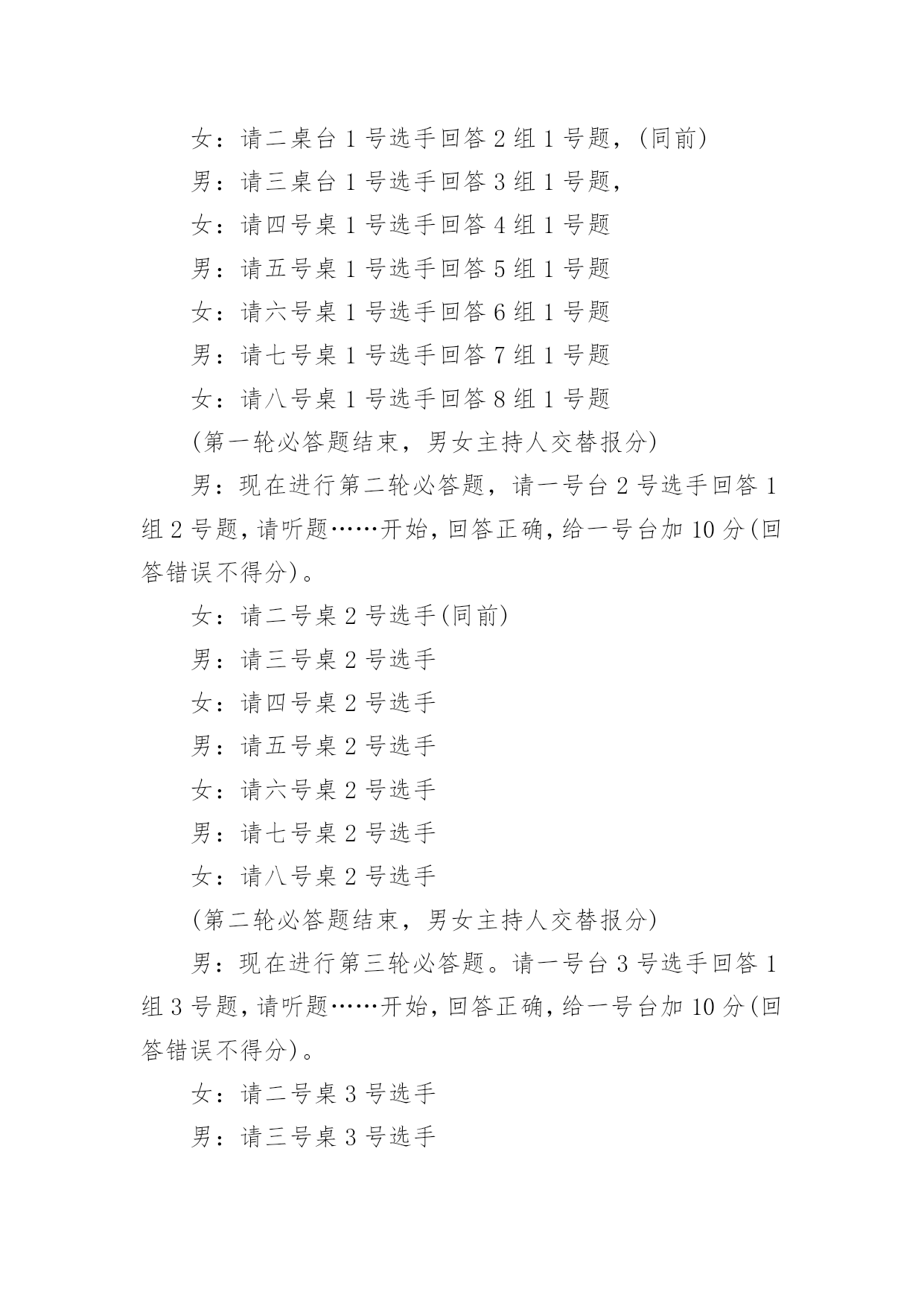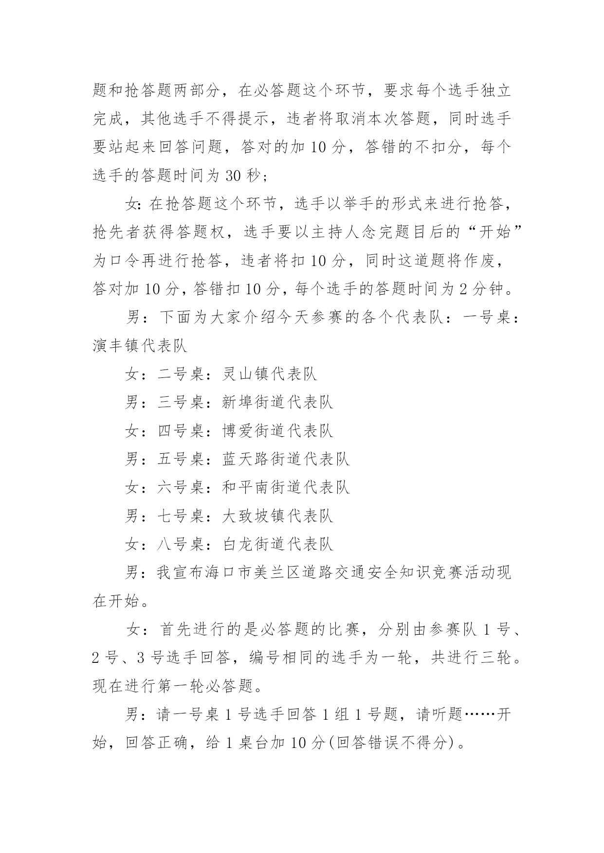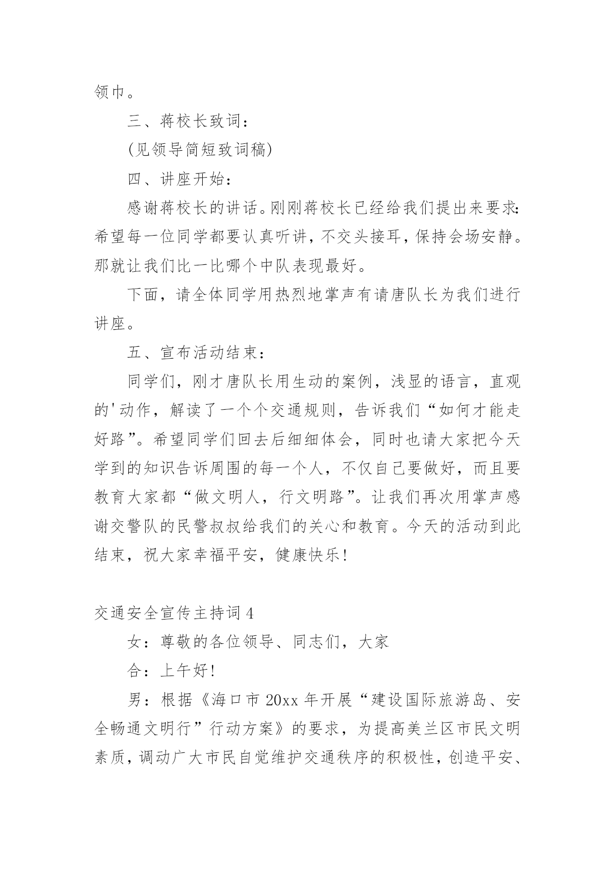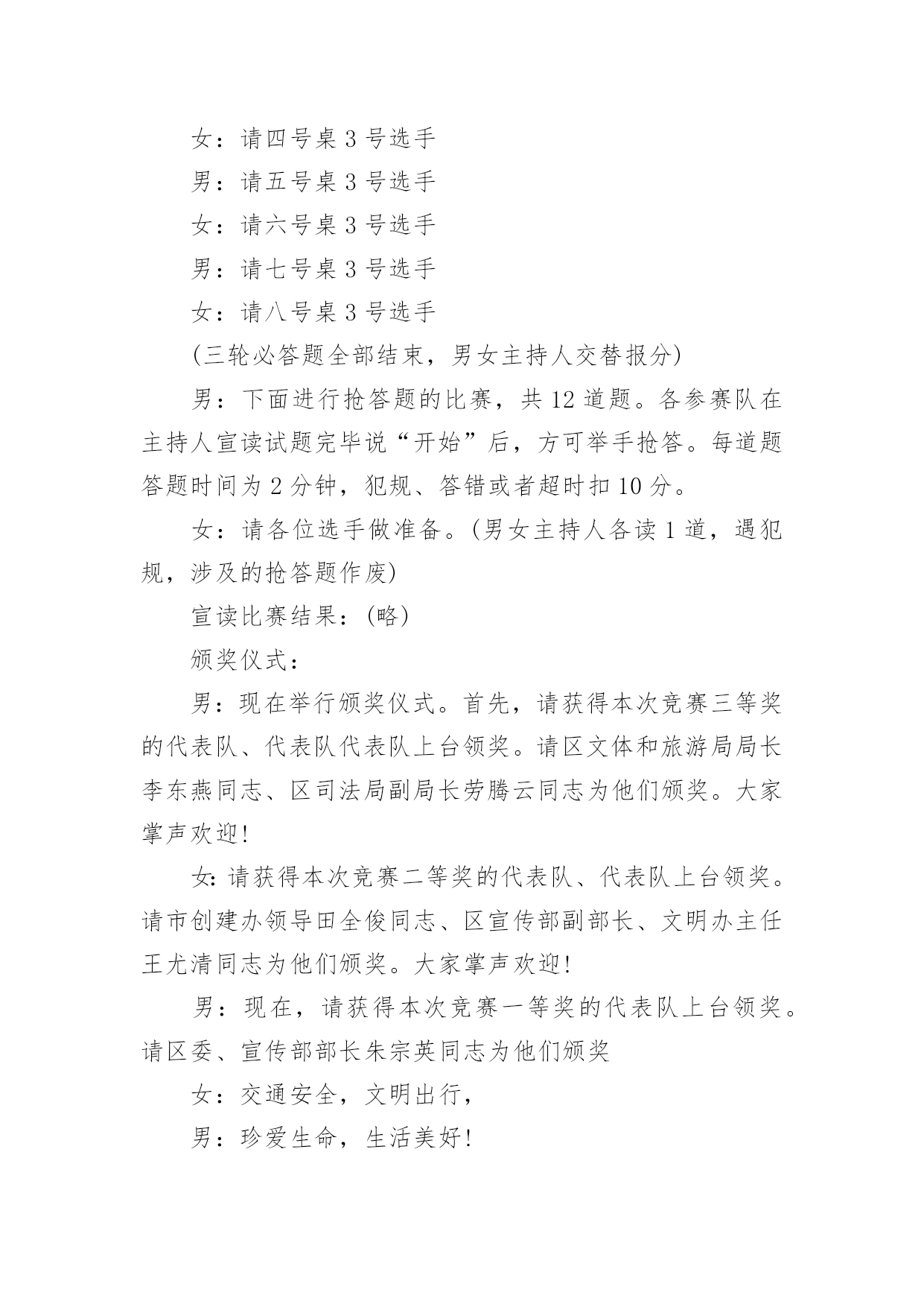 交通安全宣传主持词主持词的写作需要将主题贯穿于所有节目之中。在当今不断发展的世界,很多晚会、集会都通过主持人来活跃气氛,快来参考主持词是怎么写的吧,以下是小编为大家收集的交通安全宣传主持词,欢迎阅读,希望大家能够喜欢。交通安全宣传主持词1男:当我们坐在宽敞明亮的教室,聆听老师的教导时女:当我们愉快地开展班会活动,一起让心灵放飞时男:当大家沉浸在欢乐和幸福中时,你可曾想到,安全是多么重要!女:或许你不会相信,但意外已经发生,不幸征悄悄来临……男:大家请看大屏幕,每天,路上都在发生着另人极度痛心的一幕(播放图片)一次次无奈的叹息,一声声绝望的呼喊,都换不回亲人的生命……女:同学们,这一幕幕触目惊心的画面正在用鲜血和生命换来了教训,使我们警惕,让我们痛心!这在向我们传达着一个信息——交通安全,重于泰山!下面请听张欣怡等带来的演讲《交通安全,重于泰山》男:据统计,我国每年因事故死亡人数约十万人,道路交通死亡人数占60%。我国的交通事故死亡人数居世界首位,平均每天280人死于车祸,其中中小学生占总人数的8%左右。这个数字向人们敲响警钟,追根溯源,是因为人们安全意识淡薄。希望我们能从下面这个节目中吸取教训。女:愚者用鲜血换取教训,智者用教训避免流血。在平时生活中用心留意身边的交通法律法规,就会为我们的幸福加上一条保险!看,我们班的同学正在用自己的实际行动响应着注重交通安全的口号,下面请各小组上台展示交通安全标语。男:作为新时代的.小学生,我们除了应该牢记一些交通安全知识,还要认识常见的交通标志,大家请看大屏幕。女:让我们用一首诗来结束今天的活动,请全体起立(朗诵)今天的活动到此结束,谢谢大家!交通安全宣传主持词2同志们:今天会议的各项议程已全部进行完毕。前面,传达学习了州政府办公室《关于进一步加强道路交通安全管理工作的紧急通知》,马书记做了重要讲话,对做好元旦、春节和省上“两会”期间的安全生产,特别是道路交通安全管理工作提出了明确要求,大家一定要认真贯彻落实。下面,我就贯彻好这次会议精神,再强调三点意见:一、迅速传达贯彻好会议精神。安全生产工作责任重大、任务艰巨,各乡镇、各部门要把此项工作列入重要议事日程,放在突出位置。会后,要立即行动起来,认真传达学习会议精神,严格按照会议的.要求,进一步提高对安全生产工作重要性、紧迫性、艰巨性的认识,切实靠实领导和工作人员责任,狠抓工作措施落实,切实把会议精神转化为工作动力,全力推动全县安全生产工作再上新台阶。二、切实增强做好安全生产工作的责任性和主动性。一是加强节日期间安全生产工作组织领导。各乡镇、各部门要充分认识做好“两节”和省上“两会”期间安全生产工作的重要性和必要性,增强工作责任感和紧迫感。二是突出重点,切实加强安全监管,特别要加强道路交通、-、公共聚集场所消防安全、建筑施工等行业的安全监管,确保节日安全。三是强化措施,坚决杜绝各类安全事故发生。各单位要认真开展本辖区、本行业的安全检查,切实将两节及省上“两会”期间我县的安全生产工作抓紧、抓实、抓好,预防和减少安全事故的发生。四是要落实责任,把群众安全置于一切工作首位。各相关职能部门要切实履行安全监管职责,各企业要真正落实安全生产主体责任,健全和落实各项安全生产制度,层层抓好落实。三、狠抓安全生产各项工作举措的落实。抓安全生产不能停留在动员、部署、开会上,要真正地落实到行动中。当前安全生产工作目标任务、工作措施已经明确,接下去关键就是围绕目标和措施去细化和落实。各乡镇、各部门、各单位要进一步明确工作任务,层层落实责任,结合各自实际,认认真真把安全生产各项工作举措落到实处,着力做好三个方面的工作:一是责任上再落实。各乡镇、各部门要把目标、责任、措施进行再量化、再细化,逐级落实,具体到人,不留任何责任死角。二是细节上再落实。要树立安全生产无小事的思想,一丝不苟,关注细节,真正从每一小项、每一细节上杜绝安全风险。三是规章制度上再落实。要进一步强化规章制度制度的落实,坚决杜绝有法不依、执法不严、有令不行、有禁不止的行为,坚决杜绝违章指挥和违章作业,把安全管理重点由事后处理向事前预防和过程控制转移,把事故隐患消除在萌芽状态,确保事事安全、人人平安。散会。交通安全宣传主持词3一、开场白:尊敬的老师,亲爱的同学们,大家好!春回大地,鸟语花香,在今天这样一个美好的日子里,我们请来了零陵区交警大队唐合民大队长和城区中队孙青松队长。他们将为我们师生做一次交通安全知识主题讲座,目的是为了增强我们的交通安全意识,提高自我保护能力。下面让我们以最热烈的掌声对他们表示热烈欢迎和忠心感谢!在主席台上就座的还有徐家井小学的校长蒋晓闻蒋校长、张小花张副校长、校办公室肖文斌主任、政教处杨小专老师。让我们把掌声送给他们。二、少先队员献礼:下面请少先队员代表向他们献上最尊贵的礼物