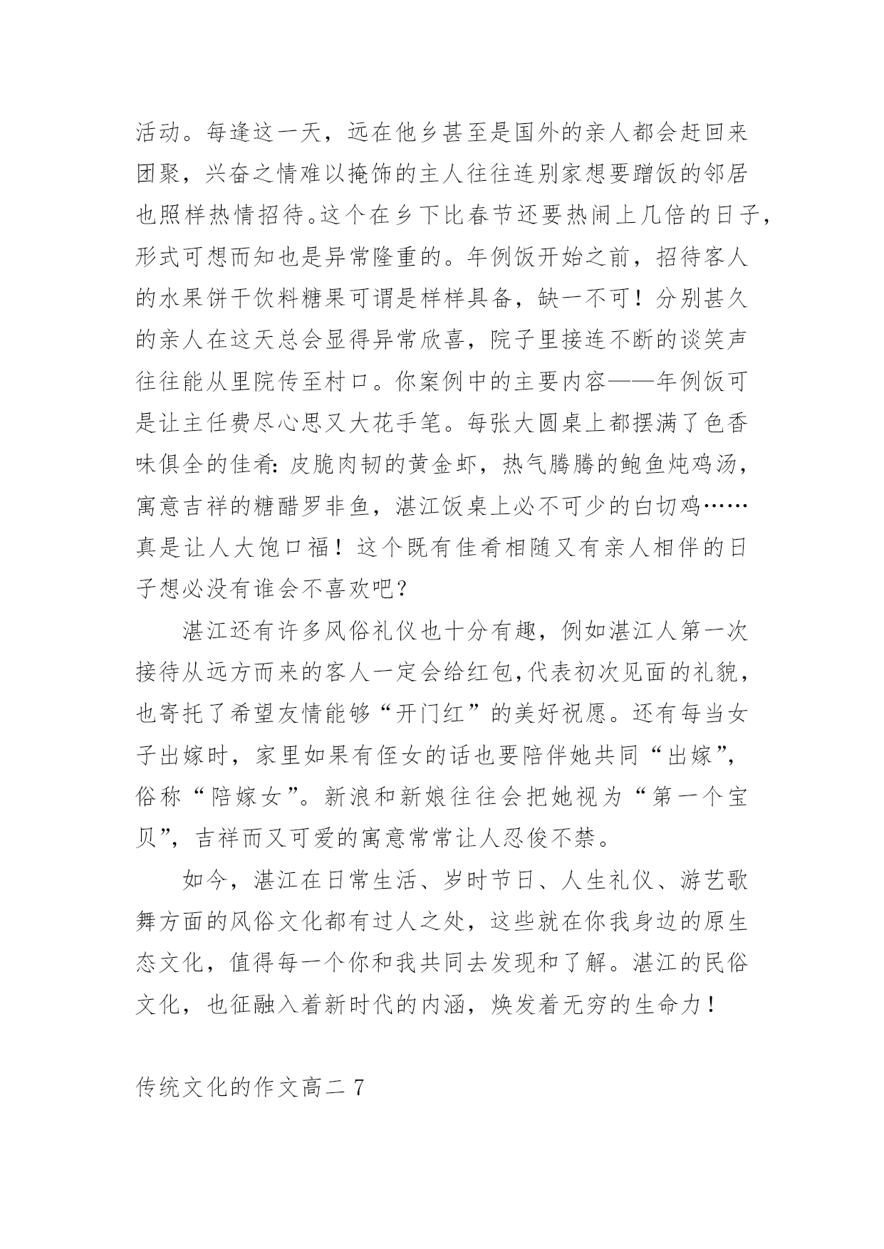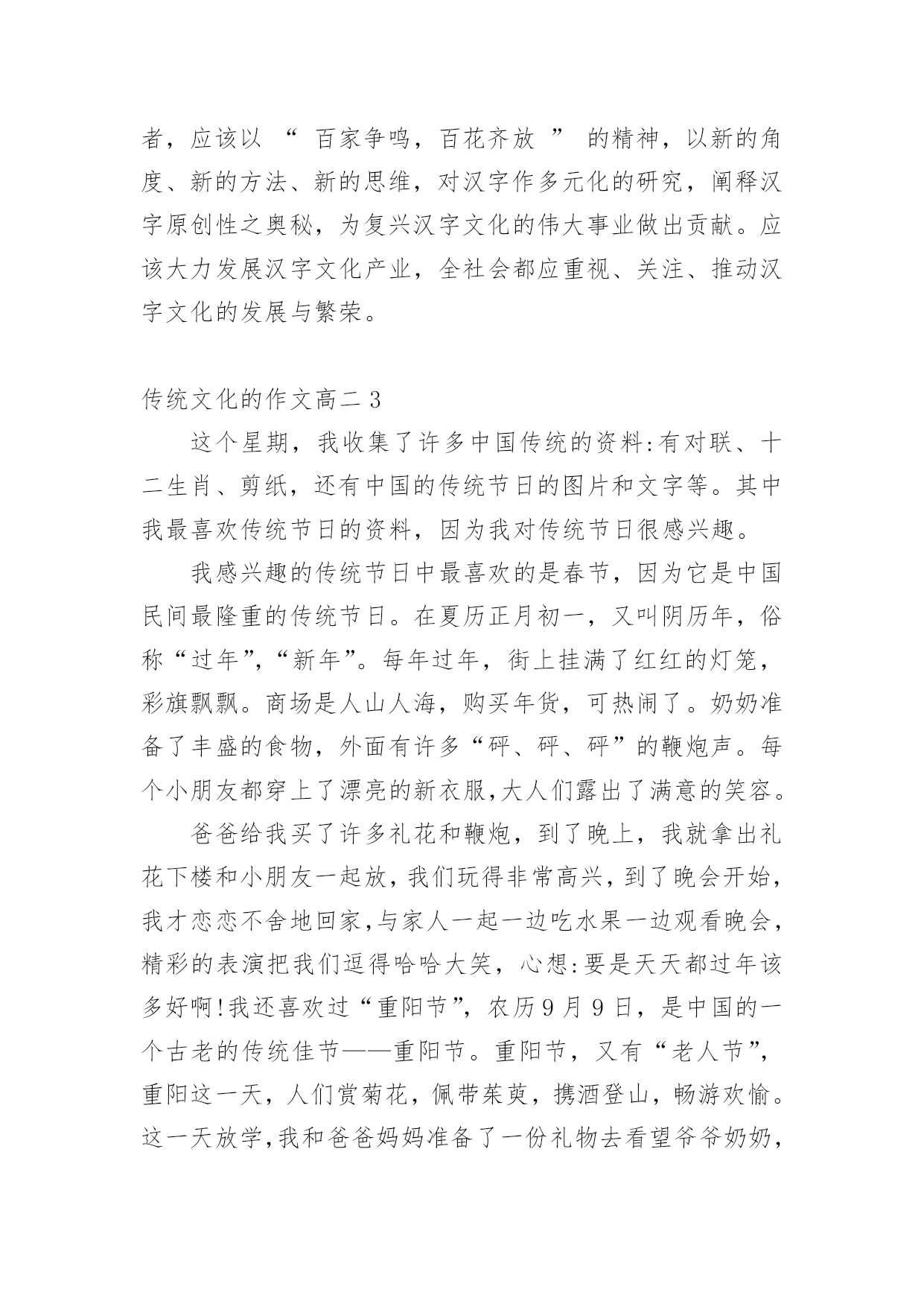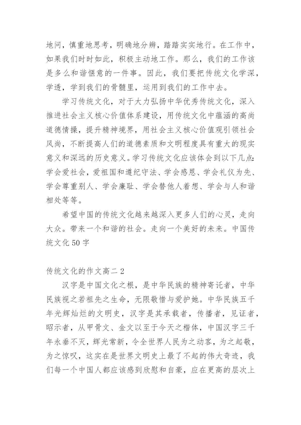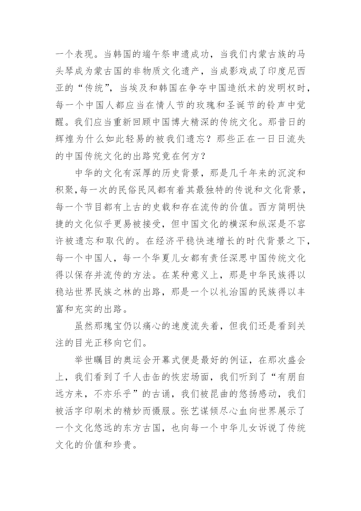 传统文化的作文高二无论在学习、工作或是生活中,大家最不陌生的就是作文了吧,通过作文可以把我们那些零零散散的思想,聚集在一块。作文的注意事项有许多,你确定会写吗?以下是小编为大家整理的传统文化的作文高二,欢迎阅读,希望大家能够喜欢。传统文化的作文高二1在学校领导对新教师的关心和重视下,在路老师的率领下。我有幸于20xx年5月23日到5月27日参加在昆明举办的中国传统文化的学习。这次学习受益颇多,对于中国传统文化有了一次深刻的了解。这也是一次文化大餐,丰富了大脑的知识。现将学习中国传统文化感受如下:学习传统文化,让我们的生活和工作更加和谐快乐,这既是我们学习传统文化的原因,又是这段时间以来我们学习传统文化的收获。以前,我们遇事很多时候都是根据自己当时当地的心情、情绪来处理面对的问题。如果我们学了传统文化,有一颗宽爱地心,我们会在矛盾冲突发生以前有预见性地化解矛盾,无论何时,都可以以一份"共情"的心,从对方的出发点考虑问题,理解对方,从而更有效地沟通思想,解决问题。《中庸》的博学之,审问之,慎思之,明辨之,笃行之。讲的是治学求进得道理。一个人要广泛地多方面学习,详细地问,慎重地思考,明确地分辨,踏踏实实地行。在工作中,如果我们时时如此,积极主动地工作。那么,我们的工作该是多么和谐惬意的一件事。因此,我们要把传统文化学深,学透,学到我们的骨髓里,运用到我们的工作中去。学习传统文化,对于大力弘扬中华优秀传统文化,深入推进社会主义核心价值体系建设,用传统文化中蕴涵的高尚道德情操,提升精神境界,用社会主义核心价值观引领社会风尚,不断提高人们的道德素质和文明程度具有重大的现实意义和深远的历史意义。学习传统文化应该体会到以下几点:学会爱社会,爱祖国和遵纪守法、学会感恩、学会礼仪为先、学会尊重别人、学会廉耻、学会替他人着想、学会与人和谐相处等等。希望中国的传统文化越来越深入更多人们的心灵,走向大众。带来一个和谐的社会。走向一个美好的未来。中国传统文化50字传统文化的作文高二2汉字是中国文化之根,是中华民族的精神寄讬者,中华民族视之若祖先之生命,无限敬惜与爱护她。中华民族五千年光辉灿烂的文明史,汉字是其承载者,传播者,见证者,昭示者,从甲骨文、金文以至于今天之楷体,中国汉字三千年永垂不灭,辉光常新,令全世界人民为之动客,为之起敬,为之惊叹,这实在是世界文明史上最了不起的伟大奇迹,我们每一个中国人都应该感到欣慰和自豪,应在更高的层次上学习和运用汉字、汉语,开掘五千年文化典籍的宝藏,继承它,宏扬它,创造更加美好灿烂的中华民族现代文化,贡献于世界,这应是我们每一个中华民族儿女义不容辞、责无旁贷的大任!二十世纪末,我国科学界、文化界的英才,终于发明了汉字输入法电脑打字机,其输入速度远超于拼音文字,同时创造了计算机汉字激光照排技术,以及电子出版系统,使印刷业高迅度发展,这也是我国乃至世界印刷史上的大事。先进的科学技术同汉字相结合,引起了国人对汉字的重新审视,同时也为复兴汉字文化创造了无比优越的条件。汉字究竟是科学的、智慧的文字,还是落后的、僵死的文字,将不辩自明矣。保卫汉字,复兴汉字文化,振兴中华民族文化、民族精神,是关乎中华民族腾飞发展,自强自立,为世界人民做出贡献的大事。汉字是民族的,越是民族的就越是世界的。宏扬汉字文化,使中华民族文化的精髓融入世界文化的血液之中,这是中华民族每一个炎黄子孙责无旁贷的大事。现在世界上约有85个国家的高校都设了汉语课,约有3000万人在学汉字、汉语,汉字、汉语走向世界,已经成为世界强势语言之一。21世纪,中国文化、东方文化,将会大展风采,为世界人民所欢迎。汉字是世界文字惟一仅存的最古老而又辉光常新的文字,汉字应申请世界文化遗产。国内,在西安或任何一个大城市,应建立中国汉字文化博览馆。文字研究者,语文教学者,应该以“百家争鸣,百花齐放”的精神,以新的角度、新的方法、新的思维,对汉字作多元化的研究,阐释汉字原创性之奥秘,为复兴汉字文化的伟大事业做出贡献。应该大力发展汉字文化产业,全社会都应重视、关注、推动汉字文化的发展与繁荣。传统文化的作文高二3这个星期,我收集了许多中国传统的资料:有对联、十二生肖、剪纸,还有中国的传统节日的图片和文字等。其中我最喜欢传统节日的资料,因为我对传统节日很感兴趣。我感兴趣的传统节日中最喜欢的是春节,因为它是中国民间最隆重的传统节日。在夏历正月初一,又叫阴历年,俗称“过年”,“新年”。每年过年,街上挂满了红红的灯笼,彩旗飘飘。商场是人山人海,购买年货,可热闹了。奶奶准备了丰盛的食物,外面有许多“砰、砰、砰”的鞭炮声。每个小朋友都穿上了漂亮的新衣服,大人们露出了满意的笑容。爸爸给我买了许多礼花和鞭炮,到了晚上,我就拿出礼花下楼和小朋友一起放,我们玩得非常高兴,到了晚会开始,我才恋恋不舍地回家,与家