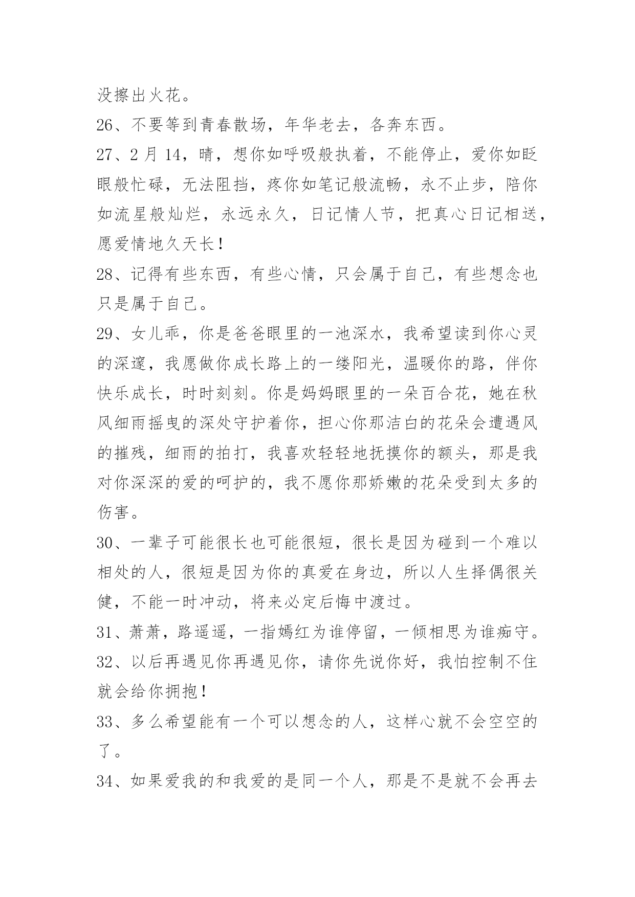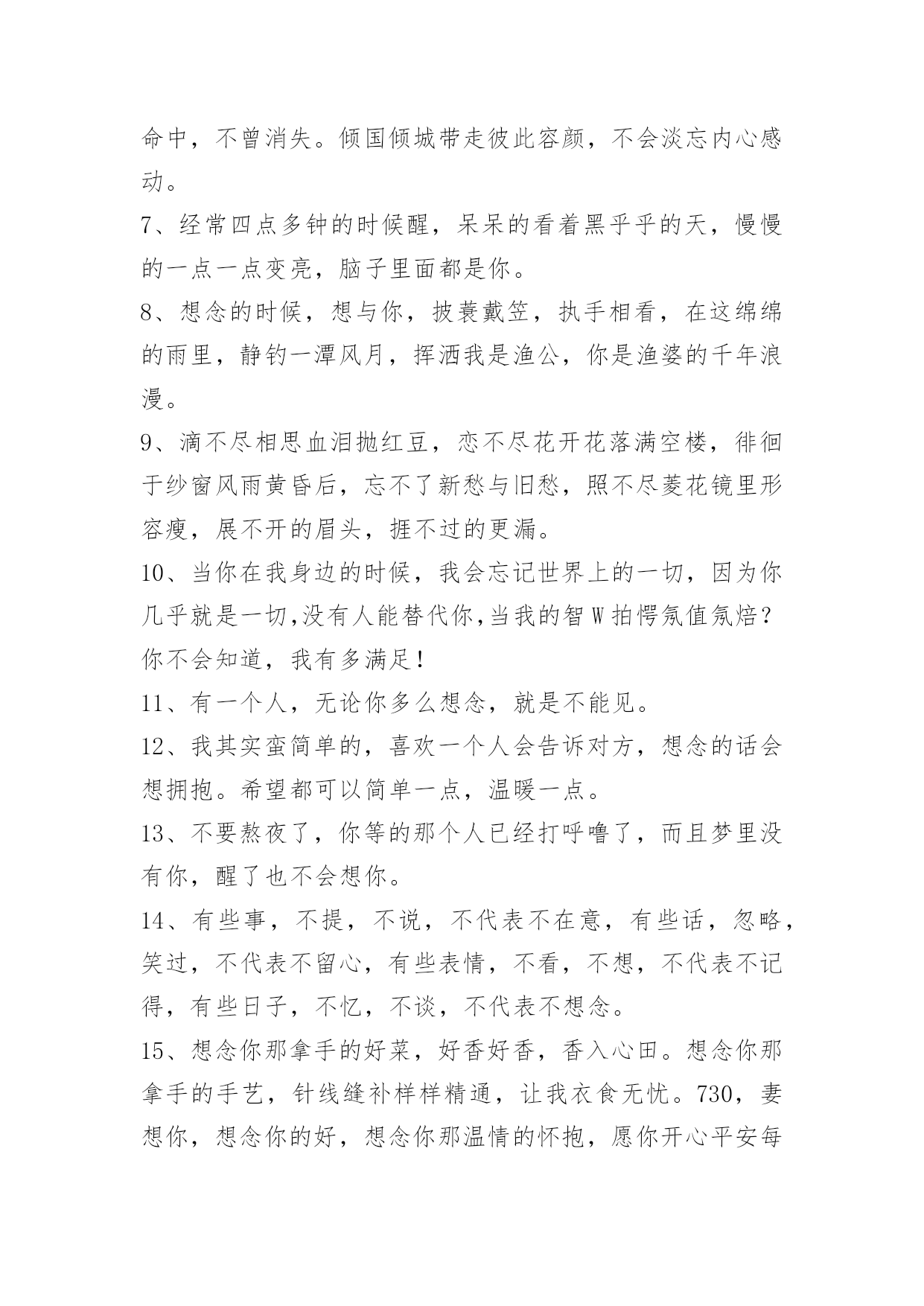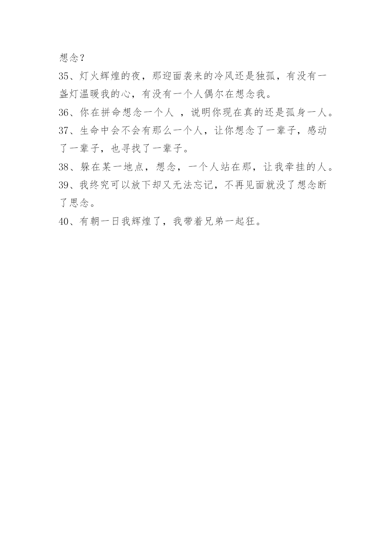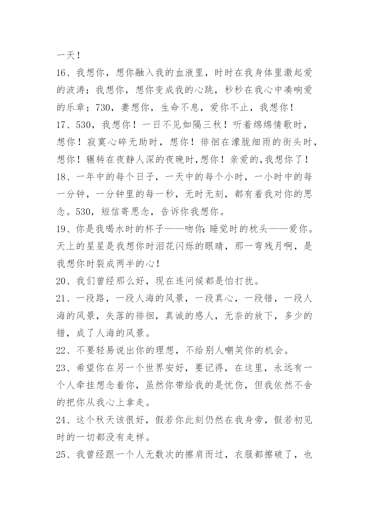想念个性朋友圈语录文案想念个性朋友圈语录文案(通用40句)生活就像盗梦空间,几年来,我总在一个人的角落偷偷想念,一切在没希望。错过就是错过了。几年的愧疚变成无尽的想念,也许时隔不久,你结婚有小孩,而我也许有我的家庭了吧。多想牵着你的小肉手过完人生。本篇文章是小编帮大家整理的想念个性朋友圈语录文案,欢迎阅读。1、到你,我怕触电;看不到你,我需要充电;如果没有你,我会断电。爱你是我的职业,想你是我的事业,抱你是我的特长,吻你是我的专业!2、飘动的树影,是我对你的思念;流淌的血液,是我对你的爱恋;天地间你我相遇,注定演绎一生情缘,不求曾经拥有,但求一生一世的相守3、我原不相信爱情有那样的魔力,可以让一个人为另一个人毫无保留的付出。直到――爱上你。4、尽日相思罗带缓。——严仁《玉楼春·春思》5、想念一个人,不需要语言,却需要的勇气。想一个人会多么寂寞,念一个人会多么心痛,想念一个人的夜会多么寒冷。想念一个人有时也许会面带微笑,但你的心却会流泪。如果,前世的`五百次回眸才换来今生的擦肩而过,那想来也就已经是很幸福的了,其实擦肩而过也是一种很深的缘份。6、很想你,是那么的想念你,那是一种慢慢腐蚀到心底的疼痛,时刻提醒着我,心中有你存在过,一直存在在我的生命中,不曾消失。倾国倾城带走彼此容颜,不会淡忘内心感动。7、经常四点多钟的时候醒,呆呆的看着黑乎乎的天,慢慢的一点一点变亮,脑子里面都是你。8、想念的时候,想与你,披蓑戴笠,执手相看,在这绵绵的雨里,静钓一潭风月,挥洒我是渔公,你是渔婆的千年浪漫。9、滴不尽相思血泪抛红豆,恋不尽花开花落满空楼,徘徊于纱窗风雨黄昏后,忘不了新愁与旧愁,照不尽菱花镜里形容瘦,展不开的眉头,捱不过的更漏。10、当你在我身边的时候,我会忘记世界上的一切,因为你几乎就是一切,没有人能替代你,当我的智W拍愕氖值氖焙?你不会知道,我有多满足!11、有一个人,无论你多么想念,就是不能见。12、我其实蛮简单的,喜欢一个人会告诉对方,想念的话会想拥抱。希望都可以简单一点,温暖一点。13、不要熬夜了,你等的那个人已经打呼噜了,而且梦里没有你,醒了也不会想你。14、有些事,不提,不说,不代表不在意,有些话,忽略,笑过,不代表不留心,有些表情,不看,不想,不代表不记得,有些日子,不忆,不谈,不代表不想念。15、想念你那拿手的好菜,好香好香,香入心田。想念你那拿手的手艺,针线缝补样样精通,让我衣食无忧。730,妻想你,想念你的好,想念你那温情的怀抱,愿你开心平安每一天!16、我想你,想你融入我的血液里,时时在我身体里激起爱的波涛;我想你,想你变成我的心跳,秒秒在我心中凑响爱的乐章;730,妻想你,生命不息,爱你不止,我想你!17、530,我想你!一日不见如隔三秋!听着绵绵情歌时,想你!寂寞心碎无助时,想你!徘徊在濛胧细雨的街头时,想你!辗转在夜静人深的夜晚时,想你!亲爱的,我想你了!18、一年中的每个日子,一天中的每个小时,一小时中的每一分钟,一分钟里的每一秒,无时无刻,都有着我对你的思念。530,短信寄思念,告诉你我想你。19、你是我喝水时的杯子——吻你;睡觉时的枕头——爱你。天上的星星是我想你时泪花闪烁的眼睛,那一弯残月啊,是我想你时裂成两半的心!20、我们曾经那么好,现在连问候都是怕打扰。21、一段路,一段人海的风景,一段真心,一段错,一段人海的风景,失落的徘徊,真诚的感人,无奈的放下,多少的错,成了人海的风景。22、不要轻易说出你的理想,不给别人嘲笑你的机会。23、希望你在另一个世界安好,要记得,在这里,永远有一个人牵挂想念着你,虽然你带给我的是忧伤,但我依然不舍的把你从我心上拿走。24、这个秋天该很好,假若你此刻仍然在我身旁,假若初见时的一切都没有走样。25、我曾经跟一个人无数次的擦肩而过,衣服都擦破了,也没擦出火花。26、不要等到青春散场,年华老去,各奔东西。27、2月14,晴,想你如呼吸般执着,不能停止,爱你如眨眼般忙碌,无法阻挡,疼你如笔记般流畅,永不止步,陪你如流星般灿烂,永远永久,日记情人节,把真心日记相送,愿爱情地久天长!28、记得有些东西,有些心情,只会属于自己,有些想念也只是属于自己。29、女儿乖,你是爸爸眼里的一池深水,我希望读到你心灵的深邃,我愿做你成长路上的一缕阳光,温暖你的路,伴你快乐成长,时时刻刻。你是妈妈眼里的一朵百合花,她在秋风细雨摇曳的深处守护着你,担心你那洁白的花朵会遭遇风的摧残,细雨的拍打,我喜欢轻轻地抚摸你的额头,那是我对你深深的爱的呵护的,我不愿你那娇嫩的花朵受到太多的伤害。30、一辈子可能很长也可能很短,很长是因为碰到一个难以相处的人,很短是因为你的真爱在身边,所以人生择偶很关健,不能一时冲动,将来必定后悔中渡过。31、萧萧,路遥遥,一指嫣红为谁停留,一倾相思为谁痴守。32、以