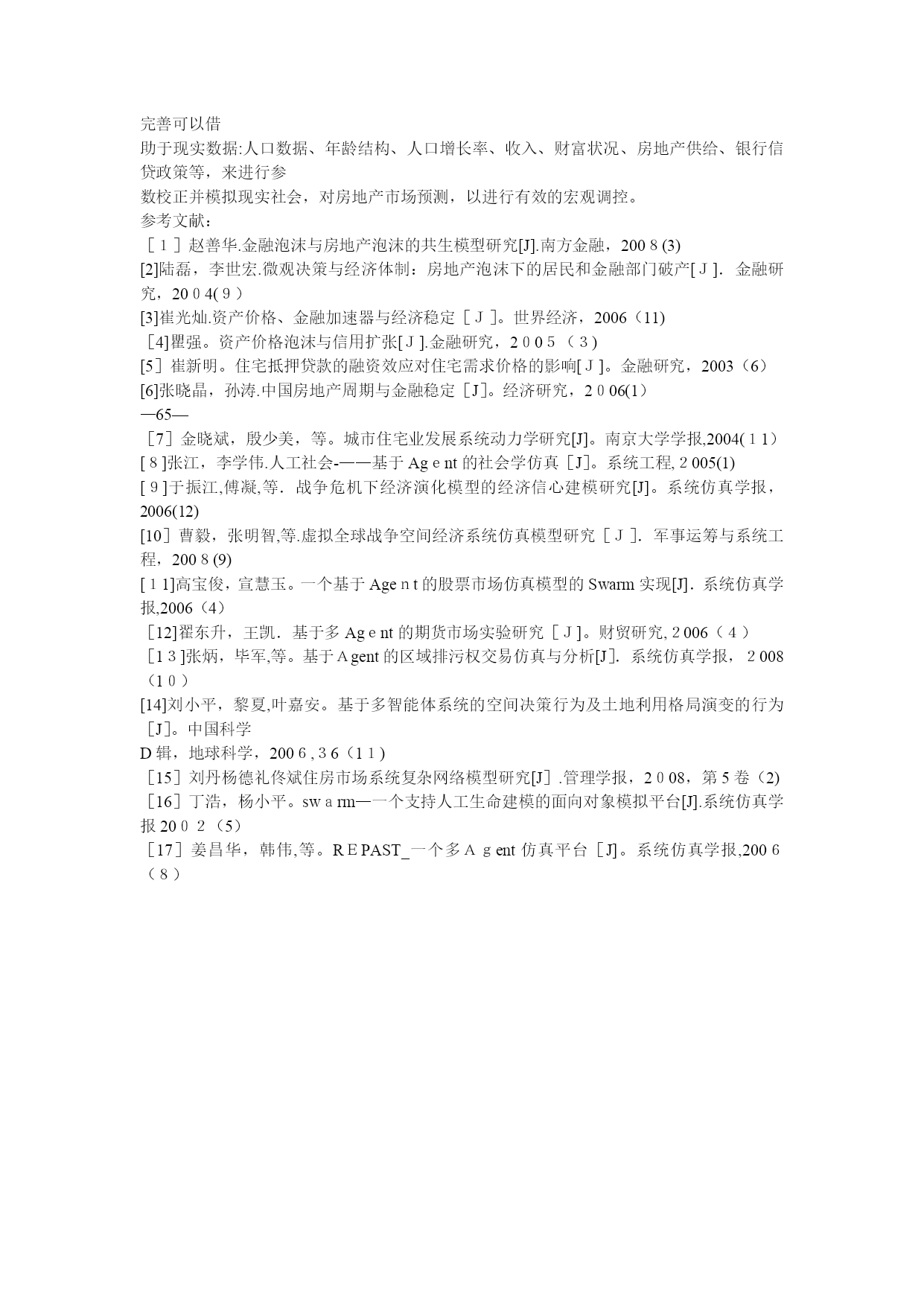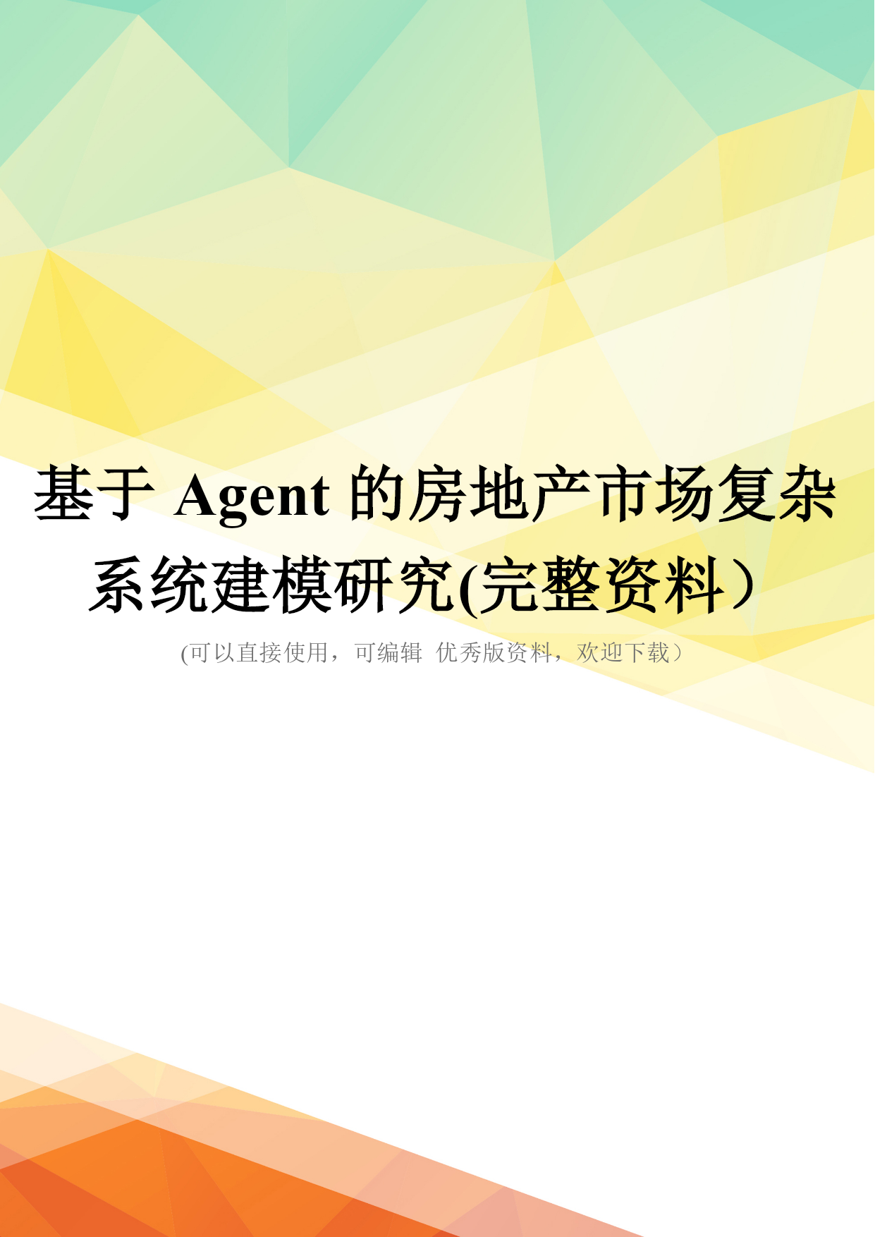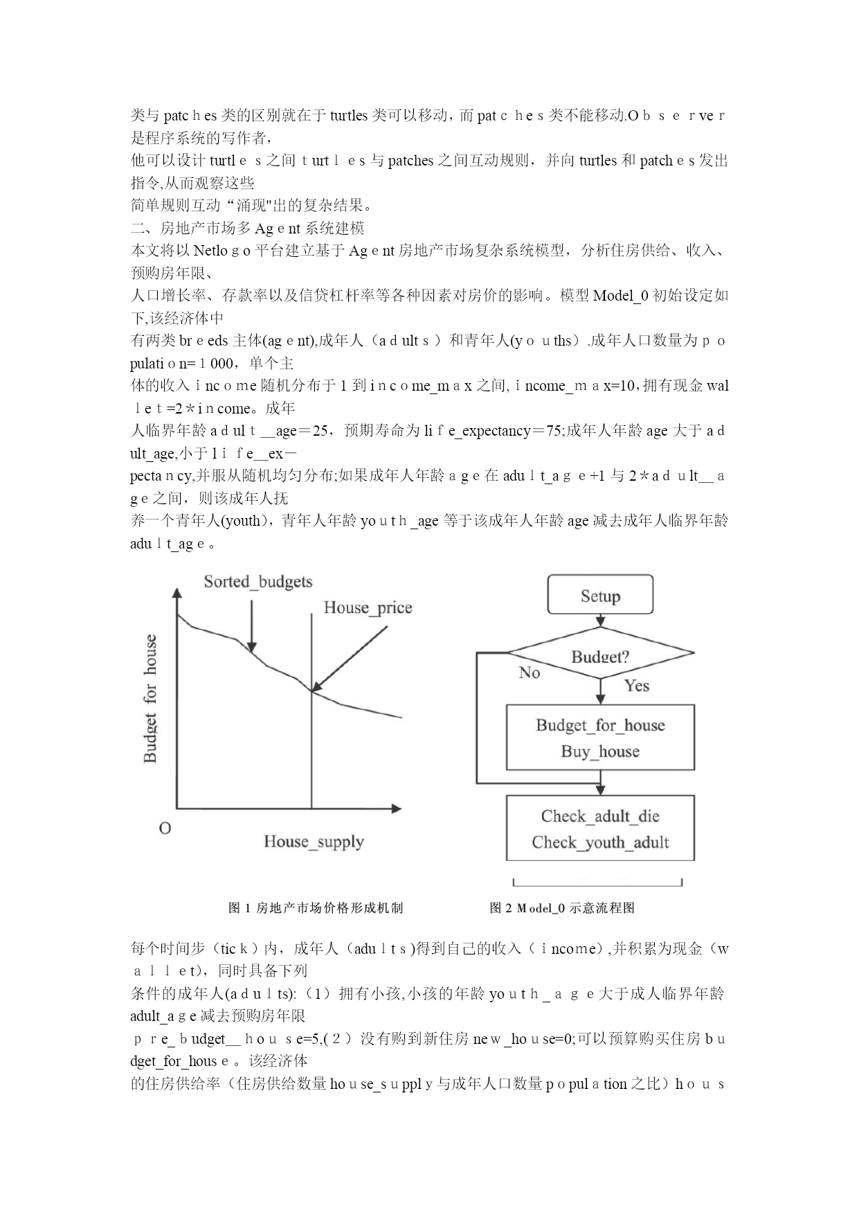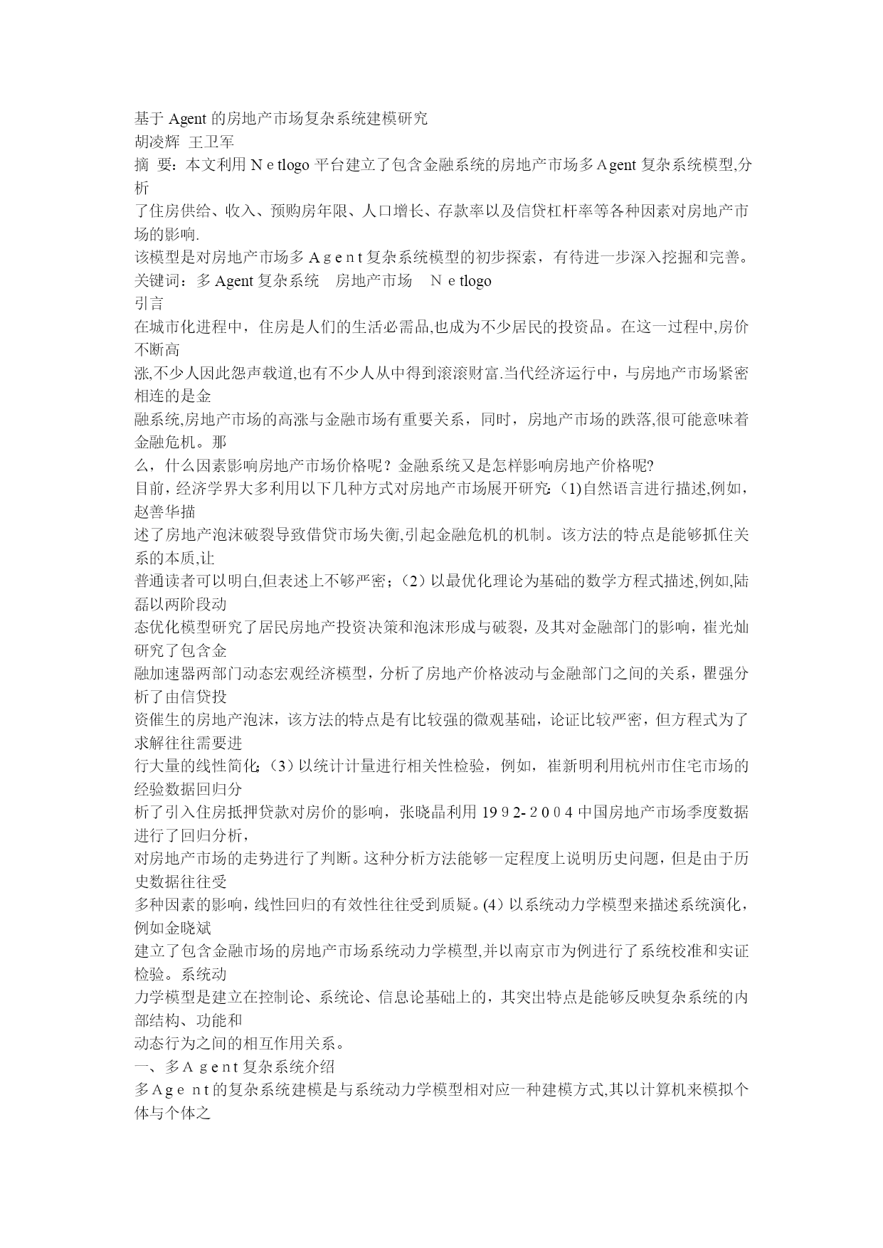 基于Agent的房地产市场复杂系统建模研究(完整资料)(可以直接使用,可编辑优秀版资料,欢迎下载)基于Agent的房地产市场复杂系统建模研究胡凌辉王卫军摘要:本文利用Netlogo平台建立了包含金融系统的房地产市场多Agent复杂系统模型,分析了住房供给、收入、预购房年限、人口增长、存款率以及信贷杠杆率等各种因素对房地产市场的影响.该模型是对房地产市场多Agent复杂系统模型的初步探索,有待进一步深入挖掘和完善。关键词:多Agent复杂系统房地产市场Netlogo引言在城市化进程中,住房是人们的生活必需品,也成为不少居民的投资品。在这一过程中,房价不断高涨,不少人因此怨声载道,也有不少人从中得到滚滚财富.当代经济运行中,与房地产市场紧密相连的是金融系统,房地产市场的高涨与金融市场有重要关系,同时,房地产市场的跌落,很可能意味着金融危机。那么,什么因素影响房地产市场价格呢?金融系统又是怎样影响房地产价格呢?目前,经济学界大多利用以下几种方式对房地产市场展开研究:(1)自然语言进行描述,例如,赵善华描述了房地产泡沫破裂导致借贷市场失衡,引起金融危机的机制。该方法的特点是能够抓住关系的本质,让普通读者可以明白,但表述上不够严密;(2)以最优化理论为基础的数学方程式描述,例如,陆磊以两阶段动态优化模型研究了居民房地产投资决策和泡沫形成与破裂,及其对金融部门的影响,崔光灿研究了包含金融加速器两部门动态宏观经济模型,分析了房地产价格波动与金融部门之间的关系,瞿强分析了由信贷投资催生的房地产泡沫,该方法的特点是有比较强的微观基础,论证比较严密,但方程式为了求解往往需要进行大量的线性简化;(3)以统计计量进行相关性检验,例如,崔新明利用杭州市住宅市场的经验数据回归分析了引入住房抵押贷款对房价的影响,张晓晶利用1992-2004中国房地产市场季度数据进行了回归分析,对房地产市场的走势进行了判断。这种分析方法能够一定程度上说明历史问题,但是由于历史数据往往受多种因素的影响,线性回归的有效性往往受到质疑。(4)以系统动力学模型来描述系统演化,例如金晓斌建立了包含金融市场的房地产市场系统动力学模型,并以南京市为例进行了系统校准和实证检验。系统动力学模型是建立在控制论、系统论、信息论基础上的,其突出特点是能够反映复杂系统的内部结构、功能和动态行为之间的相互作用关系。一、多Agent复杂系统介绍多Agent的复杂系统建模是与系统动力学模型相对应一种建模方式,其以计算机来模拟个体与个体之间、个体与环境之间互动,从而“涌现”出整体宏观特征的一种自下而上的建模。其建模的一般过程是,首先观察社会现实并抽象出一系列的假设,其次,根据假设建立Agent的个体模型以及Agent之间的相互作用规则,接下来通过计算机仿真观察复杂系统宏观涌现结果和动态,最后根据观察结果得出结论从而对社会现实现象进行解释,还可以修改模型的参数和规则,观察参数如何影响模型的涌现结果。可见,基于多A-gent复杂系统建模比系统动力学模型更易把握,更容易组织,更符合现实,并能够克服其他三种方法的缺陷。基于多Agent复杂系统建模自20世纪90年代以来得到越来越广泛应用.于振江以Swarm平台展示了战争危机下基于信心的多Agent复杂经济系统建模。曹毅以Swarm平台对虚拟战争空间下的仿真经济系统遭受电力中断等恐怖袭击进行了分析;高宝俊以Swarm平台建立一个基于Agent的连续竞价股票市场模型,翟东升以swarm平台建立了期货市场离散事件仿真模型,张炳利用netlogo以江苏常州地区为原型对多Agent的排污权交易进行了模拟。在房地产市场的研究中,刘小平建立了包含环境层和多智能A-gent-——居民、房地产商、政府之间,以及Agent之间相互作用而导致城市空间结构演化模型,并利用GIS信息系统对广州市海珠区1995-2004土地利用变化情况进行了模拟,取得了良好的效果.刘丹建立了包—62—含银行、房地产开发商、购房消费者三级节点的住房市场系统复杂网络模型,刻画了住房市场系统的结构特性和动态演化特性。基于多Agent的建模工具90年代以来得到了迅速推广。SantaFe研究院于1995年发布了SWARM的beta版本,美国Northwestern大学CCL(theCenterforConnectedLearning)研究中心于1999年推出Netlogo,美国Chicago大学于2000年1月推出Repast(RecursivePorusAgentSimulationTookit)1.0版本,美国麻省理工学院(MIT)MediaLaboratoryandTeacheducationprogram于2000年发