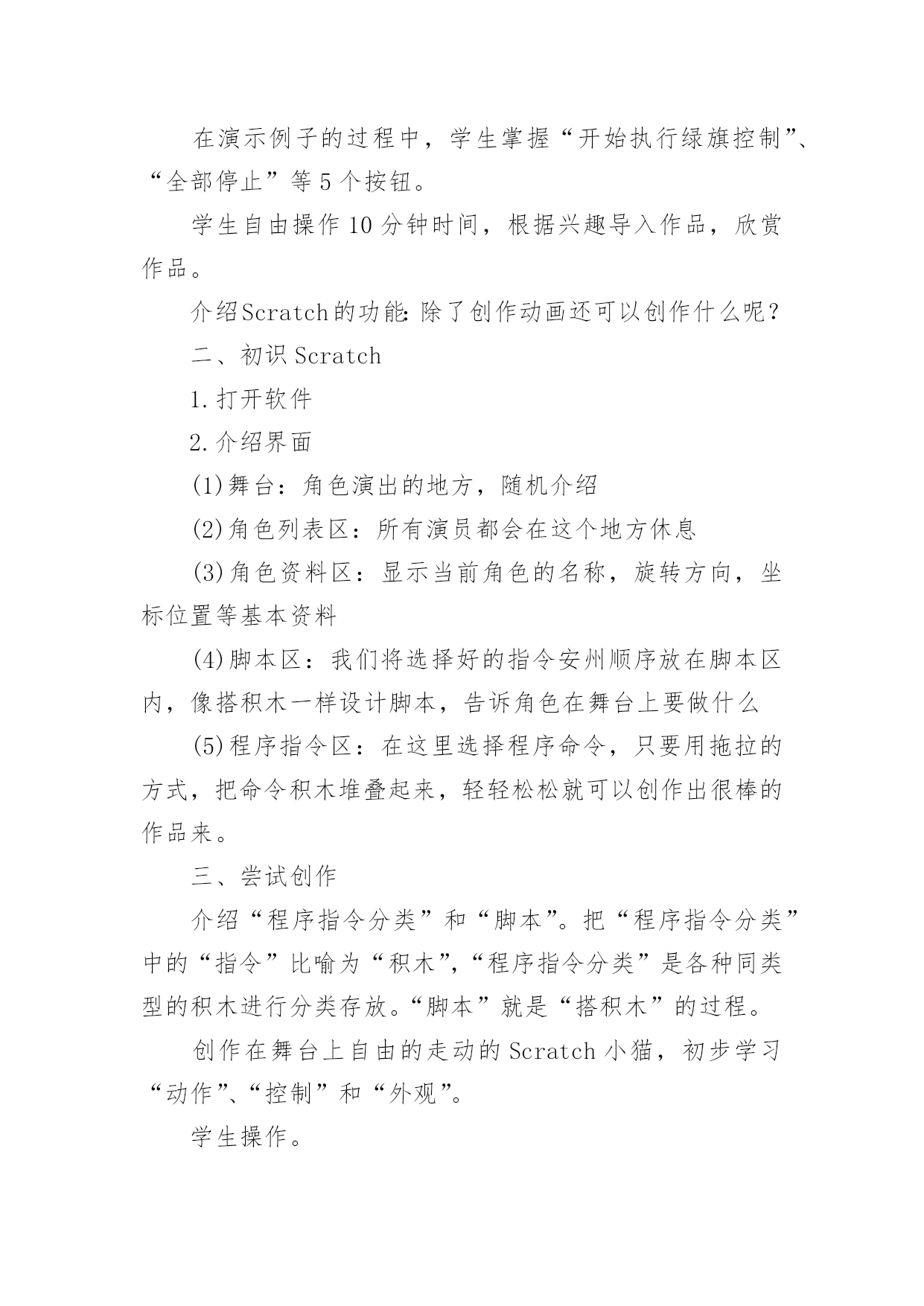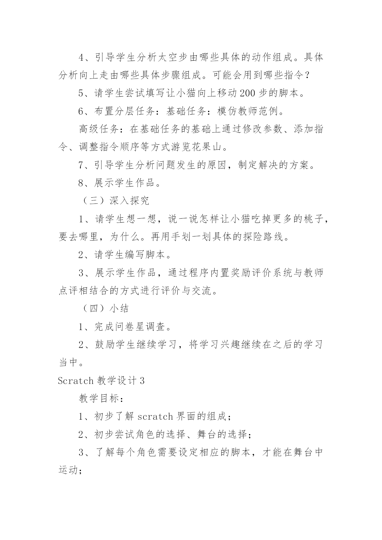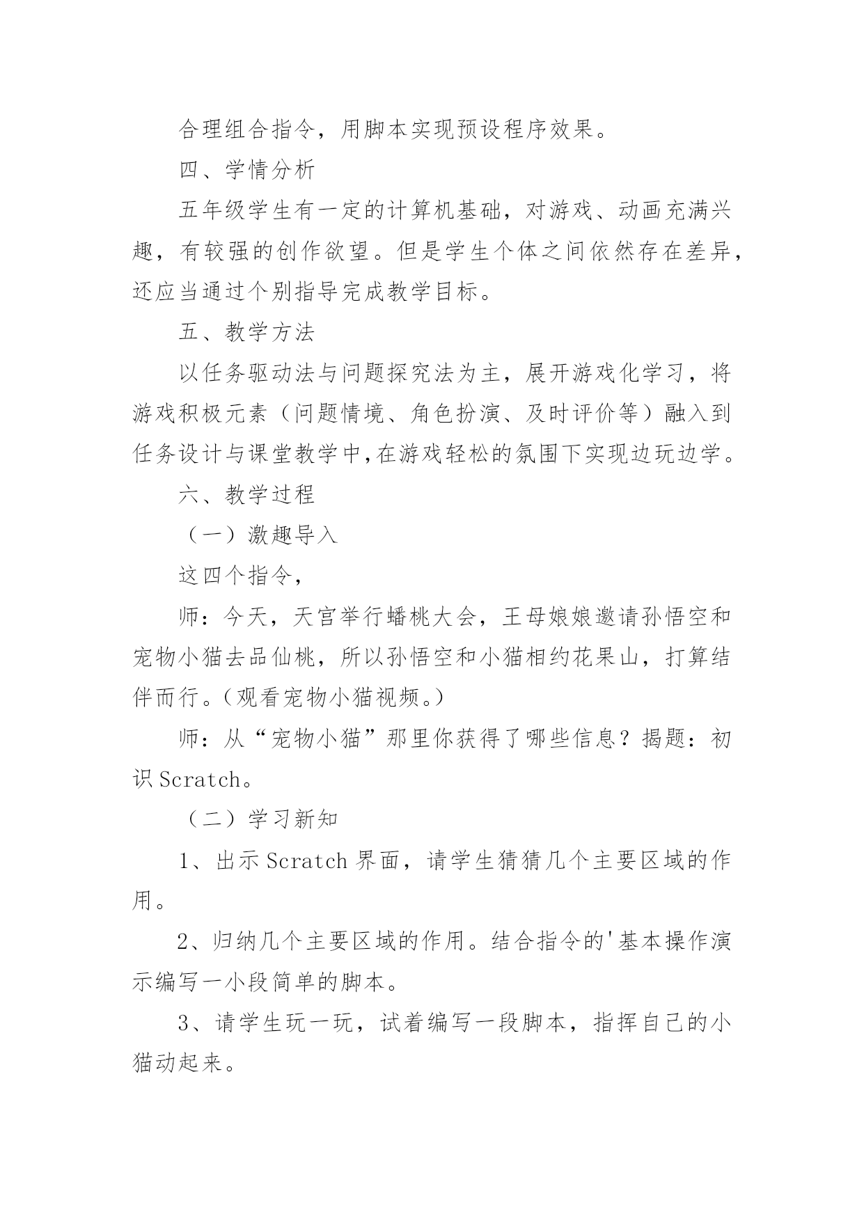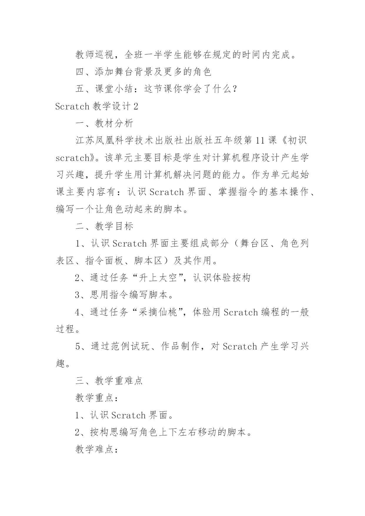 Scratch教学设计Scratch教学设计作为一名教师,通常需要用到教学设计来辅助教学,借助教学设计可以提高教学效率和教学质量。那要怎么写好教学设计呢?下面是小编收集整理的Scratch教学设计,欢迎大家借鉴与参考,希望对大家有所帮助。Scratch教学设计1教学目标:知识与技能:1.学会启动和退出Scratch,认识Scratch的工作界面。2.学会新增舞台背景,会新增/删除角色(演员)3.学会使用如下程序块:过程与方法:通过创作一个有情节的动画,了解舞台、角色列表、角色资料区、脚本区和程序区之间的相互联系。情感态度与价值观:通过学生自己创作动画、展示同学的动画让感受使用Scratch带来的乐趣并对Scratch产生兴趣。教学重点:新增舞台背景,会新增/删除角色(演员)教学难点:创作一个有情节的动画。教学过程:一、激趣导入播放Scratch自带的breakdance动画,导入课题。二、Scratch的功能Scratch除了创作动画还可以创作什么呢?电脑游戏、故事片、音乐、贺卡、玩数学、玩语文、模拟物理现象等。三、初识Scratch界面初识Scratch黄茂兴教学目标:1.初步了解Scratch的界面;能打开Scratch自带的作品;2.初步尝试播放按钮;3.初步尝试角色的.选择、舞台的选择;4.了解每个角色需要设定相应的脚本,才能在舞台中运动;5.尝试简单脚本的编写教学过程一、激发兴趣,导入新课打开scratch软件,演示两个例子。例子1:MusicandDance——》6BreakDance例子2:Games——》3FishChomp在演示例子的过程中,学生掌握“开始执行绿旗控制”、“全部停止”等5个按钮。学生自由操作10分钟时间,根据兴趣导入作品,欣赏作品。介绍Scratch的功能:除了创作动画还可以创作什么呢?二、初识Scratch1.打开软件2.介绍界面(1)舞台:角色演出的地方,随机介绍(2)角色列表区:所有演员都会在这个地方休息(3)角色资料区:显示当前角色的名称,旋转方向,坐标位置等基本资料(4)脚本区:我们将选择好的指令安州顺序放在脚本区内,像搭积木一样设计脚本,告诉角色在舞台上要做什么(5)程序指令区:在这里选择程序命令,只要用拖拉的方式,把命令积木堆叠起来,轻轻松松就可以创作出很棒的作品来。三、尝试创作介绍“程序指令分类”和“脚本”。把“程序指令分类”中的“指令”比喻为“积木”,“程序指令分类”是各种同类型的积木进行分类存放。“脚本”就是“搭积木”的过程。创作在舞台上自由的走动的Scratch小猫,初步学习“动作”、“控制”和“外观”。学生操作。教师巡视,全班一半学生能够在规定的时间内完成。四、添加舞台背景及更多的角色五、课堂小结:这节课你学会了什么?Scratch教学设计2一、教材分析江苏凤凰科学技术出版社出版社五年级第11课《初识scratch》。该单元主要目标是学生对计算机程序设计产生学习兴趣,提升学生用计算机解决问题的能力。作为单元起始课主要内容有:认识Scratch界面、掌握指令的基本操作、编写一个让角色动起来的脚本。二、教学目标1、认识Scratch界面主要组成部分(舞台区、角色列表区、指令面板、脚本区)及其作用。2、通过任务“升上太空”,认识体验按构3、思用指令编写脚本。4、通过任务“采摘仙桃”,体验用Scratch编程的一般过程。5、通过范例试玩、作品制作,对Scratch产生学习兴趣。三、教学重难点教学重点:1、认识Scratch界面。2、按构思编写角色上下左右移动的脚本。教学难点:合理组合指令,用脚本实现预设程序效果。四、学情分析五年级学生有一定的计算机基础,对游戏、动画充满兴趣,有较强的创作欲望。但是学生个体之间依然存在差异,还应当通过个别指导完成教学目标。五、教学方法以任务驱动法与问题探究法为主,展开游戏化学习,将游戏积极元素(问题情境、角色扮演、及时评价等)融入到任务设计与课堂教学中,在游戏轻松的氛围下实现边玩边学。六、教学过程(一)激趣导入这四个指令,师:今天,天宫举行蟠桃大会,王母娘娘邀请孙悟空和宠物小猫去品仙桃,所以孙悟空和小猫相约花果山,打算结伴而行。(观看宠物小猫视频。)师:从“宠物小猫”那里你获得了哪些信息?揭题:初识Scratch。(二)学习新知1、出示Scratch界面,请学生猜猜几个主要区域的作用。2、归纳几个主要区域的作用。结合指令的'基本操作演示编写一小段简单的脚本。3、请学生玩一玩,试着编写一段脚本,指挥自己的小猫动起来。4、引导学生分析太空步由哪些具体的动作组成。具体分析向上走由哪些具体步骤组成。可能会用到哪些指令?5、请学生尝试填写让小猫向上移动200步的脚本。6、布置分层任务:基础任务:模仿教师范例。高级任务:在基础任务的基础上通过修改参数、添